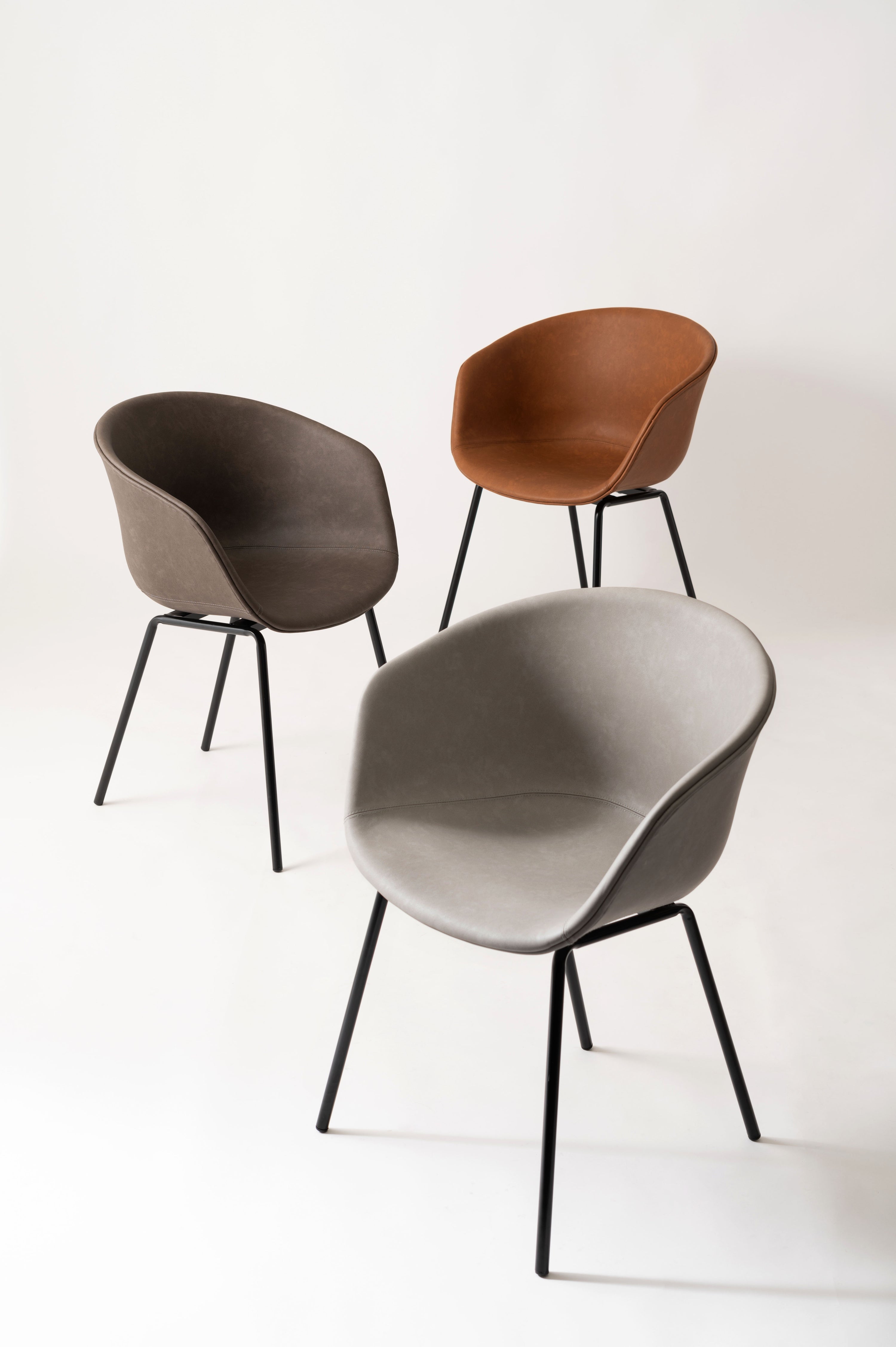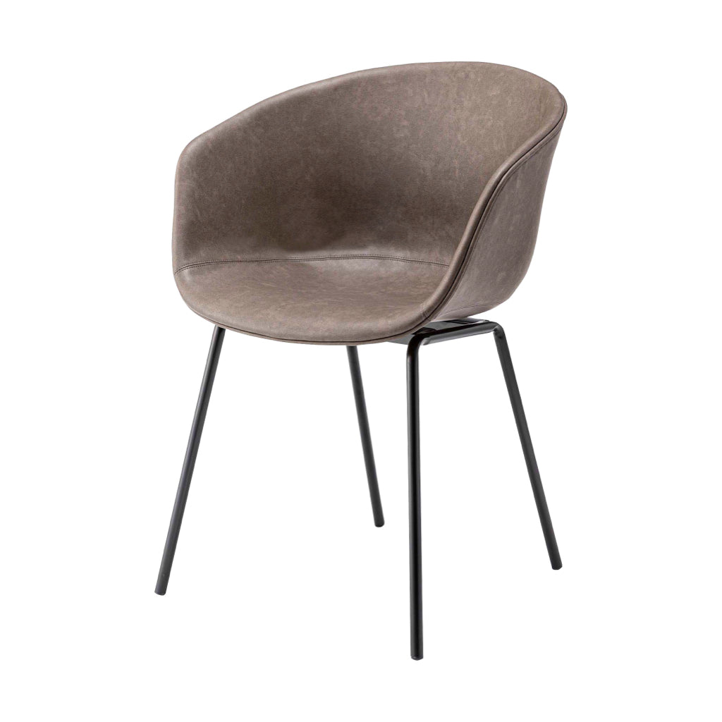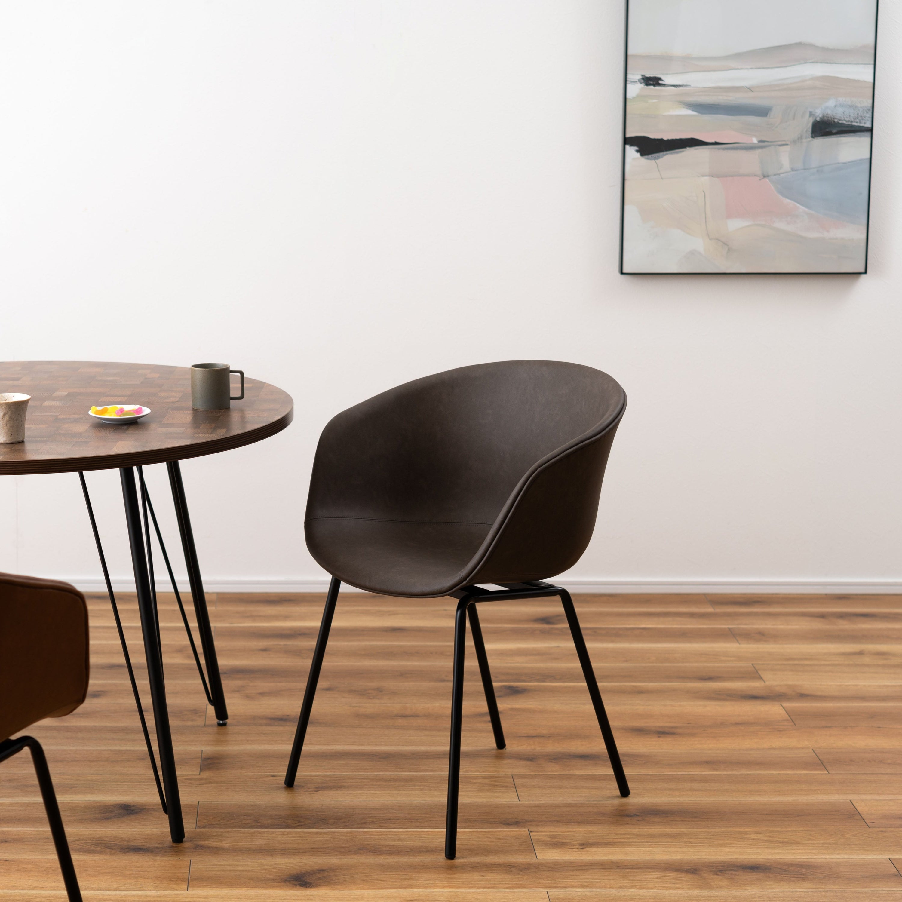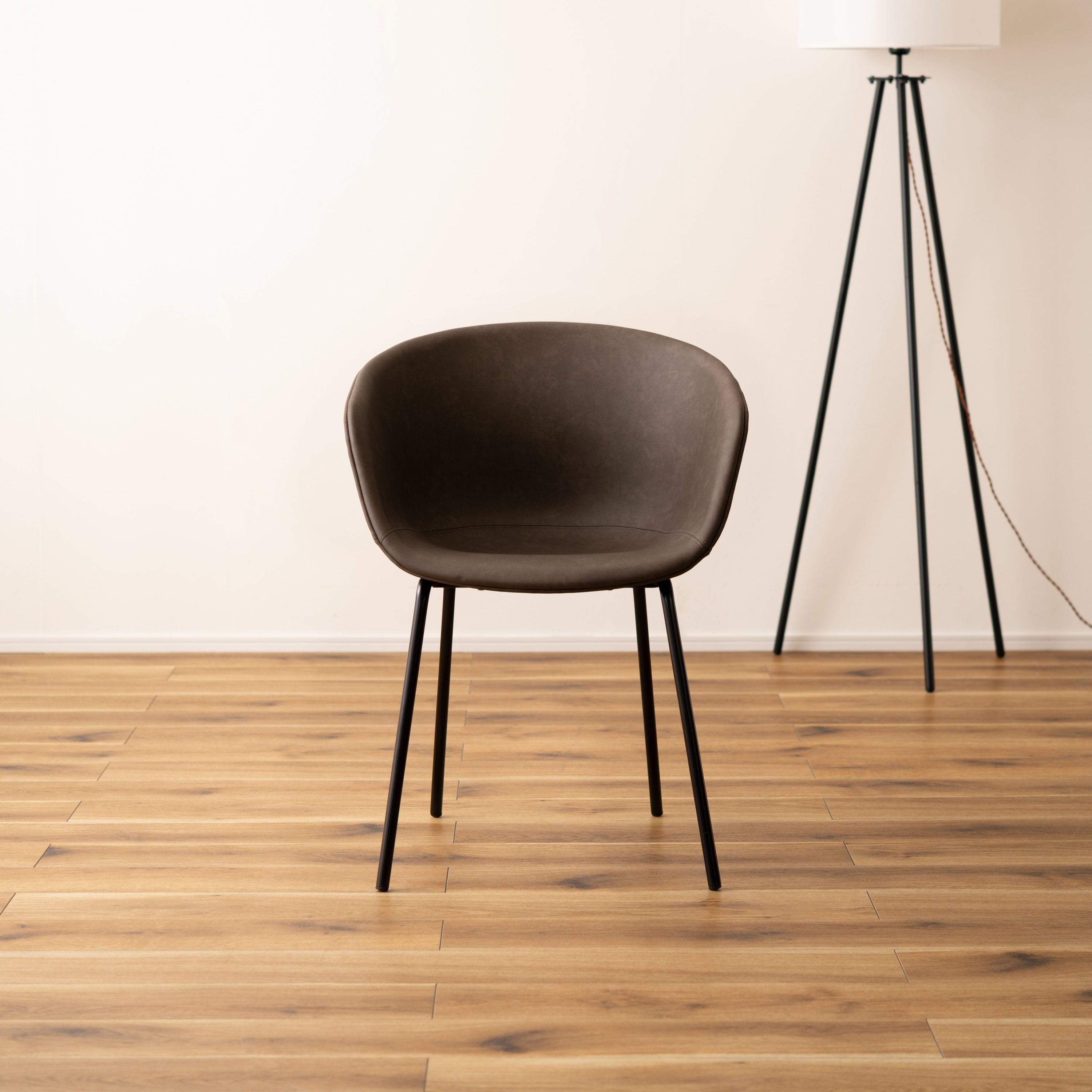 本革調生地のソフトレザーを使用した、高級感のあるアームチェア。 体をすっぽりと包み込んでくれる、座り心地の良い肘掛け付きのシェルデザイン。 手触りが良く本革のようなテイストが魅力のソフトレザーを使用。 細めのスチール脚は全体が重くなりすぎず使いやすいデザイン。 脚先にはプ保護パーツが付いているので床への傷防止になり安心。 ダイニングチェアとして。 パーソナルチェアとして。 デスクチェアとして。