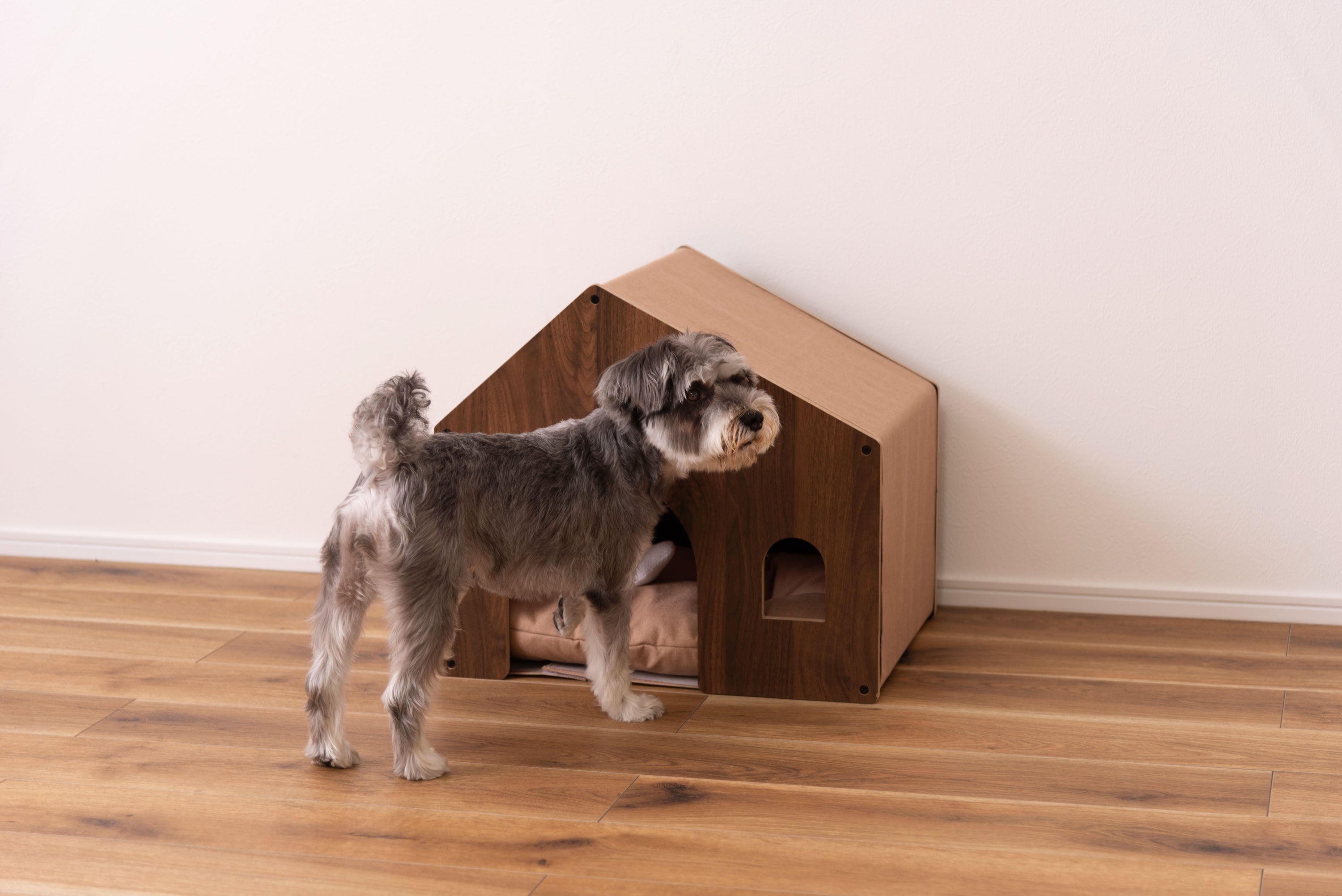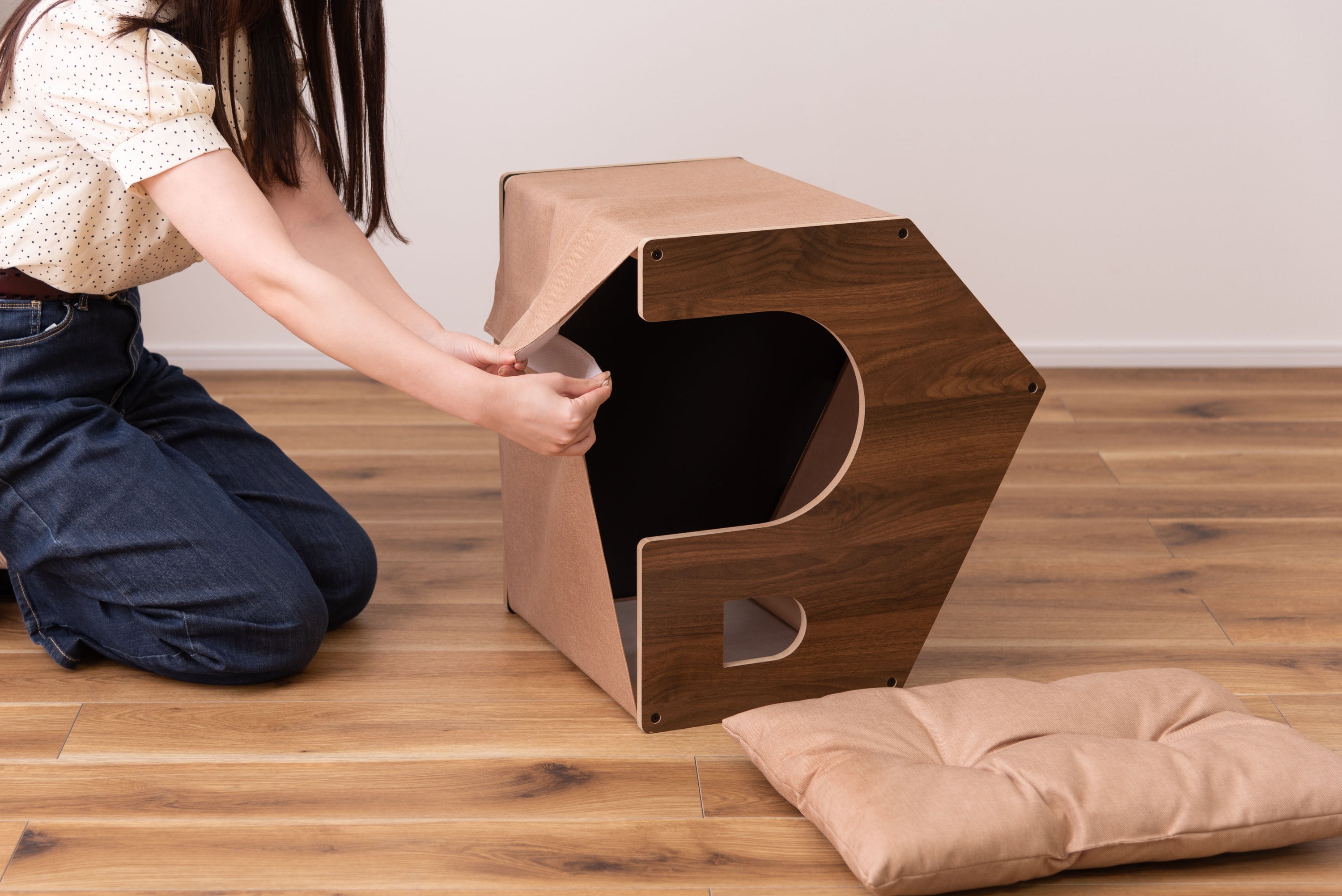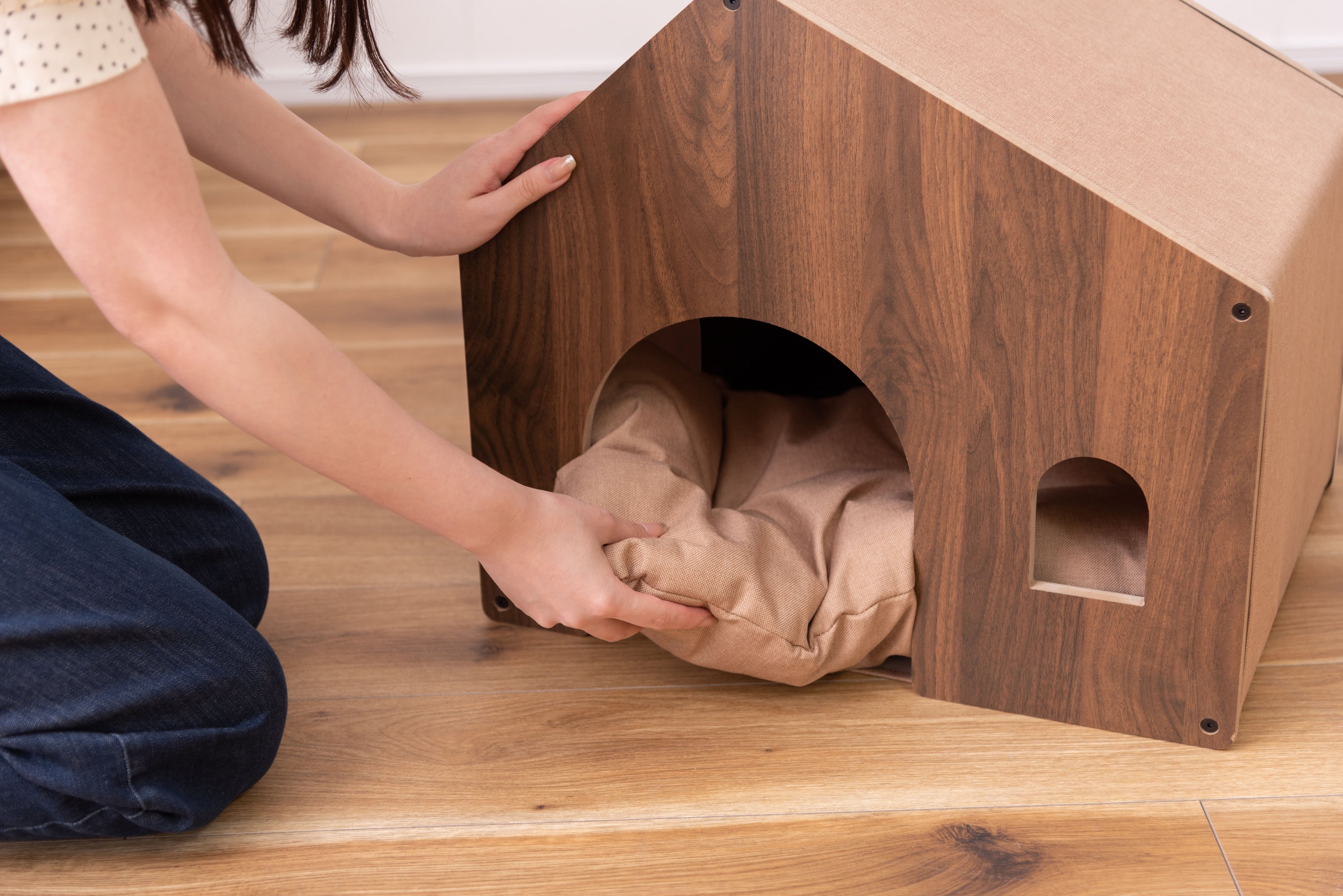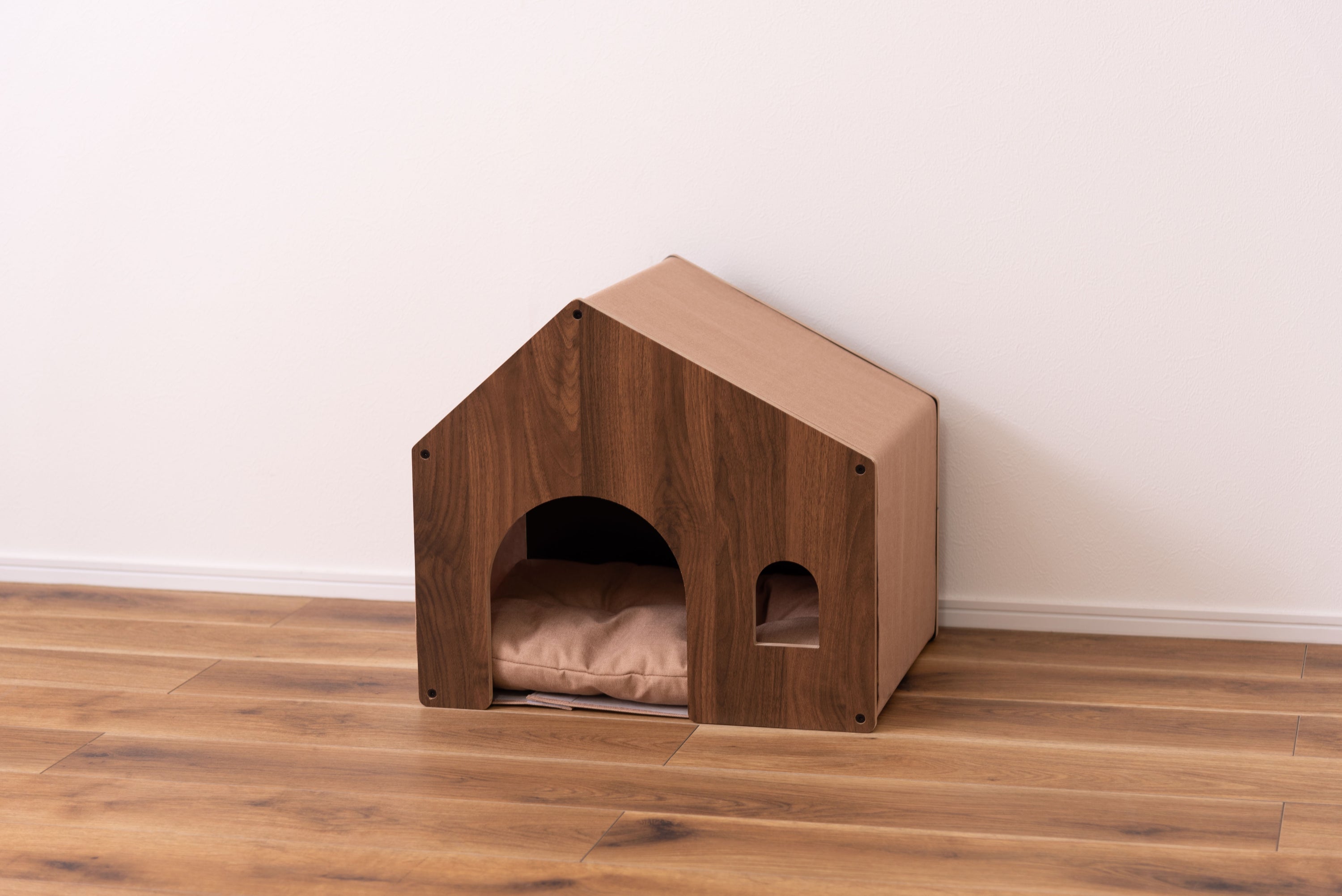 お家のような形がかわいいペットハウス。中には柔らかいクッションが入っているため、ペットも安心してくつろぐことができます。クッションは手洗いが出来るので清潔に保つことが出来ます。ぬくもりのあるウッド柄のシートがインテリアに馴染みます。工具は全てセットされた組立式。床への傷防止用フェルトも入っているので安心です。