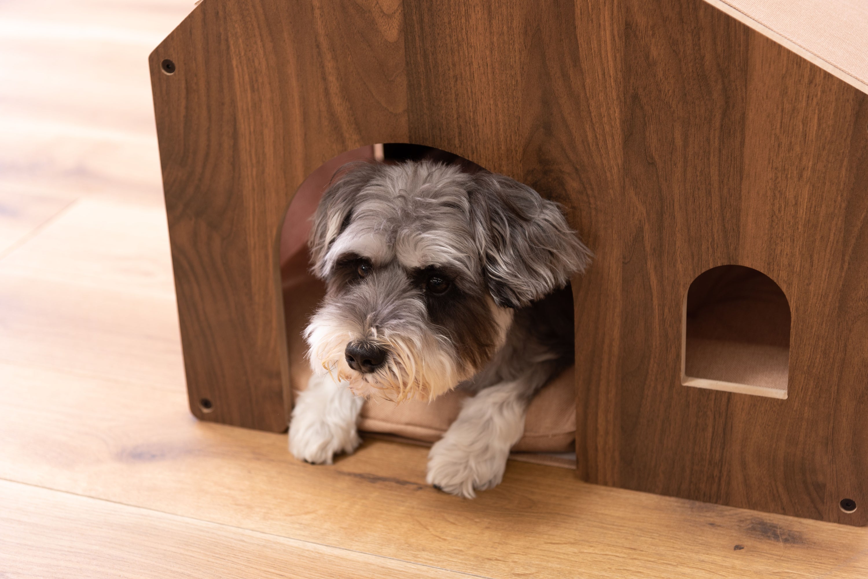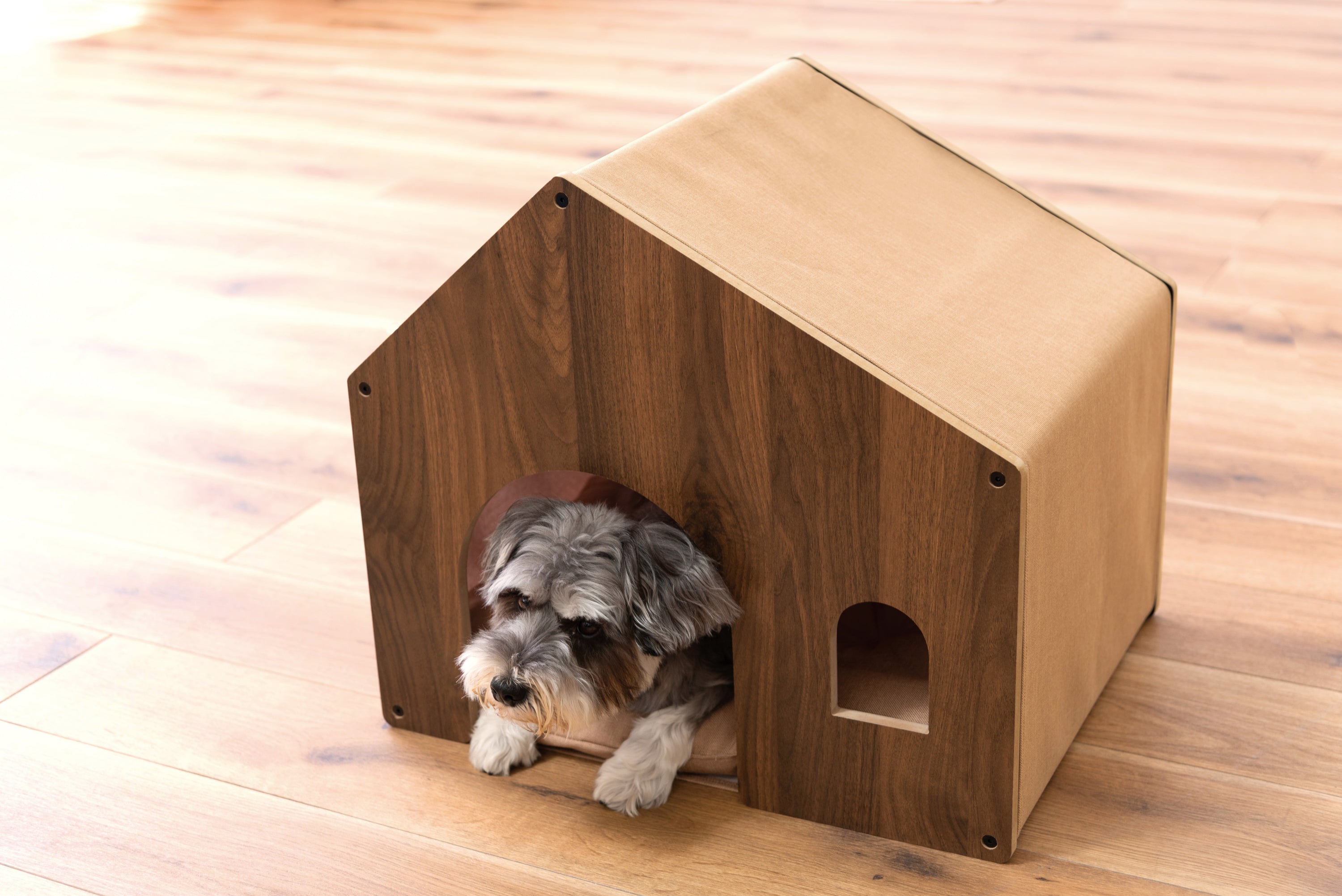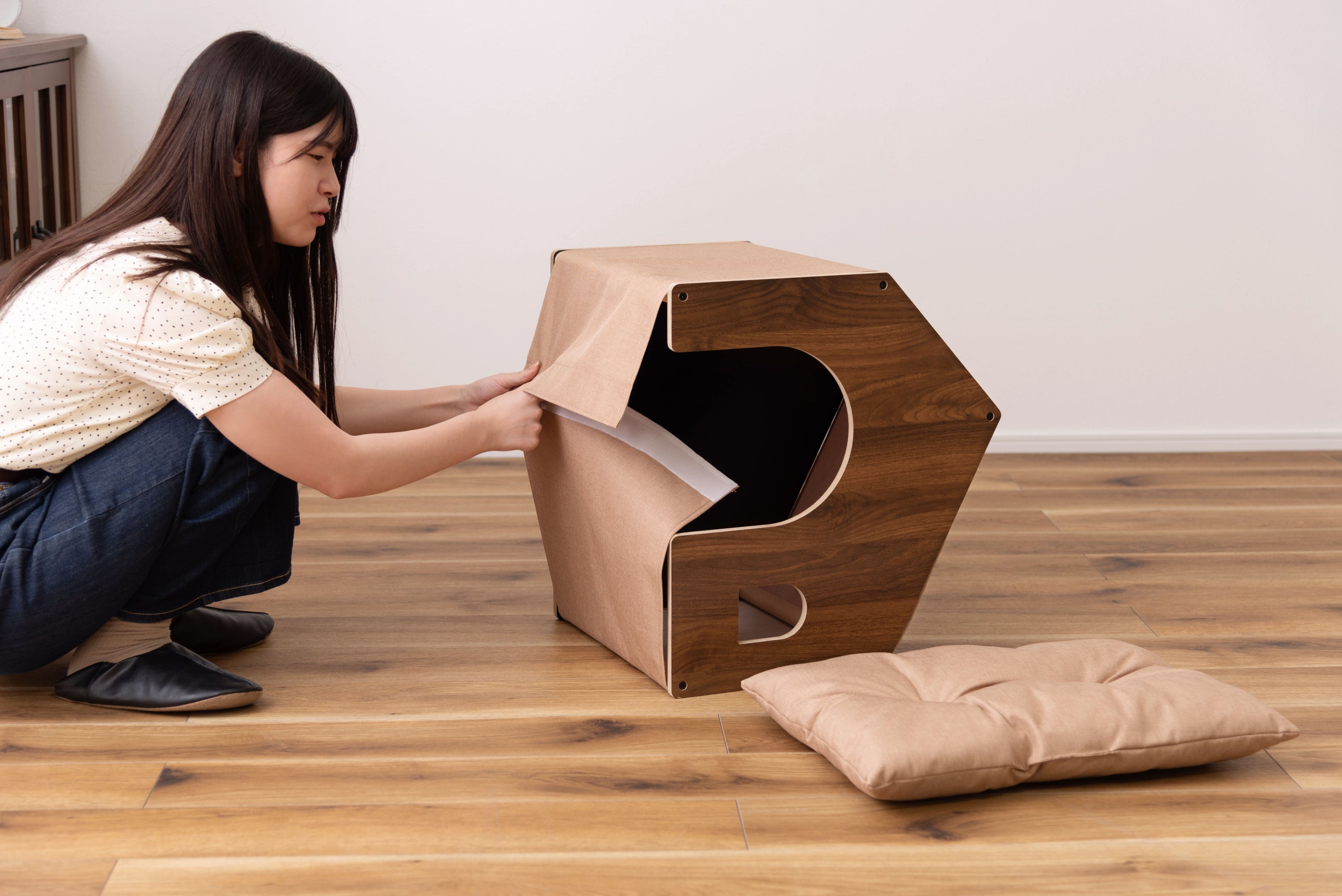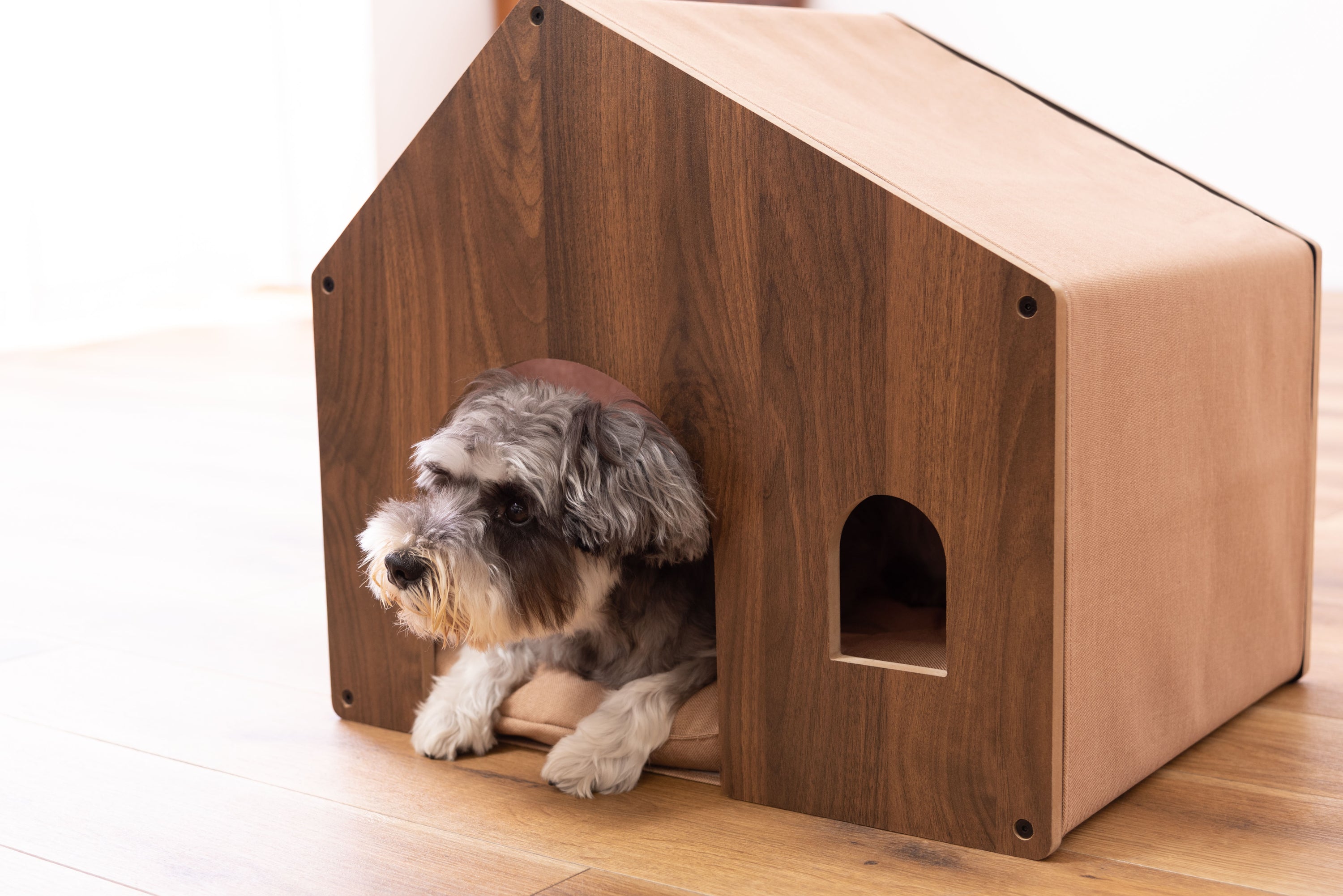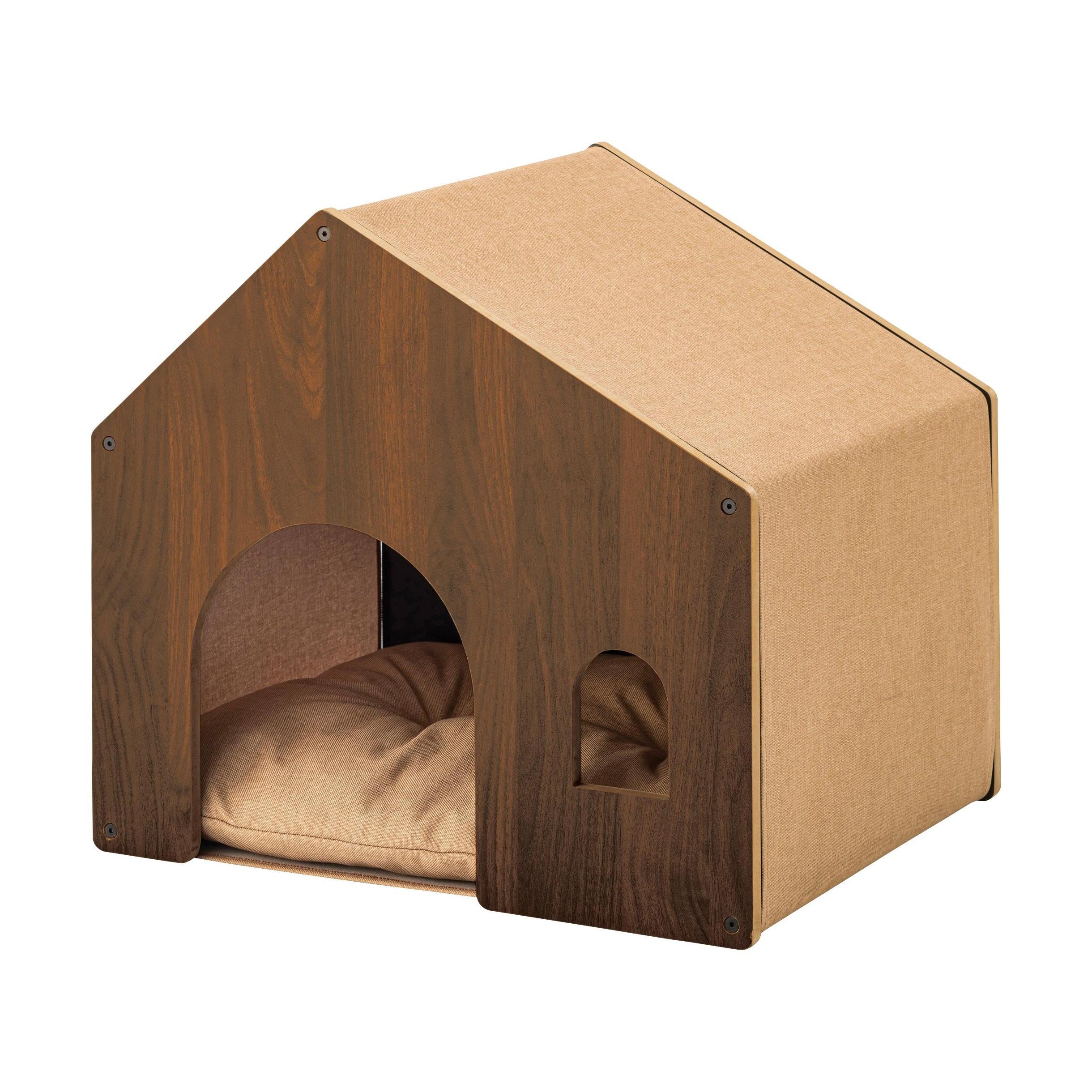 お家のような形がかわいいペットハウス。中には柔らかいクッションが入っているため、ペットも安心してくつろぐことができます。クッションは手洗いが出来るので清潔に保つことが出来ます。ぬくもりのあるウッド柄のシートがインテリアに馴染みます。工具は全てセットされた組立式。床への傷防止用フェルトも入っているので安心です。