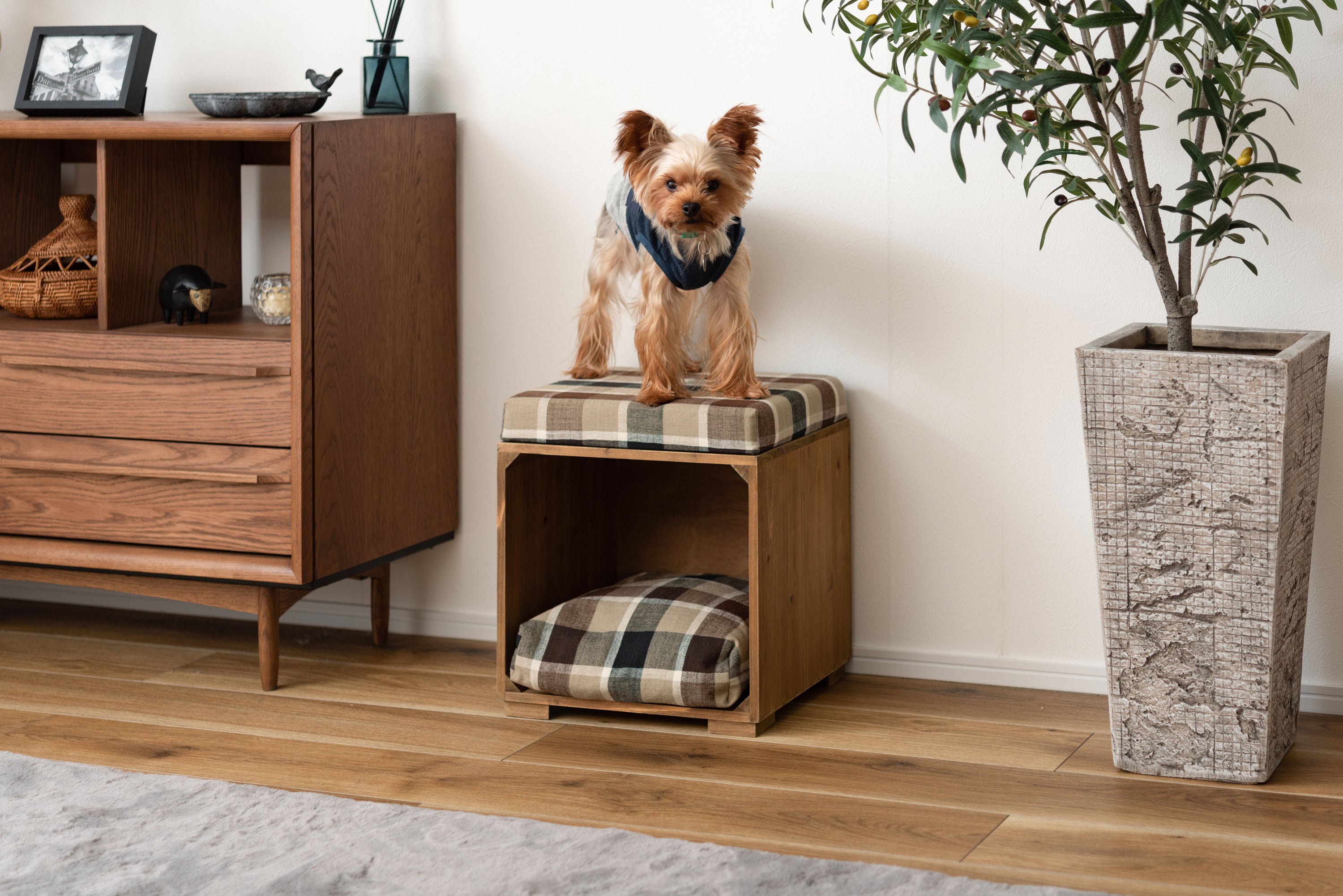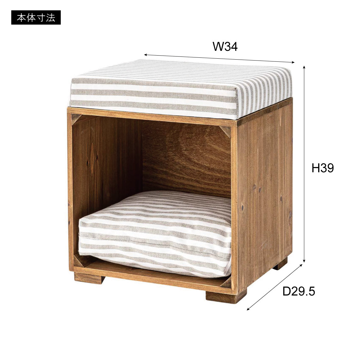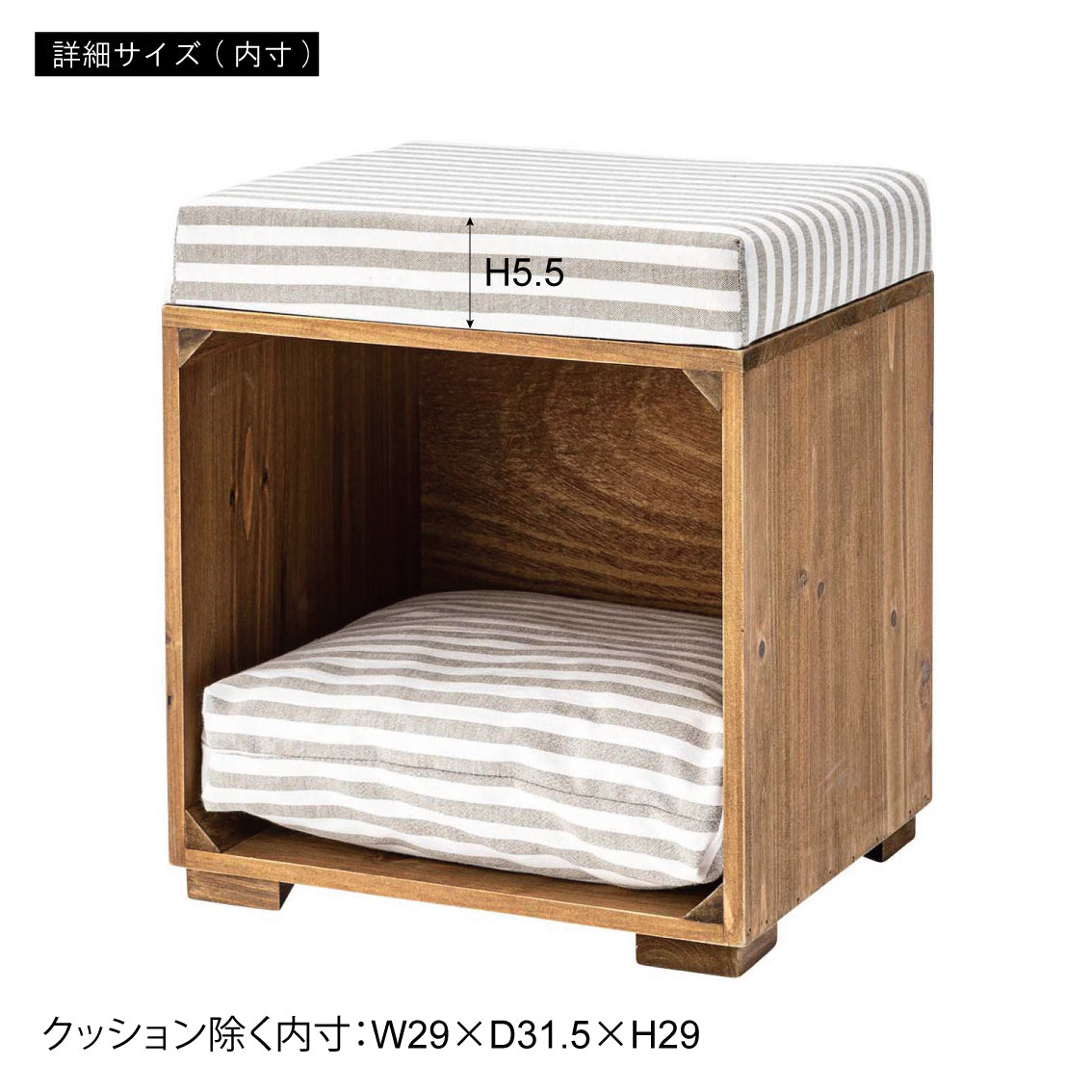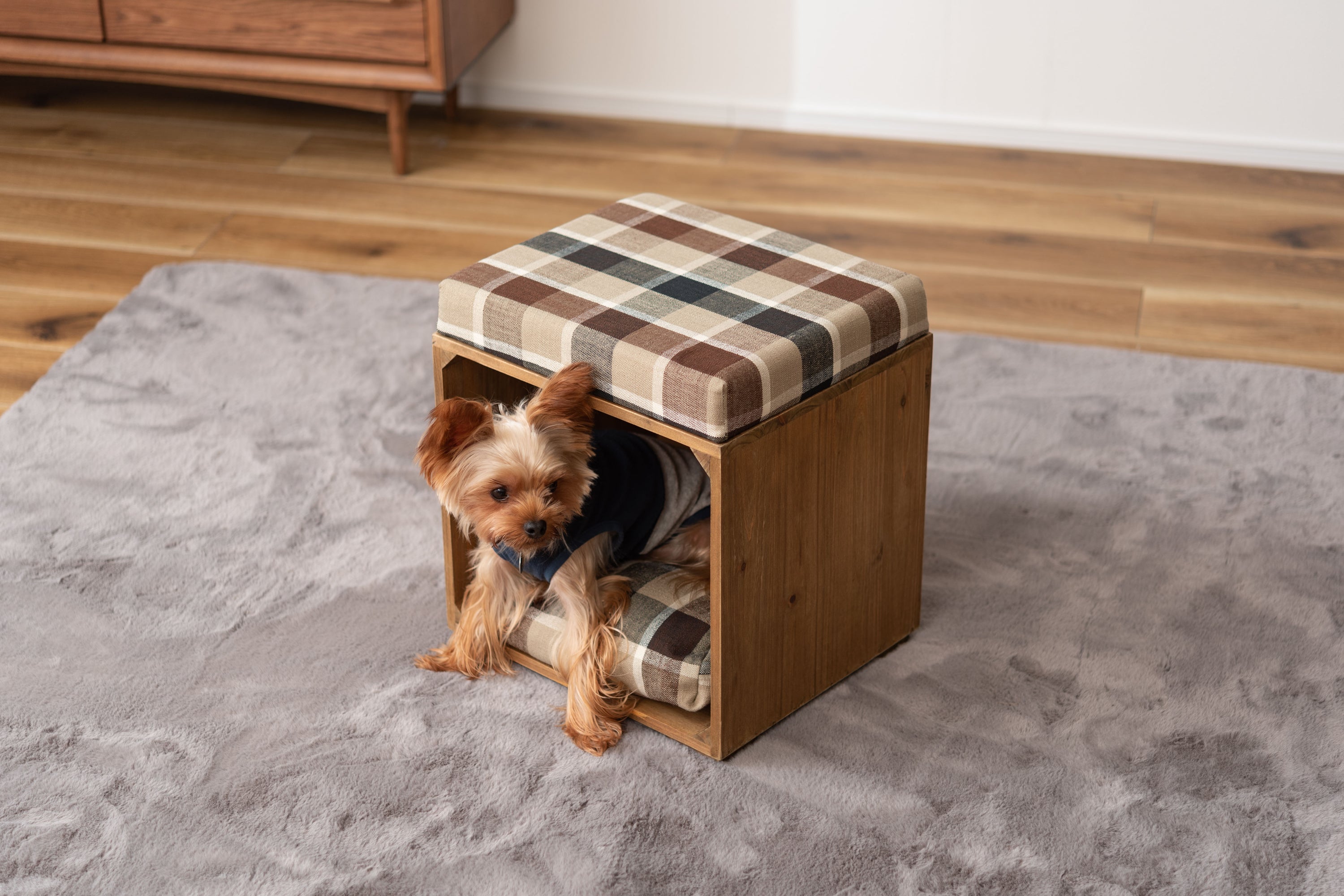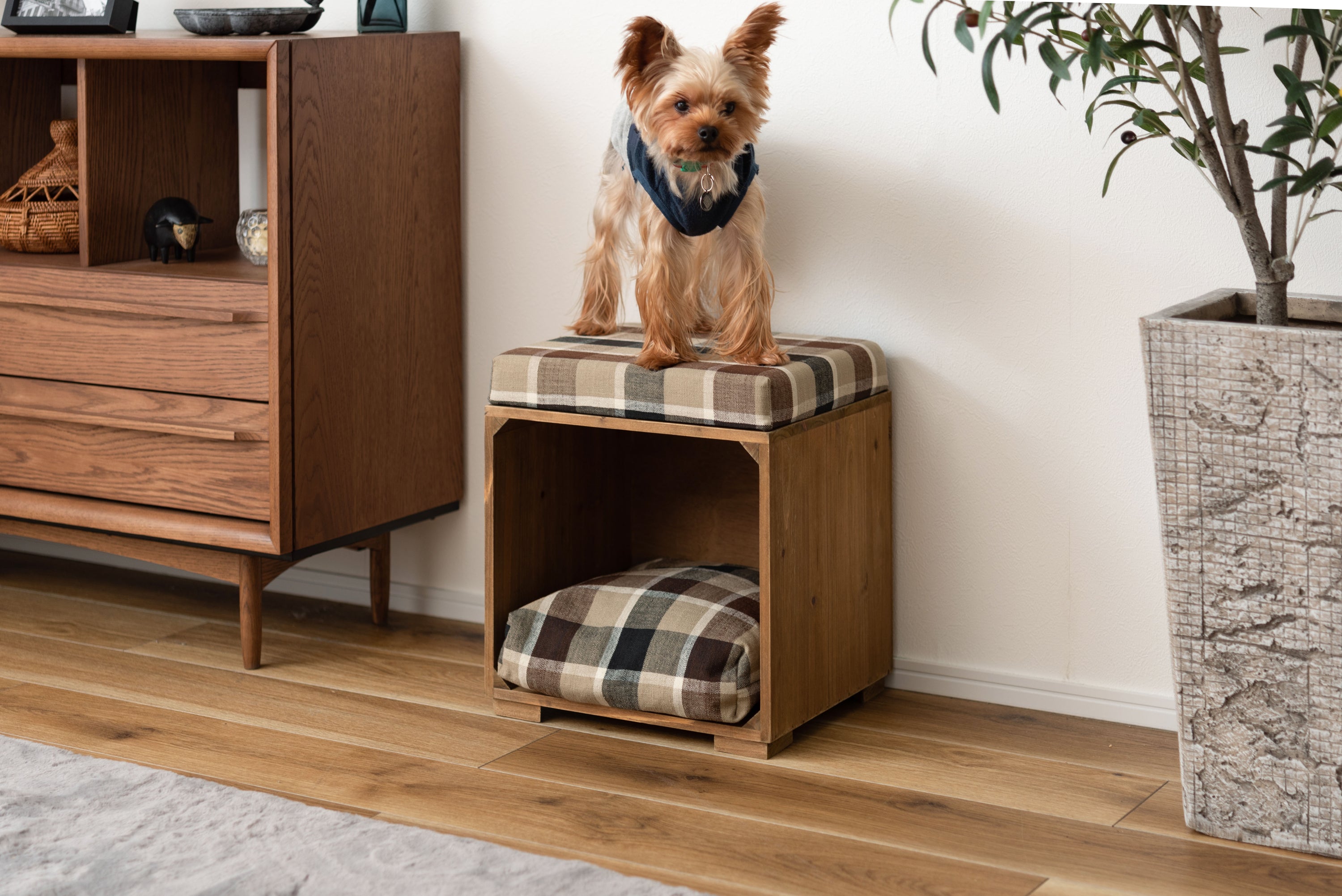 ペットが入れるボックス型のスツール。ペット用クッションは取り外しが可能なので、クッションを外して収納ボックスとしても使えます(座面クッションは取り外しができません)。ペット用クッションはカバーを外して手洗いができるので、いつでも清潔に使えます。アンティーク感のある天然木(杉)フレームに、ナチュラルテイスト柄の生地を使用した、インテリア性の高いペットスツール。
