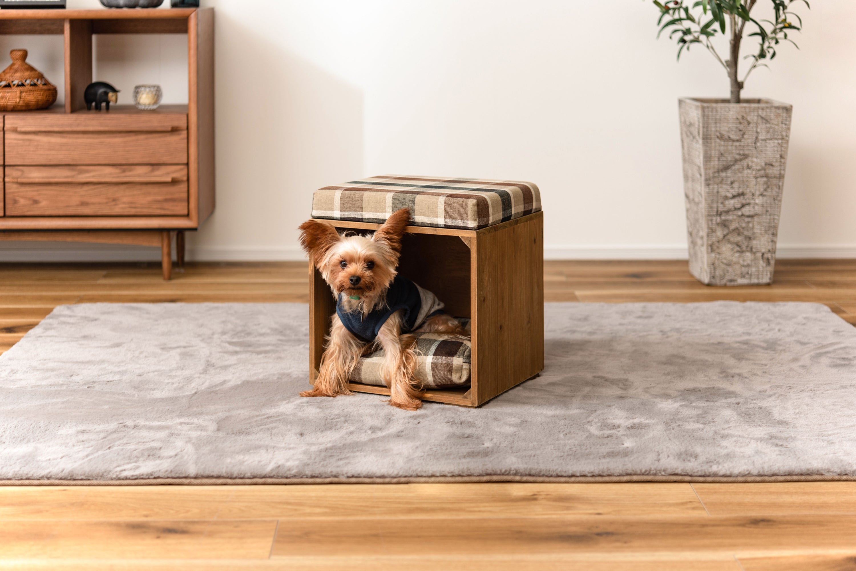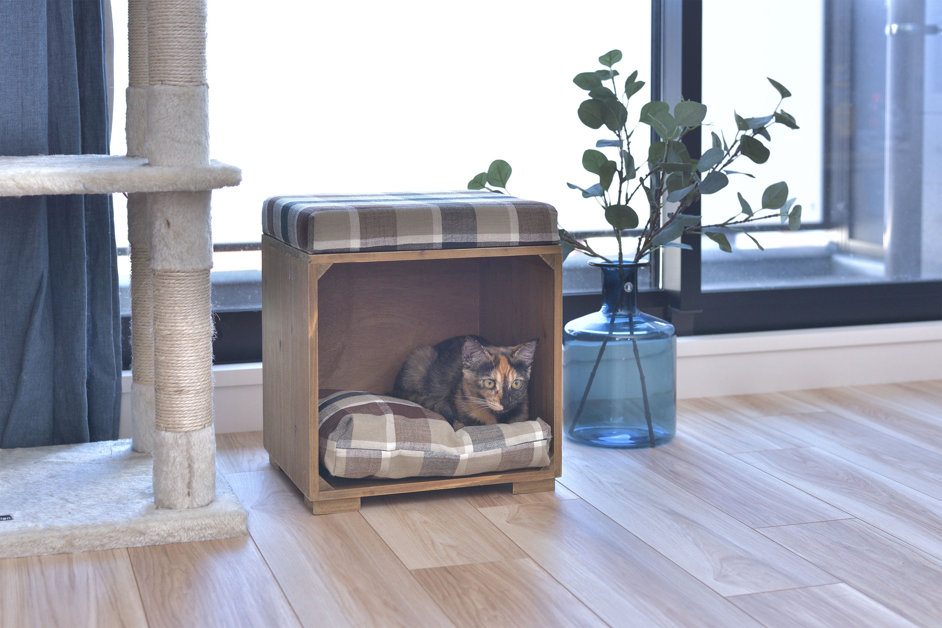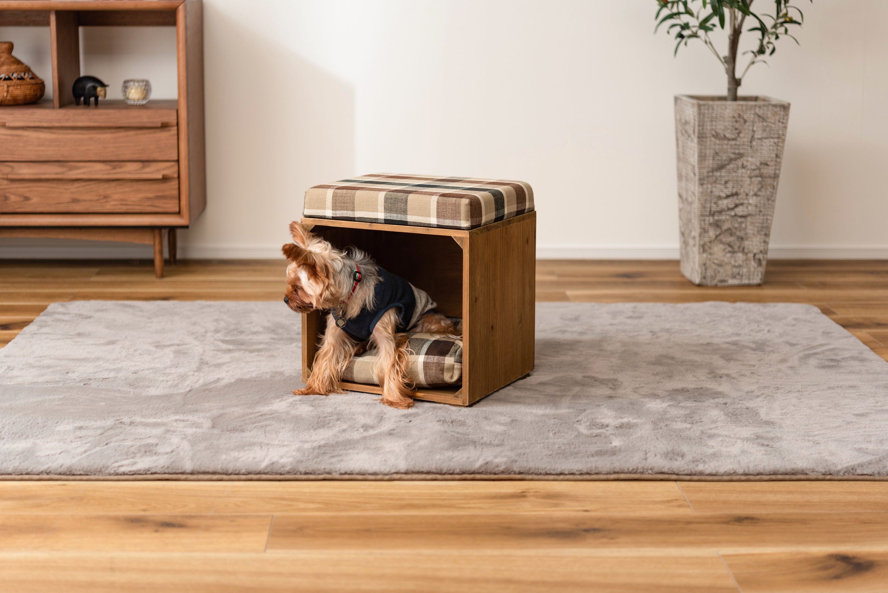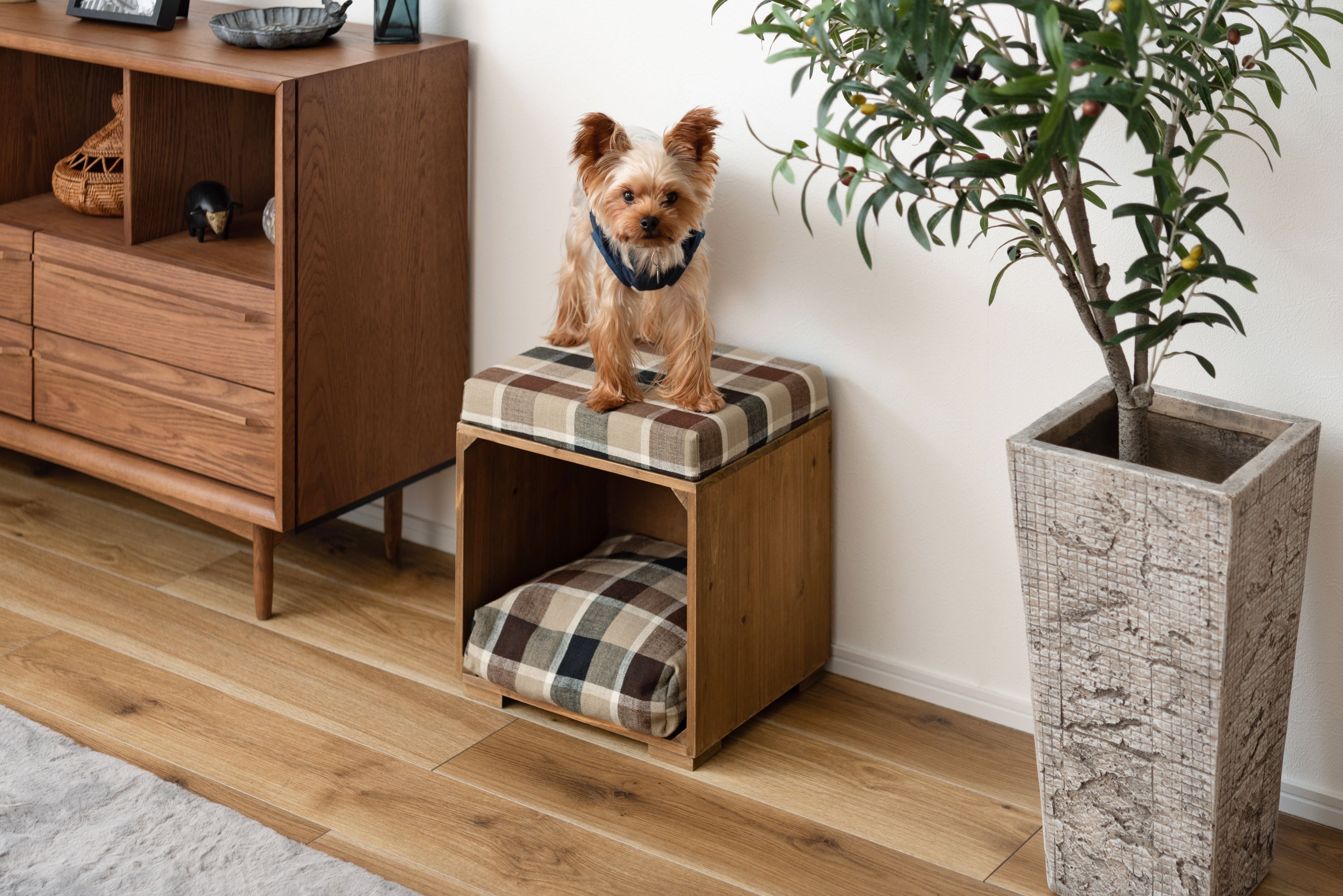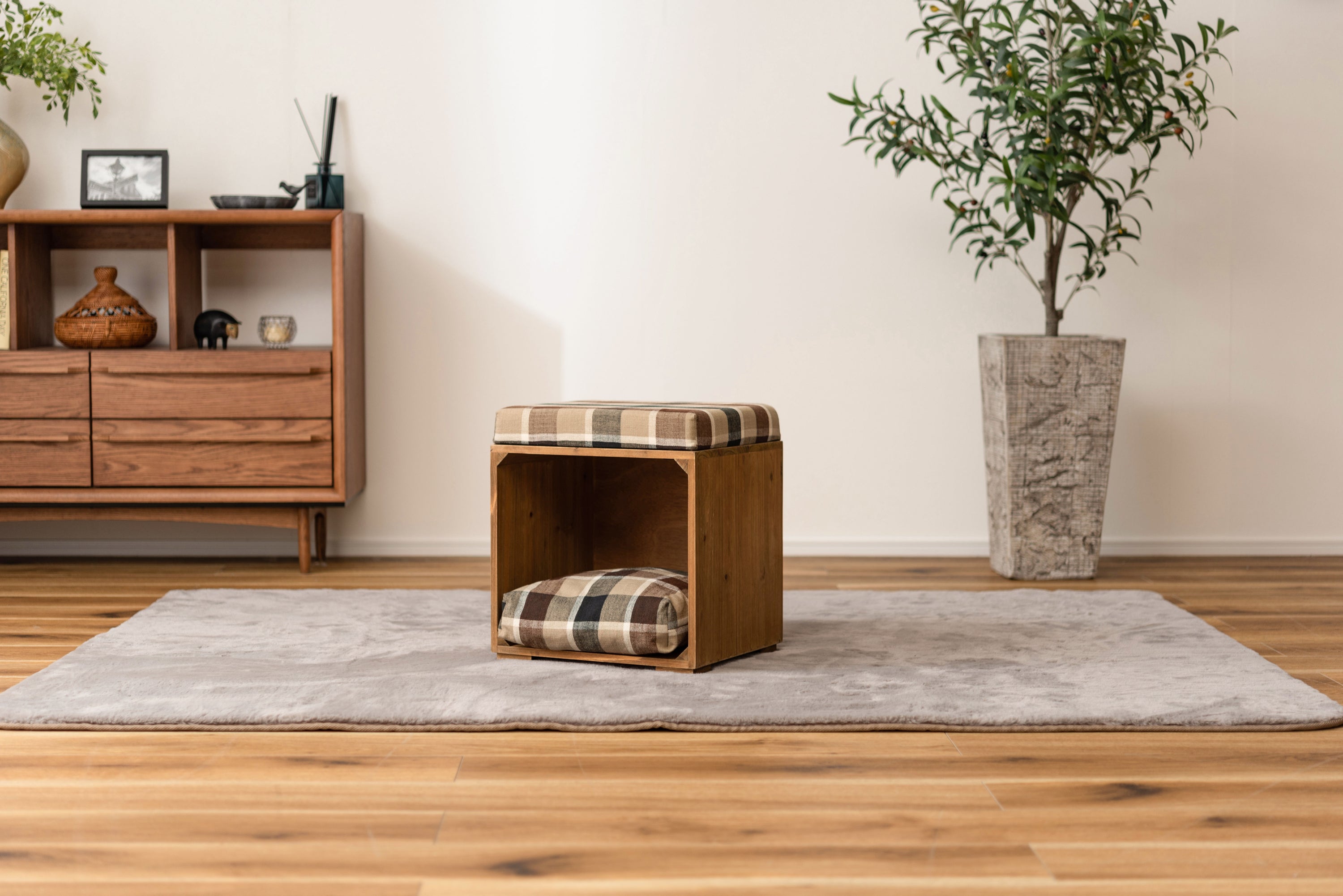 ペットが入れるボックス型のスツール。ペット用クッションは取り外しが可能なので、クッションを外して収納ボックスとしても使えます(座面クッションは取り外しができません)。ペット用クッションはカバーを外して手洗いができるので、いつでも清潔に使えます。アンティーク感のある天然木(杉)フレームに、ナチュラルテイスト柄の生地を使用した、インテリア性の高いペットスツール。