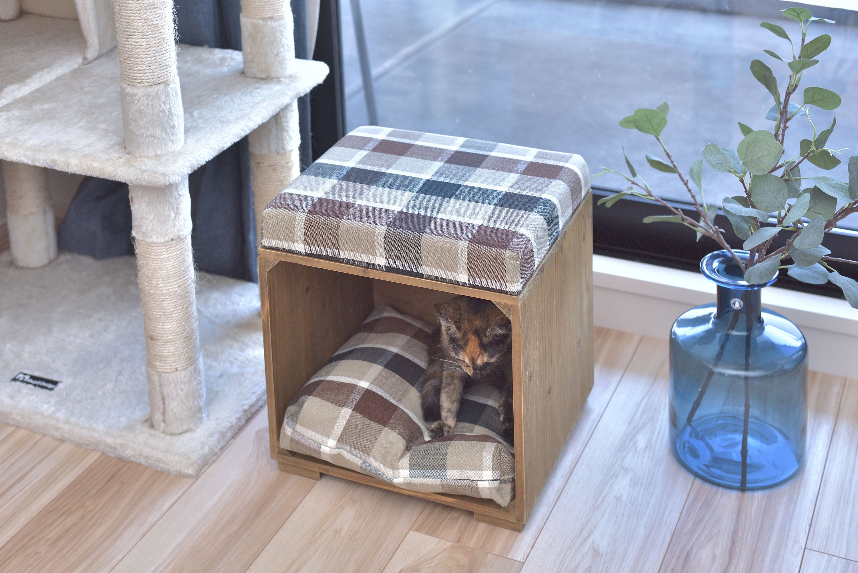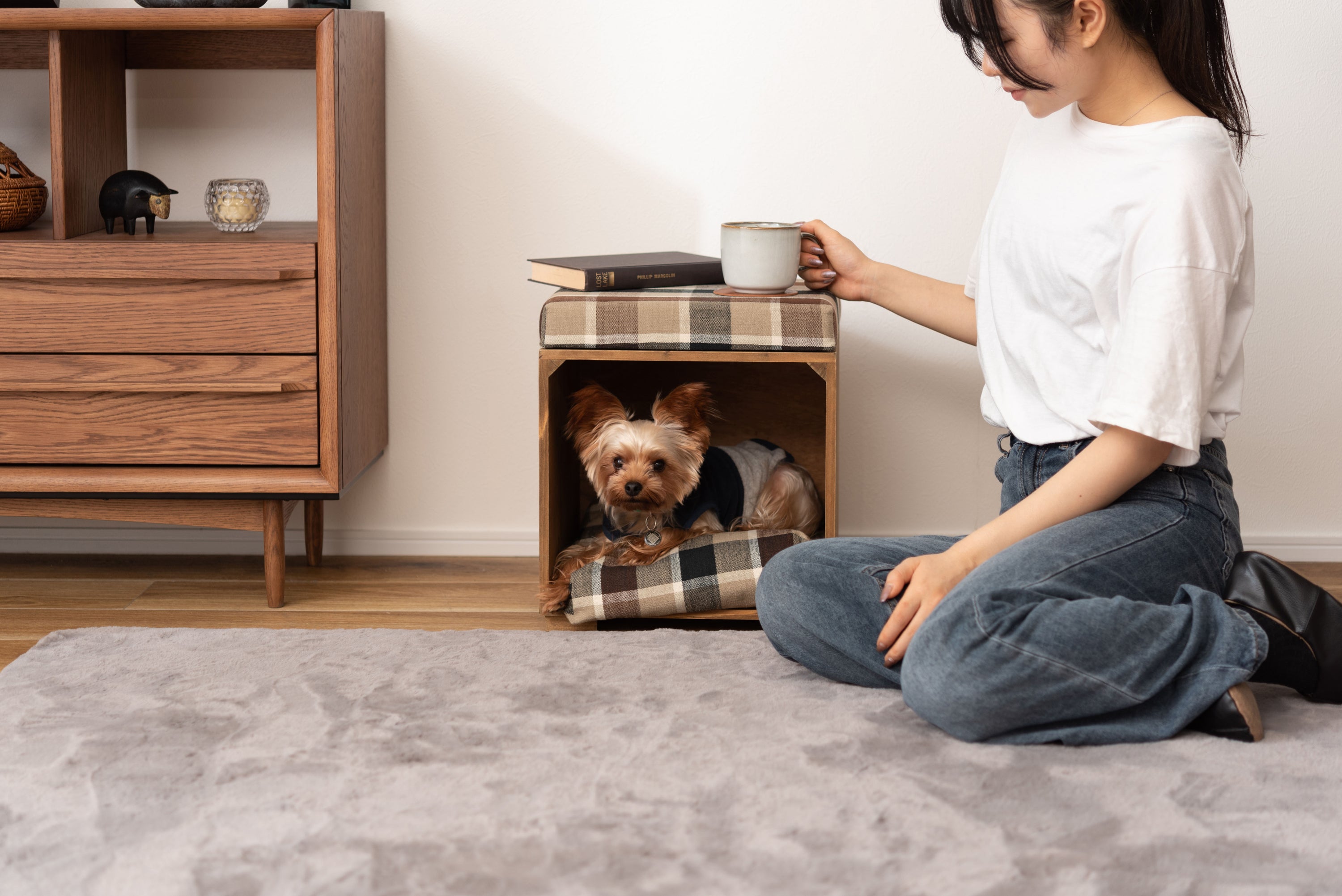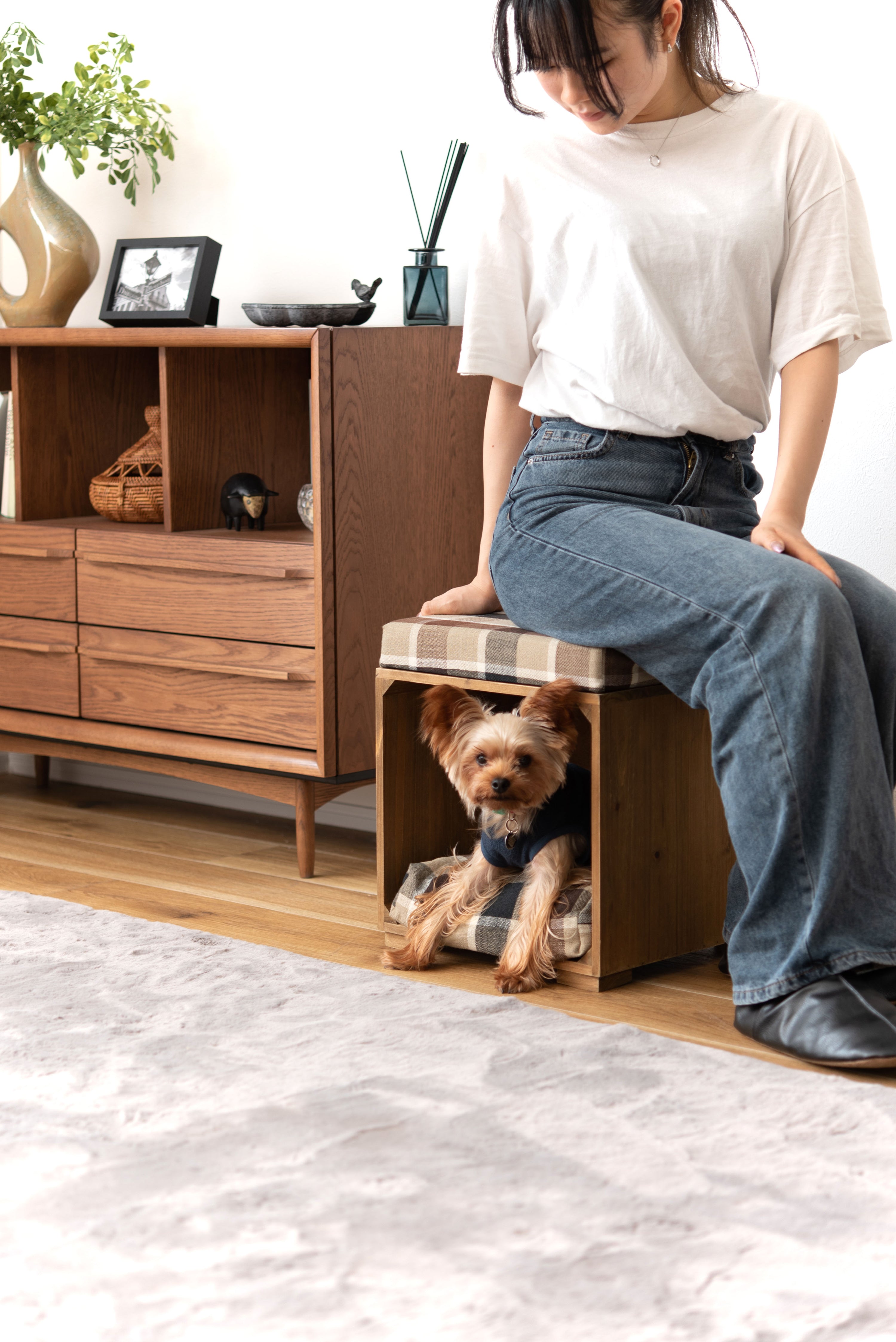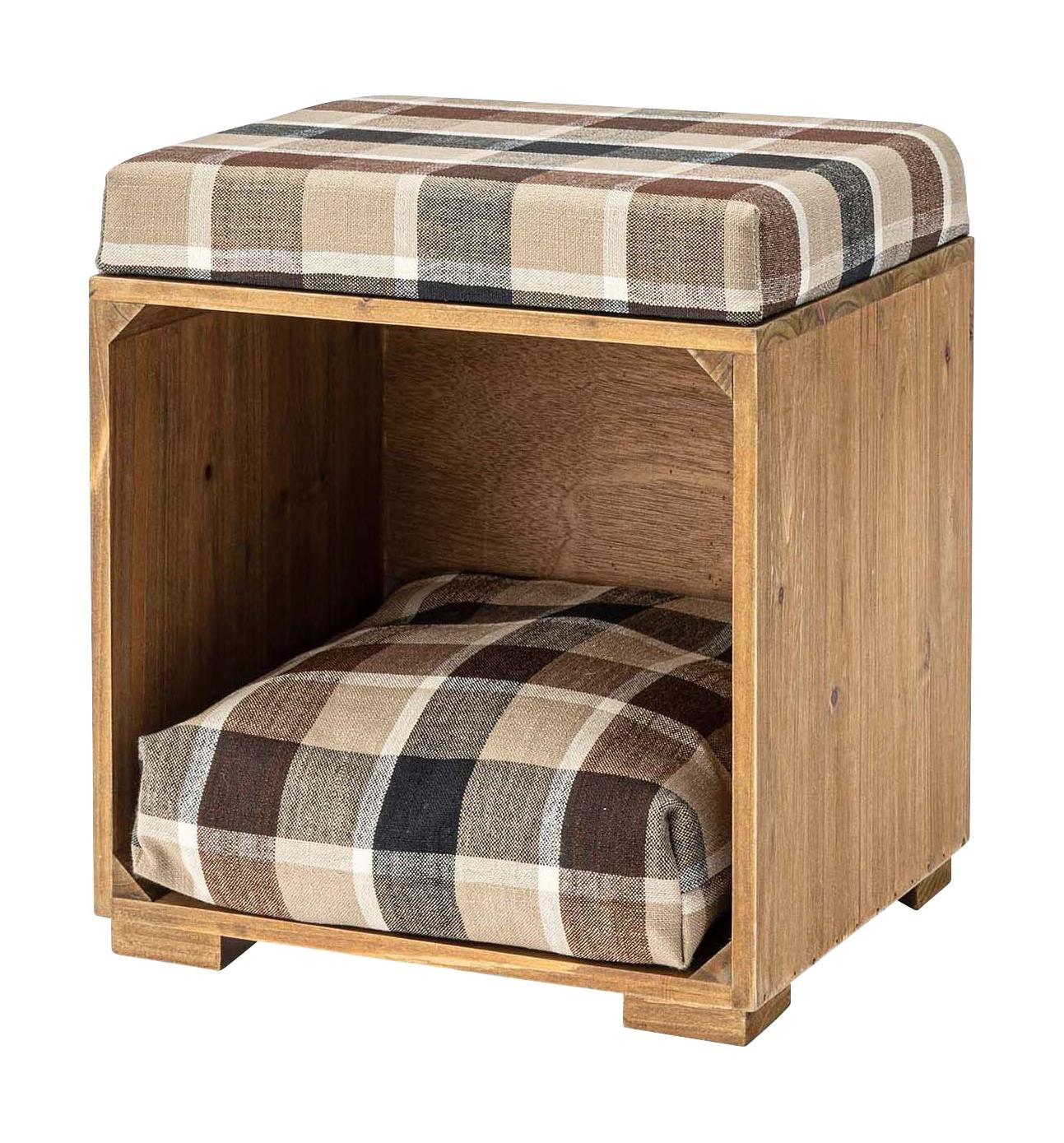 ペットが入れるボックス型のスツール。ペット用クッションは取り外しが可能なので、クッションを外して収納ボックスとしても使えます(座面クッションは取り外しができません)。ペット用クッションはカバーを外して手洗いができるので、いつでも清潔に使えます。アンティーク感のある天然木(杉)フレームに、ナチュラルテイスト柄の生地を使用した、インテリア性の高いペットスツール。