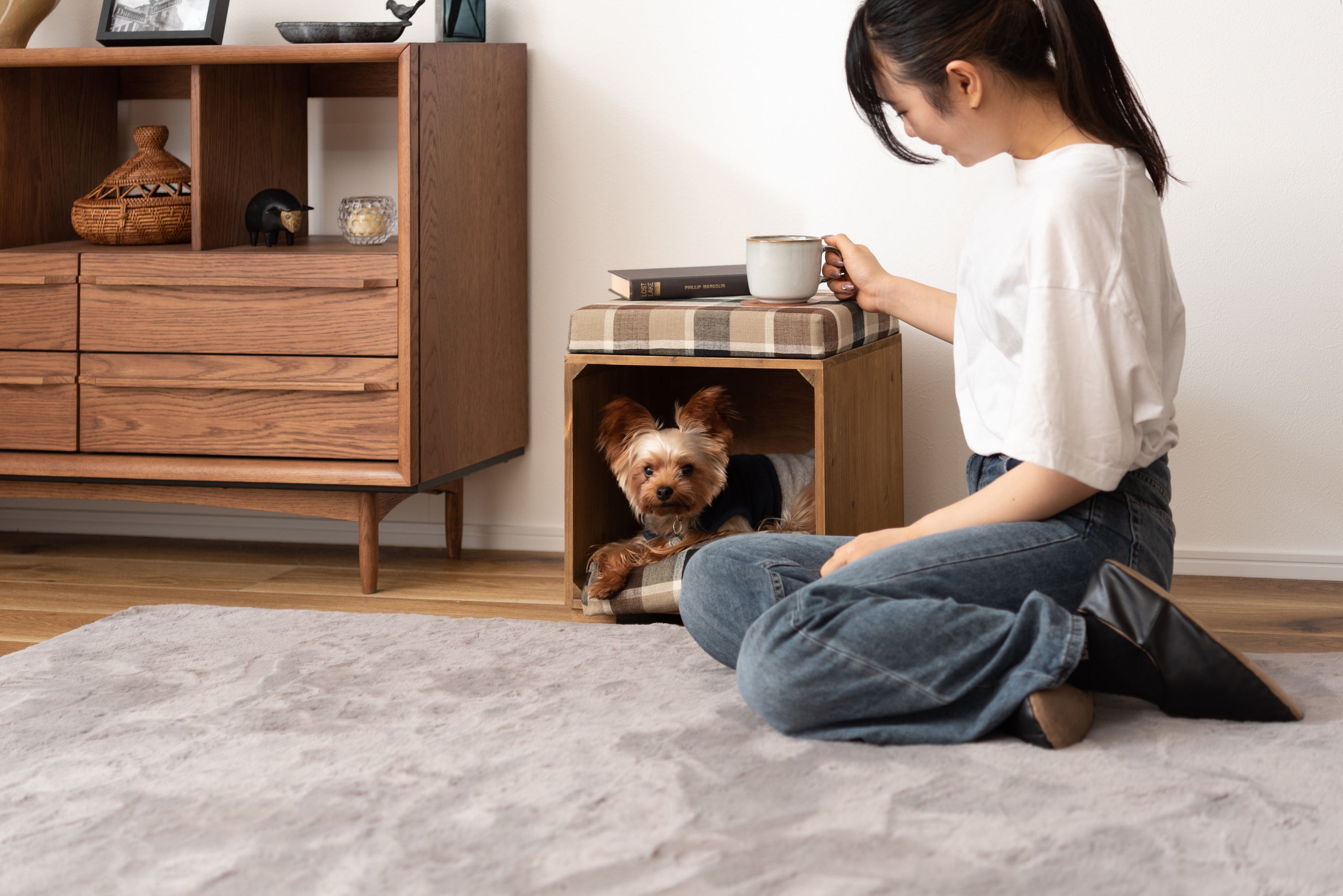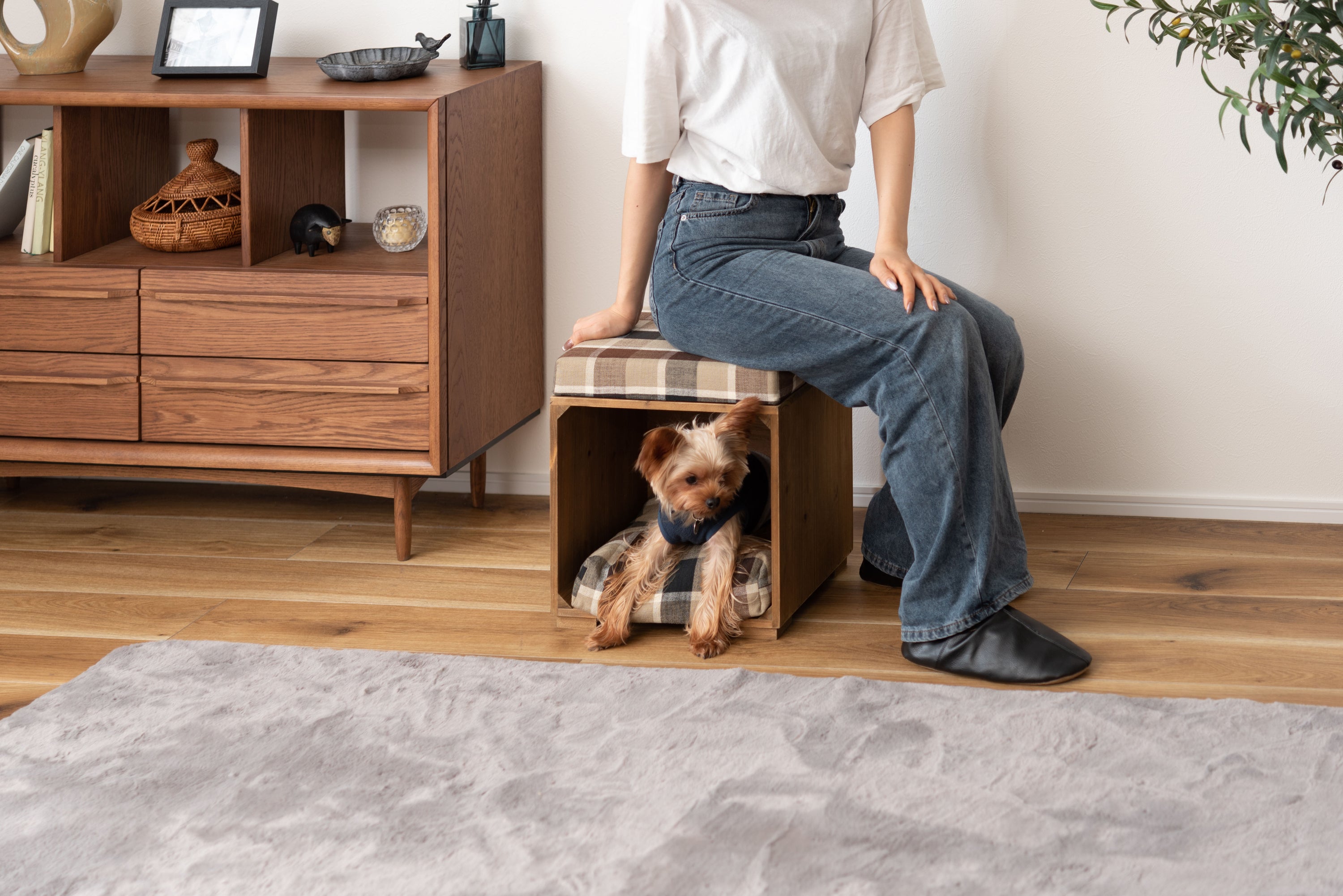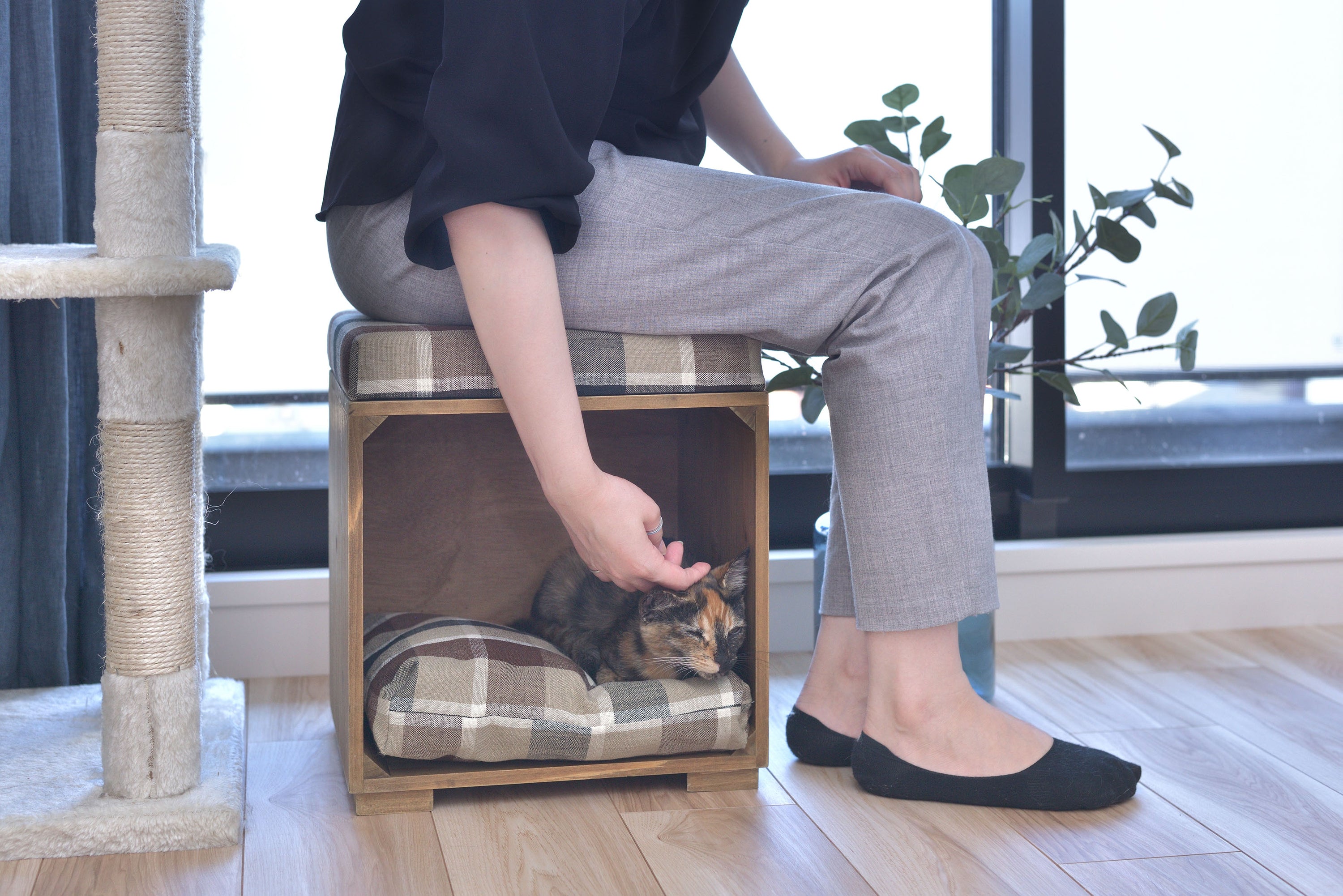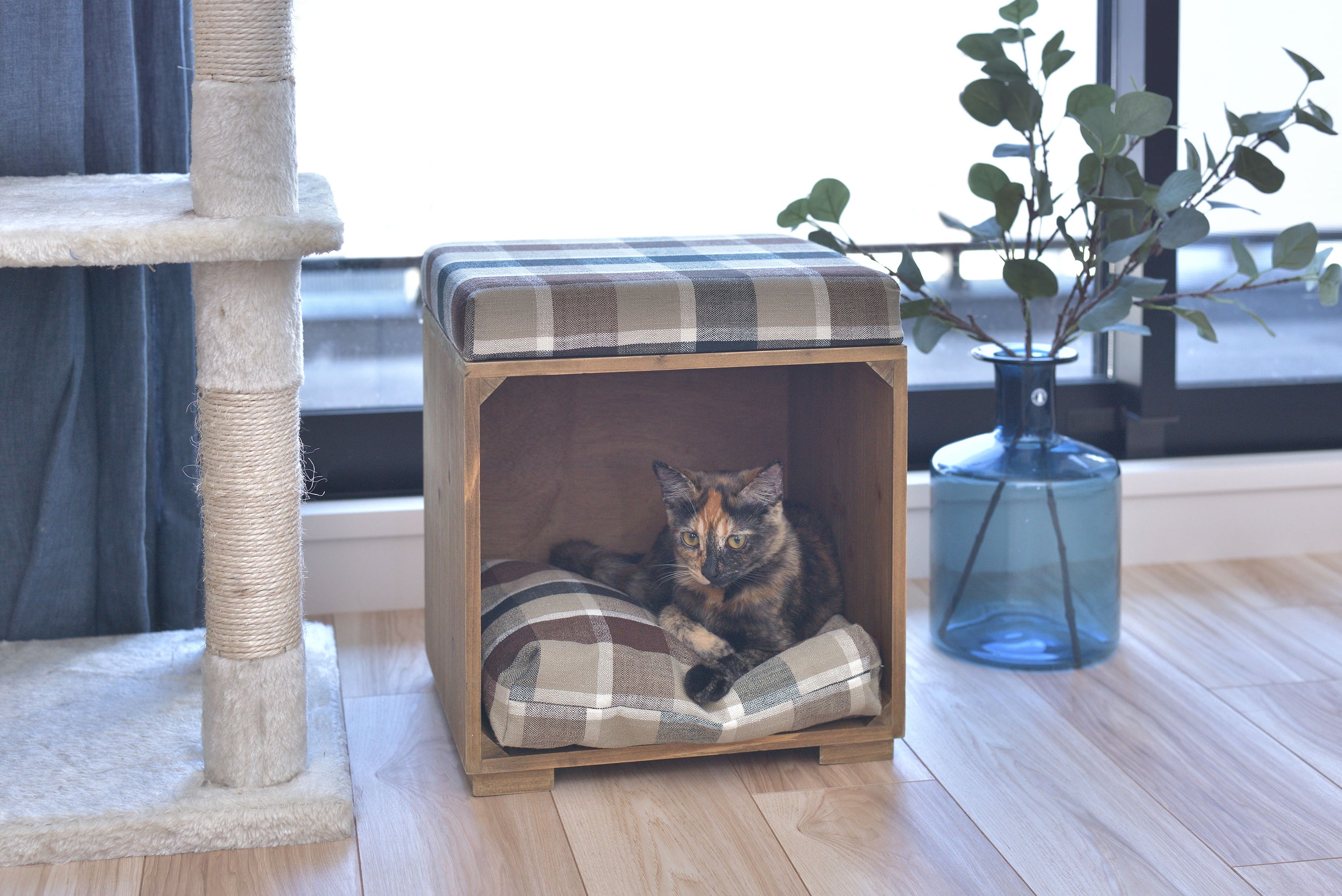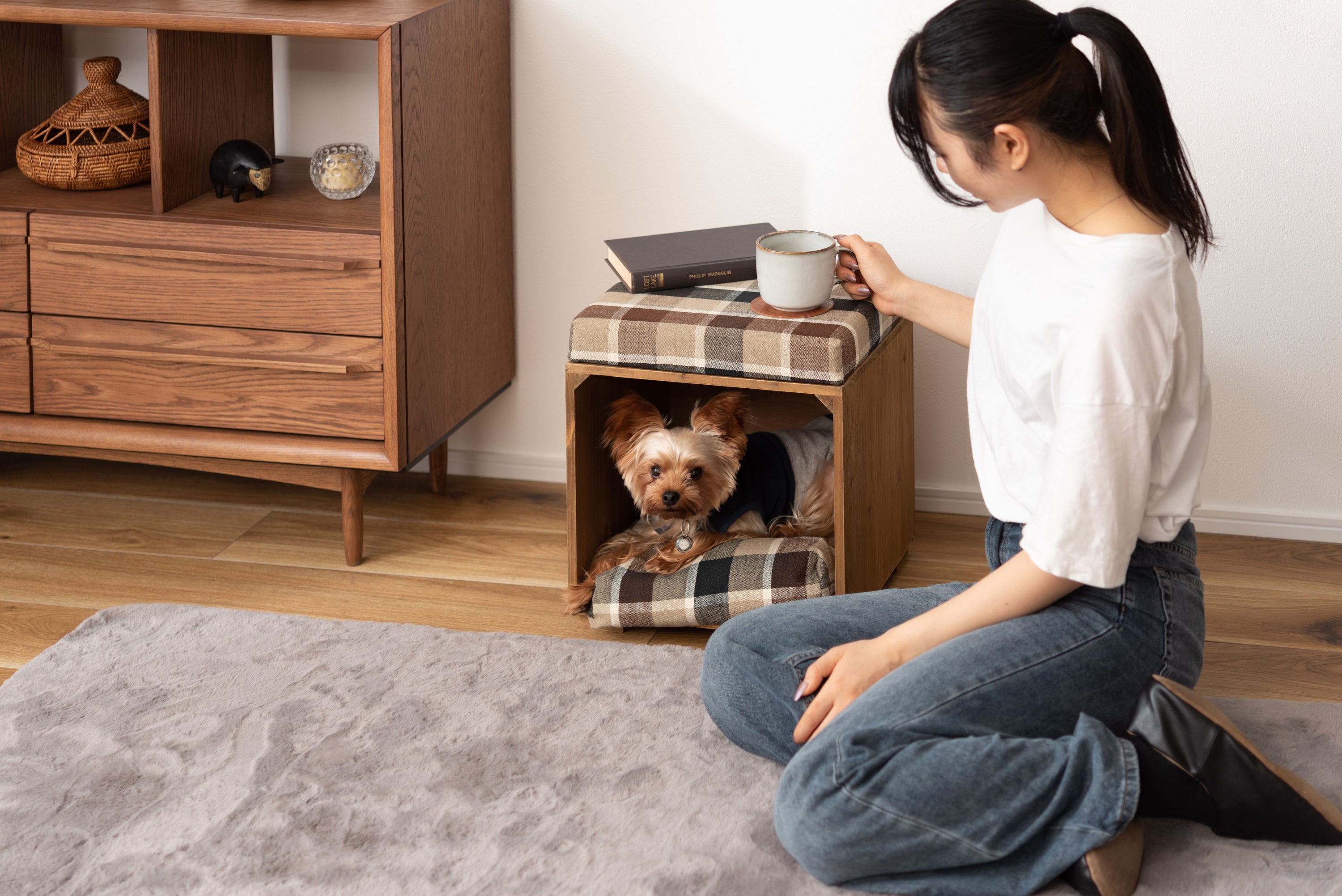 ペットが入れるボックス型のスツール。ペット用クッションは取り外しが可能なので、クッションを外して収納ボックスとしても使えます(座面クッションは取り外しができません)。ペット用クッションはカバーを外して手洗いができるので、いつでも清潔に使えます。アンティーク感のある天然木(杉)フレームに、ナチュラルテイスト柄の生地を使用した、インテリア性の高いペットスツール。