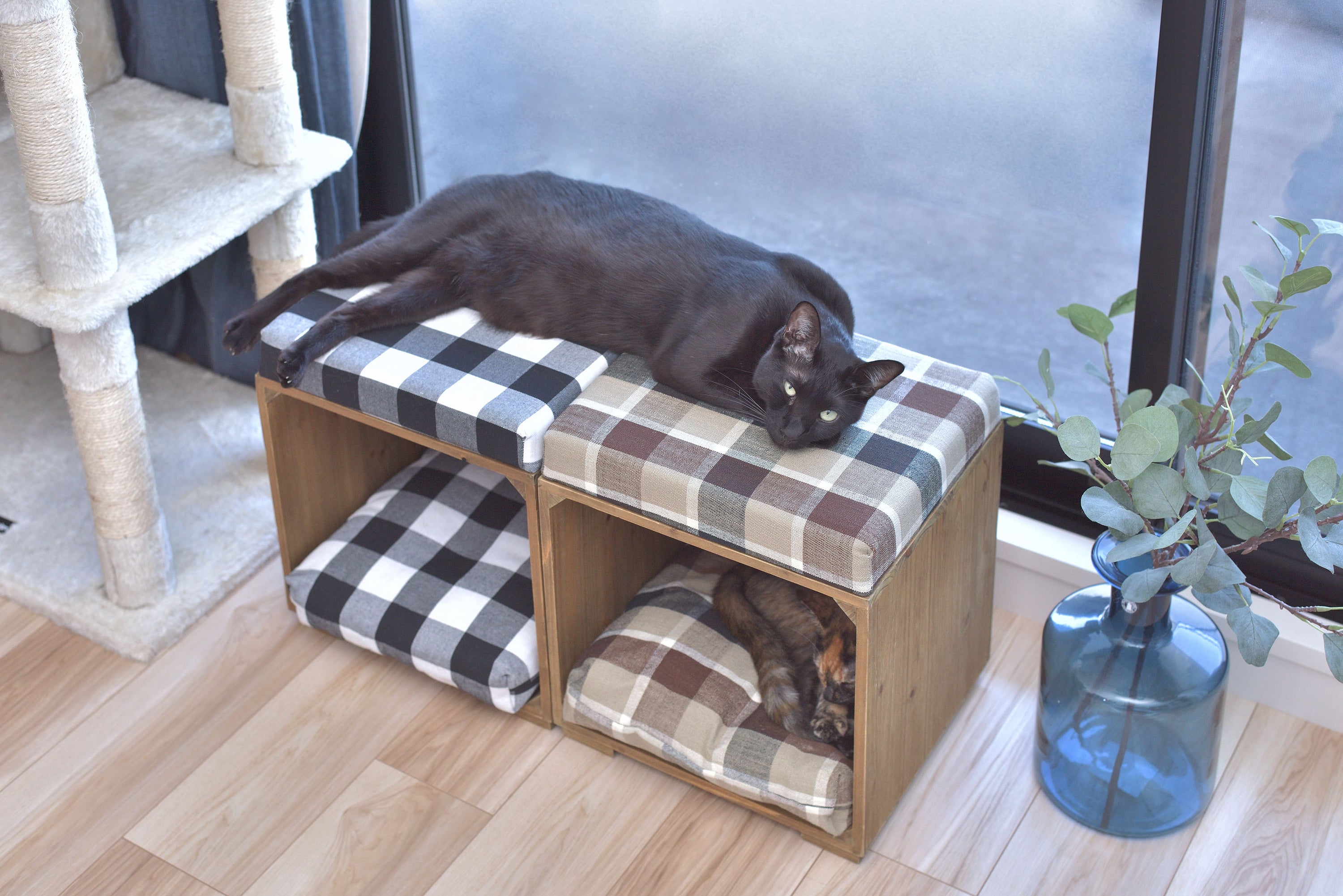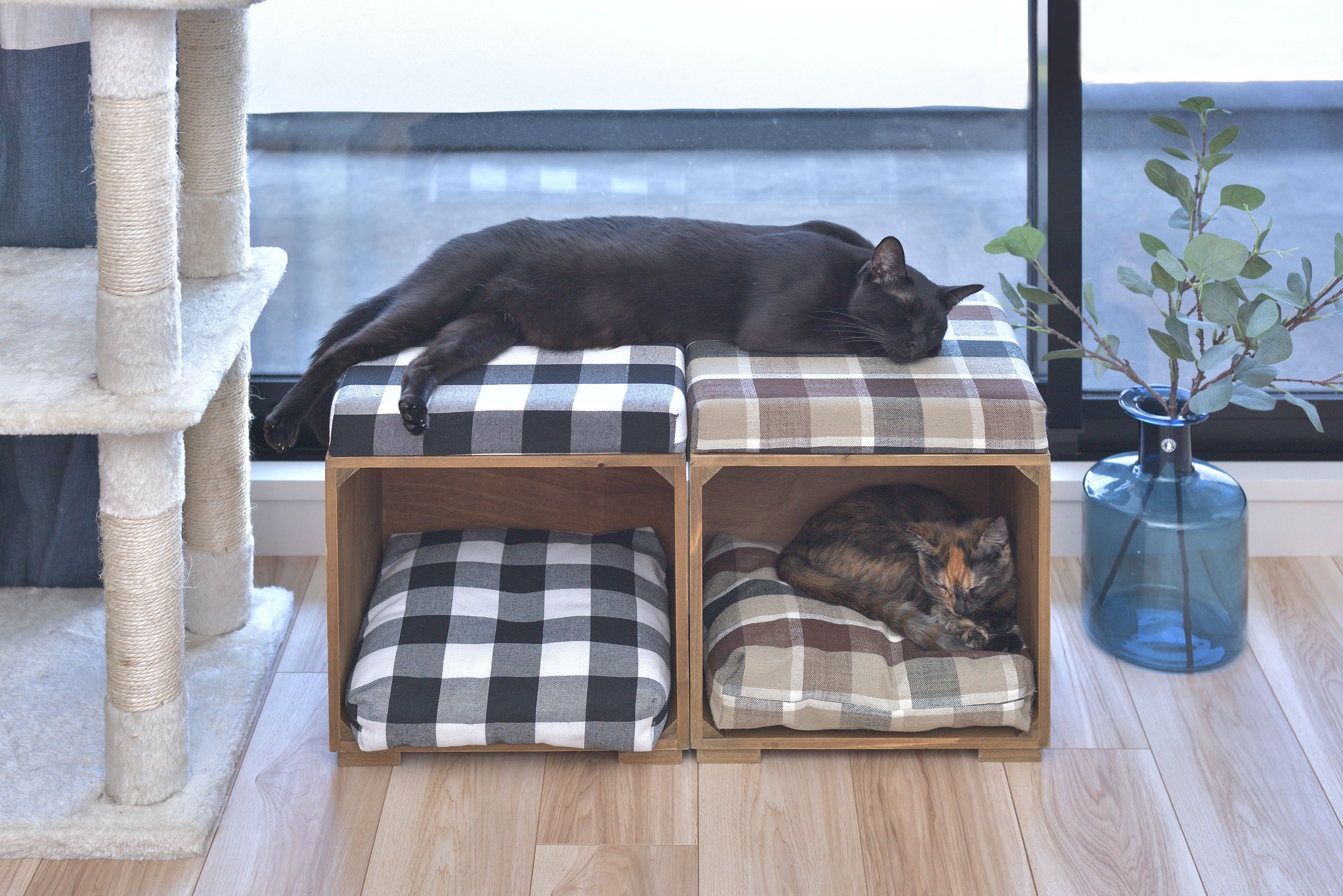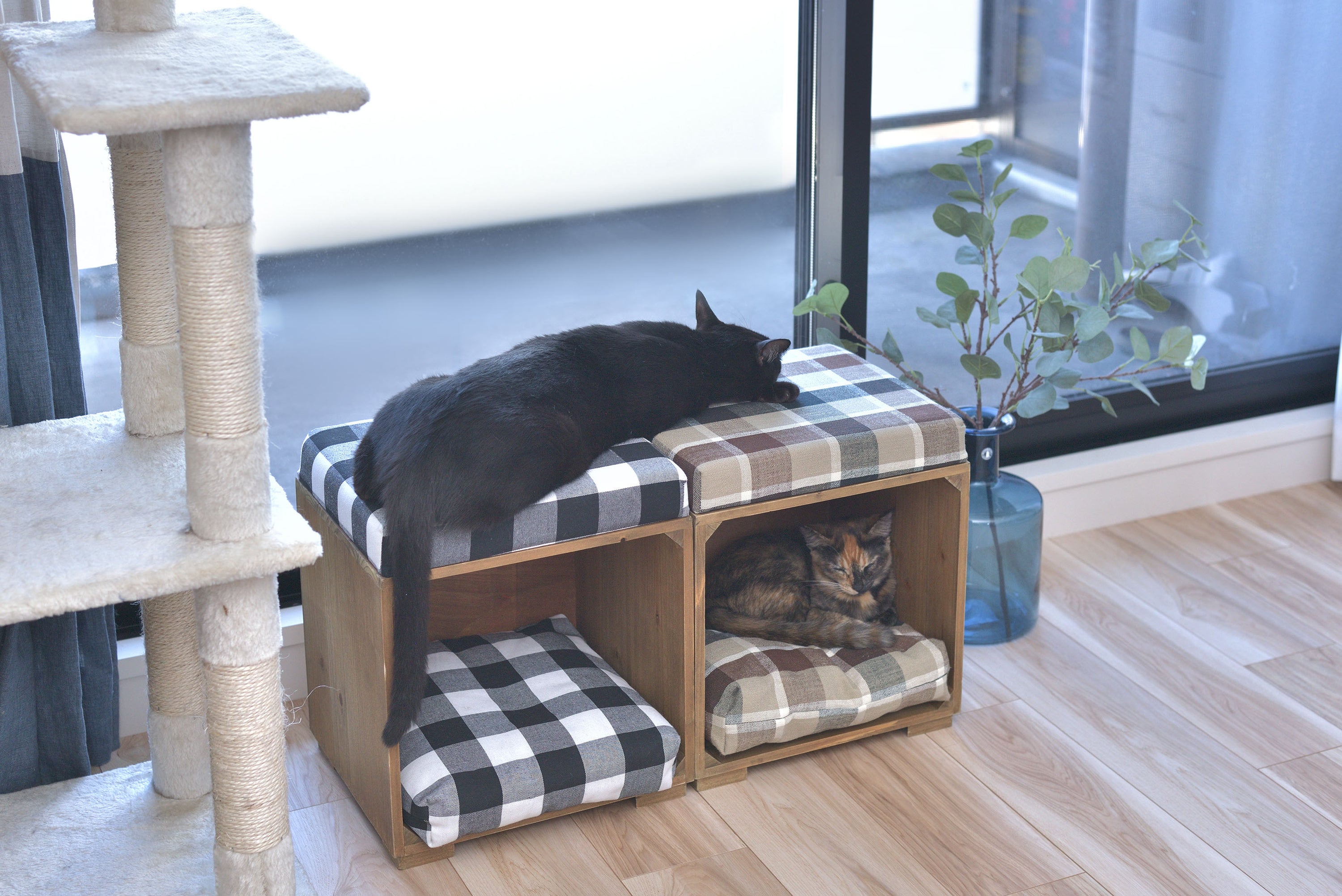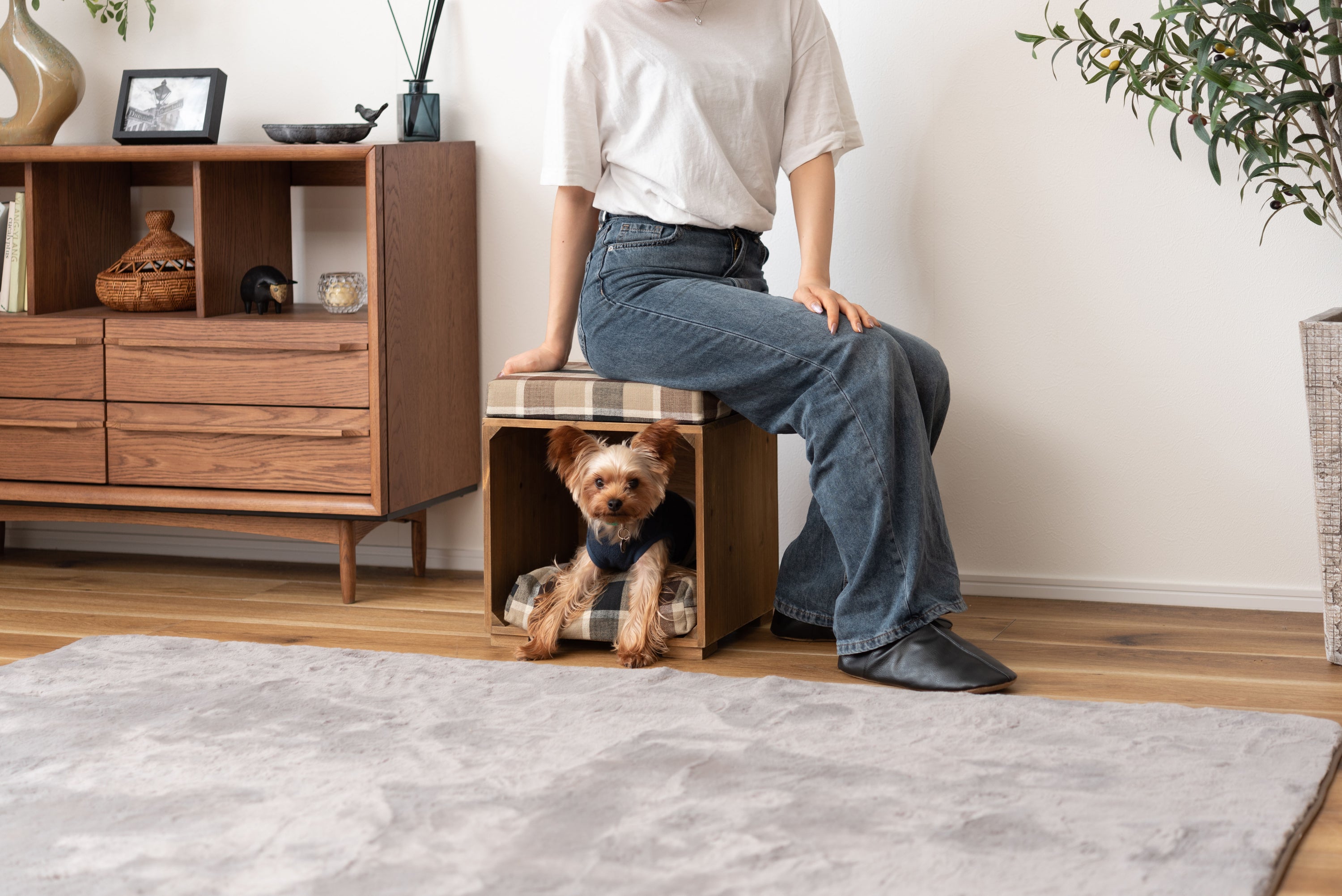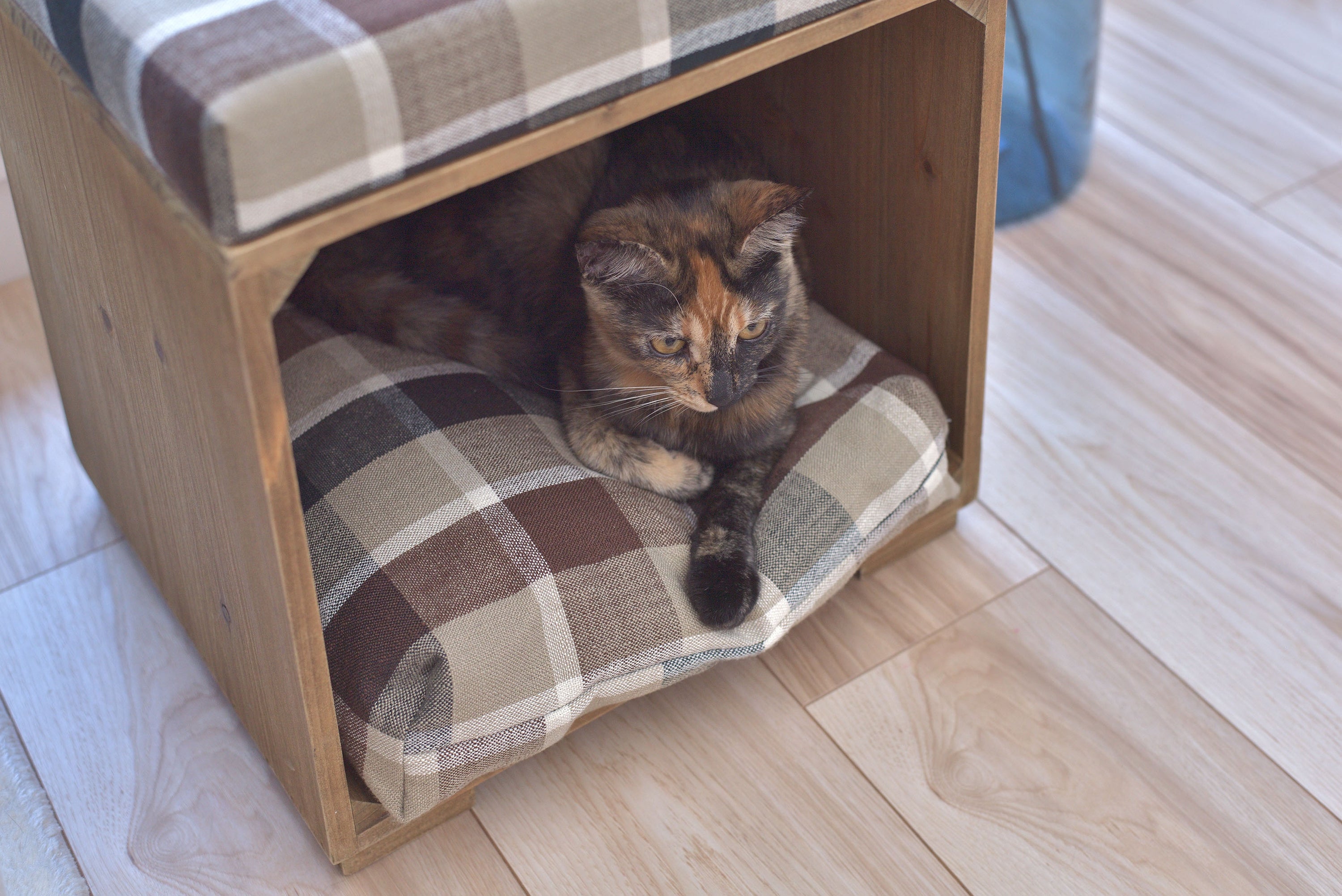 ペットが入れるボックス型のスツール。ペット用クッションは取り外しが可能なので、クッションを外して収納ボックスとしても使えます(座面クッションは取り外しができません)。ペット用クッションはカバーを外して手洗いができるので、いつでも清潔に使えます。アンティーク感のある天然木(杉)フレームに、ナチュラルテイスト柄の生地を使用した、インテリア性の高いペットスツール。