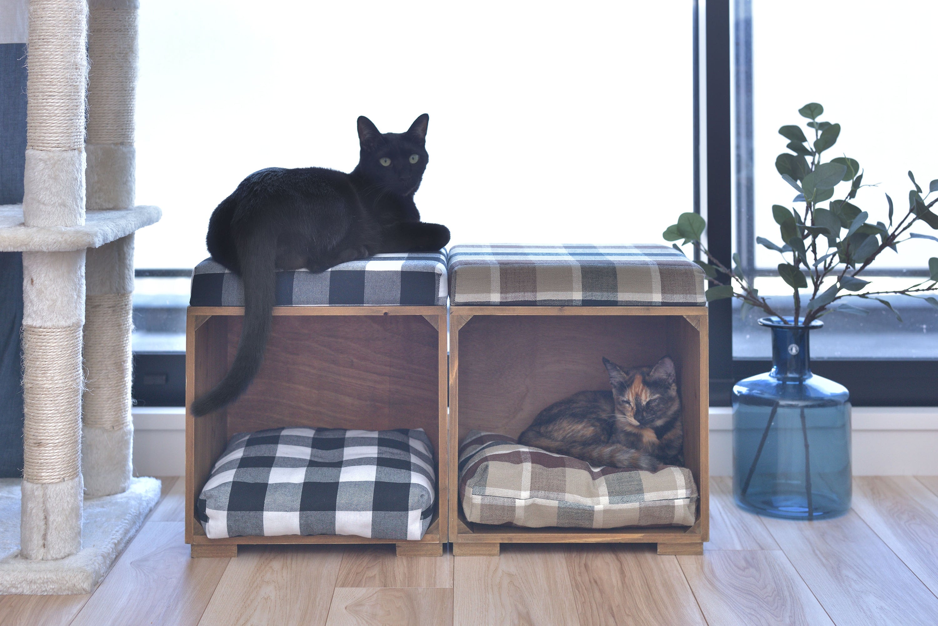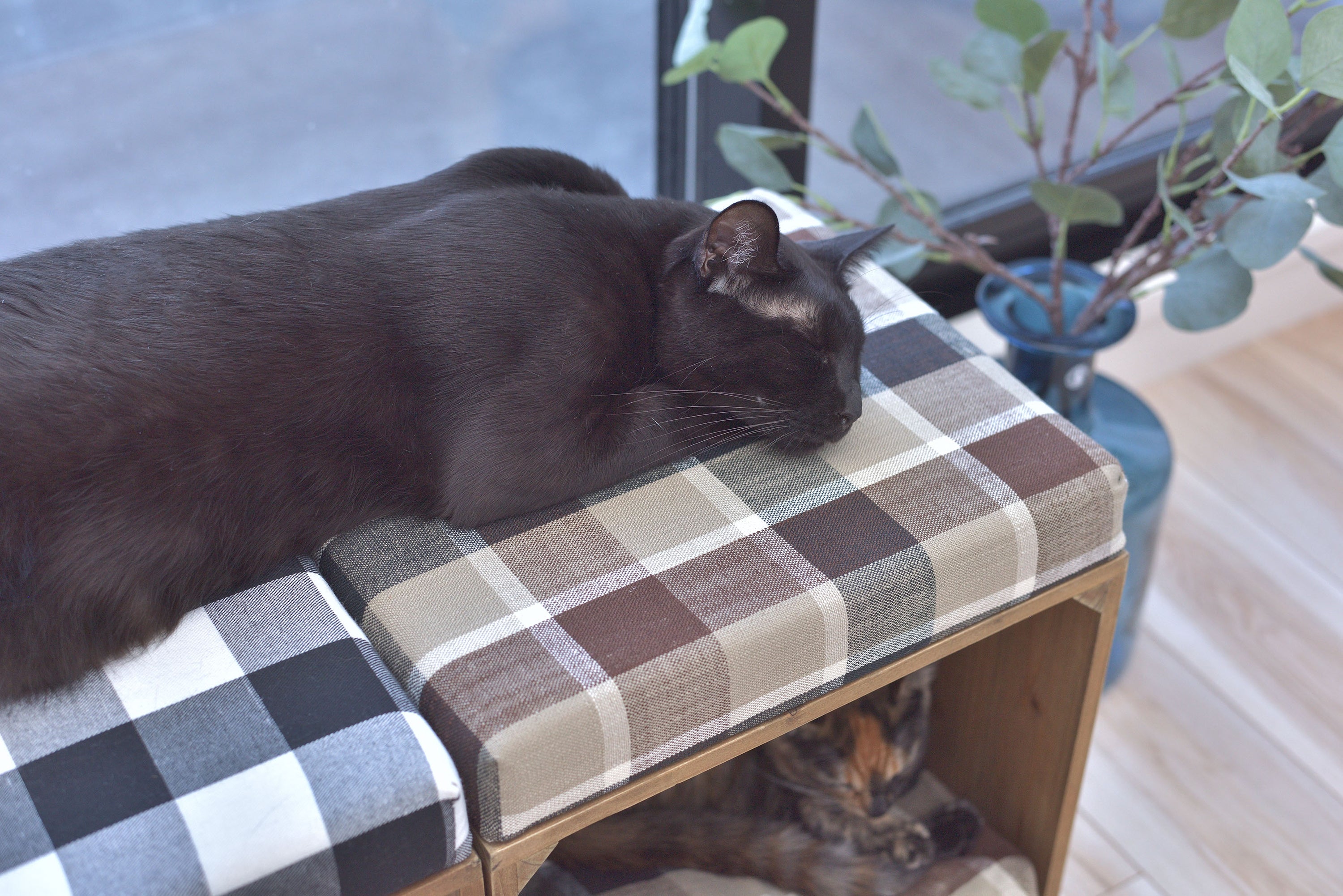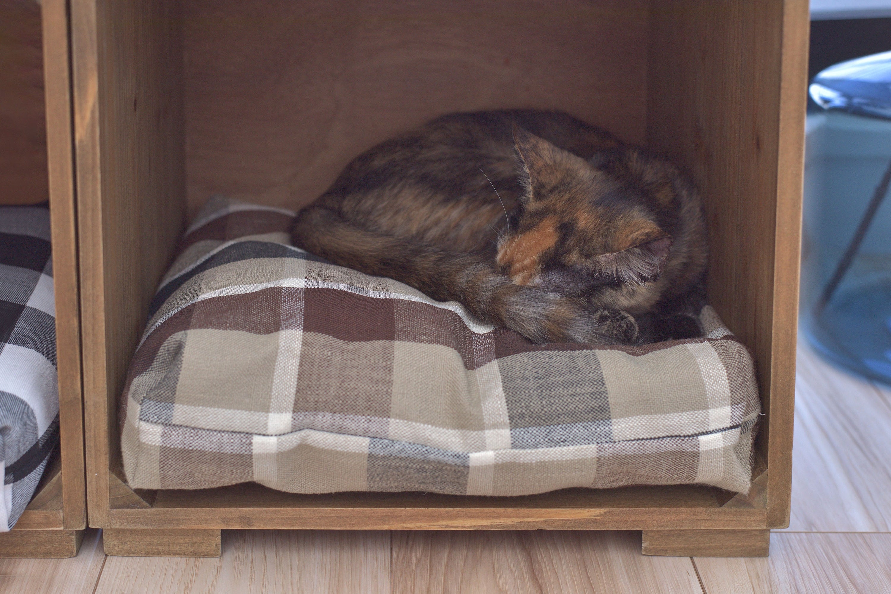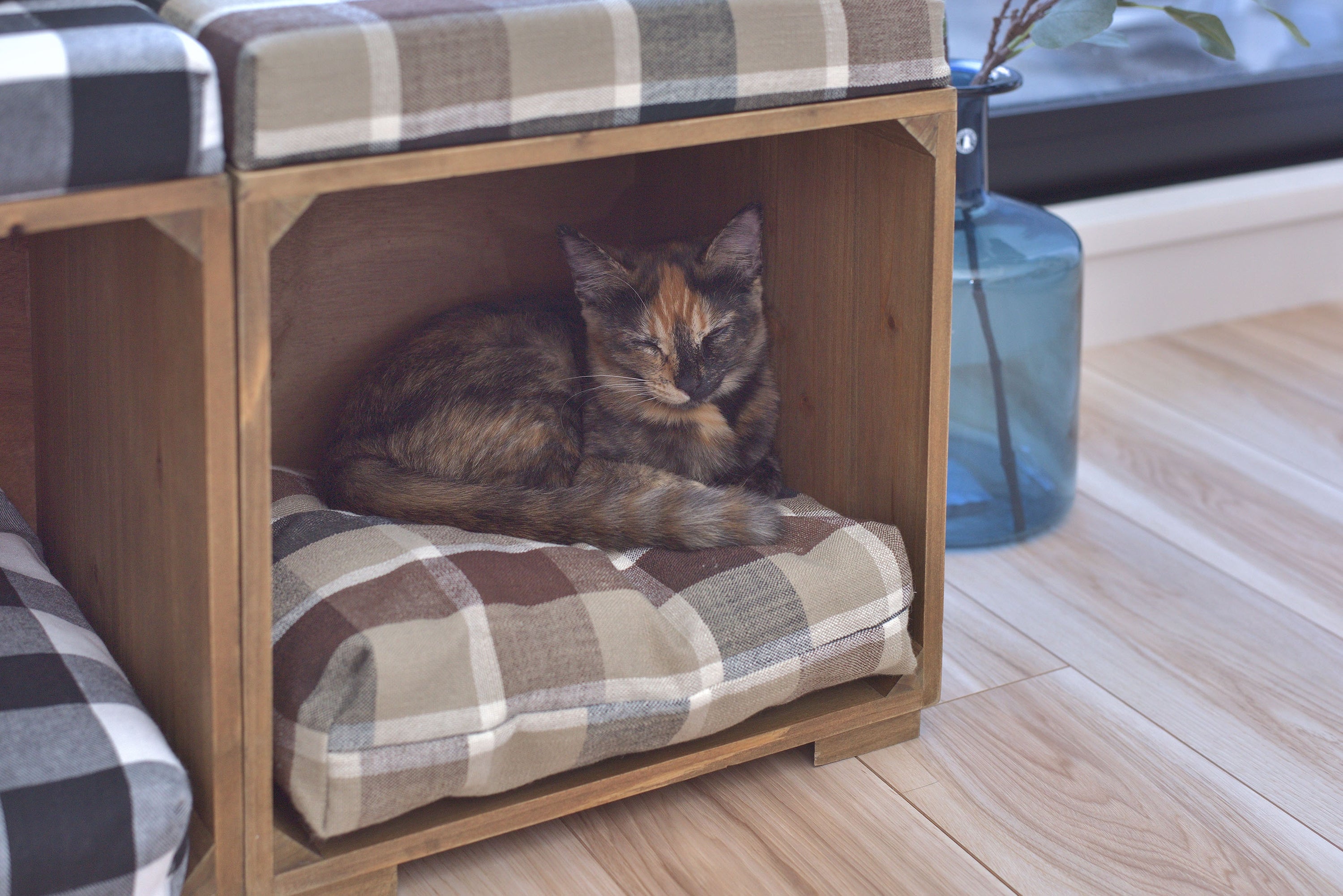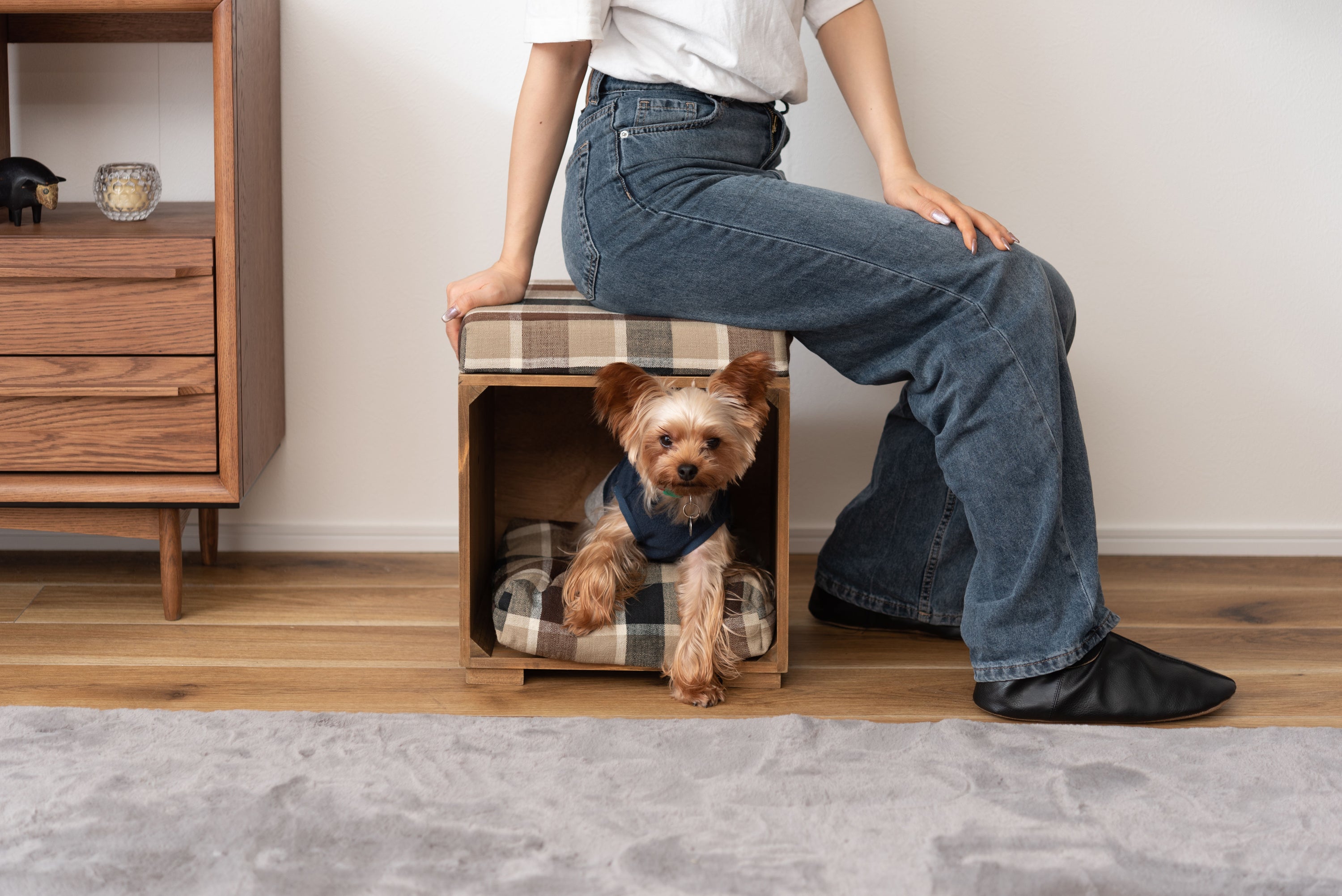 ペットが入れるボックス型のスツール。ペット用クッションは取り外しが可能なので、クッションを外して収納ボックスとしても使えます(座面クッションは取り外しができません)。ペット用クッションはカバーを外して手洗いができるので、いつでも清潔に使えます。アンティーク感のある天然木(杉)フレームに、ナチュラルテイスト柄の生地を使用した、インテリア性の高いペットスツール。