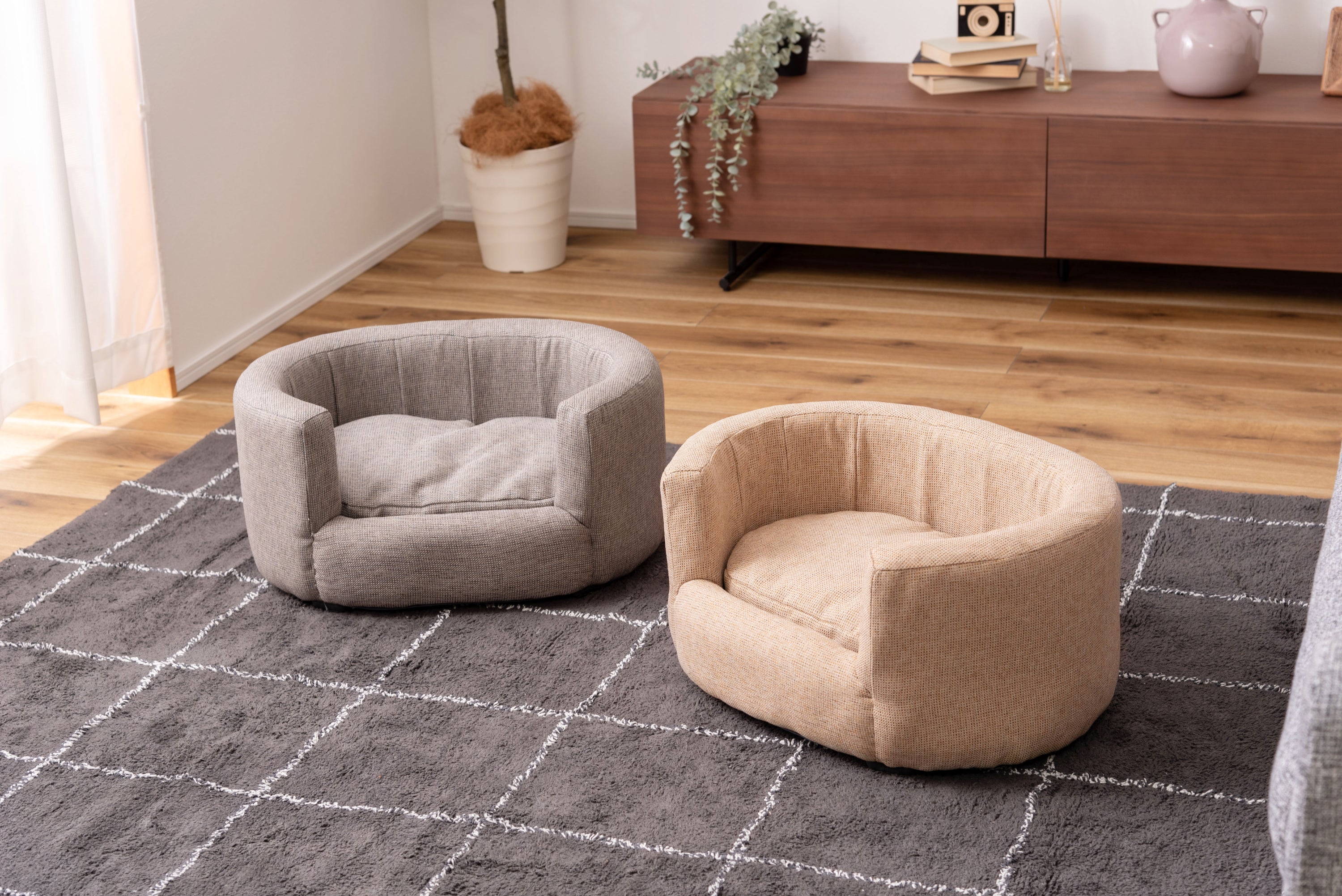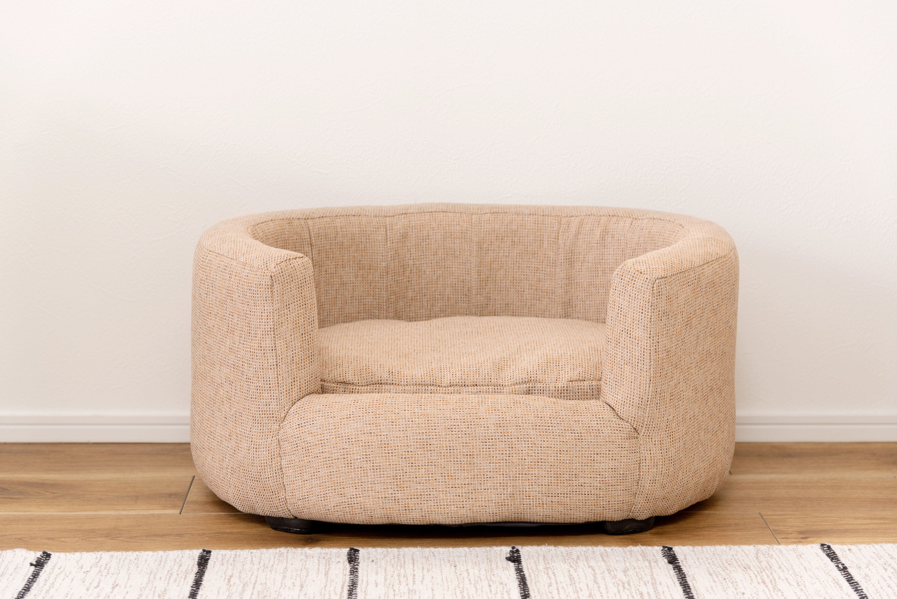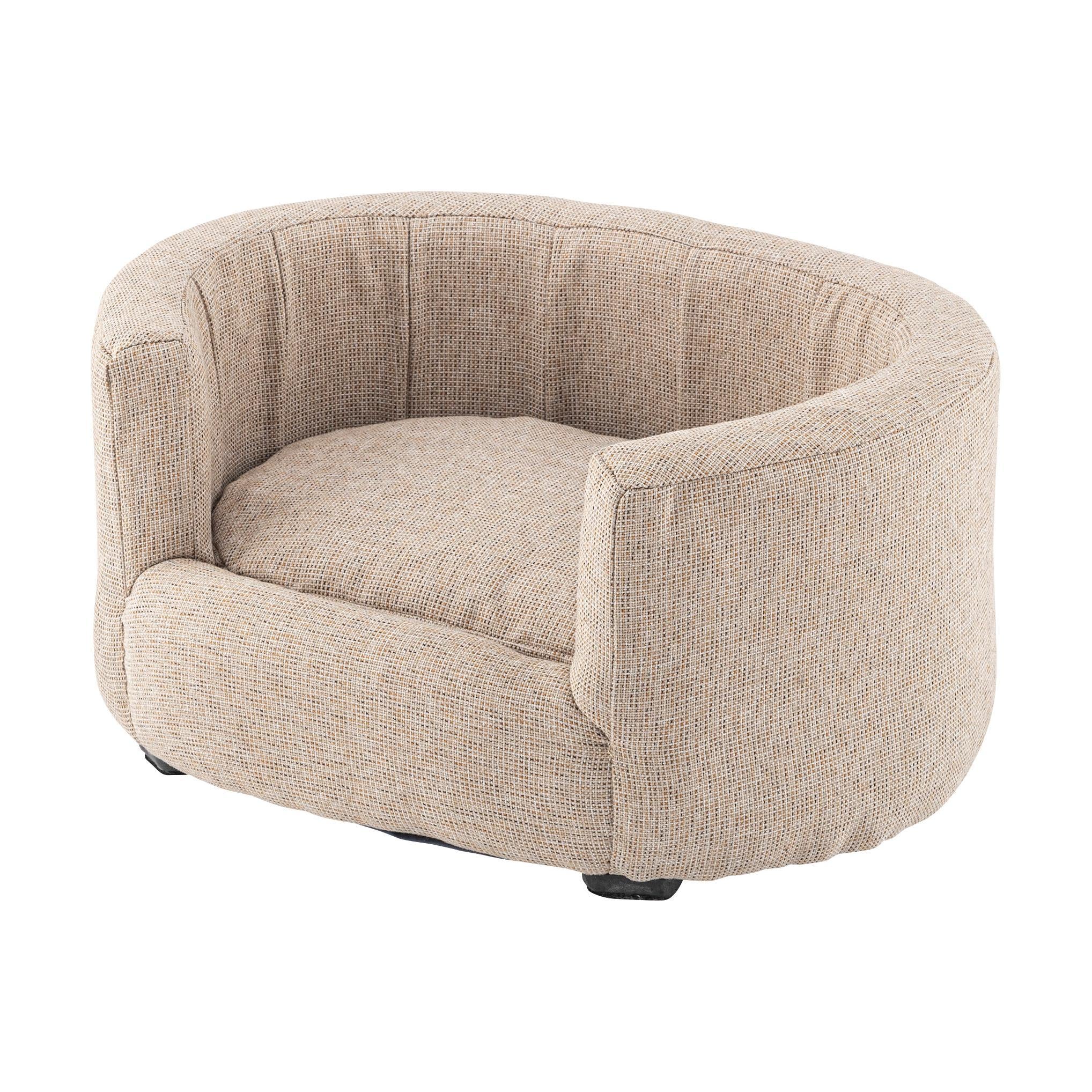 ペット用の小ぶりで包み込むような背もたれが特徴のソファ。特別なペットの居場所を作ります。落ち着いたシンプルなカラーリングとコロンと丸みを帯びた形状がお洒落。ペットとの生活がより充実したものになる可愛いソファ。優しいラインのオーバル型/包み込むようなオーバル型はインテリアとしても取り入れやすいデザイン。設置しやすいコンパクトサイズも魅力。ちょうどいい高さ/ペットとのふれあいにちょうどいい高さに設計されています。床に座っても、座椅子やソファに座ってもちょうどいい高さでペットと空間を共有できます。クッションは取り外し可能/カバーリング仕様でクッションからもカバーを取り外すことができます。細かなディティール/座面にもフレームにもクッション性を持たせています。細かなディティールまでこだわり、作り込まれています。