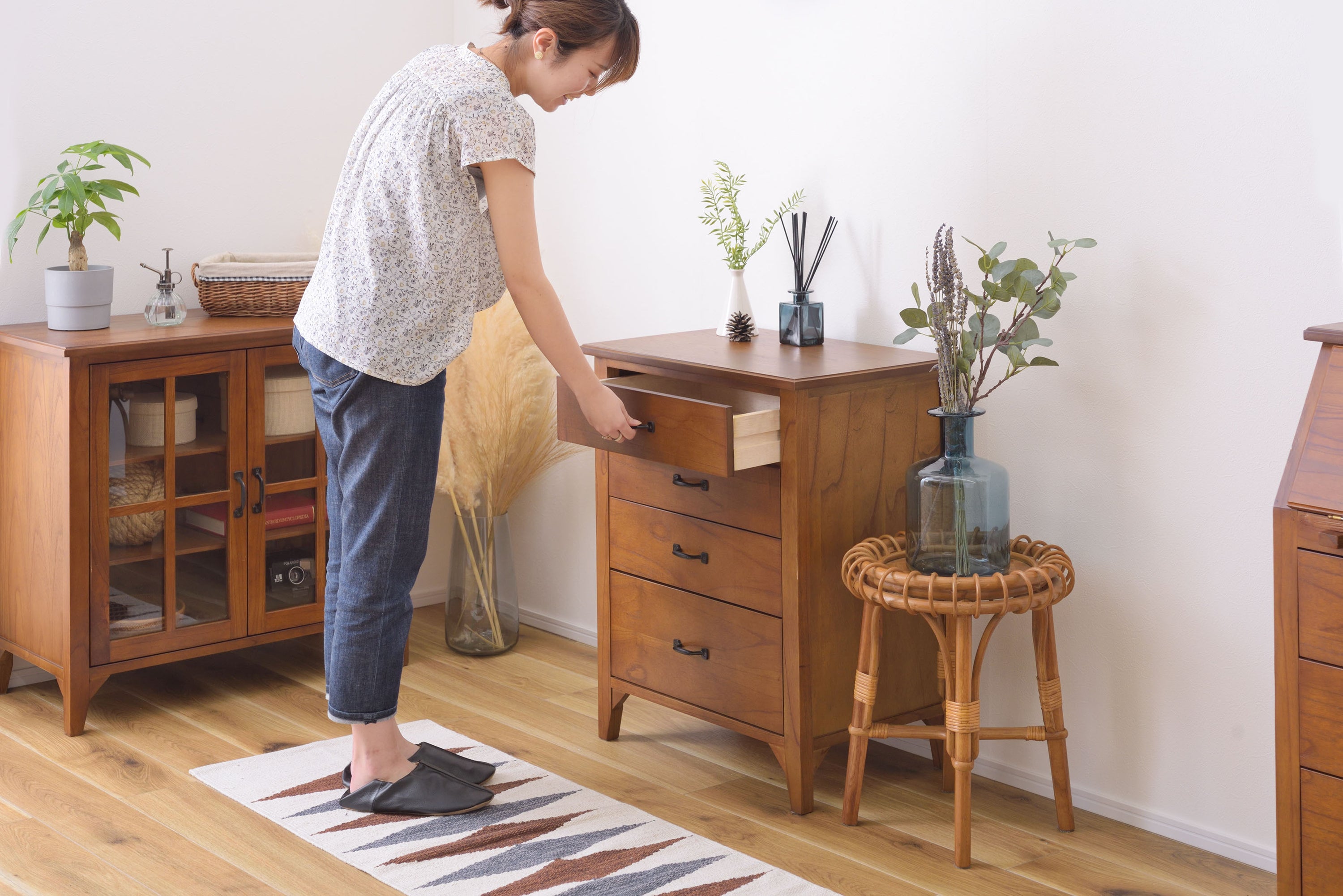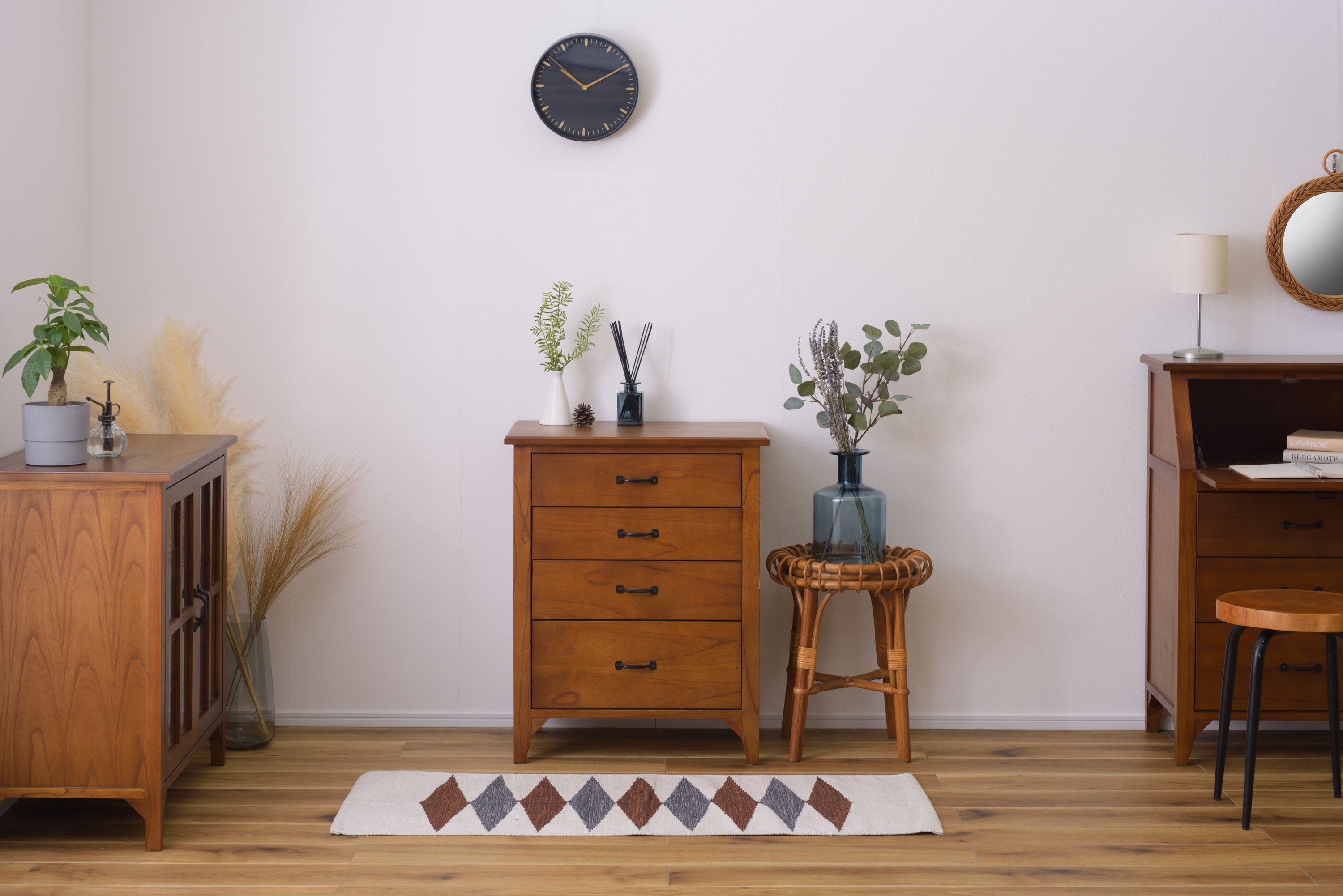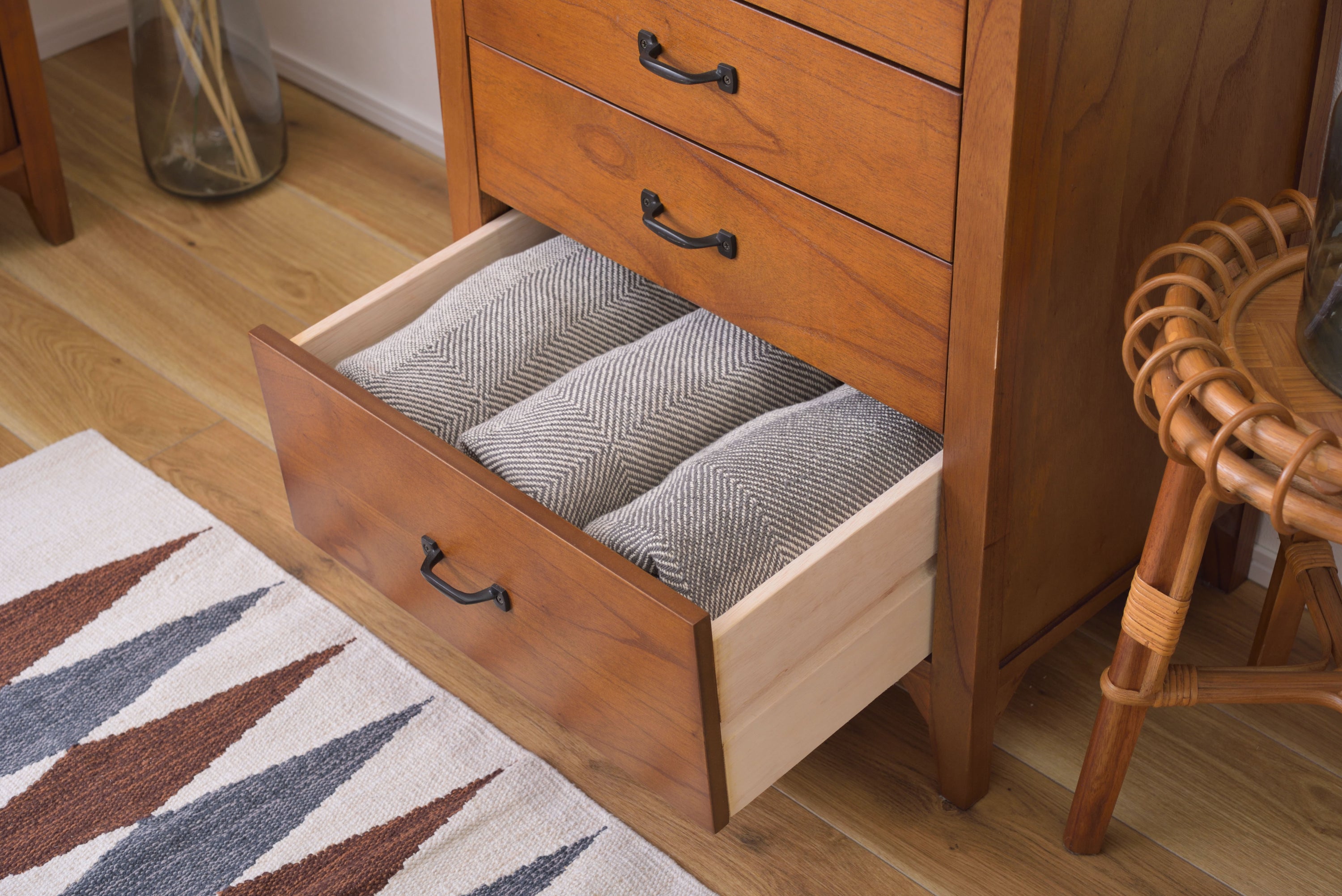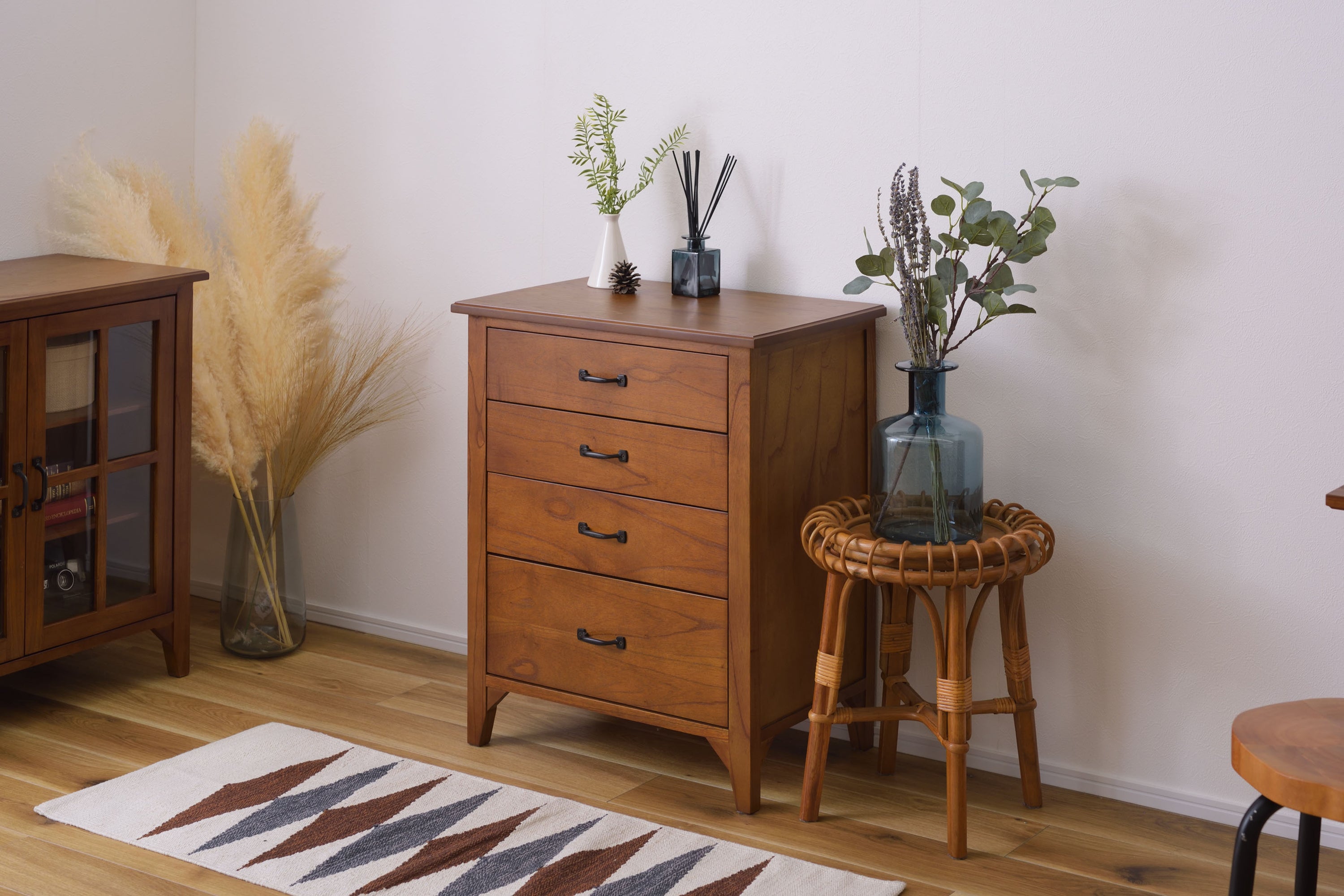 天然木の豊かな風合いと統一感のある黒アイアンが特徴の定番人気シリーズ「ティンバー」にミニチェストが登場。スリムなサイズ感で限られた空間にも設置できます。引き出しが4杯ついている収納力のあるミニチェスト。一番下の引き出しのみやや大きいサイズになっているので、より多く収納したい場合は一番下の引き出しへ。脚裏にはフェルトが付いているので、床への傷防止になり安心。アイアンの取っ手と風合いのある天然木のヴィンテージ感漂うミニチェスト。