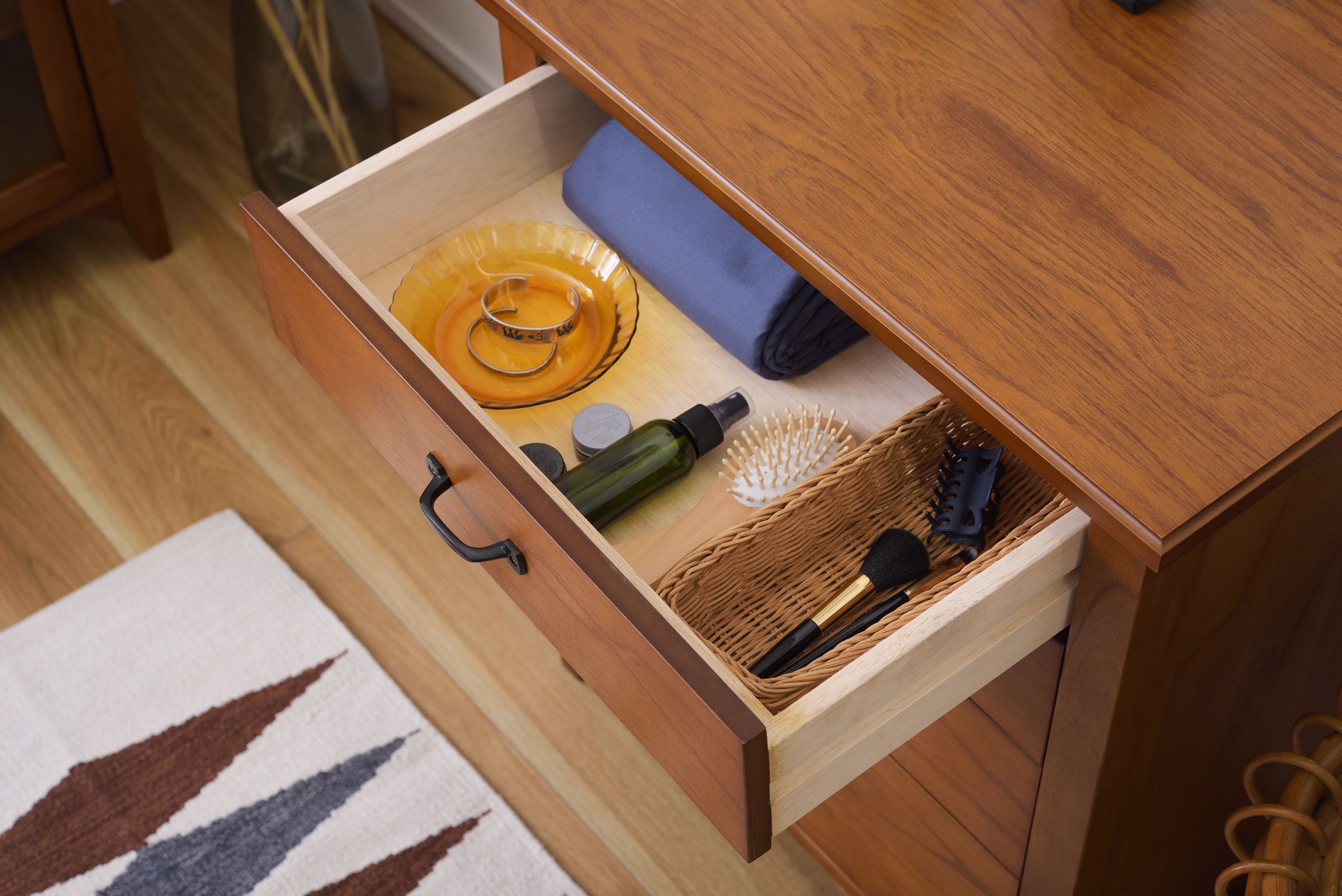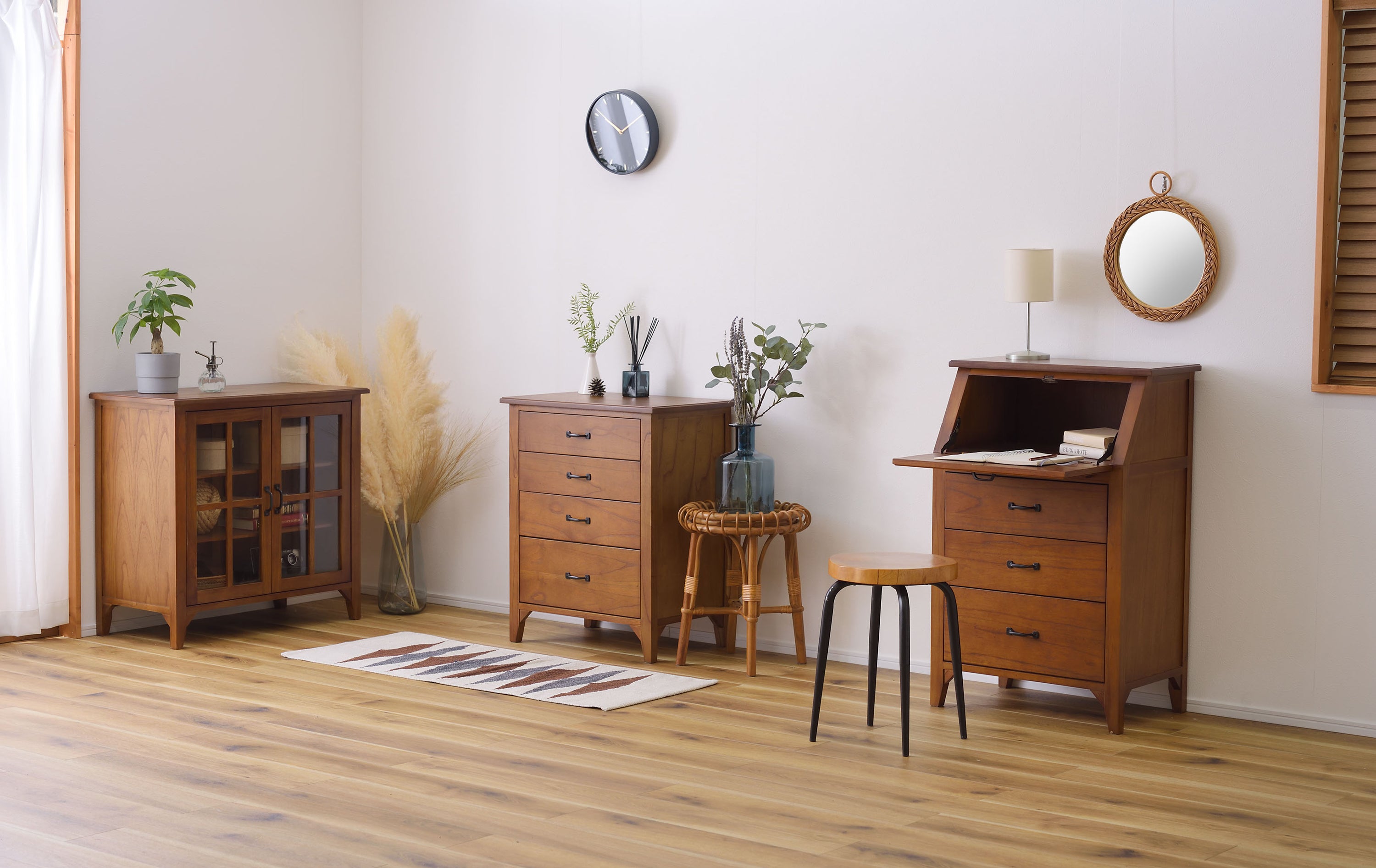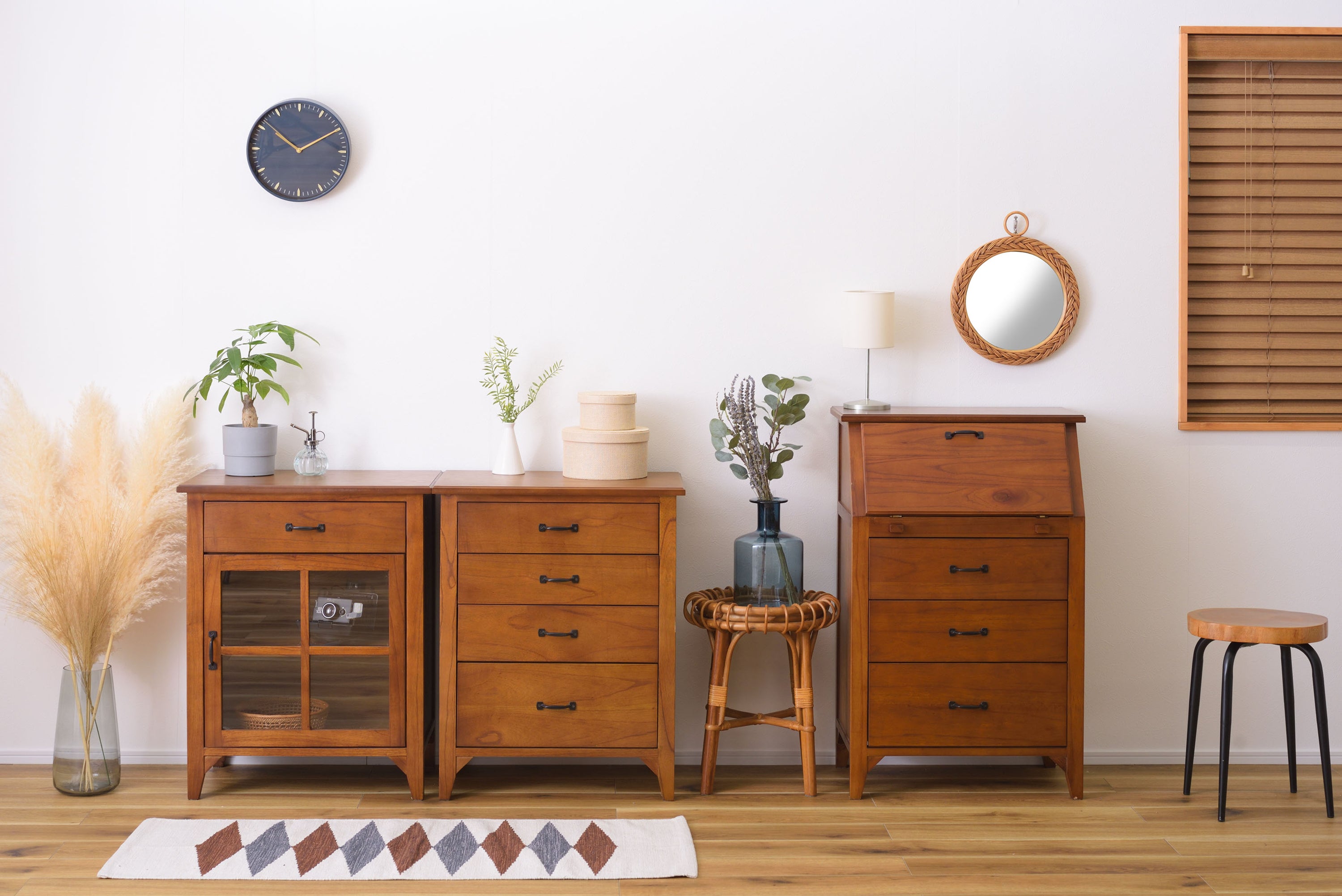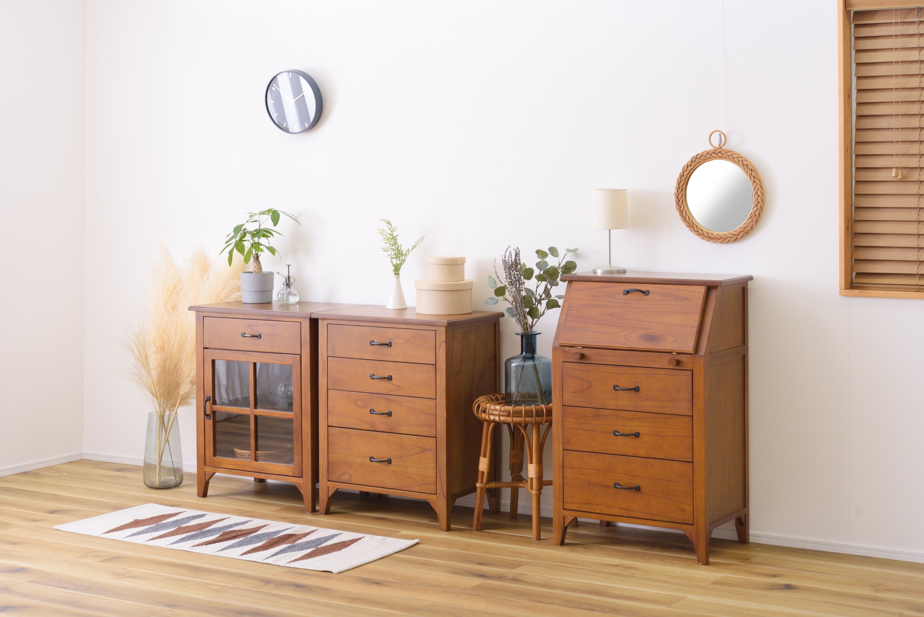 天然木の豊かな風合いと統一感のある黒アイアンが特徴の定番人気シリーズ「ティンバー」にミニチェストが登場。スリムなサイズ感で限られた空間にも設置できます。引き出しが4杯ついている収納力のあるミニチェスト。一番下の引き出しのみやや大きいサイズになっているので、より多く収納したい場合は一番下の引き出しへ。脚裏にはフェルトが付いているので、床への傷防止になり安心。アイアンの取っ手と風合いのある天然木のヴィンテージ感漂うミニチェスト。