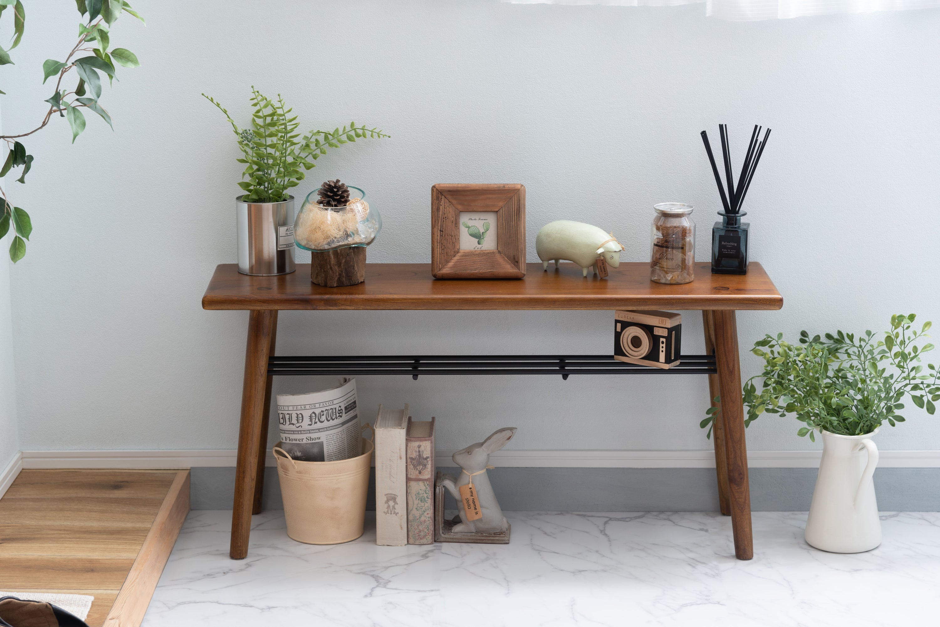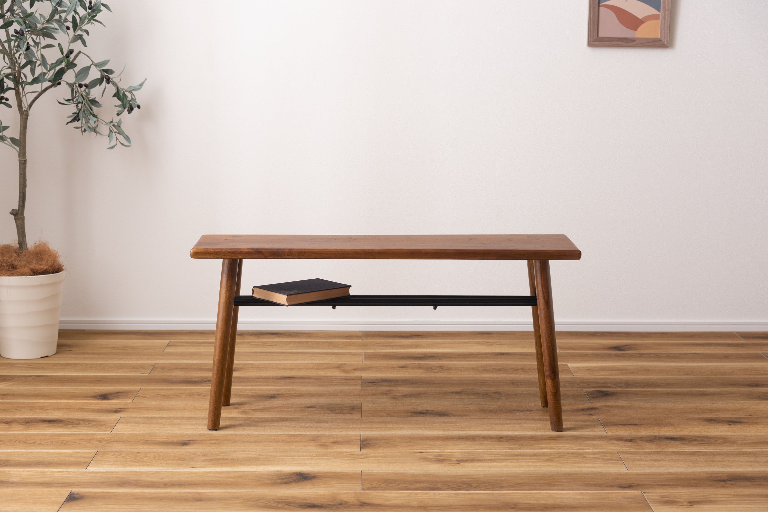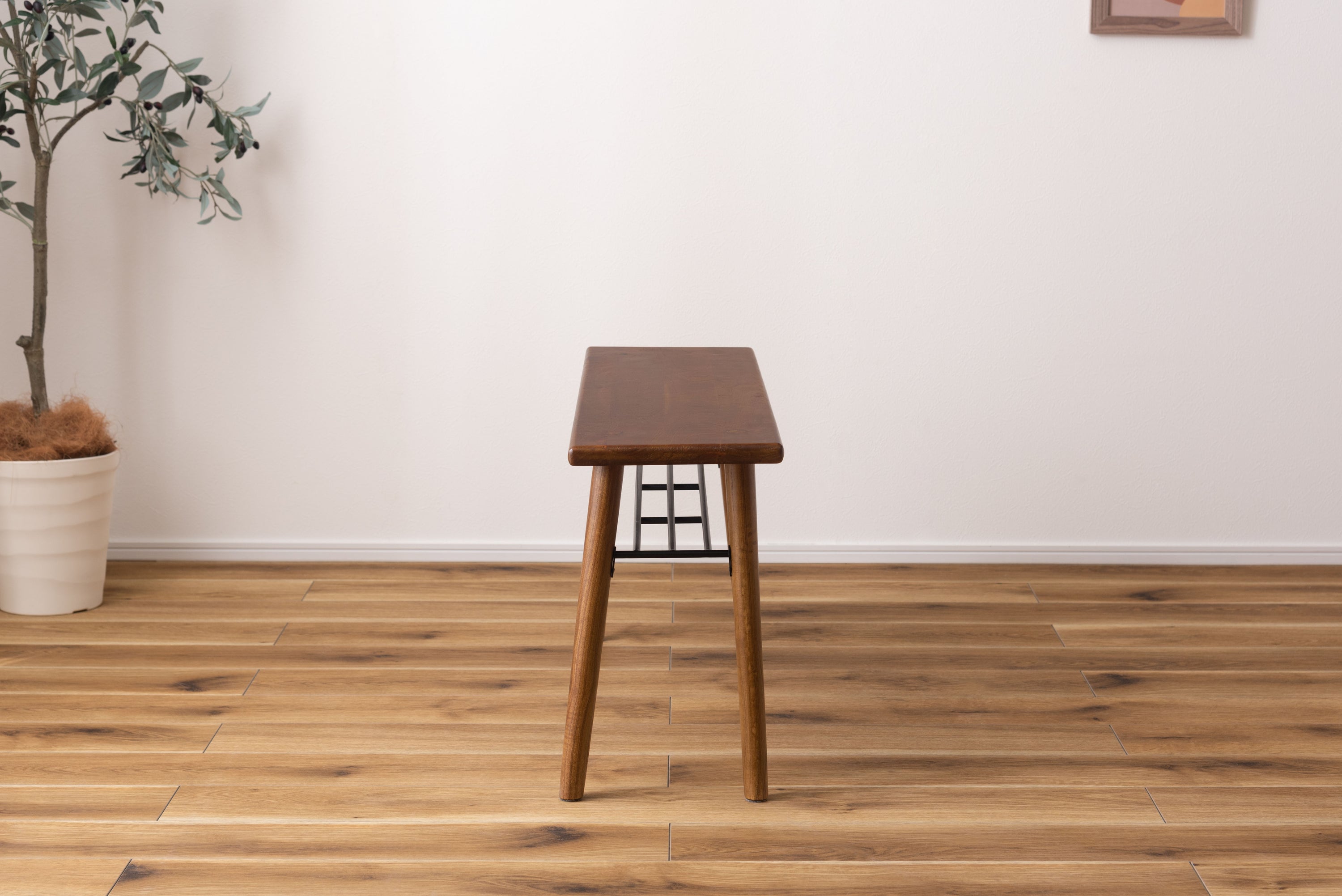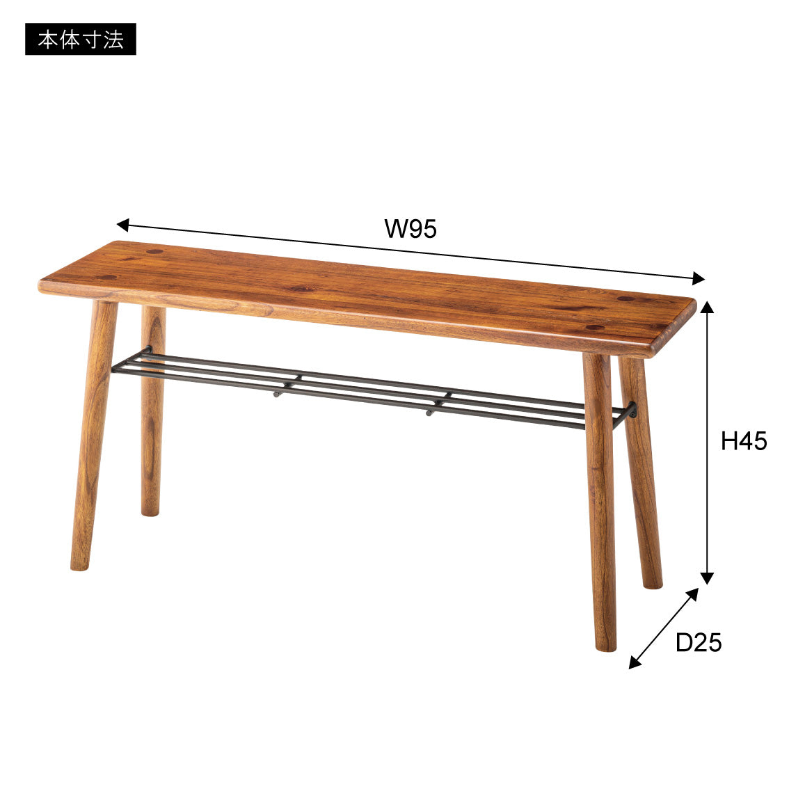 天然木とアイアンの組み合わせの趣ある木製のベンチ。玄関等の限られたスペースに/アイアンの棚板をスリッパやシューズラックに。活用方法もアイデア次第で広がります。省スペース設計/奥行25cmと一般的なベンチに比べコンパクトなサイズに設計されています。ダイニングベンチにも/すっきりとした細身の脚は様々なダイニングテーブルともよく合います。プランタースタンドに/グリーンを美しく見せる素朴な風合いが、置くものをより引き立てます。細かなディティール/天板のエッジには丸みを持たせ、優しい木目に合わせた細かなディティールにもこだわっています。