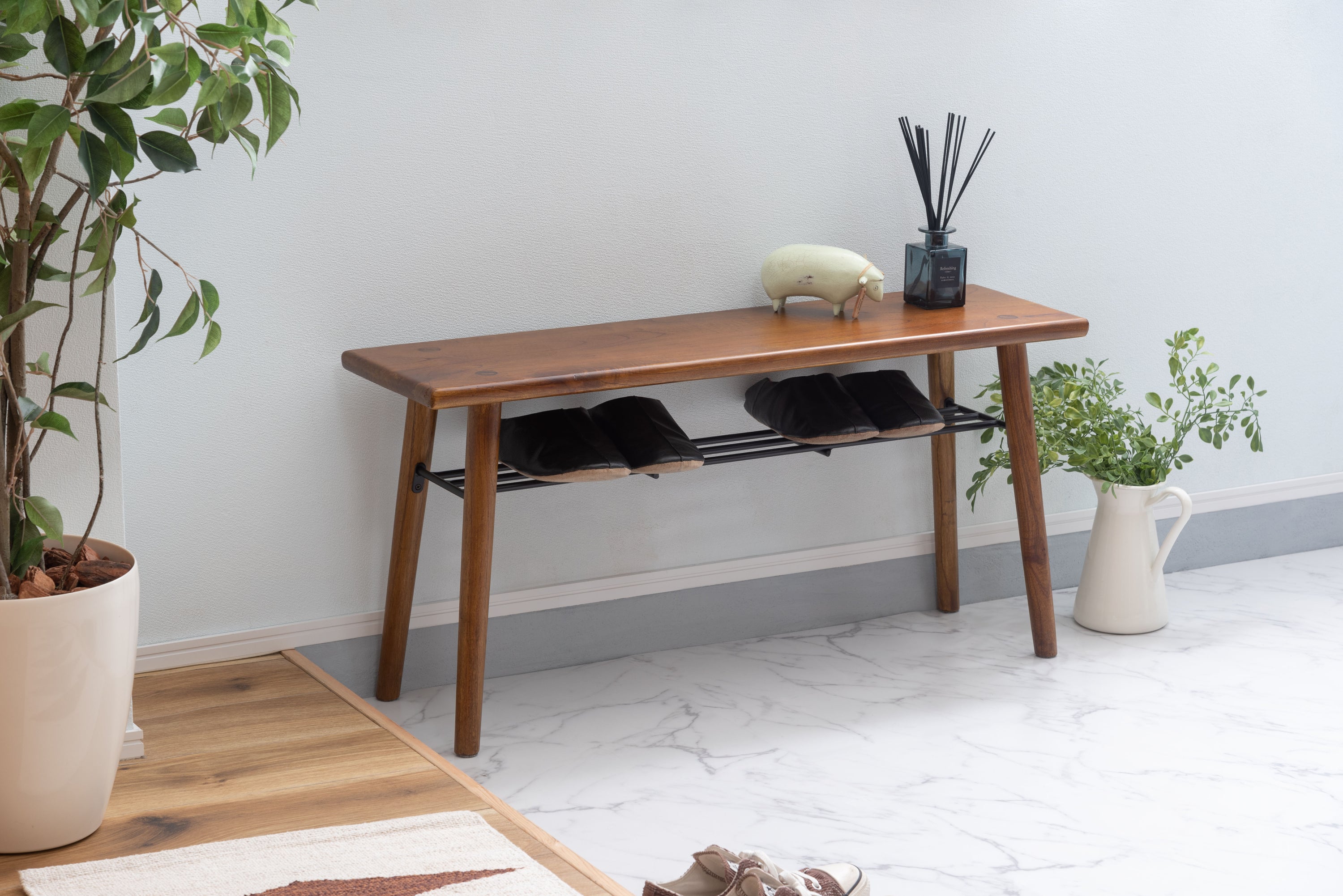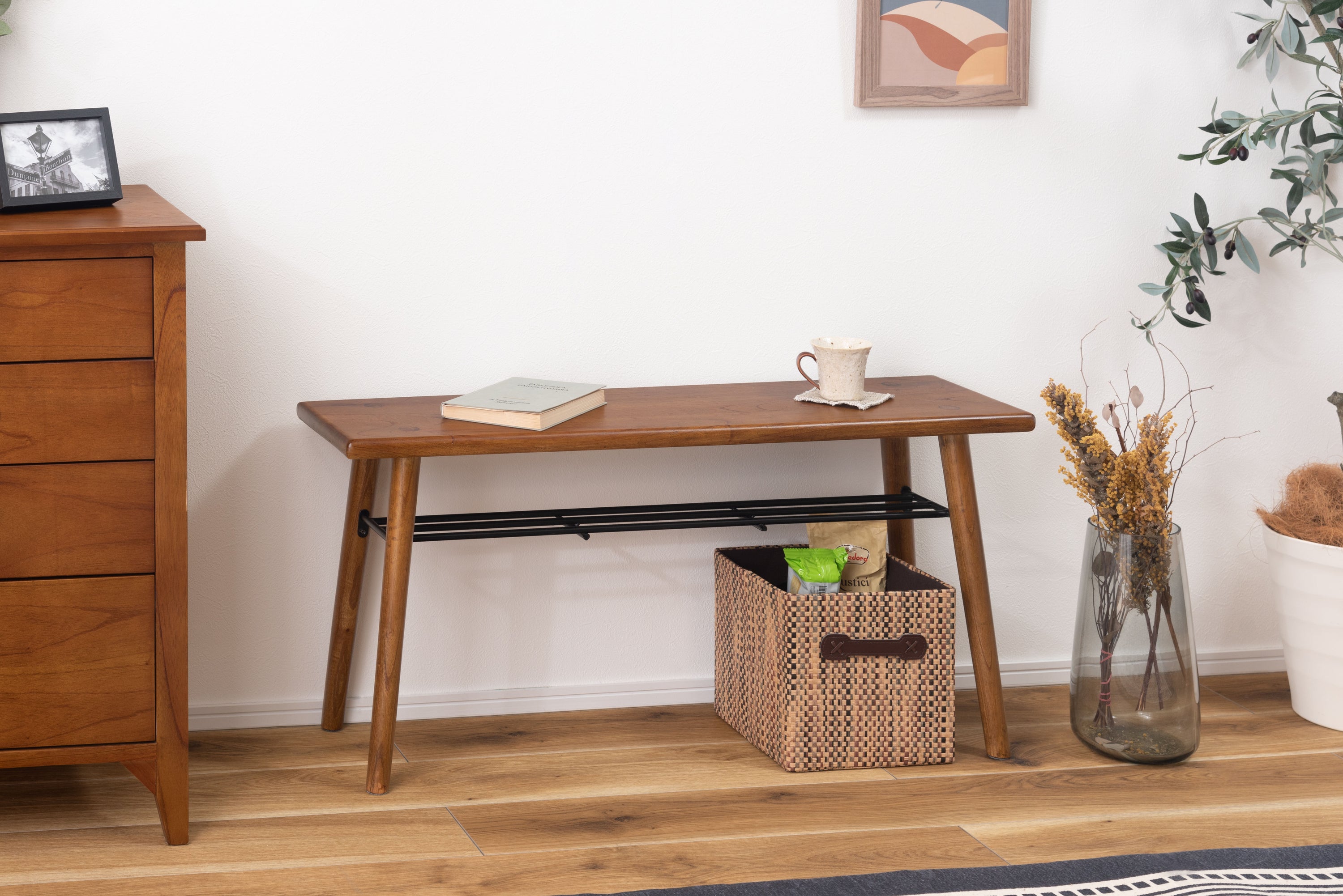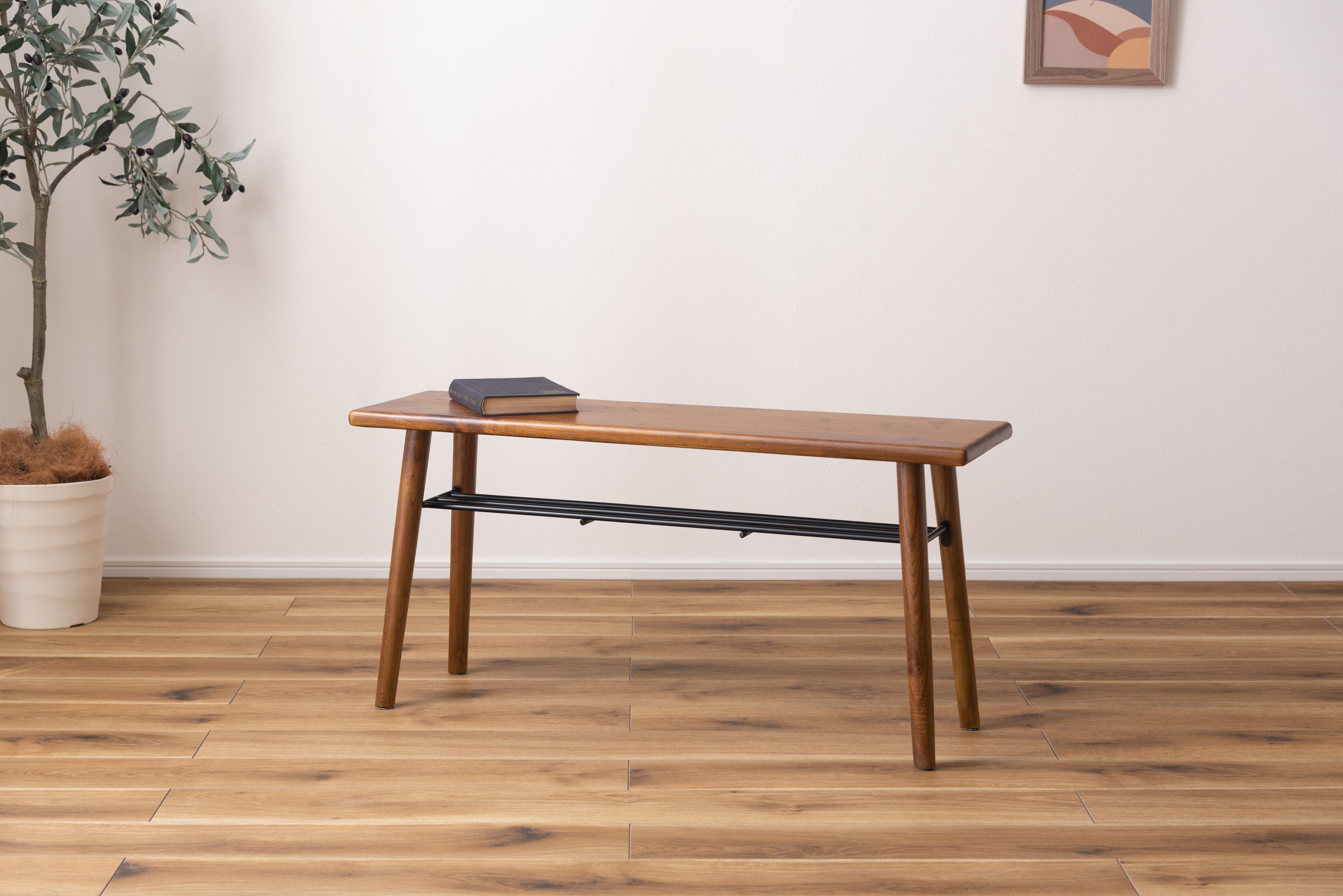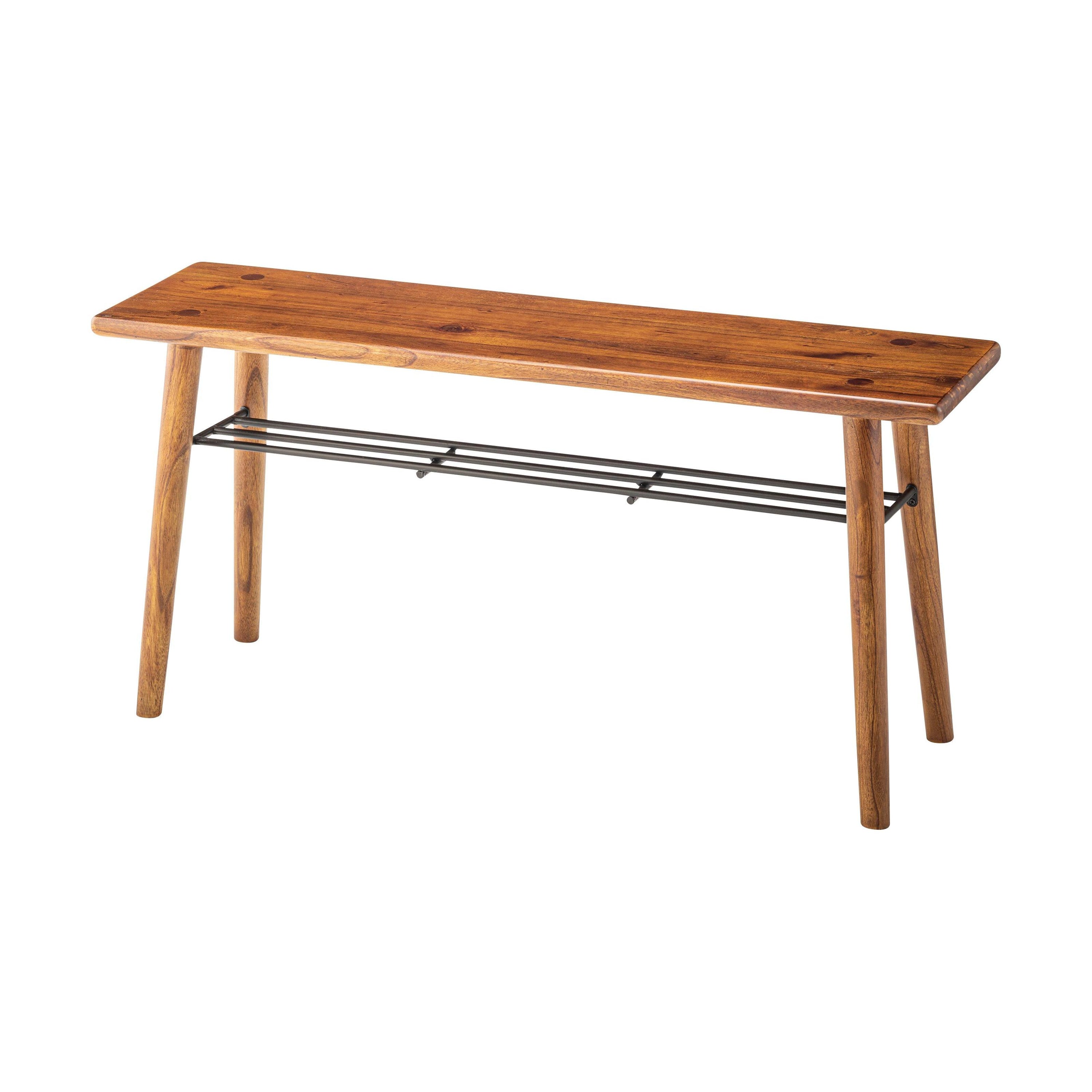 天然木とアイアンの組み合わせの趣ある木製のベンチ。玄関等の限られたスペースに/アイアンの棚板をスリッパやシューズラックに。活用方法もアイデア次第で広がります。省スペース設計/奥行25cmと一般的なベンチに比べコンパクトなサイズに設計されています。ダイニングベンチにも/すっきりとした細身の脚は様々なダイニングテーブルともよく合います。プランタースタンドに/グリーンを美しく見せる素朴な風合いが、置くものをより引き立てます。細かなディティール/天板のエッジには丸みを持たせ、優しい木目に合わせた細かなディティールにもこだわっています。