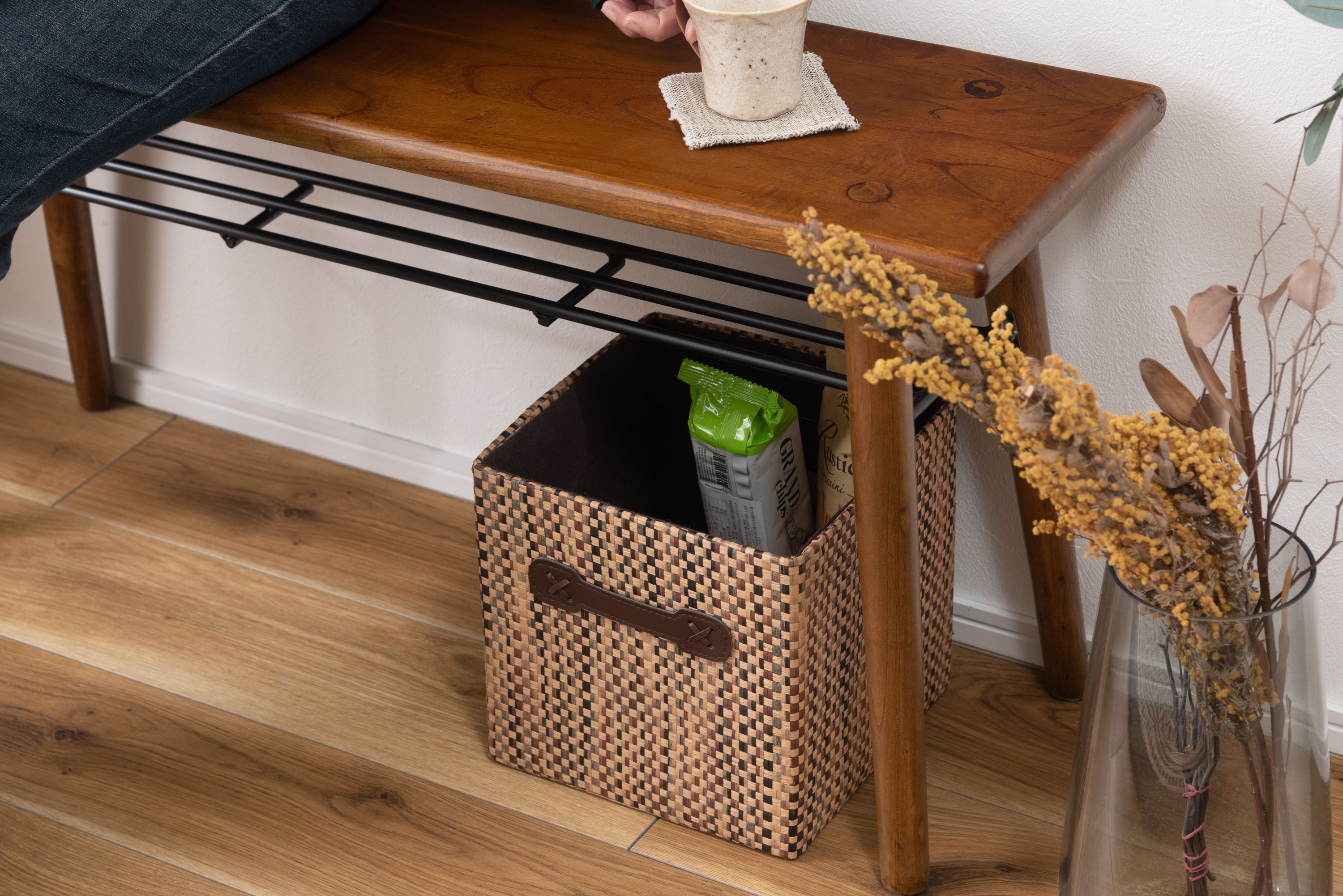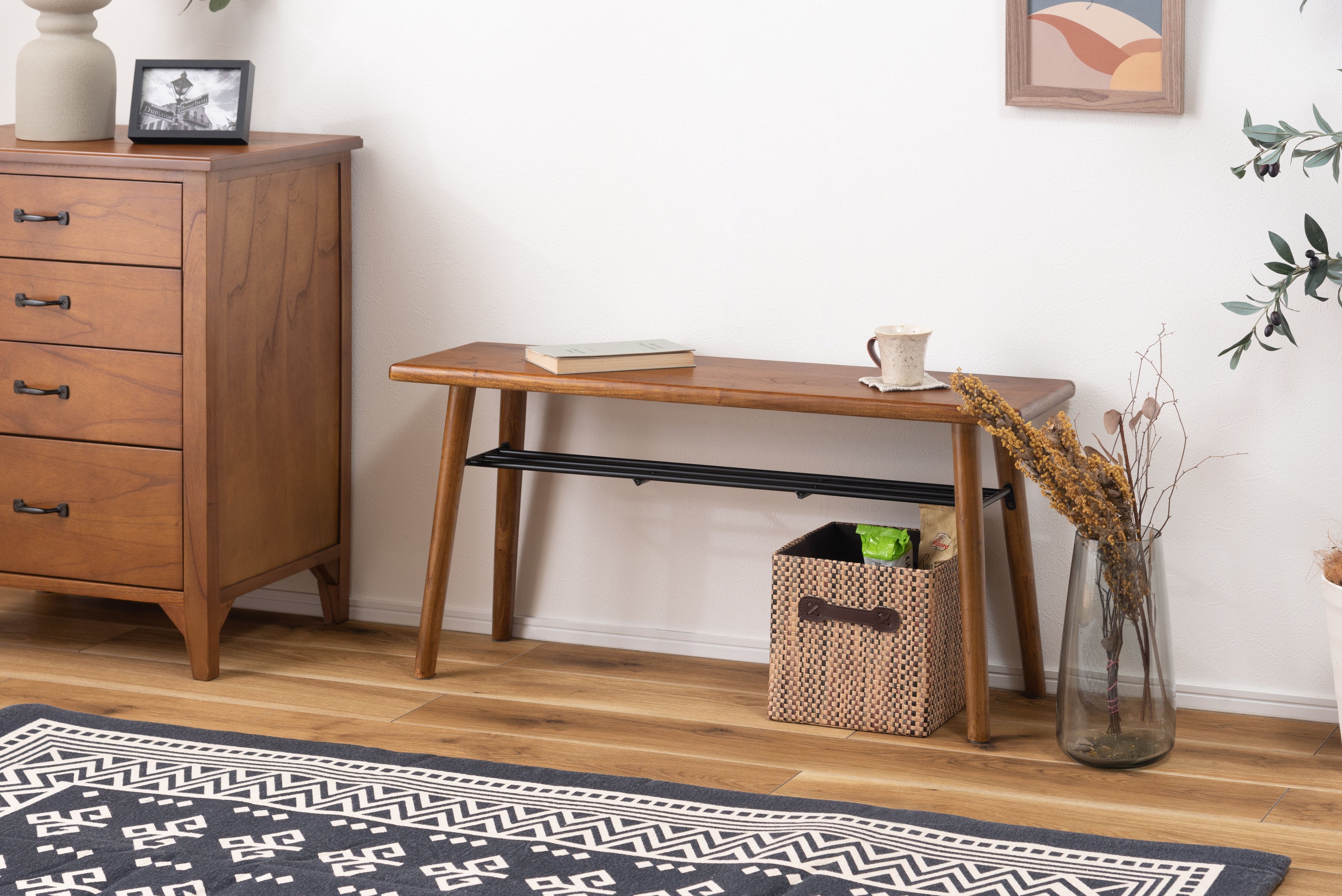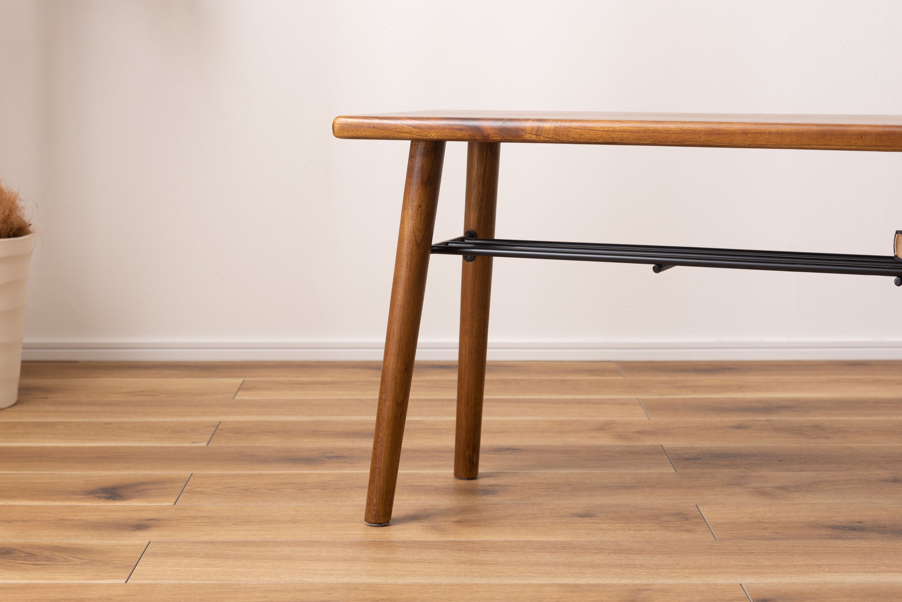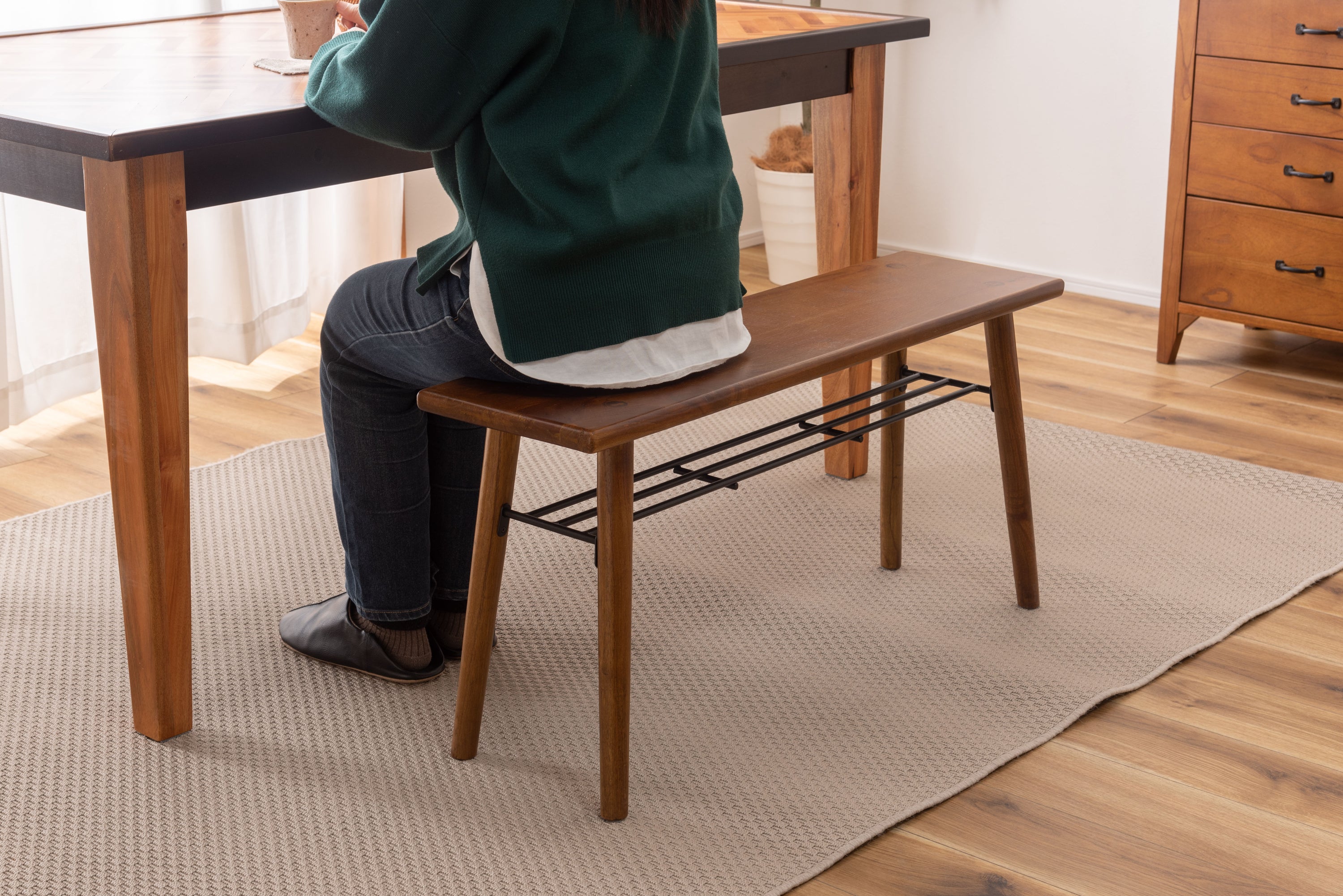天然木とアイアンの組み合わせの趣ある木製のベンチ。玄関等の限られたスペースに/アイアンの棚板をスリッパやシューズラックに。活用方法もアイデア次第で広がります。省スペース設計/奥行25cmと一般的なベンチに比べコンパクトなサイズに設計されています。ダイニングベンチにも/すっきりとした細身の脚は様々なダイニングテーブルともよく合います。プランタースタンドに/グリーンを美しく見せる素朴な風合いが、置くものをより引き立てます。細かなディティール/天板のエッジには丸みを持たせ、優しい木目に合わせた細かなディティールにもこだわっています。