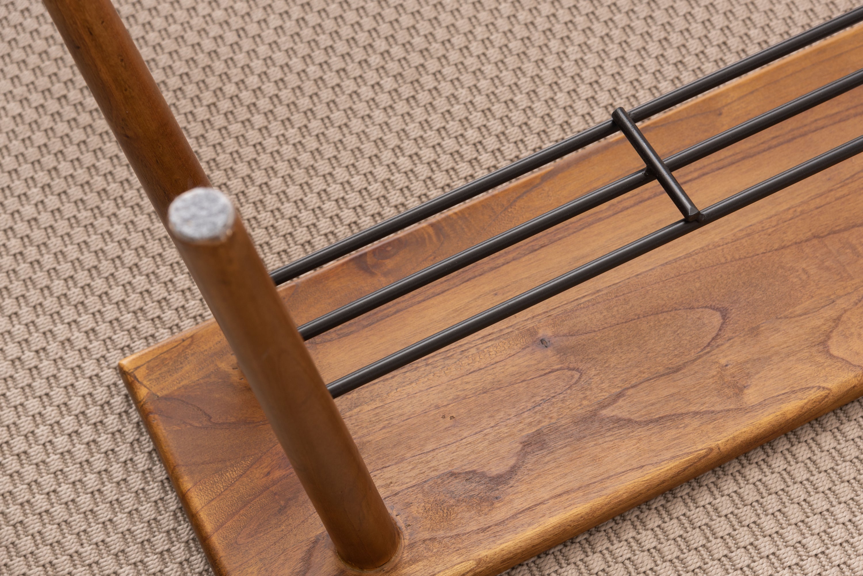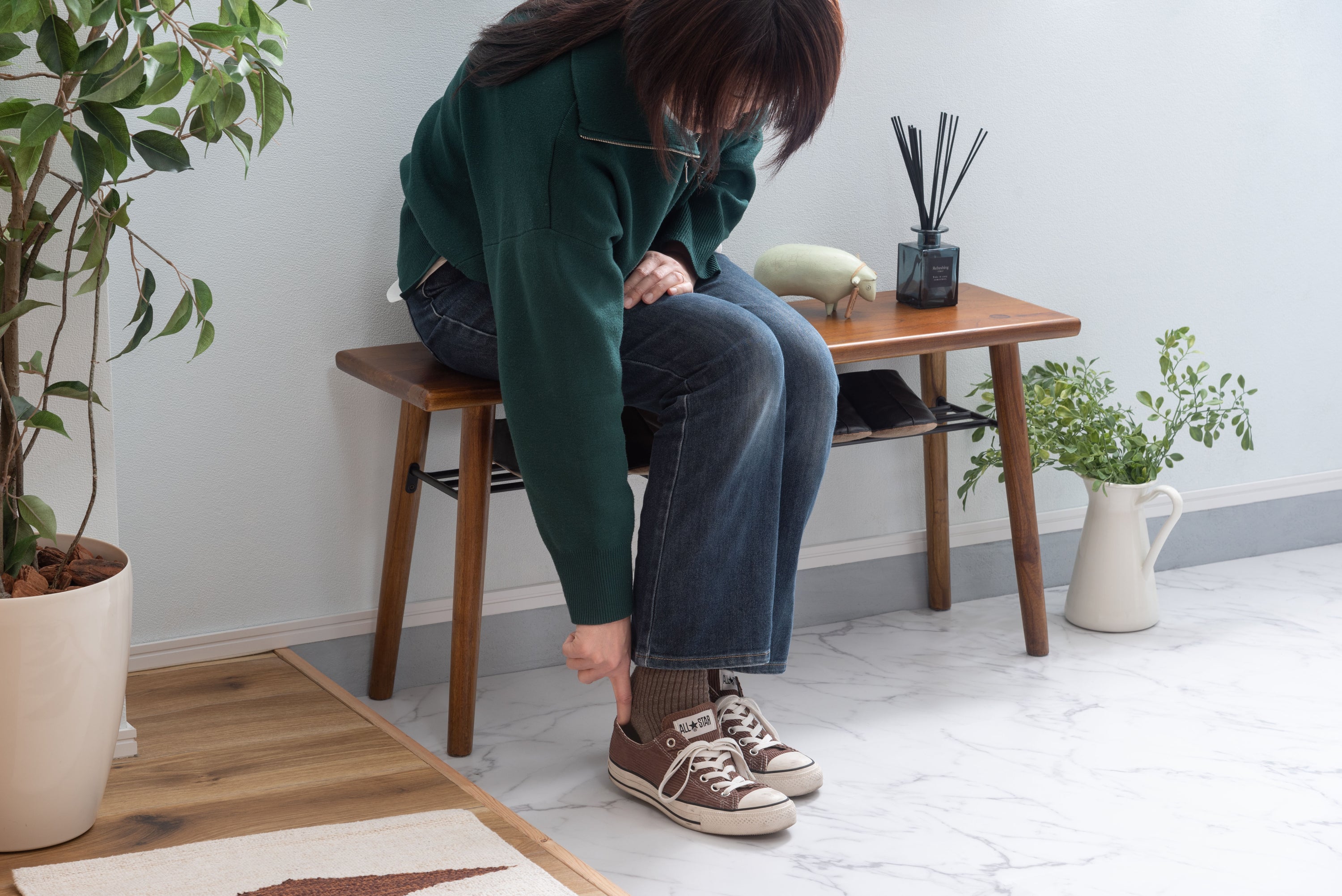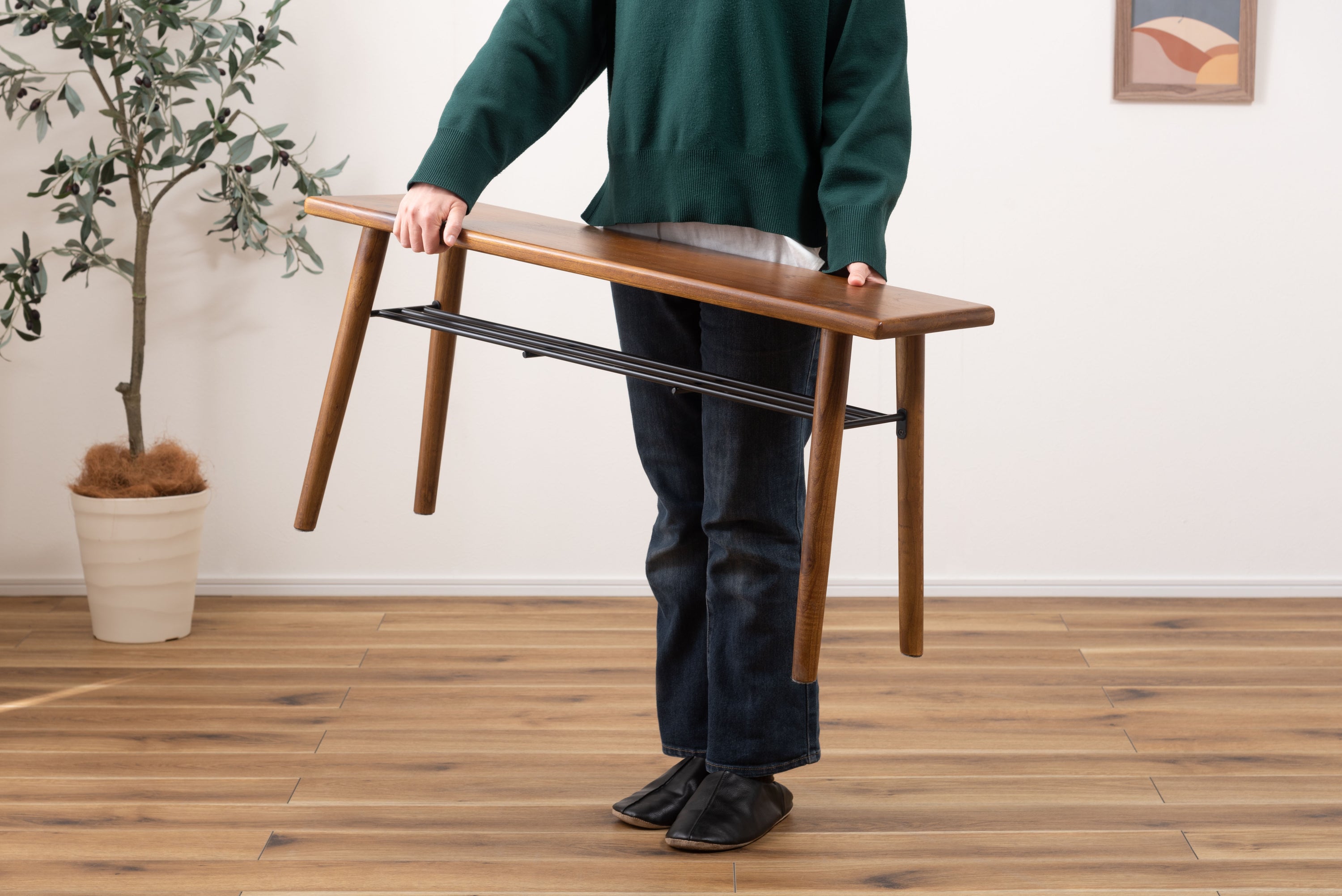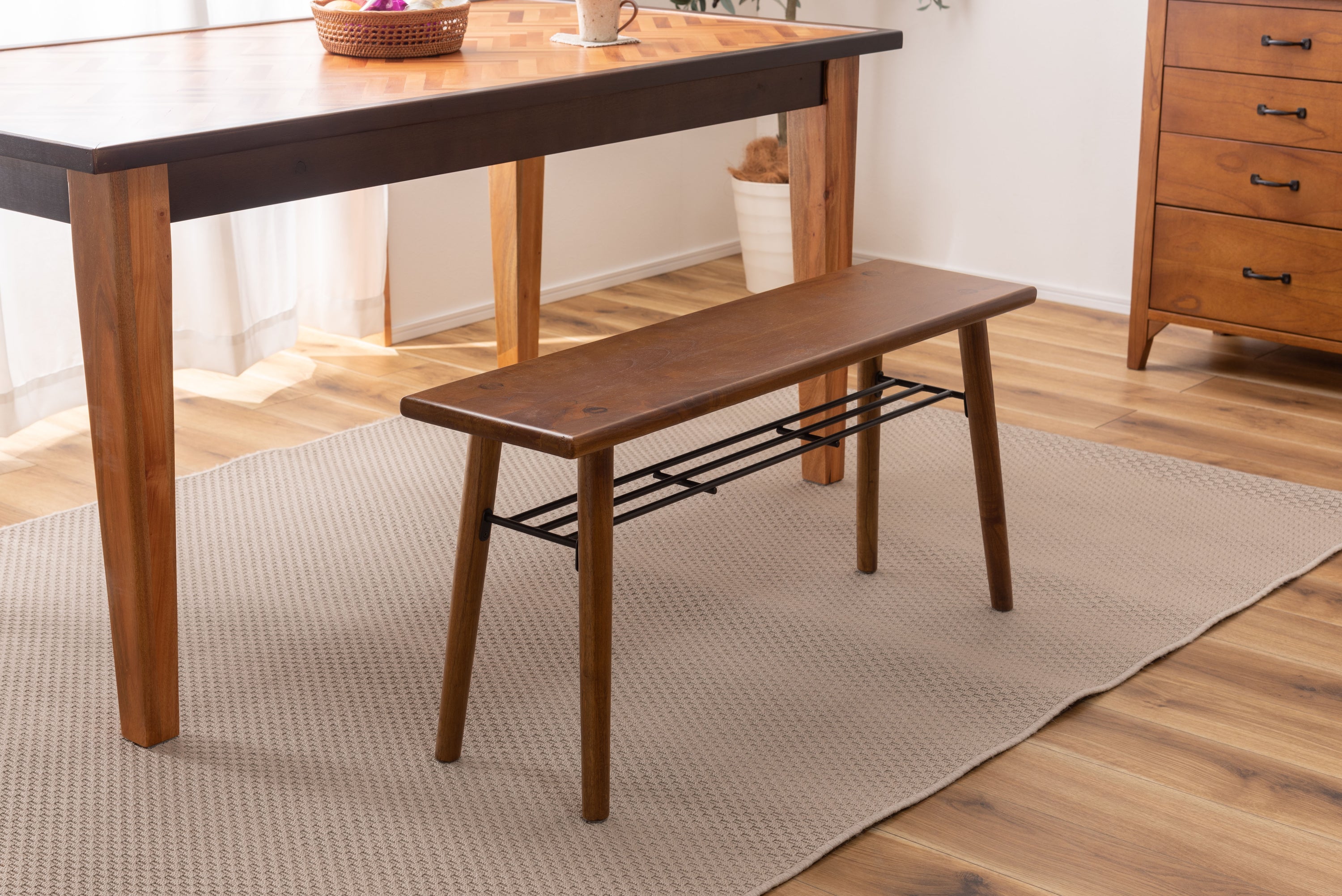 天然木とアイアンの組み合わせの趣ある木製のベンチ。玄関等の限られたスペースに/アイアンの棚板をスリッパやシューズラックに。活用方法もアイデア次第で広がります。省スペース設計/奥行25cmと一般的なベンチに比べコンパクトなサイズに設計されています。ダイニングベンチにも/すっきりとした細身の脚は様々なダイニングテーブルともよく合います。プランタースタンドに/グリーンを美しく見せる素朴な風合いが、置くものをより引き立てます。細かなディティール/天板のエッジには丸みを持たせ、優しい木目に合わせた細かなディティールにもこだわっています。