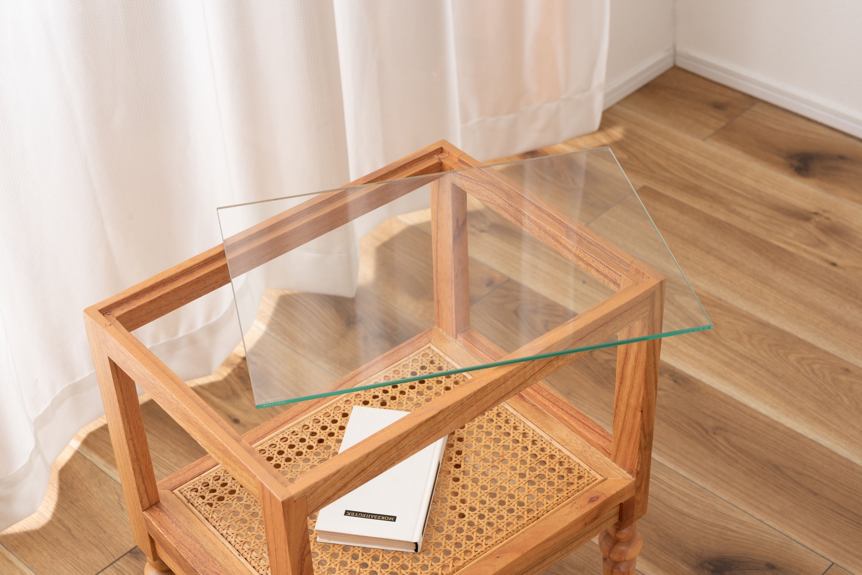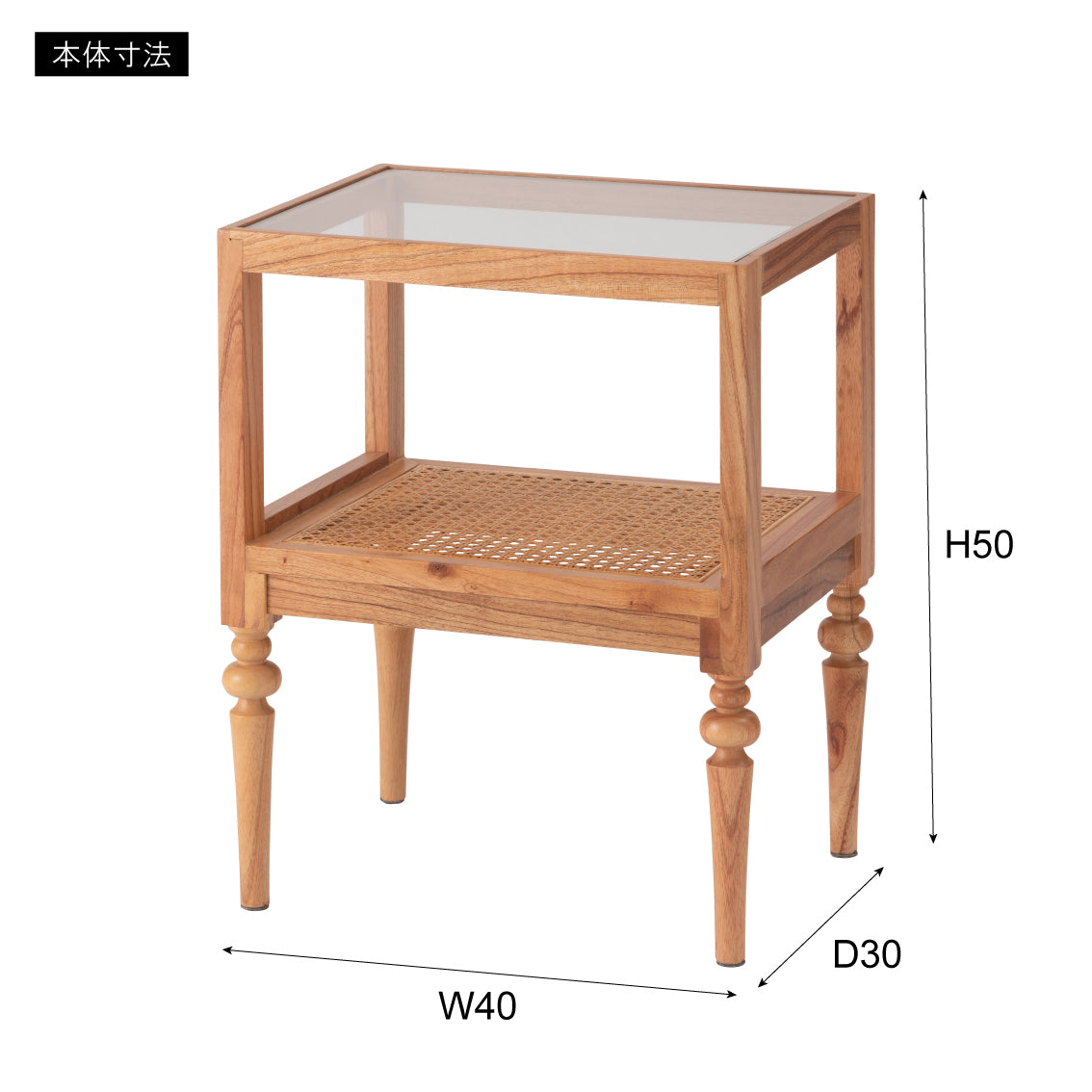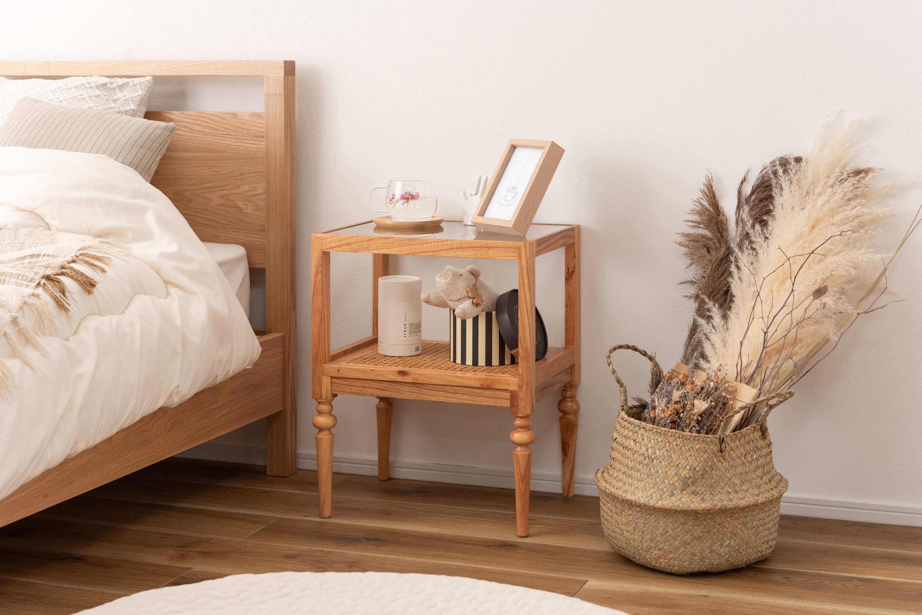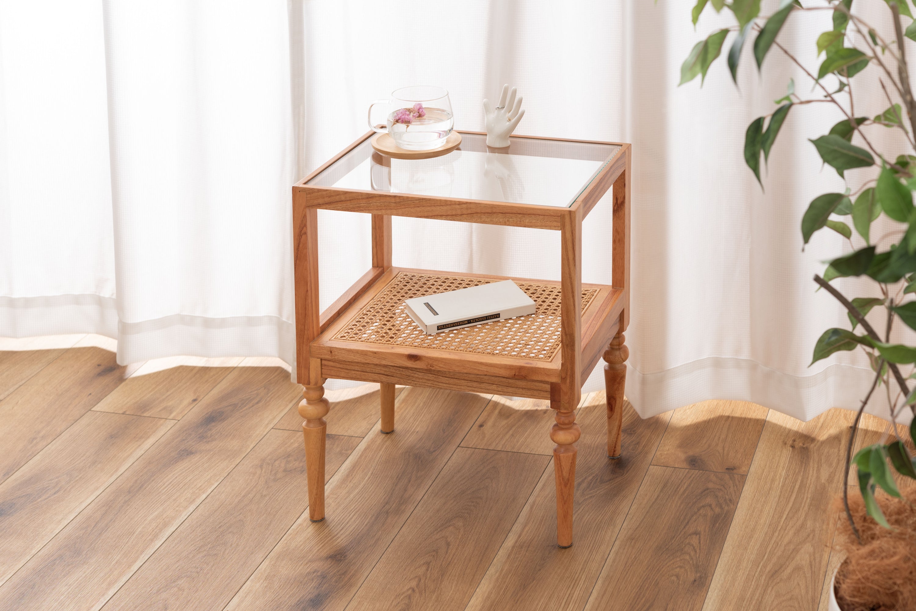ナチュラル×クラシカルな雰囲気を演出 天然木とラタンを使用したナチュラルなイメージのデザインながら、ターンドレッグ(ろくろ脚)を採用することで、クラシカルな雰囲気も感じられるオープンシェルフ&サイドテーブル。ガラス天板で抜け感もあり、使いやすいサイズ感も魅力です。