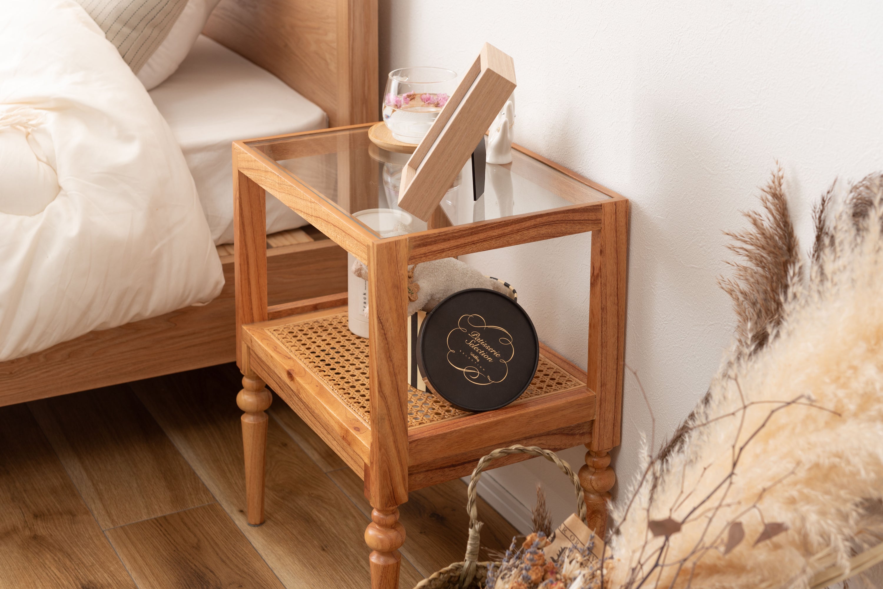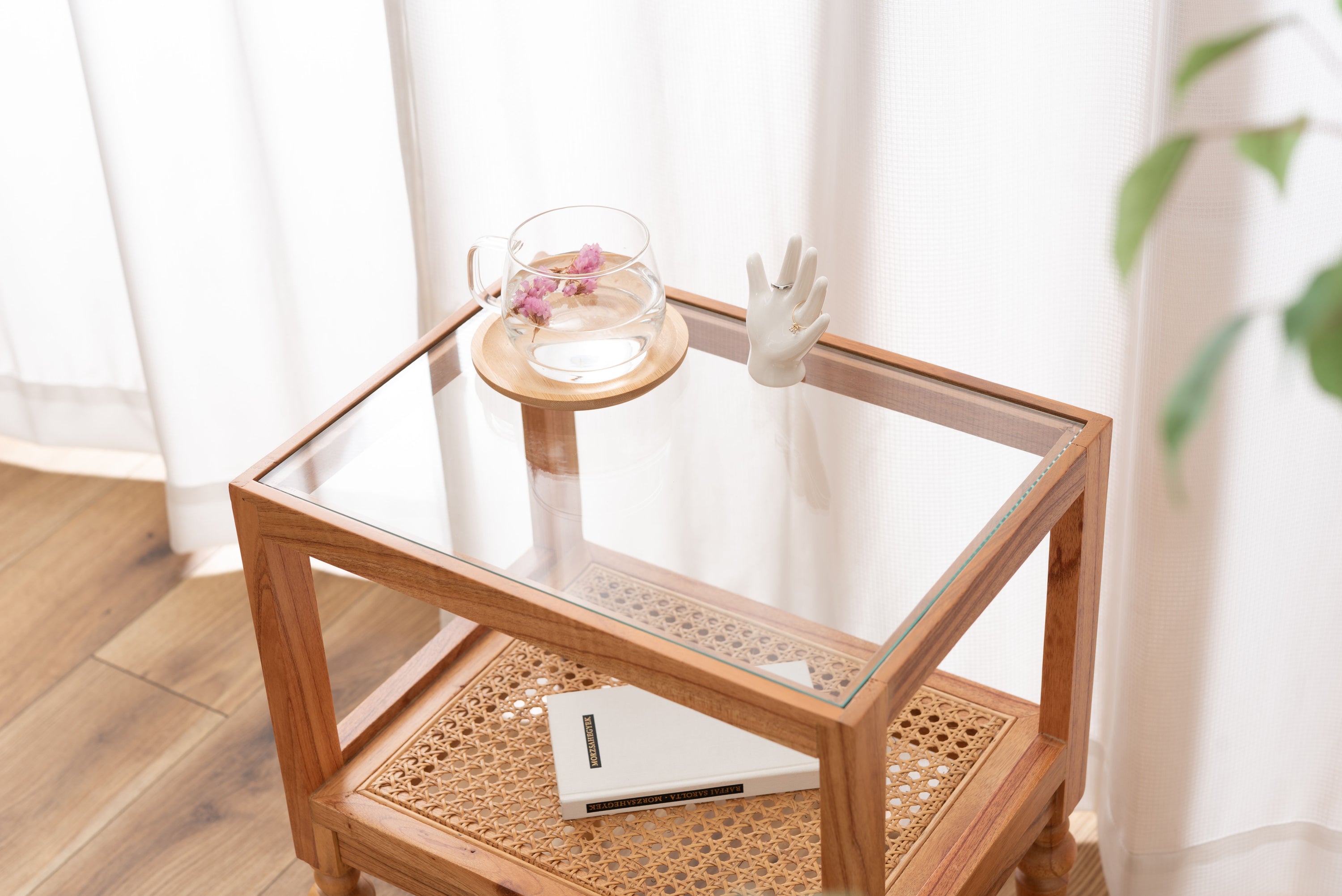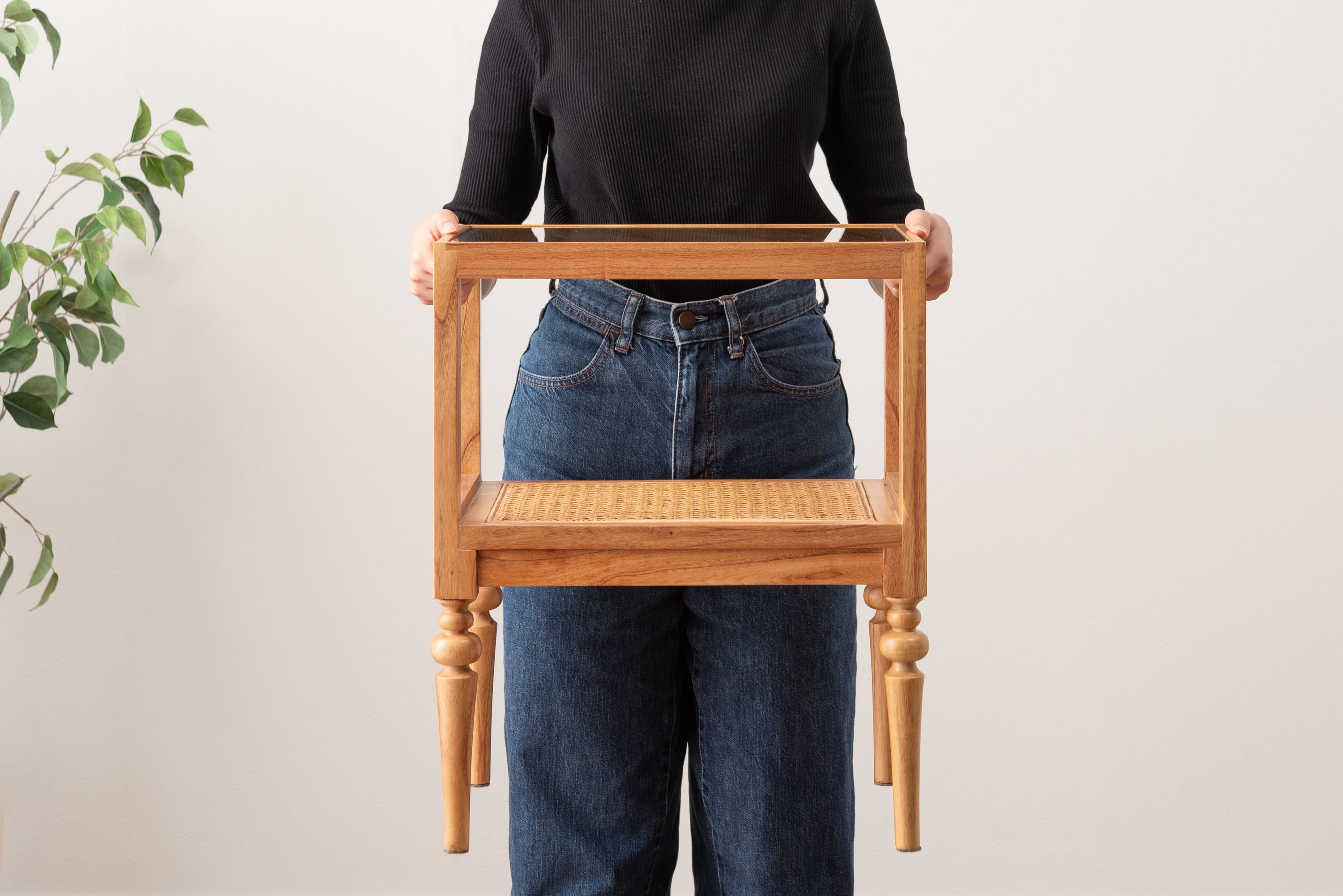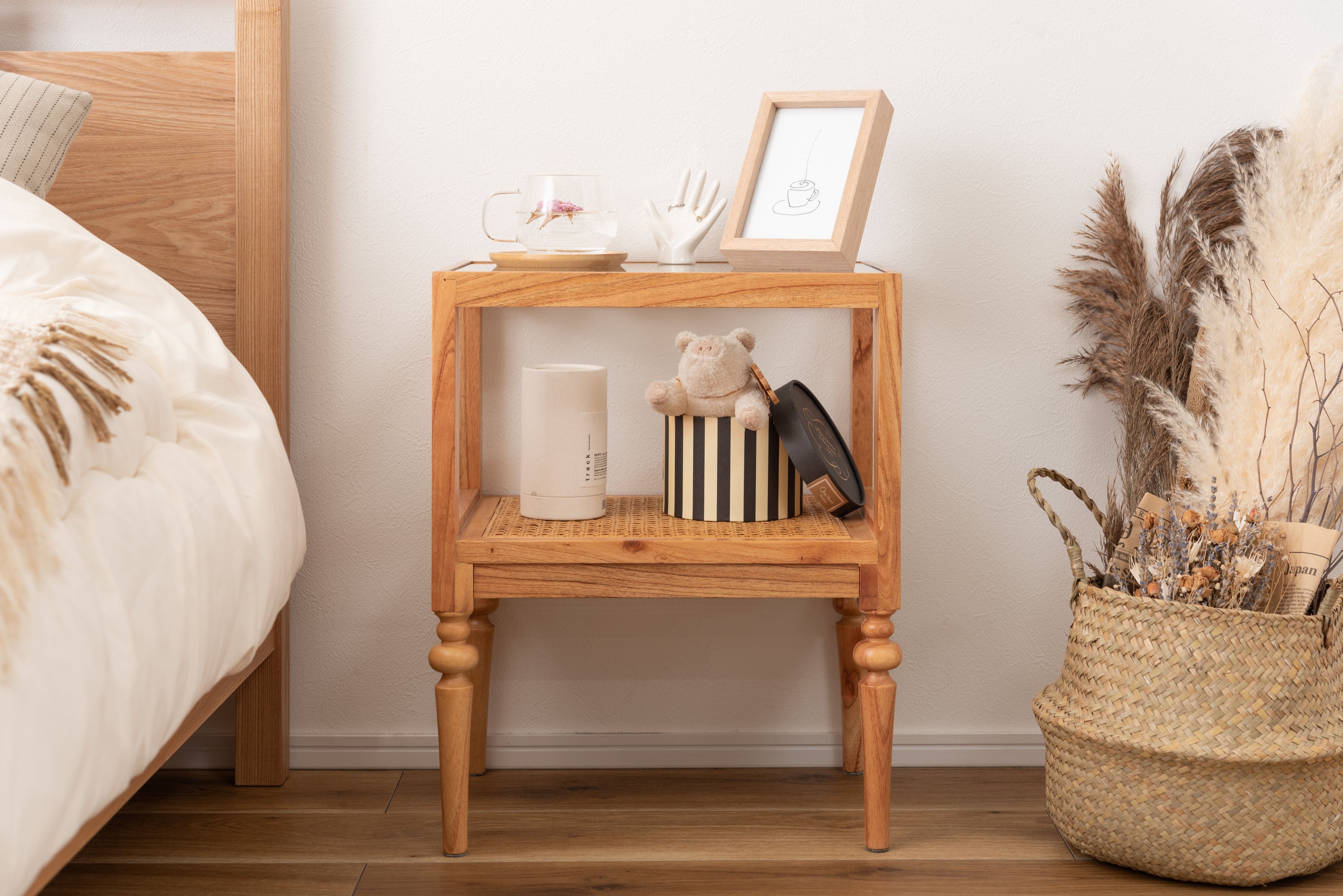 ナチュラル×クラシカルな雰囲気を演出 天然木とラタンを使用したナチュラルなイメージのデザインながら、ターンドレッグ(ろくろ脚)を採用することで、クラシカルな雰囲気も感じられるオープンシェルフ&サイドテーブル。ガラス天板で抜け感もあり、使いやすいサイズ感も魅力です。