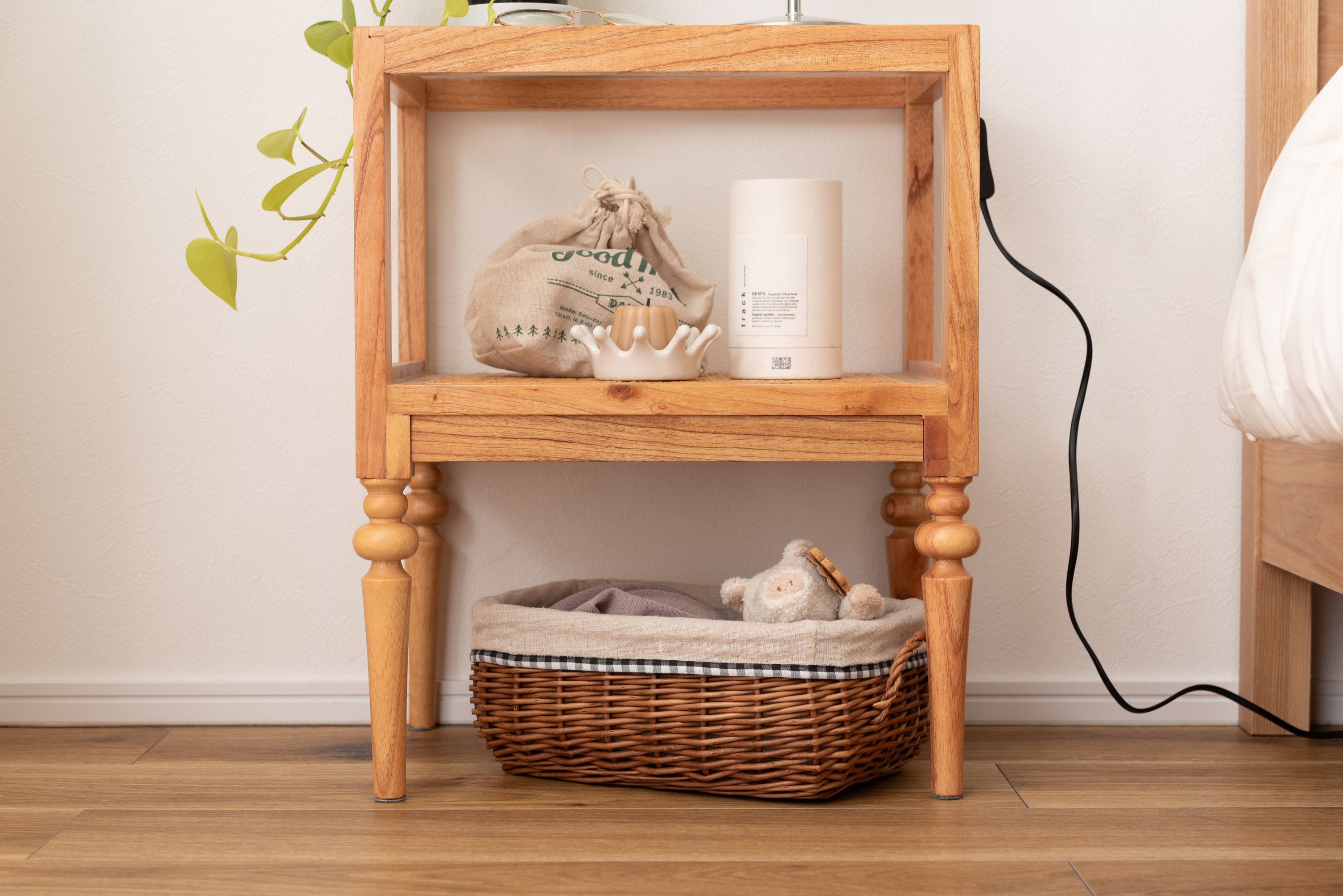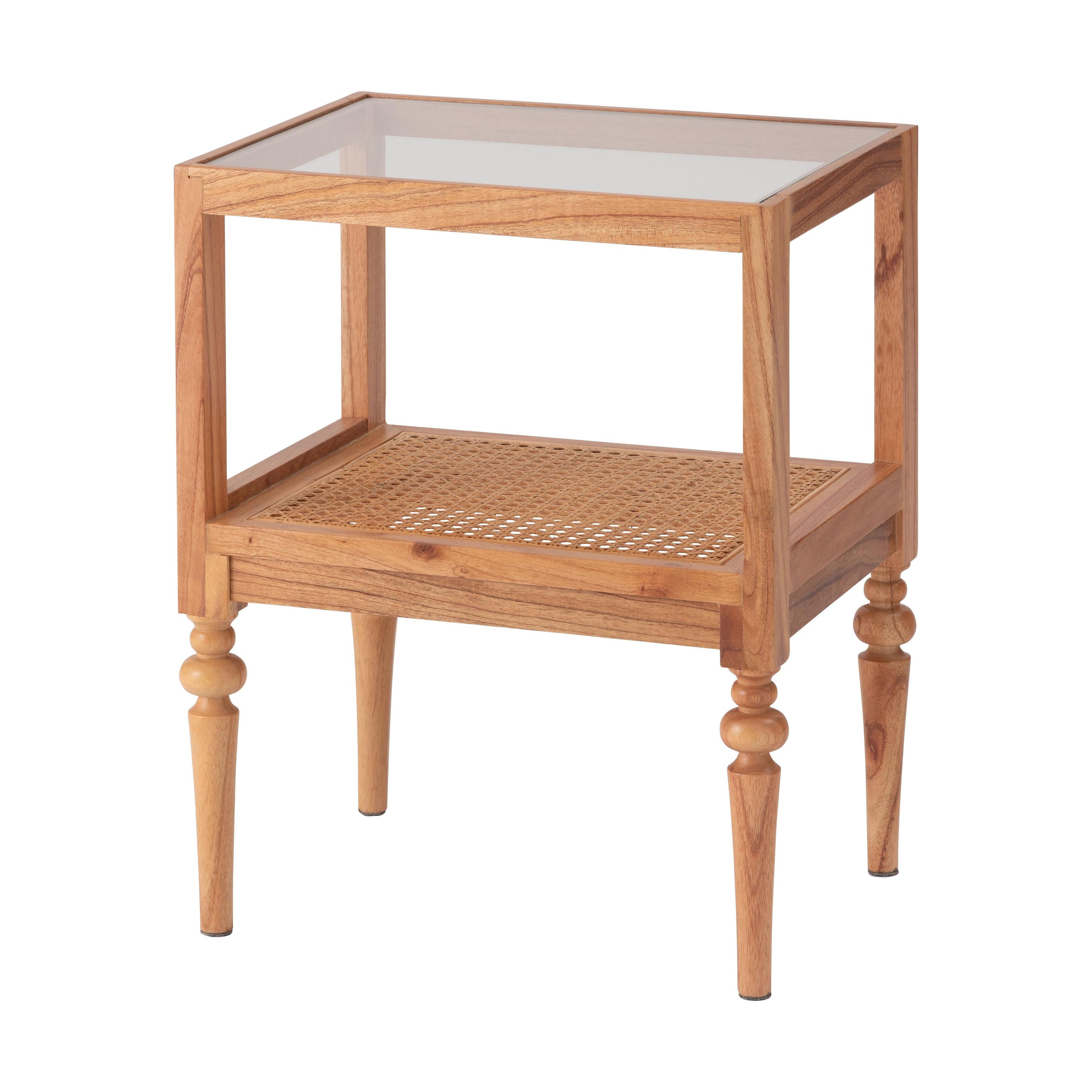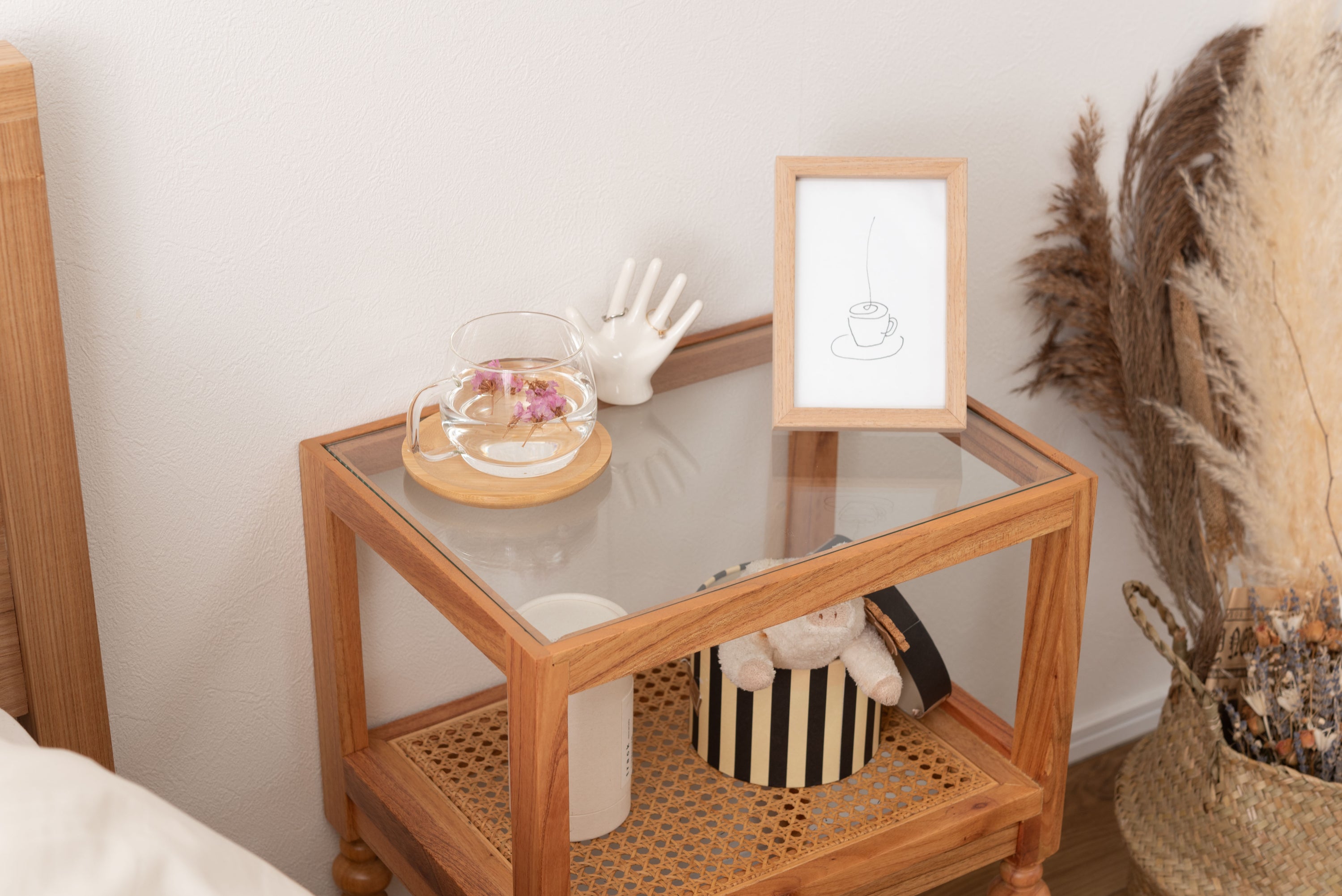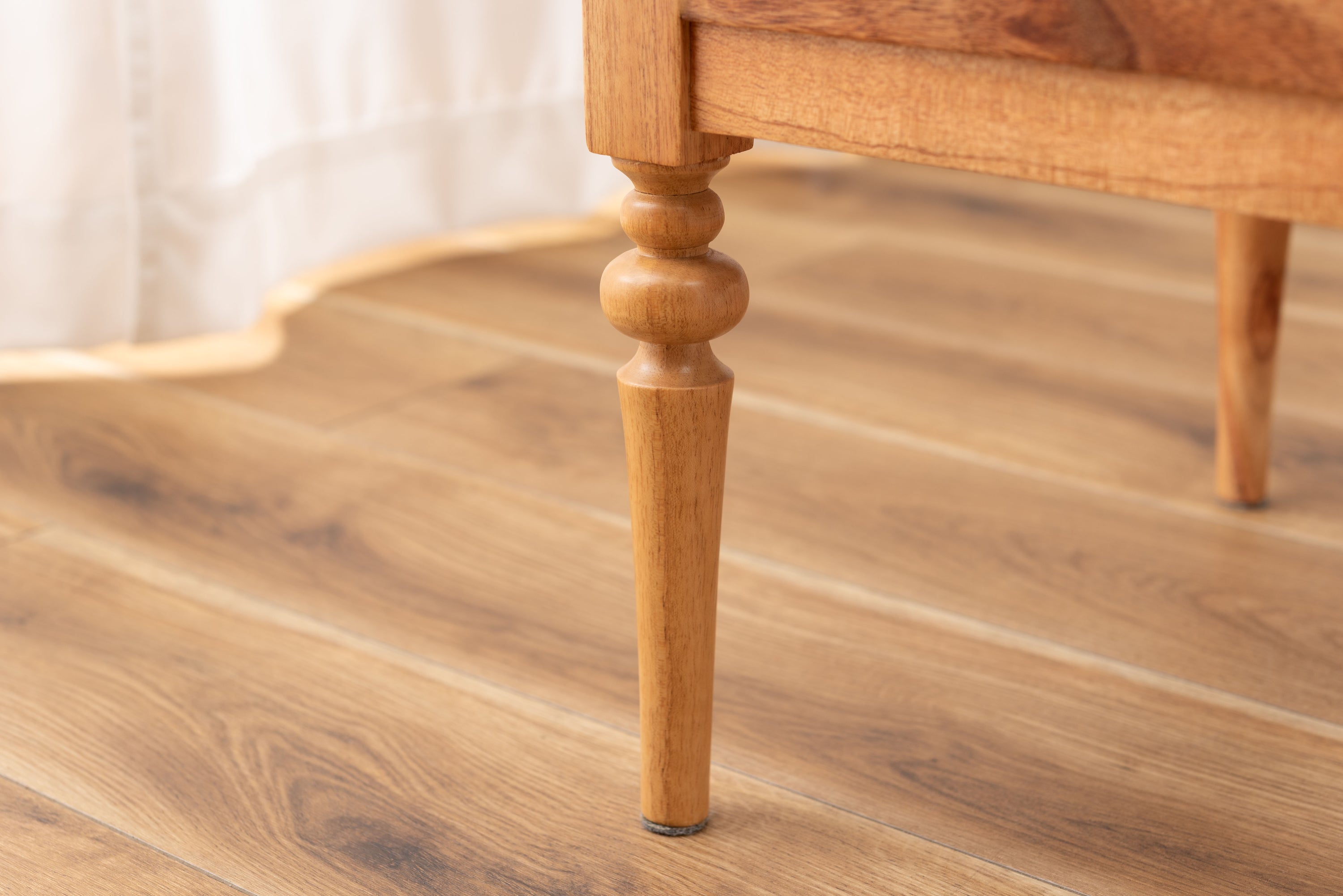 ナチュラル×クラシカルな雰囲気を演出 天然木とラタンを使用したナチュラルなイメージのデザインながら、ターンドレッグ(ろくろ脚)を採用することで、クラシカルな雰囲気も感じられるオープンシェルフ&サイドテーブル。ガラス天板で抜け感もあり、使いやすいサイズ感も魅力です。
