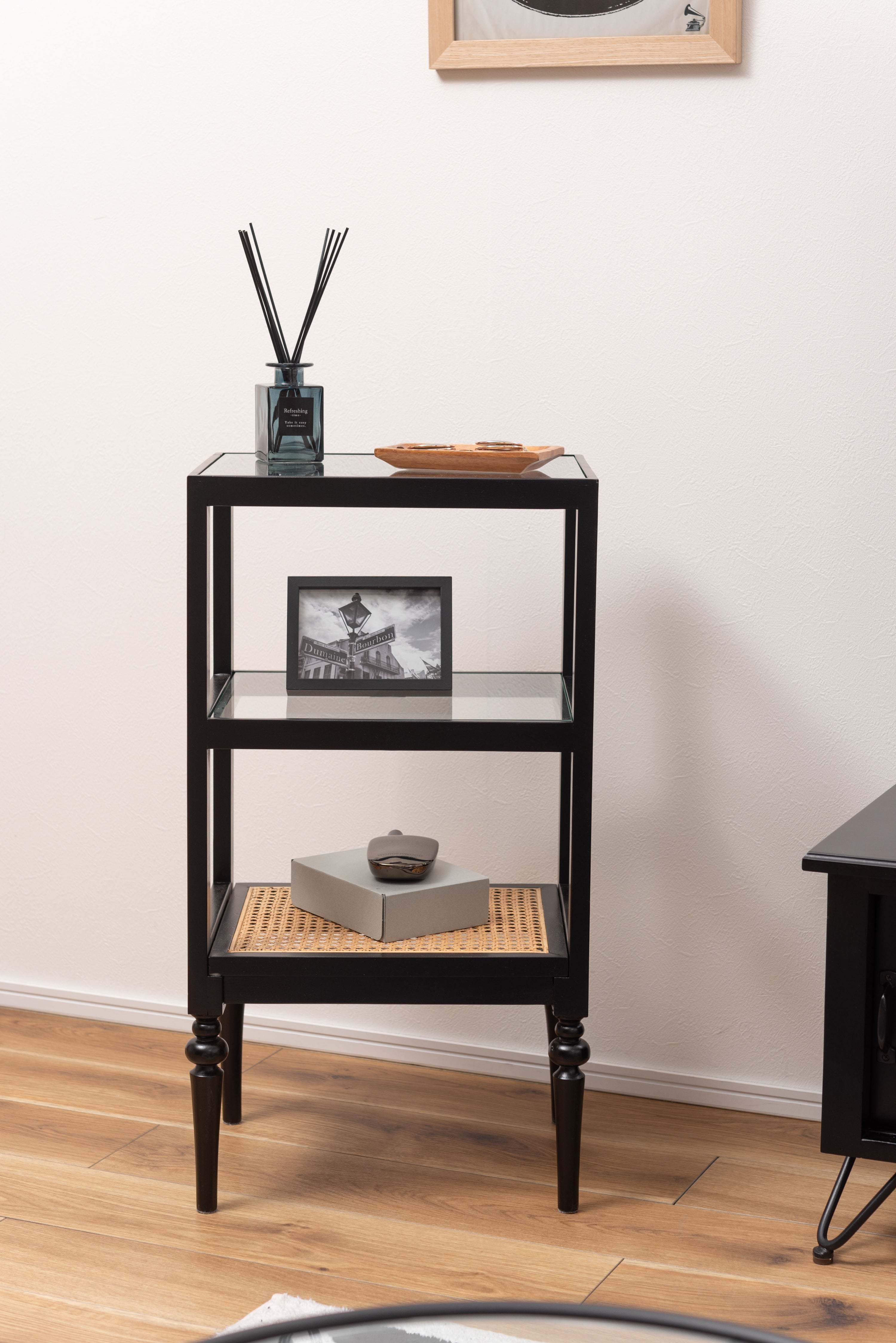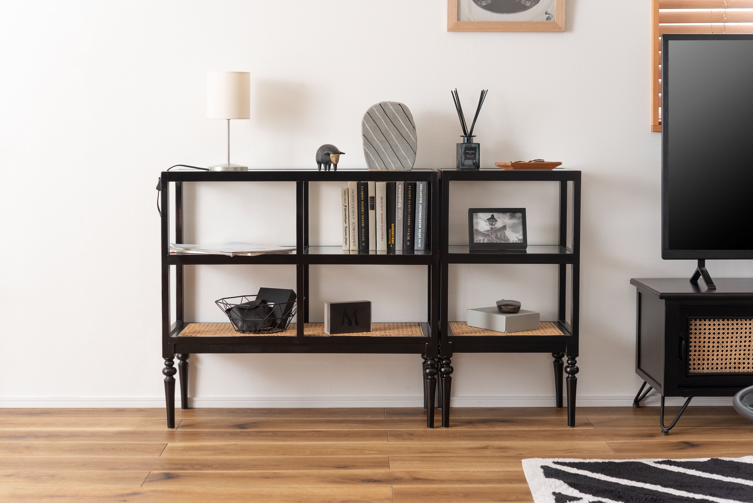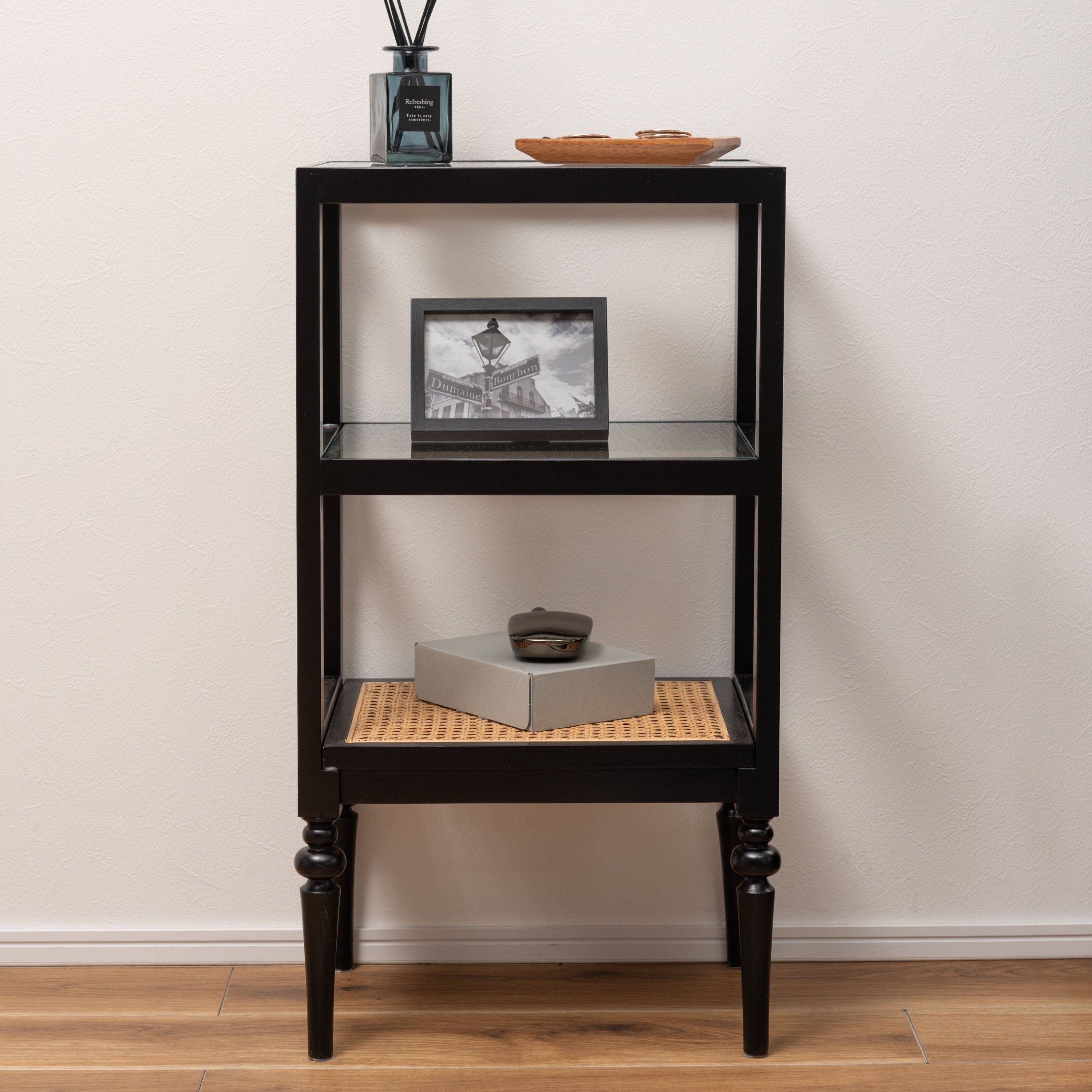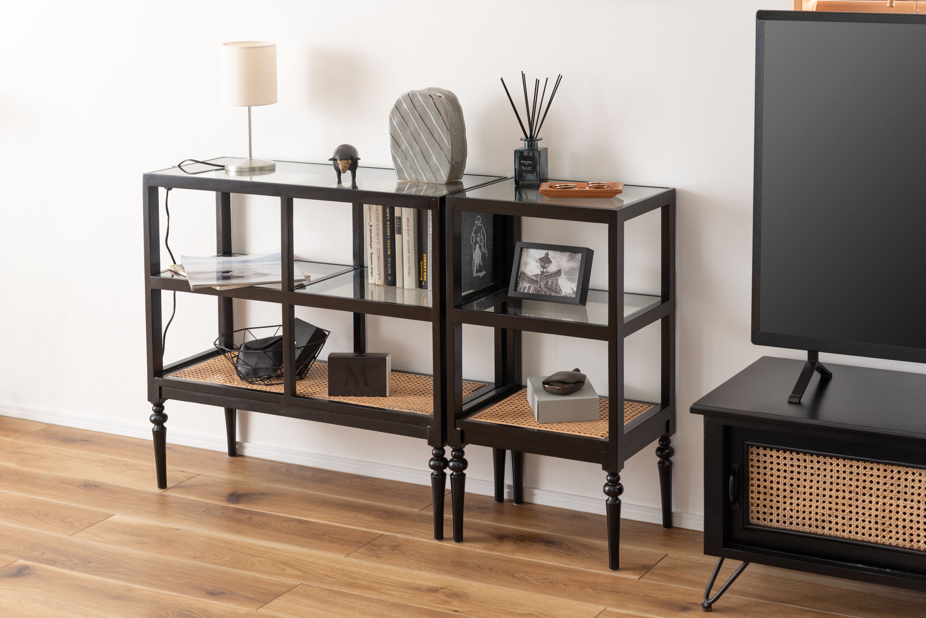 ナチュラル×クラシカルな雰囲気を演出 天然木とラタンを使用したナチュラルなイメージのデザインながら、ターンドレッグ(ろくろ脚)を採用することで、クラシカルな雰囲気も感じられるオープンシェルフ&サイドテーブル。ガラス天板で抜け感もあり、使いやすいサイズ感も魅力です。