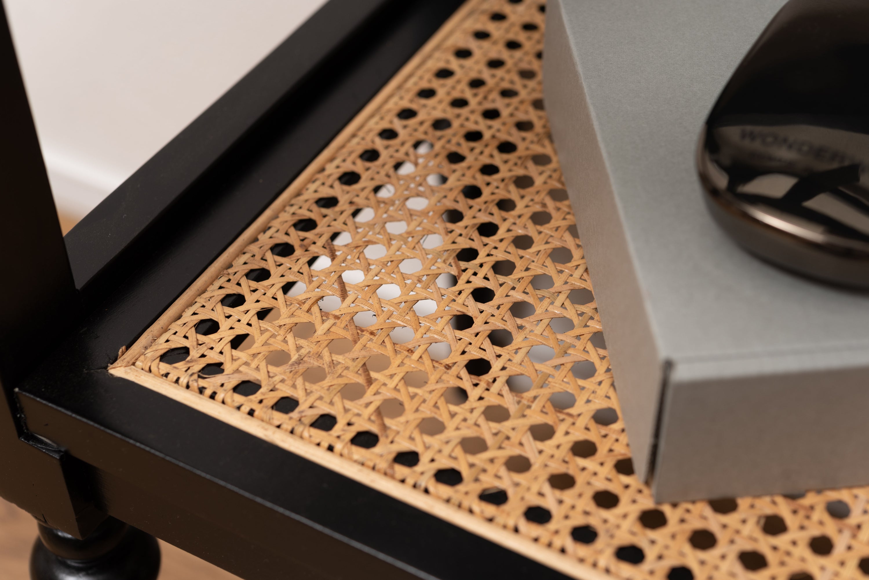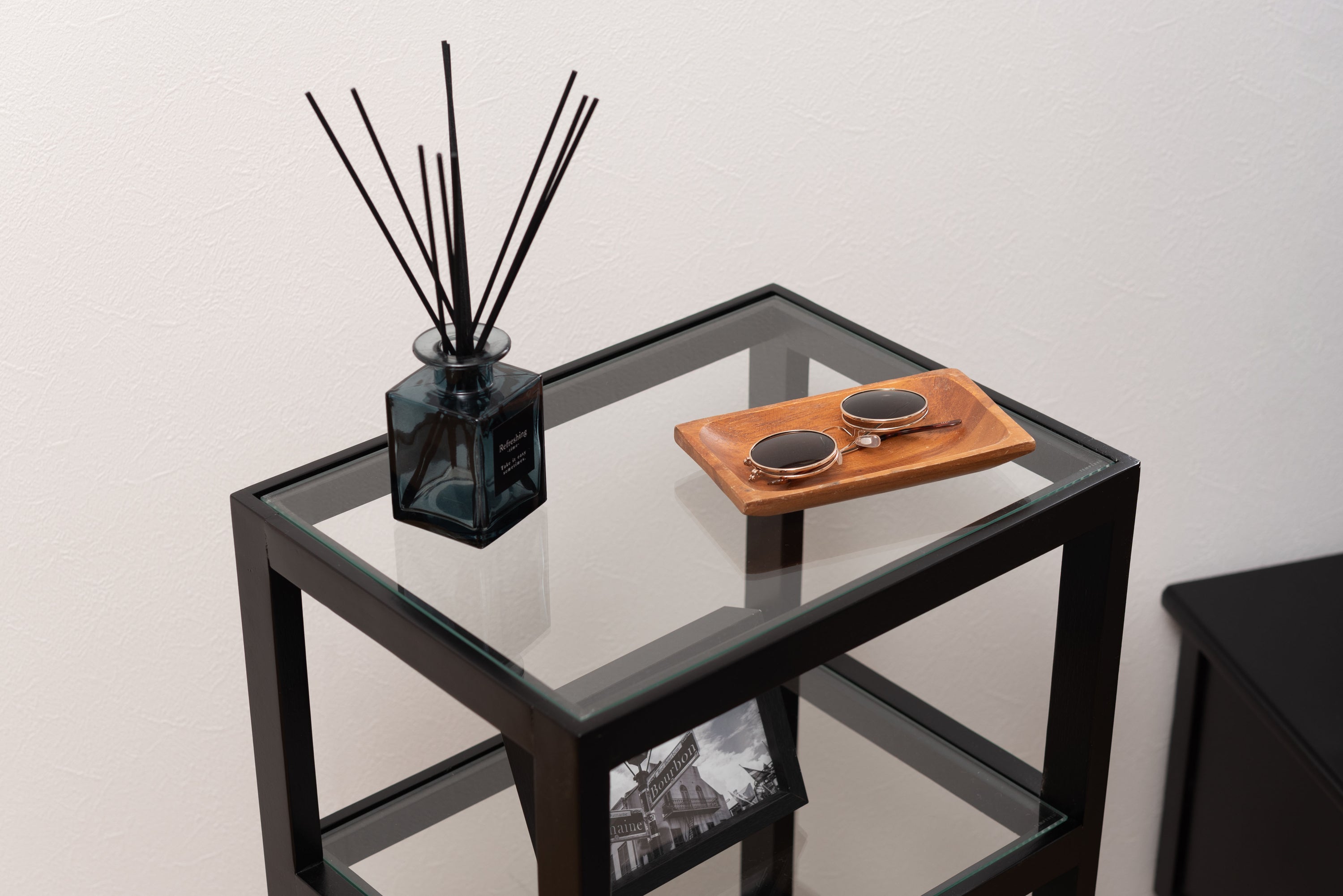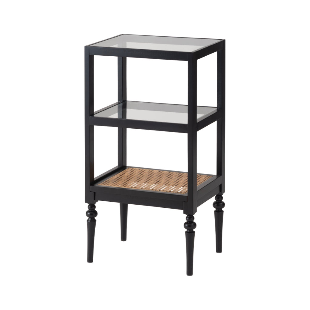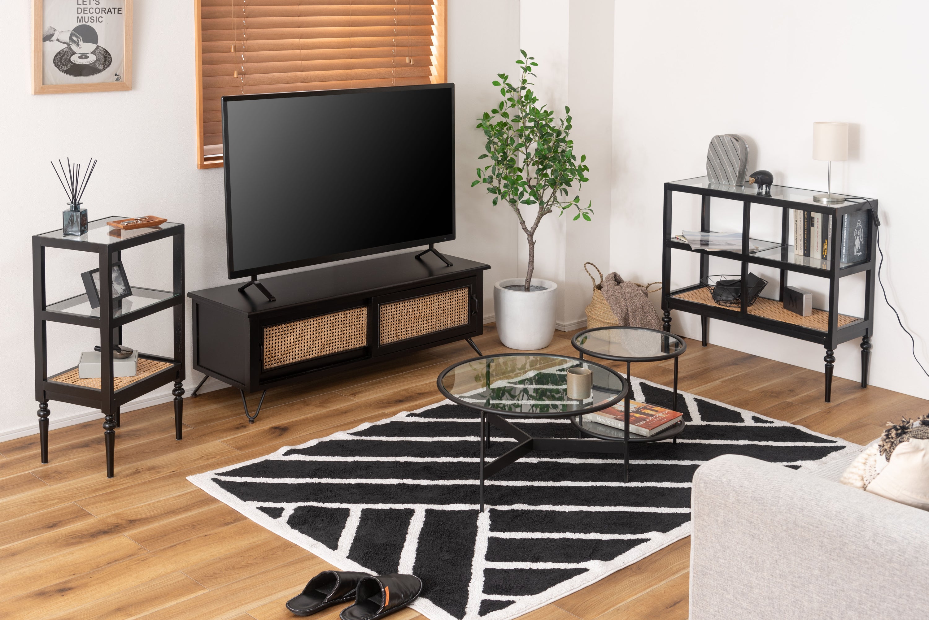 ナチュラル×クラシカルな雰囲気を演出 天然木とラタンを使用したナチュラルなイメージのデザインながら、ターンドレッグ(ろくろ脚)を採用することで、クラシカルな雰囲気も感じられるオープンシェルフ&サイドテーブル。ガラス天板で抜け感もあり、使いやすいサイズ感も魅力です。