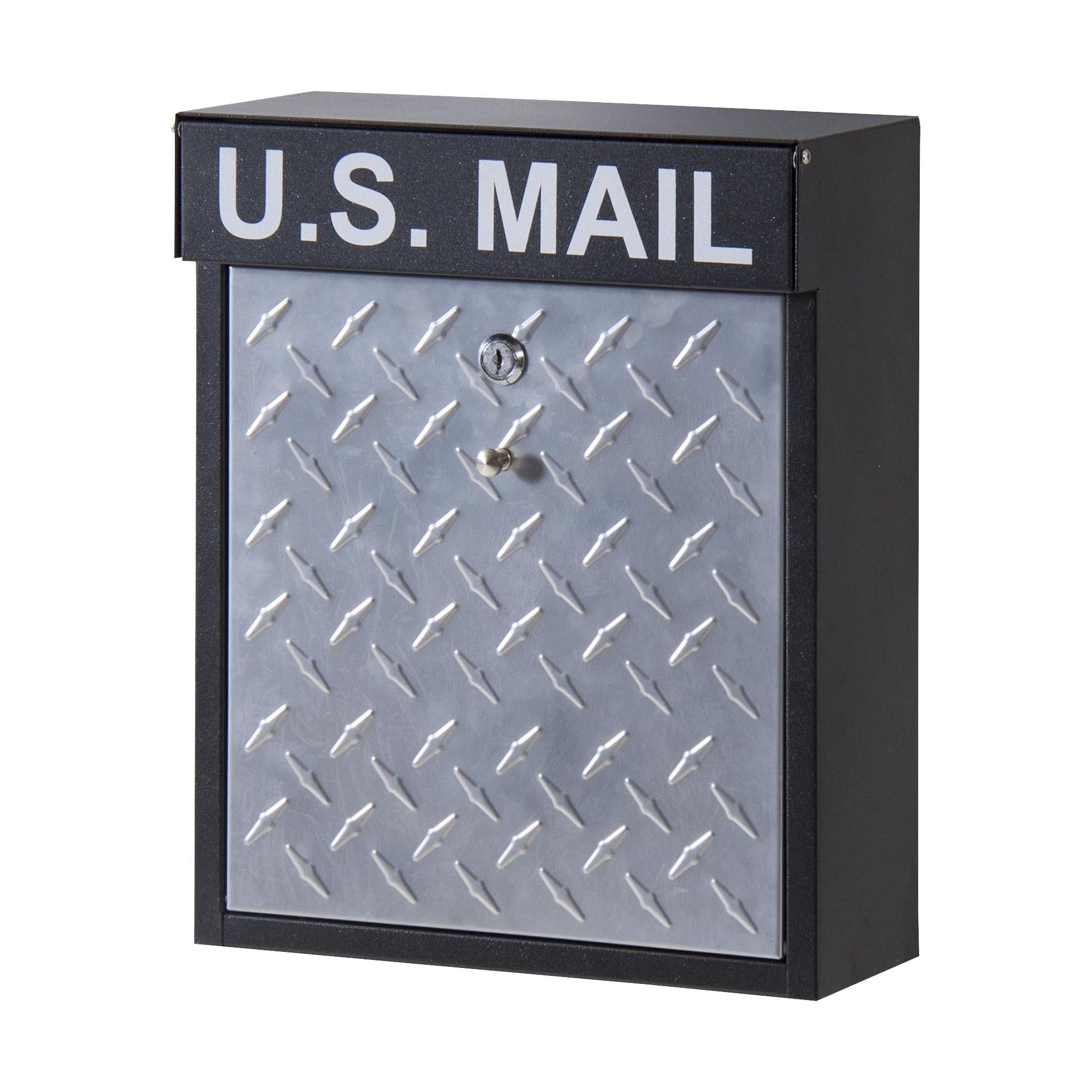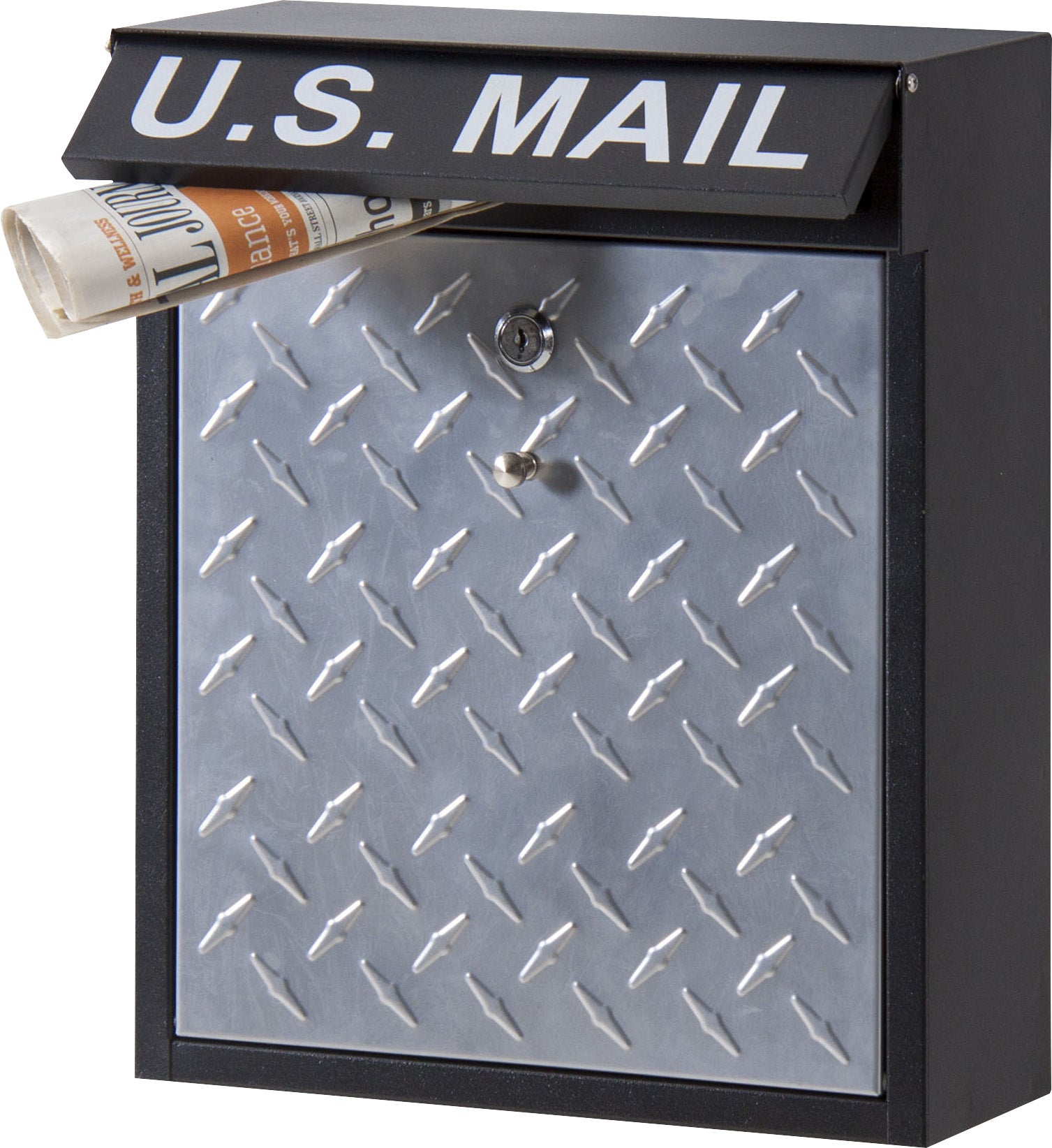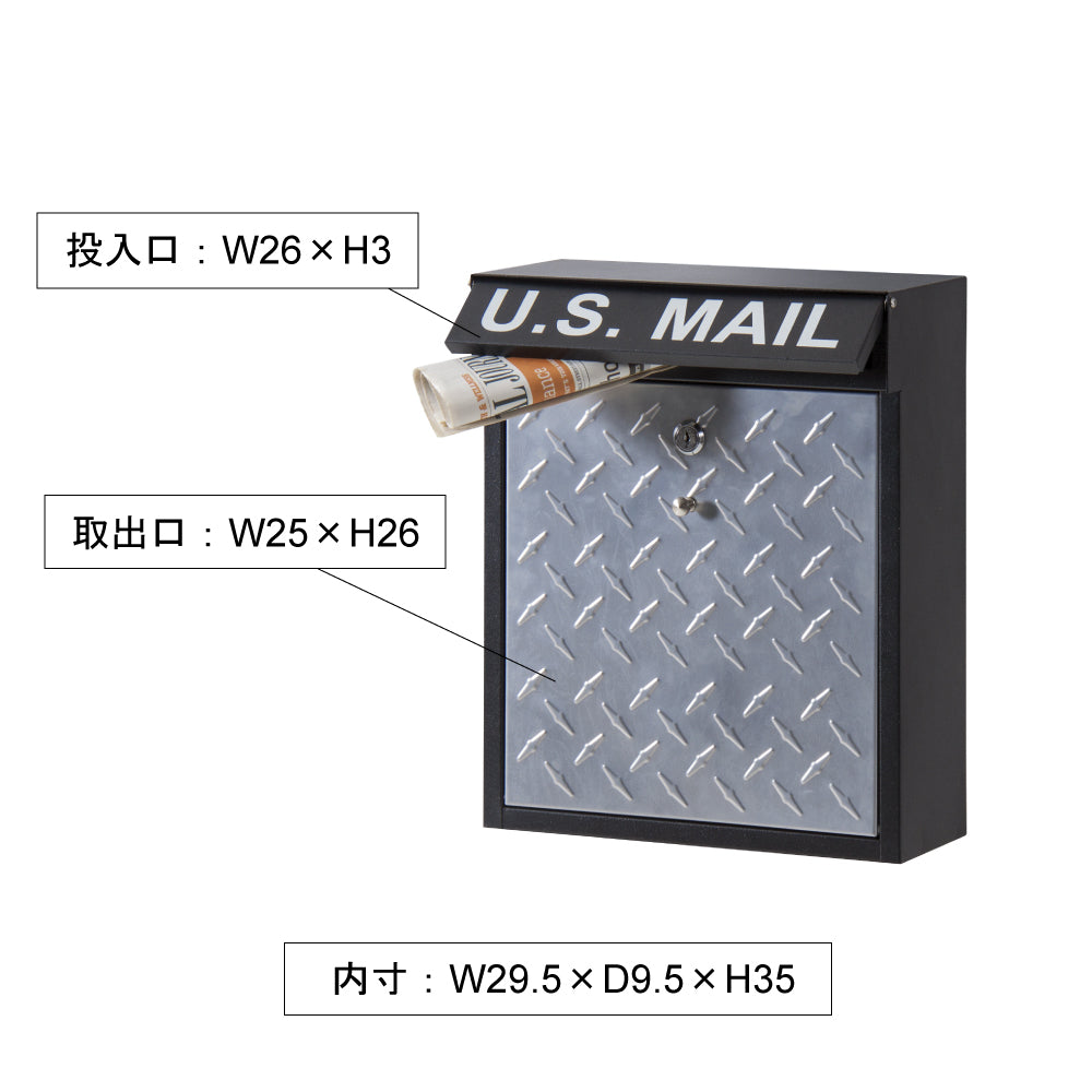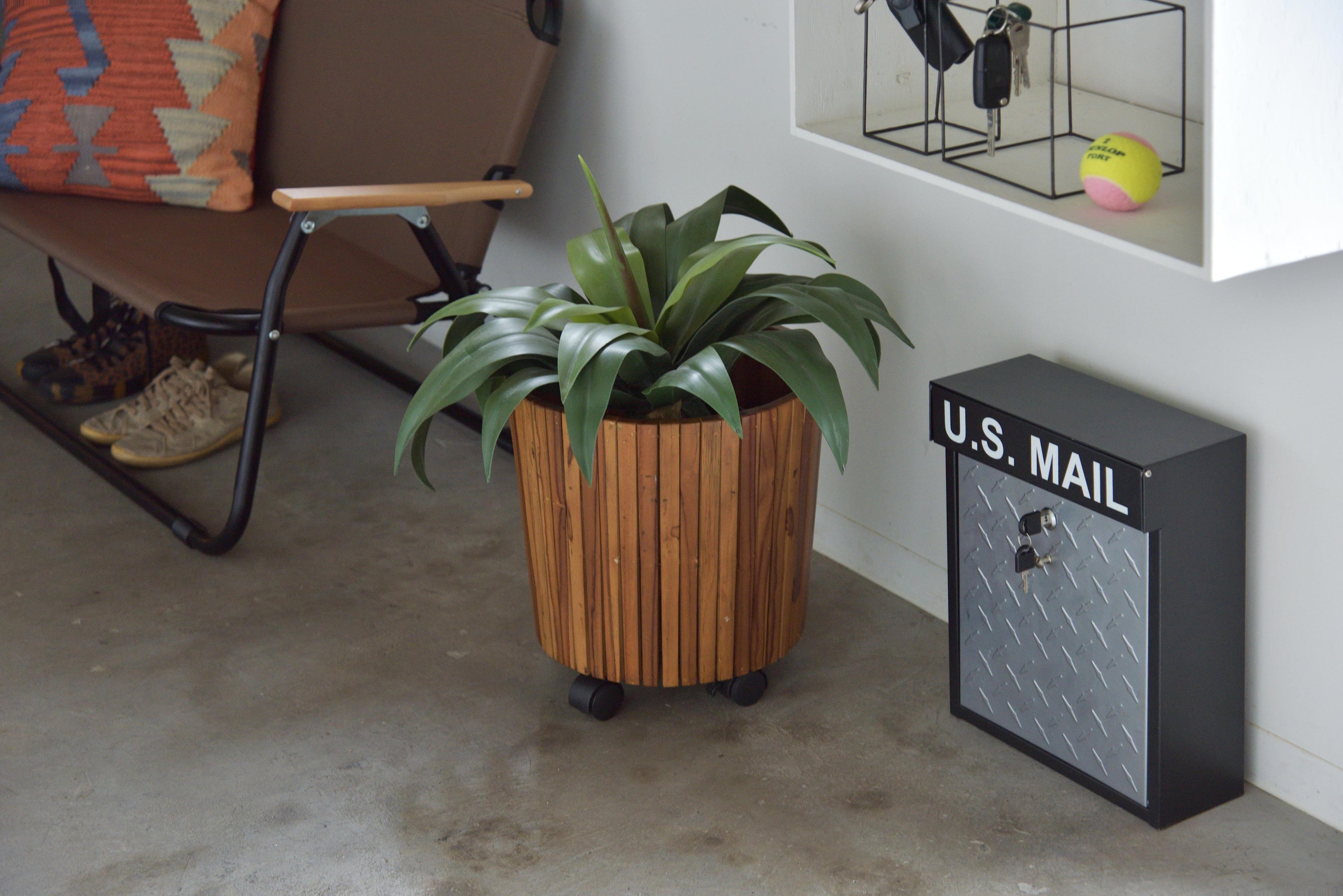 蓋部分をチェッカープレートデザインにした、インダストリアルテイストのポスト。 投函口は幅26cm×高さ3cmと十分な広さを持っています。 付属のカギを使ってポストの中身を取り出すタイプなので、投函された物が勝手に取り出されるという心配もありません。 蓋は上部のロックを解除して手前に開く縦型式なので、開けたと同時に中の物が落ちてしまうという事もなく安心。