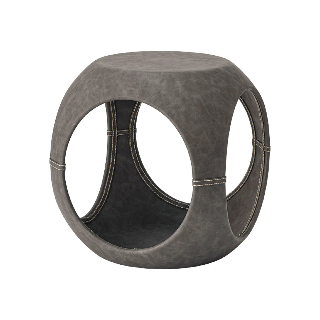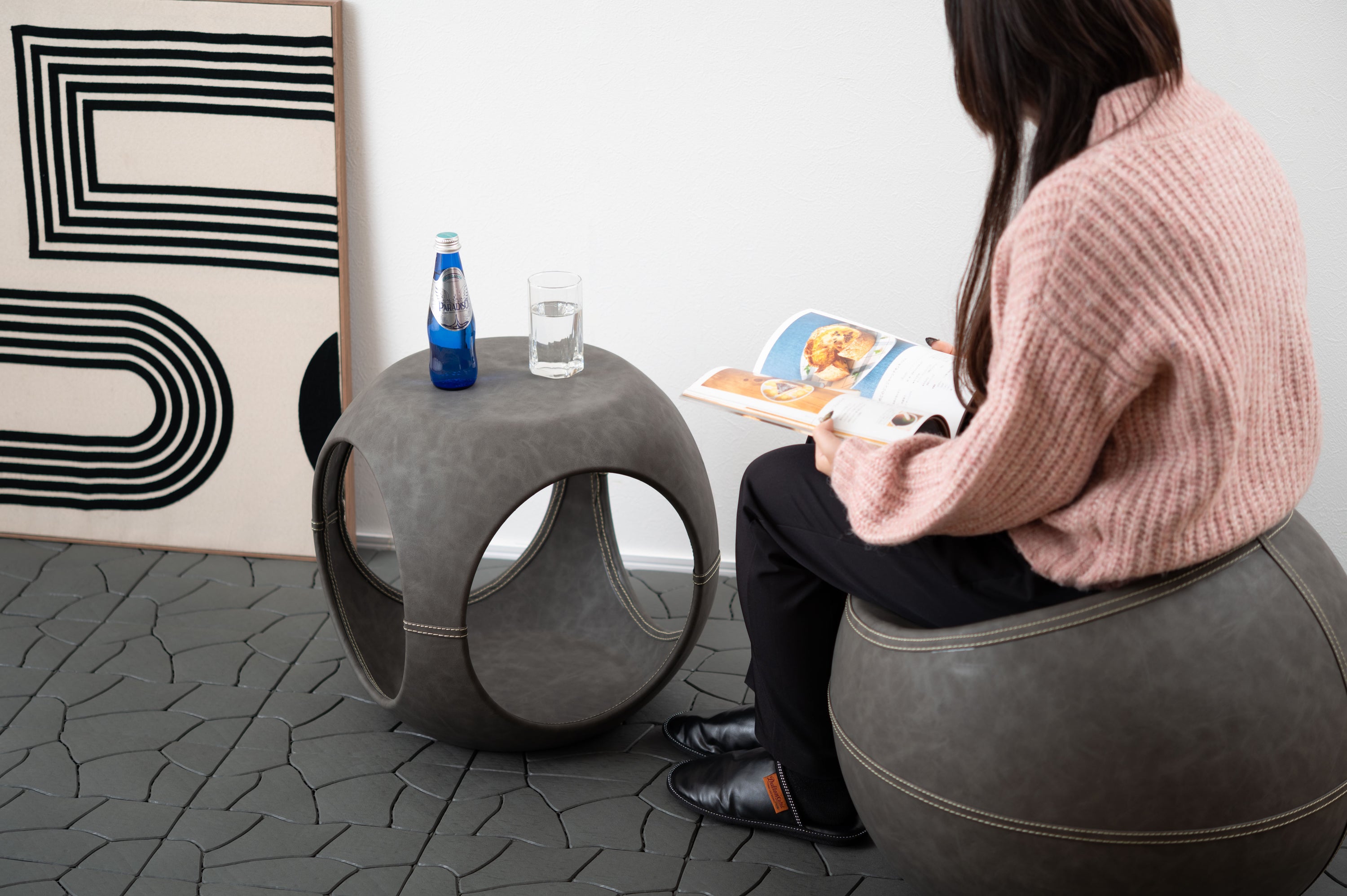 ソフトレザーのクールな質感と施されたステッチが絶妙な調和を魅せ、独創的なフォルムが空間を彩るサイドテーブルです。置くだけで空間の主役になるアイテムです。