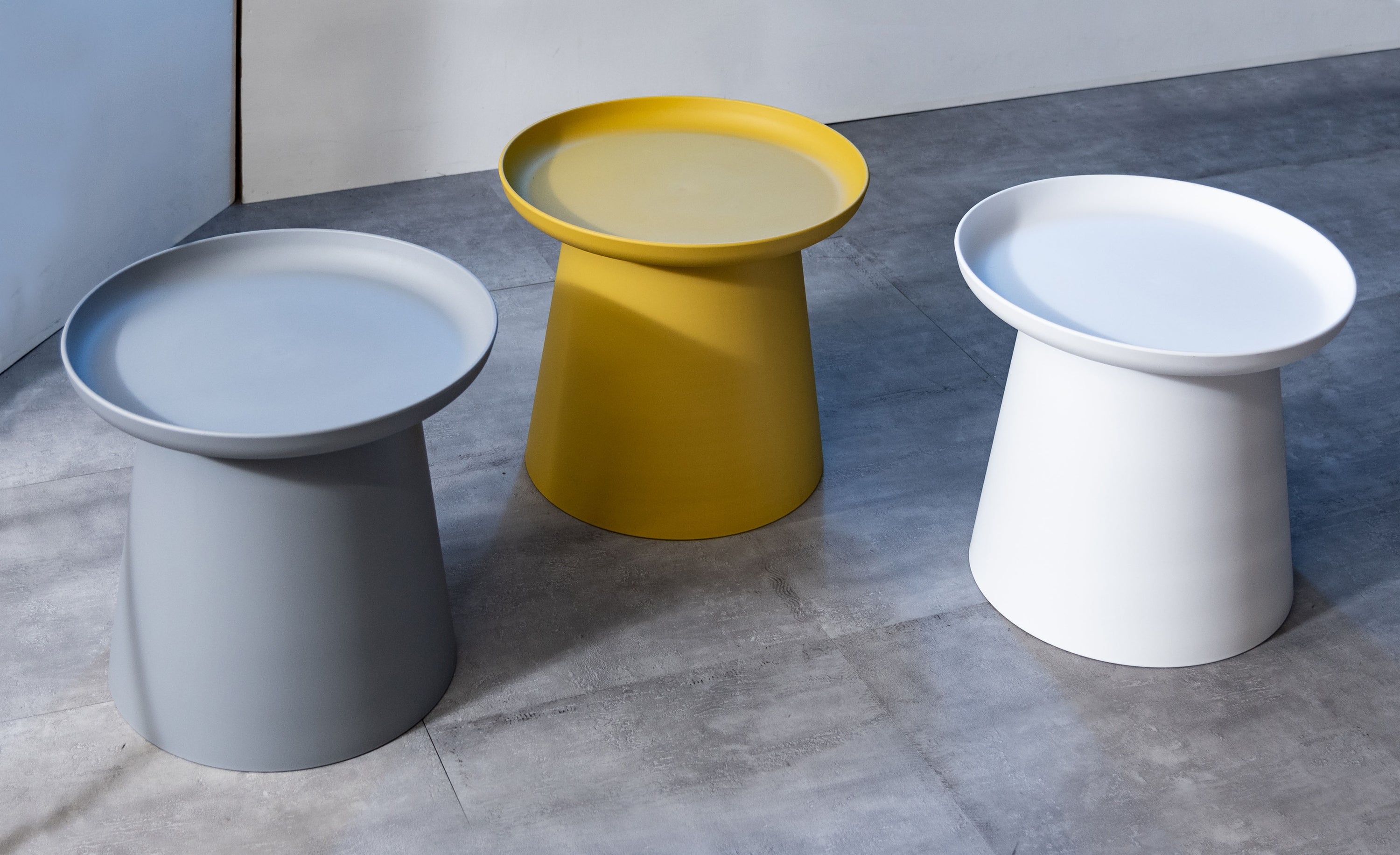 印象的なシルエットのラウンド型テーブル。 耐久性にすぐれ、ホームユースに限らずパブリックスペースでのご使用にも適しています。