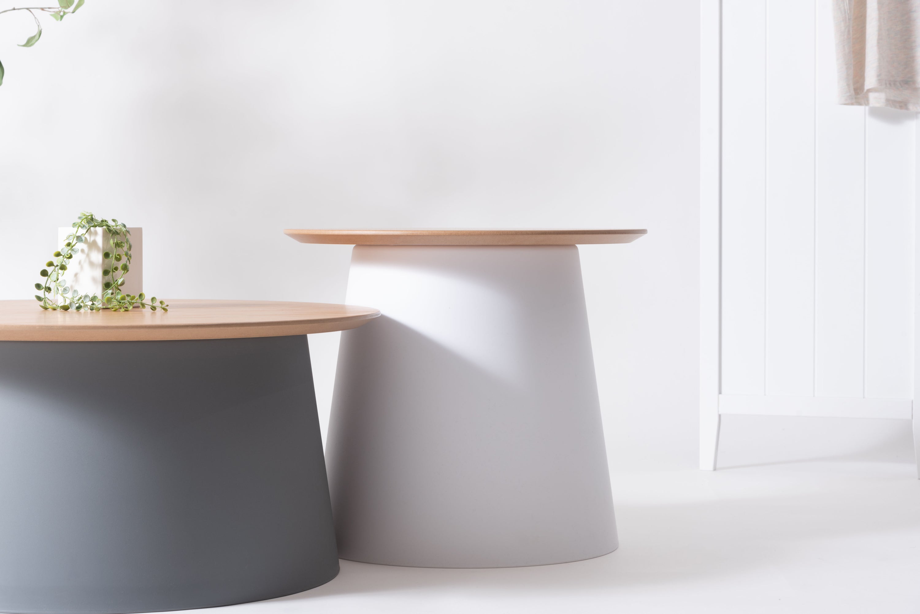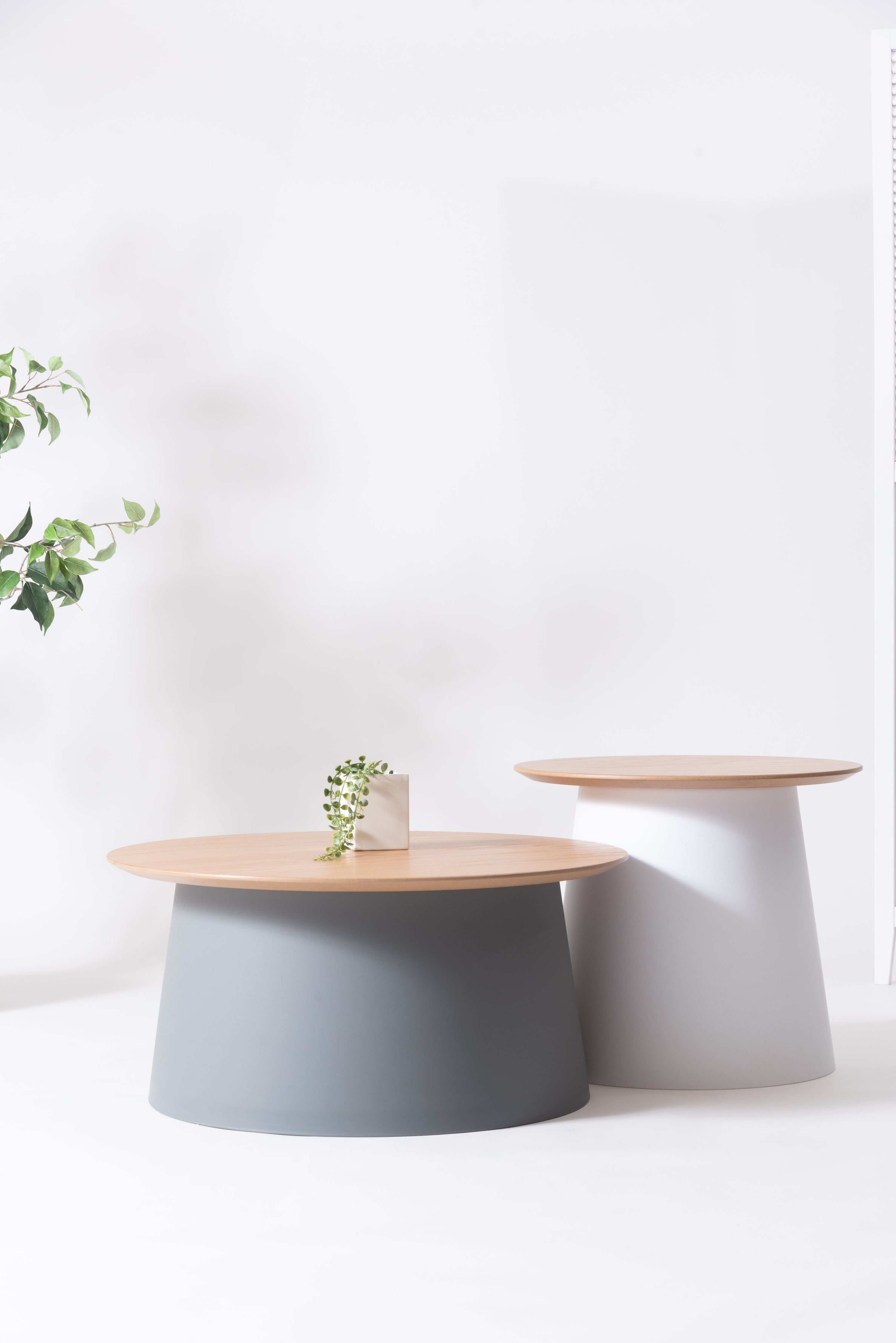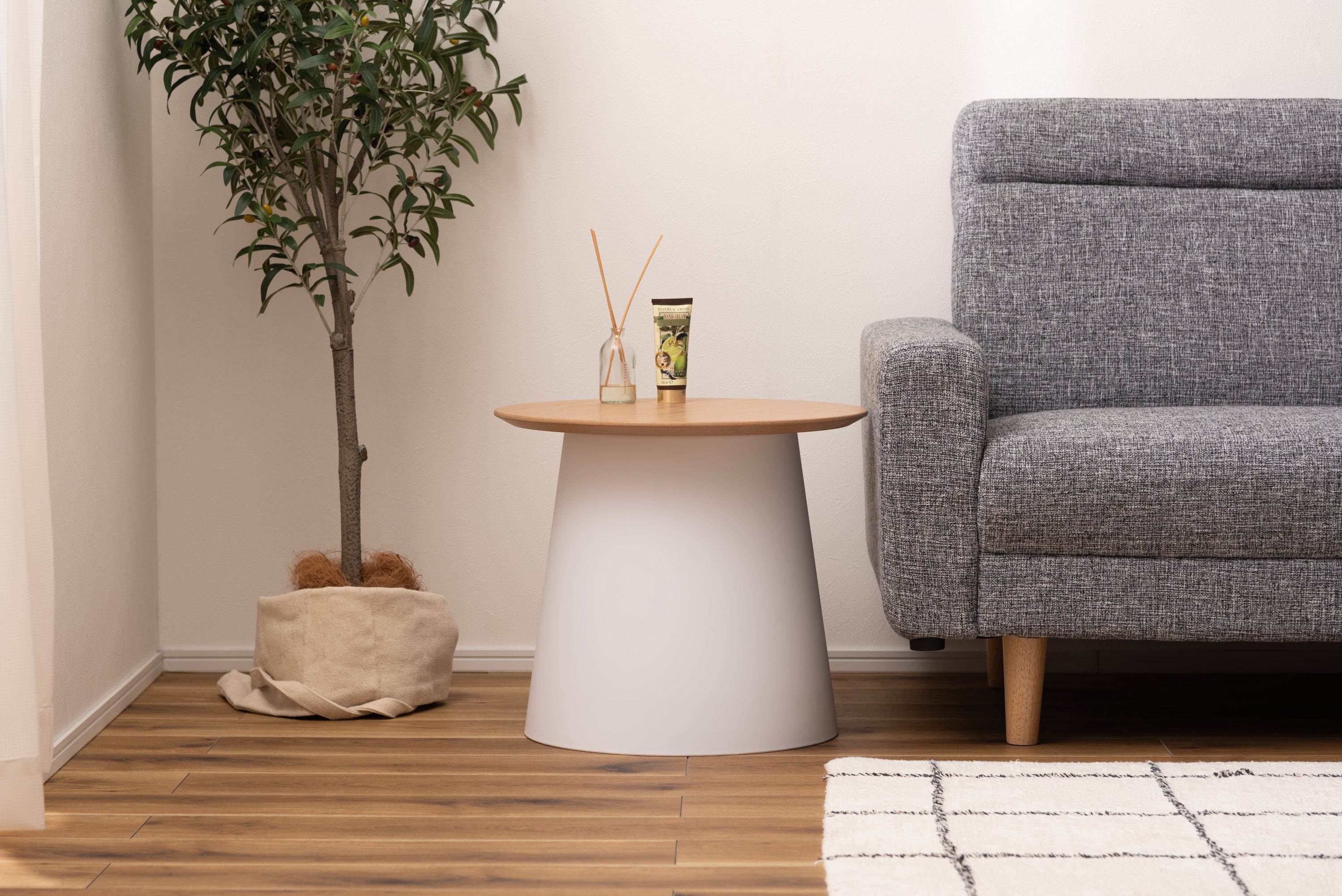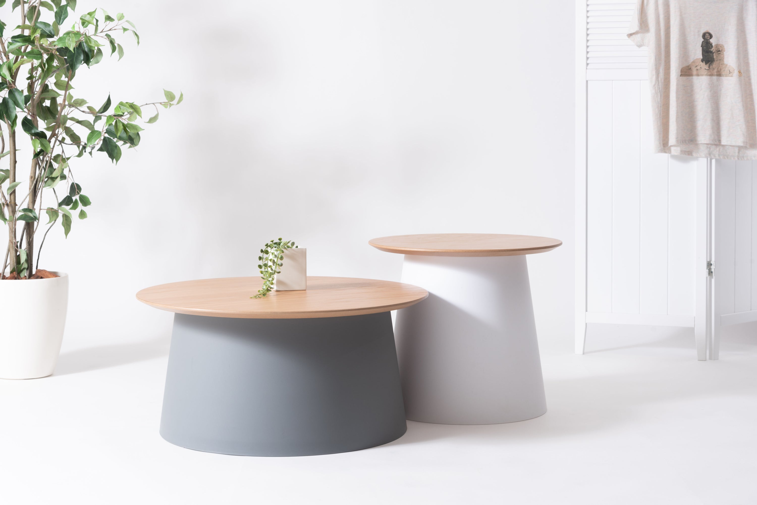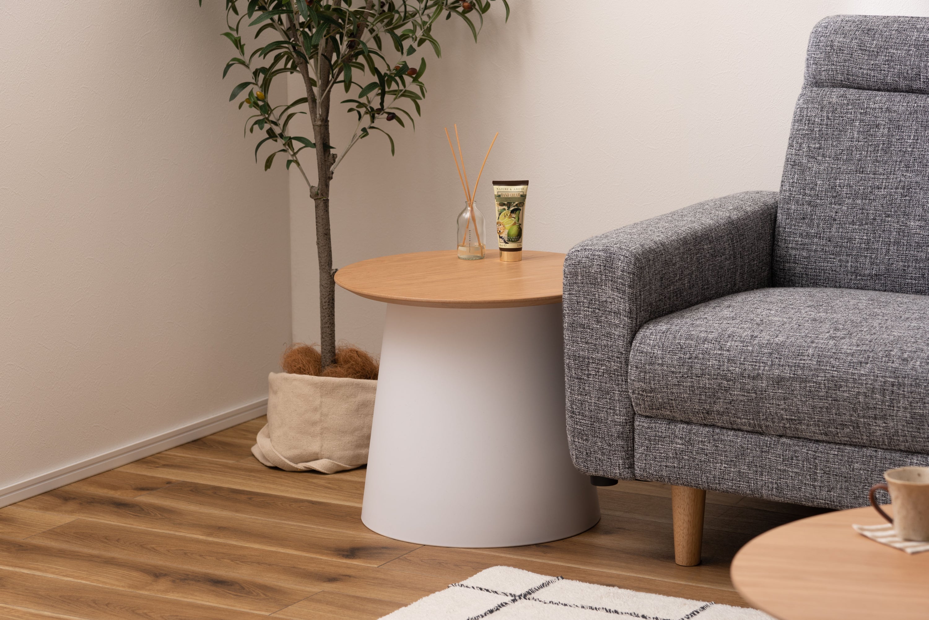 天板と脚部の異素材の組み合わせが特徴的なラウンドテーブル。 センターテーブルやサイドテーブルとしての用途だけでなく、 サイズ違いで組みあわせることで使い方の幅が広がります。