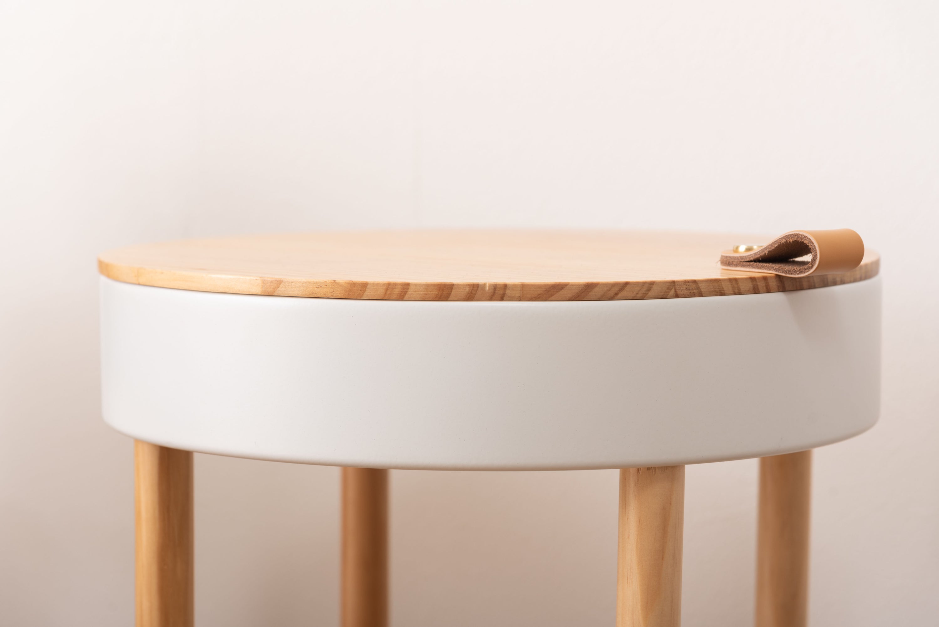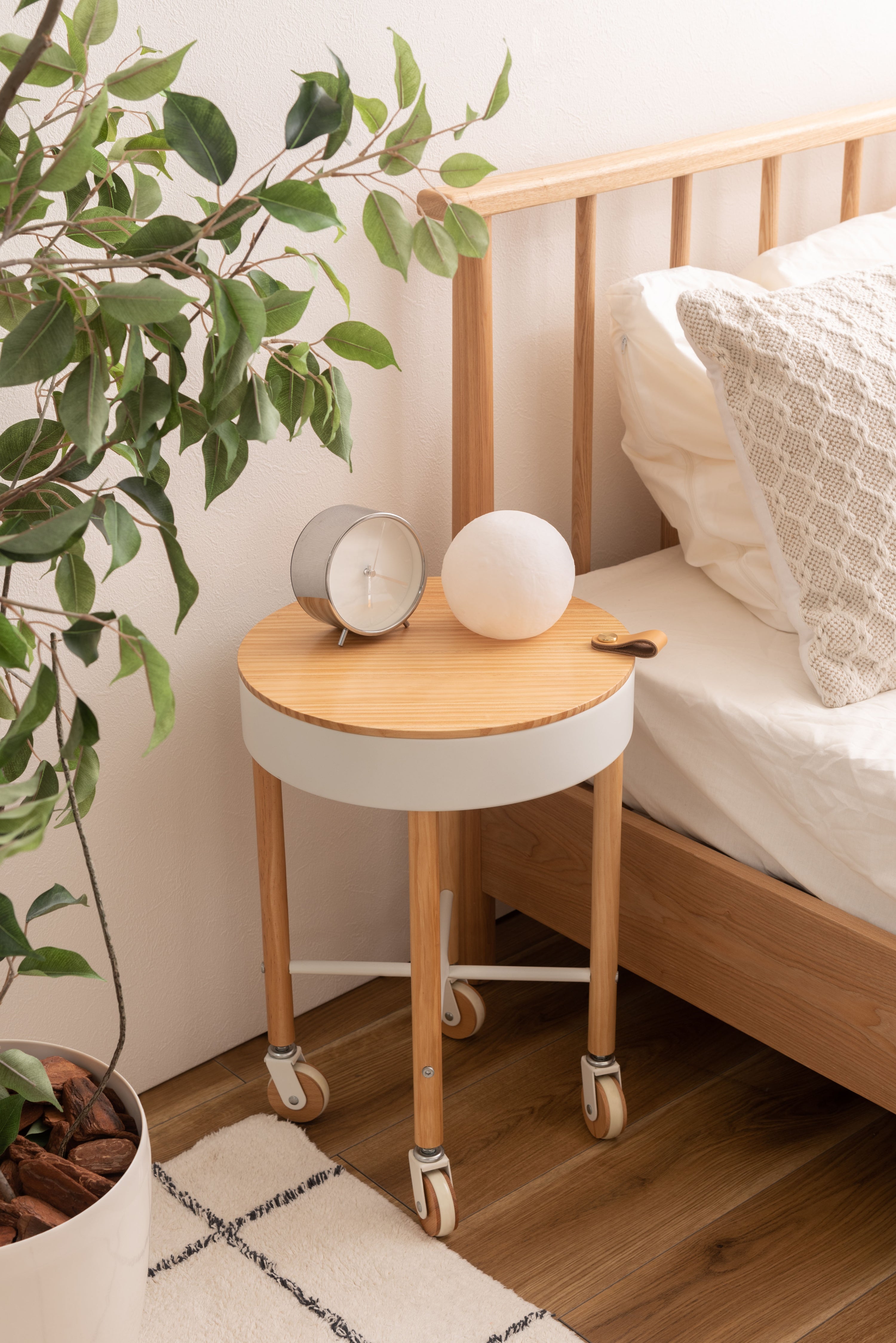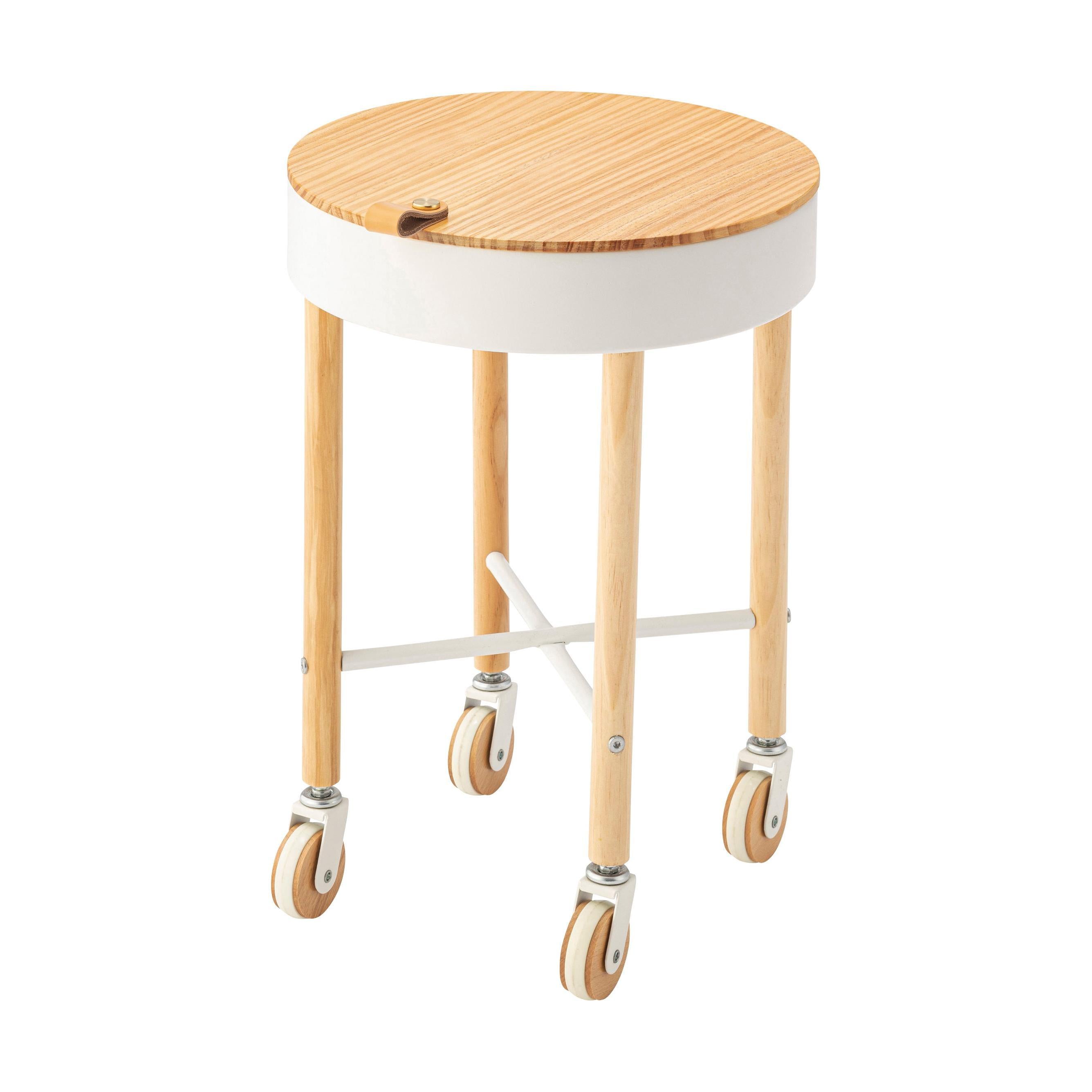 大人気の「Sylph」シリーズにサイドテーブルが登場しました。キャスター付きで移動も簡単、さらに収納もできて使い勝手抜群のテーブルです。天板には天然木パインを使用。ハッキリした木目が特徴的で、カントリー調家具からシンプル・ナチュラル系家具まで幅広く使われる人気のある天然木。天板を外すと中は収納スペース。収納スペースの底面にはフェルトを敷いてあるので、アクセサリー類を入れても傷防止になり安心です。天板の縁部分にはアクセントにもなるレザー素材の取っ手付き。キャスターの側面部分にも天然木を使用した、細部のデザインにもこだわったサイドテーブル。