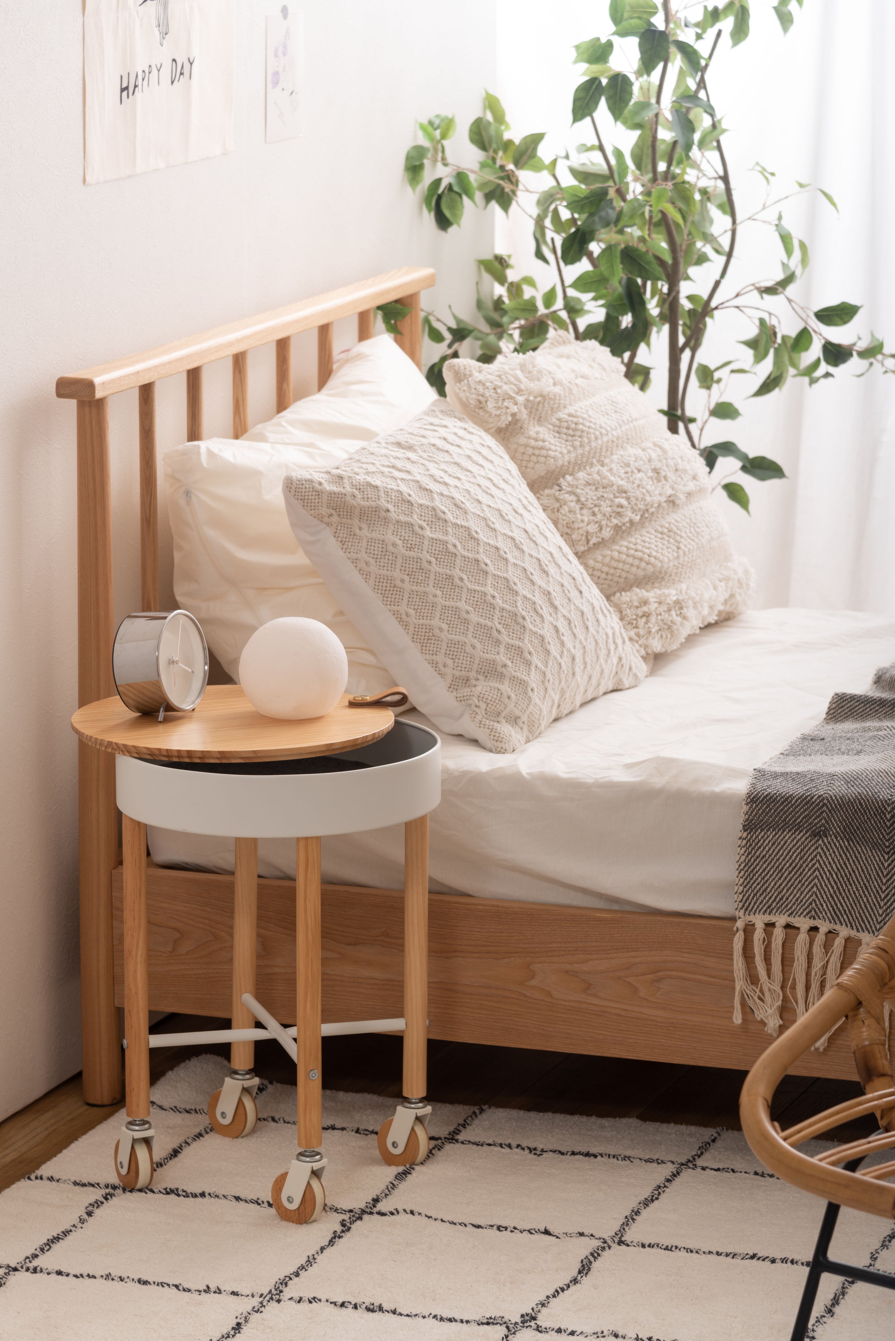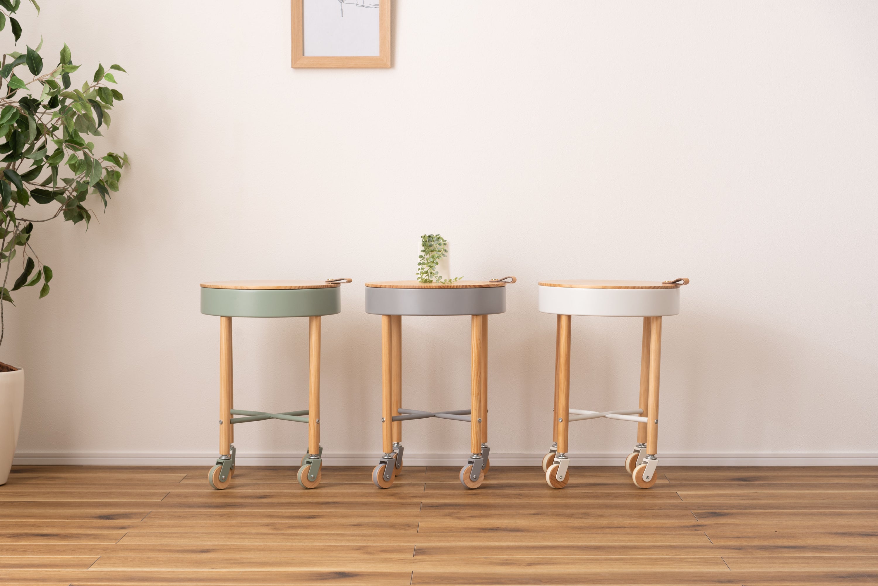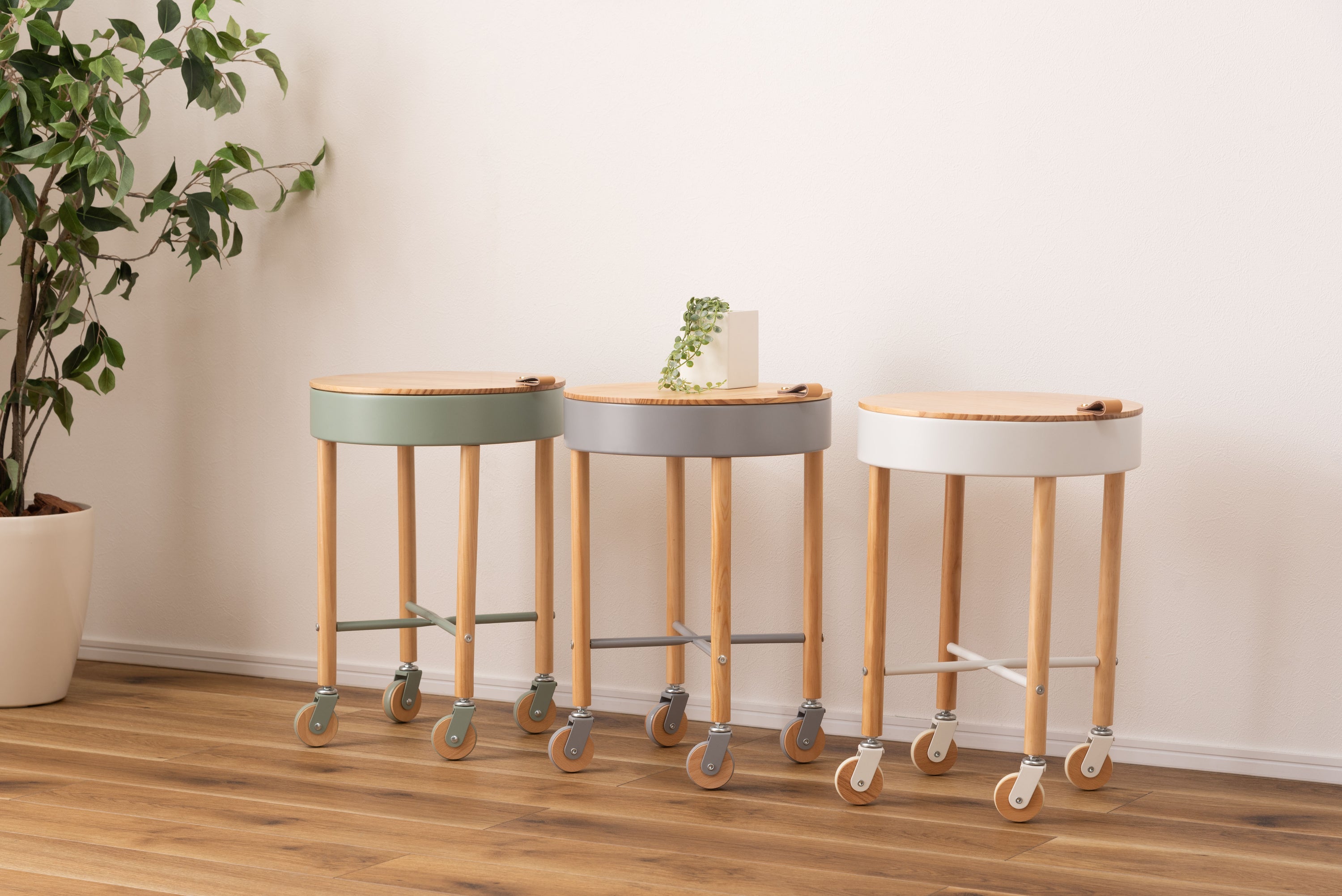 大人気の「Sylph」シリーズにサイドテーブルが登場しました。キャスター付きで移動も簡単、さらに収納もできて使い勝手抜群のテーブルです。天板には天然木パインを使用。ハッキリした木目が特徴的で、カントリー調家具からシンプル・ナチュラル系家具まで幅広く使われる人気のある天然木。天板を外すと中は収納スペース。収納スペースの底面にはフェルトを敷いてあるので、アクセサリー類を入れても傷防止になり安心です。天板の縁部分にはアクセントにもなるレザー素材の取っ手付き。キャスターの側面部分にも天然木を使用した、細部のデザインにもこだわったサイドテーブル。
