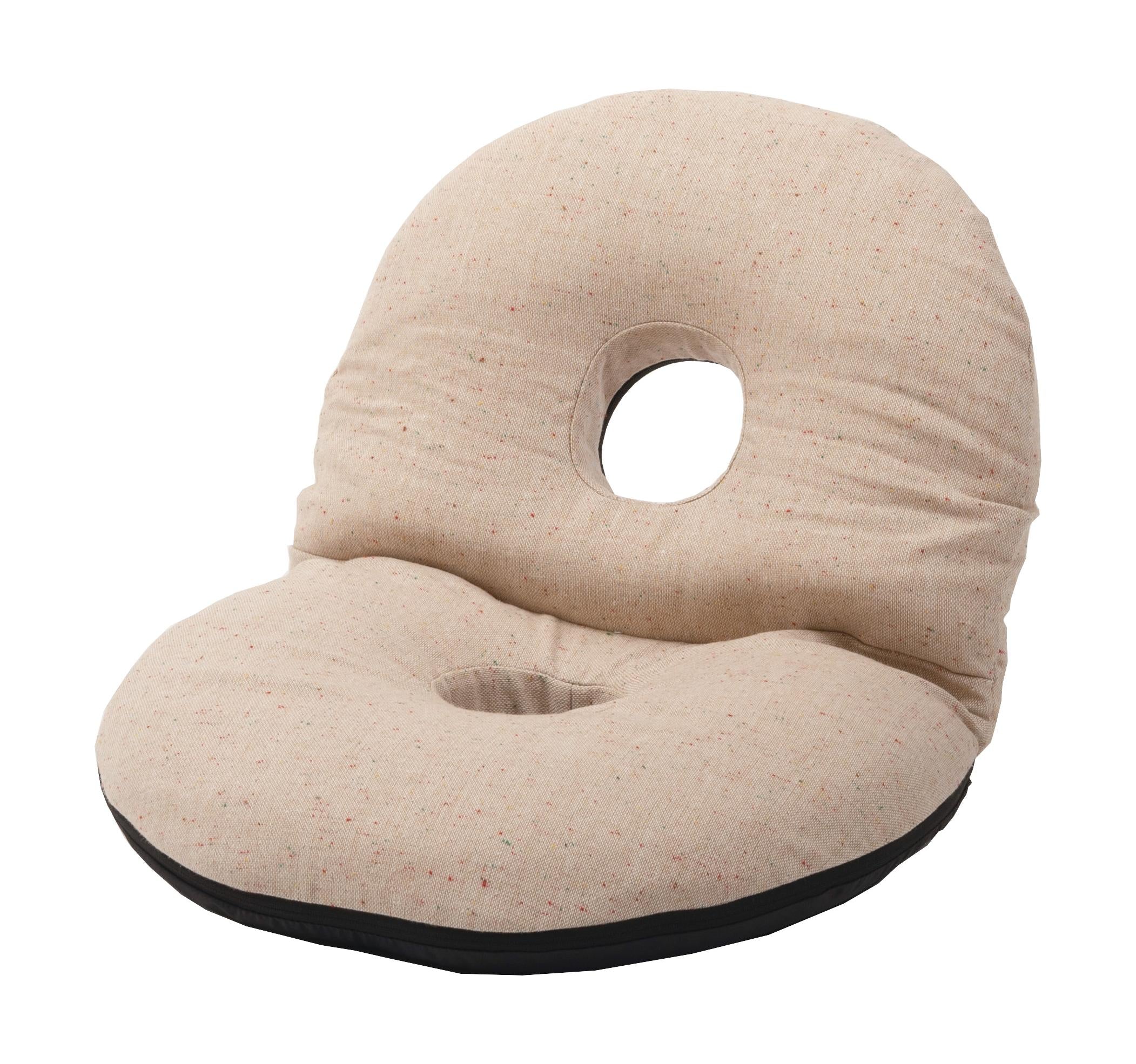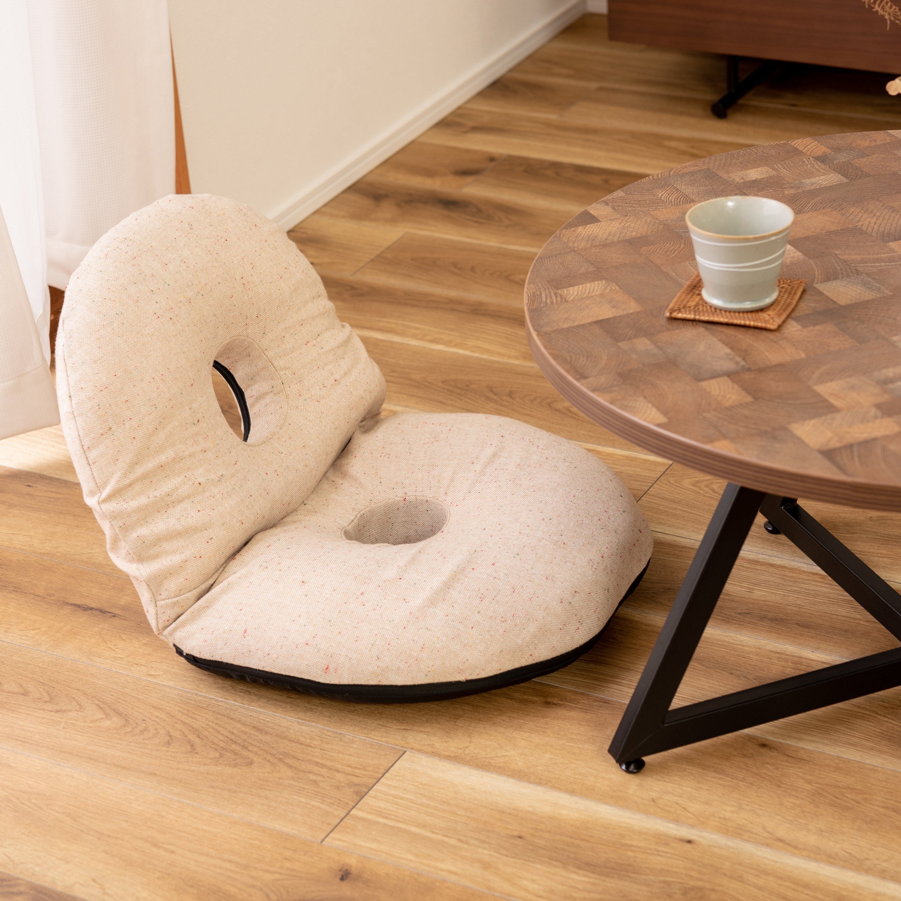 ふだん使いにちょうどいい、ドーナツ型のかわいいフロアチェア。座面や背もたれは、ドーナツのように中央に穴が開いたデザイン。座った時の圧迫感を緩和し、お尻にかかる負担をやわらげてくれるので長時間の使用に適したフロアチェア。座面には低反発ウレタンを使用しているので、しっとりと柔らかくフィットした座り心地。また座面はほど良い高さなので、ごろ寝枕としても使えます。簡単に折りたたむ事ができ、軽量タイプなので持ち運びラクラクで収納も場所を取りません。