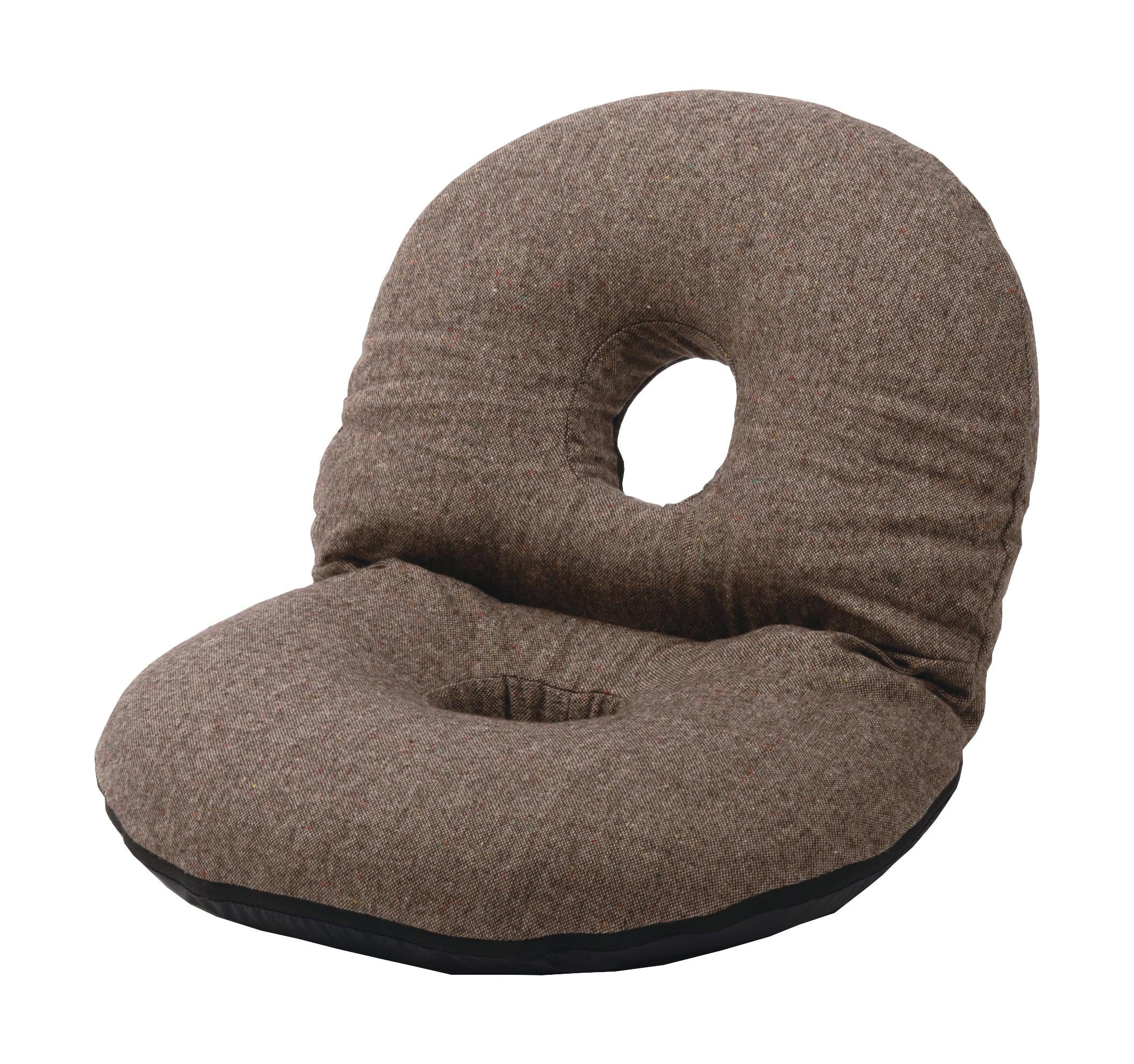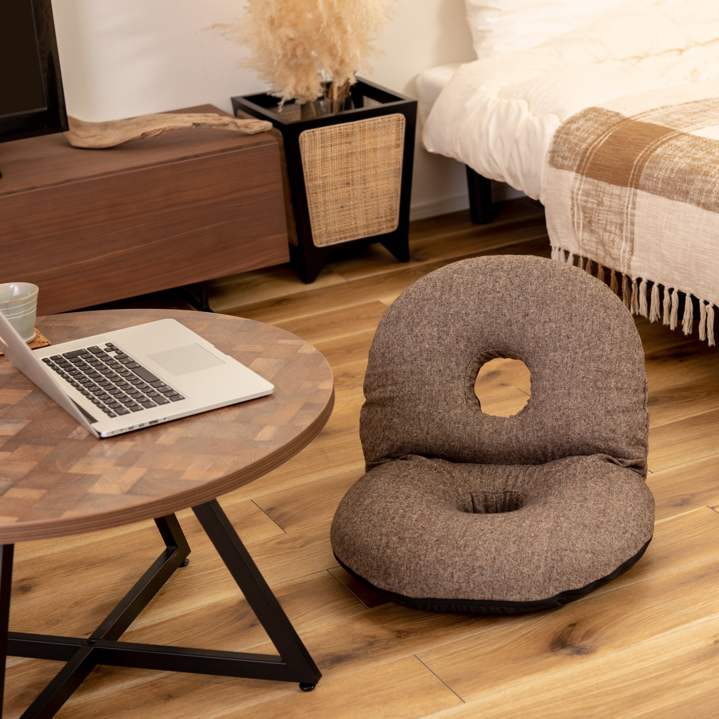 ふだん使いにちょうどいい、ドーナツ型のかわいいフロアチェア。座面や背もたれは、ドーナツのように中央に穴が開いたデザイン。座った時の圧迫感を緩和し、お尻にかかる負担をやわらげてくれるので長時間の使用に適したフロアチェア。座面には低反発ウレタンを使用しているので、しっとりと柔らかくフィットした座り心地。また座面はほど良い高さなので、ごろ寝枕としても使えます。簡単に折りたたむ事ができ、軽量タイプなので持ち運びラクラクで収納も場所を取りません。