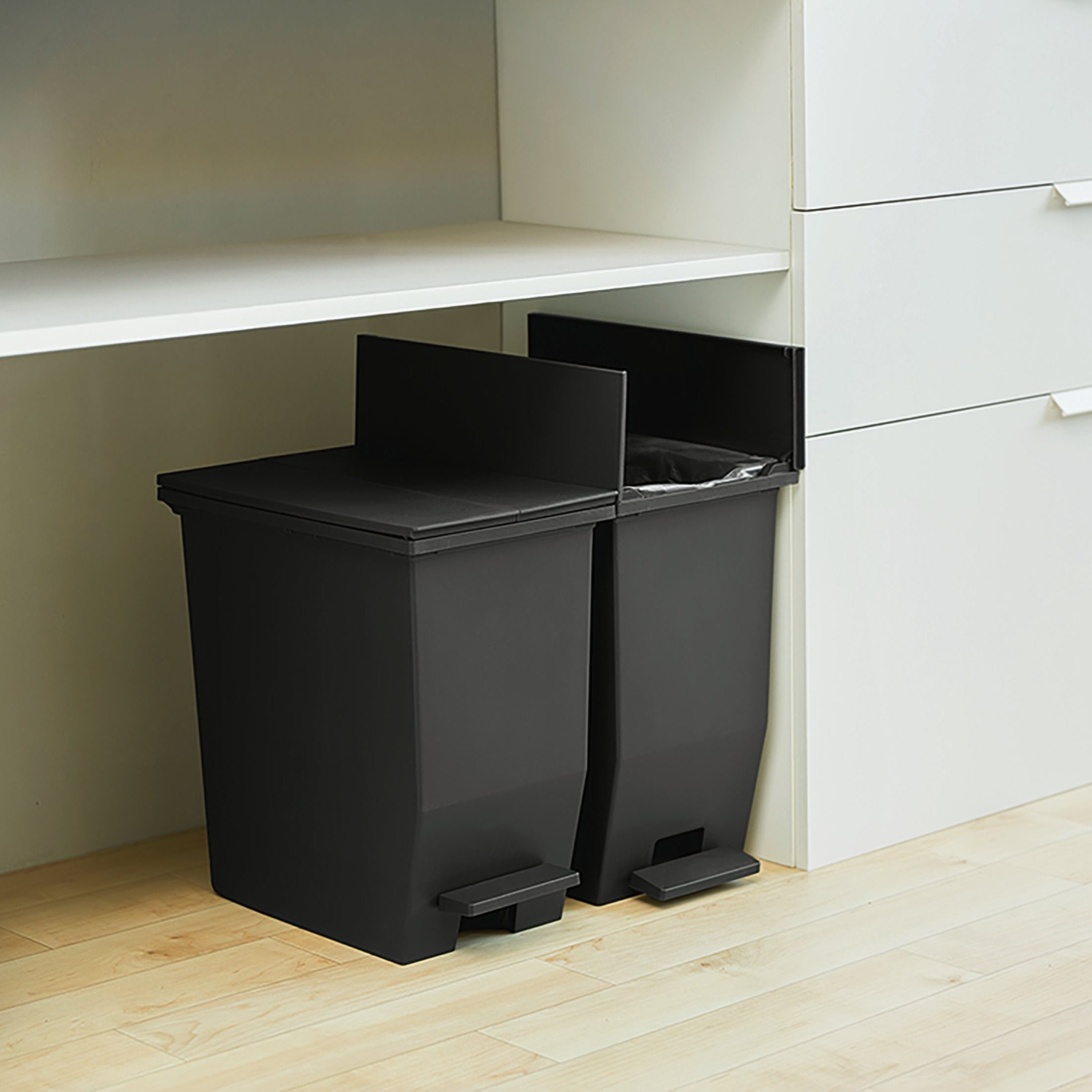 棚下やカウンター下に置いたまま捨てられるコンパクトなペダルダストボックス。 ゴミ箱に手を触れずにゴミが捨てられるペダル式なのでとっても衛生的。 手でもフタを開けられ、開いた状態をキープする事ができる仕様。 菌に強く汚れにくい、抗菌と防汚のダブル加工。 SIAA・ISO22196(SIAAマークは、ISO22196法により評価された結果に基づき、抗菌製品技術協会ガイドラインで品質管理・情報公開された製品に表示されています) フタが両サイドに分割して開く観音開きタイプなので、背の低い棚下やキッチン周りにおいても快適に使えます。 背面ミニキャスター付きなので、手前に引き出す時やちょっとした移動にとっても便利。 ゴミ袋をしっかりセットできる袋止め付き。前後にそれぞれ可動する袋止めなので、ゴミ袋の取り出し・取り付けが簡単。
