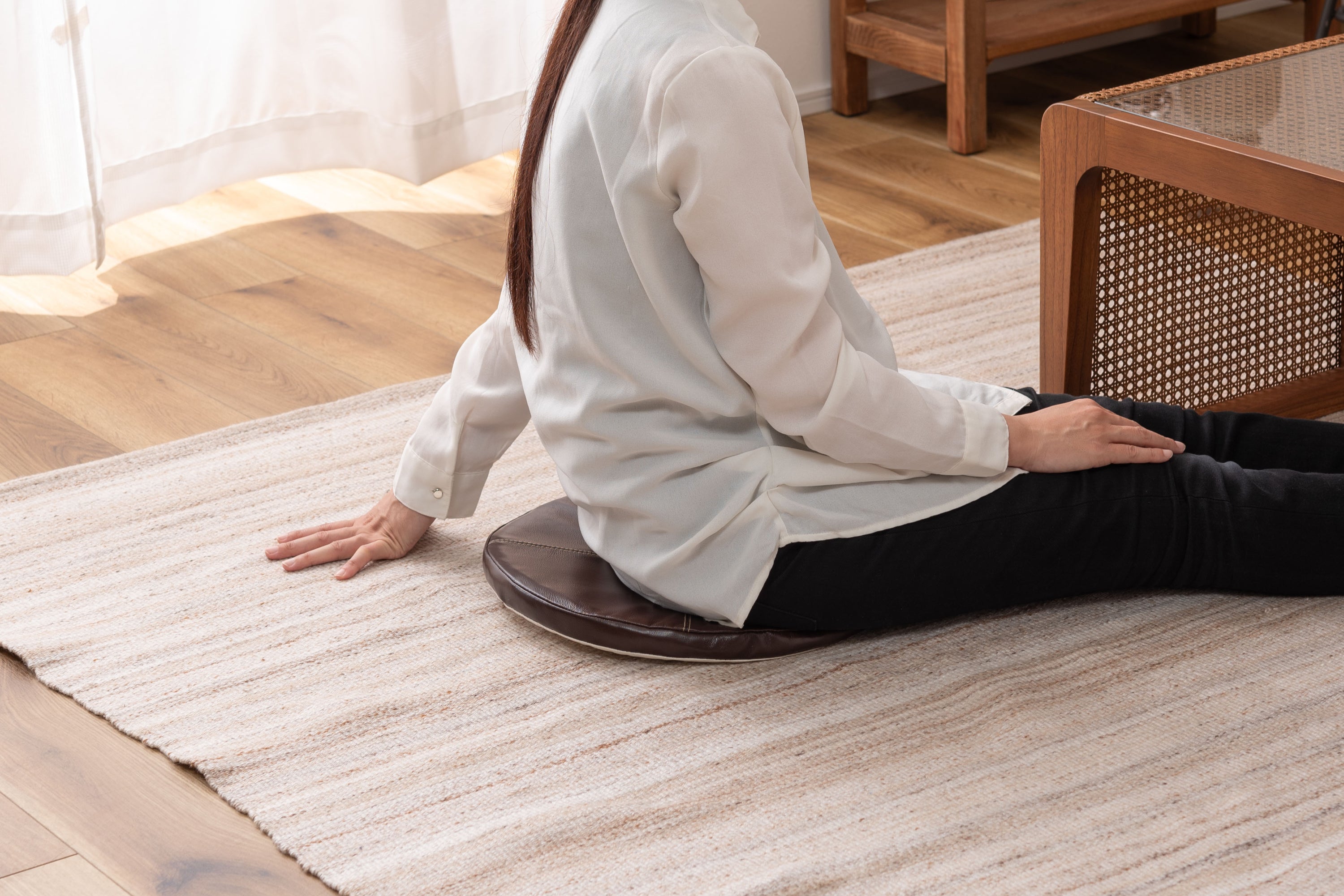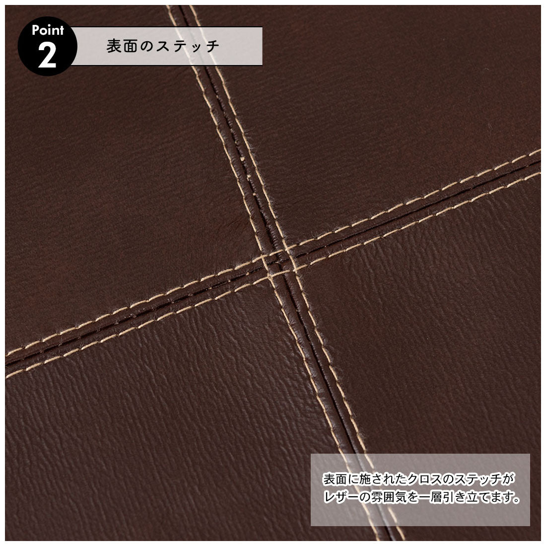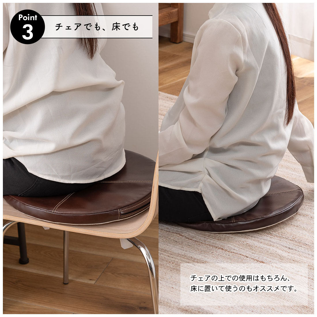 ヴィンテージな雰囲気のシートクッション。本革を断裁した時に残る部分を再生利用した環境に優しい素材「ボンデッドレザー」を使用。チェアやベンチの上で過ごす時間を快適にグレードアップしてくれるアイテムです。風合いのあるボンデッドレザー仕様です。表面に施されたステッチが、レザーの雰囲気を一層引き立てます。チェアでの使用はもちろん、床置きでの使用もオススメ。
