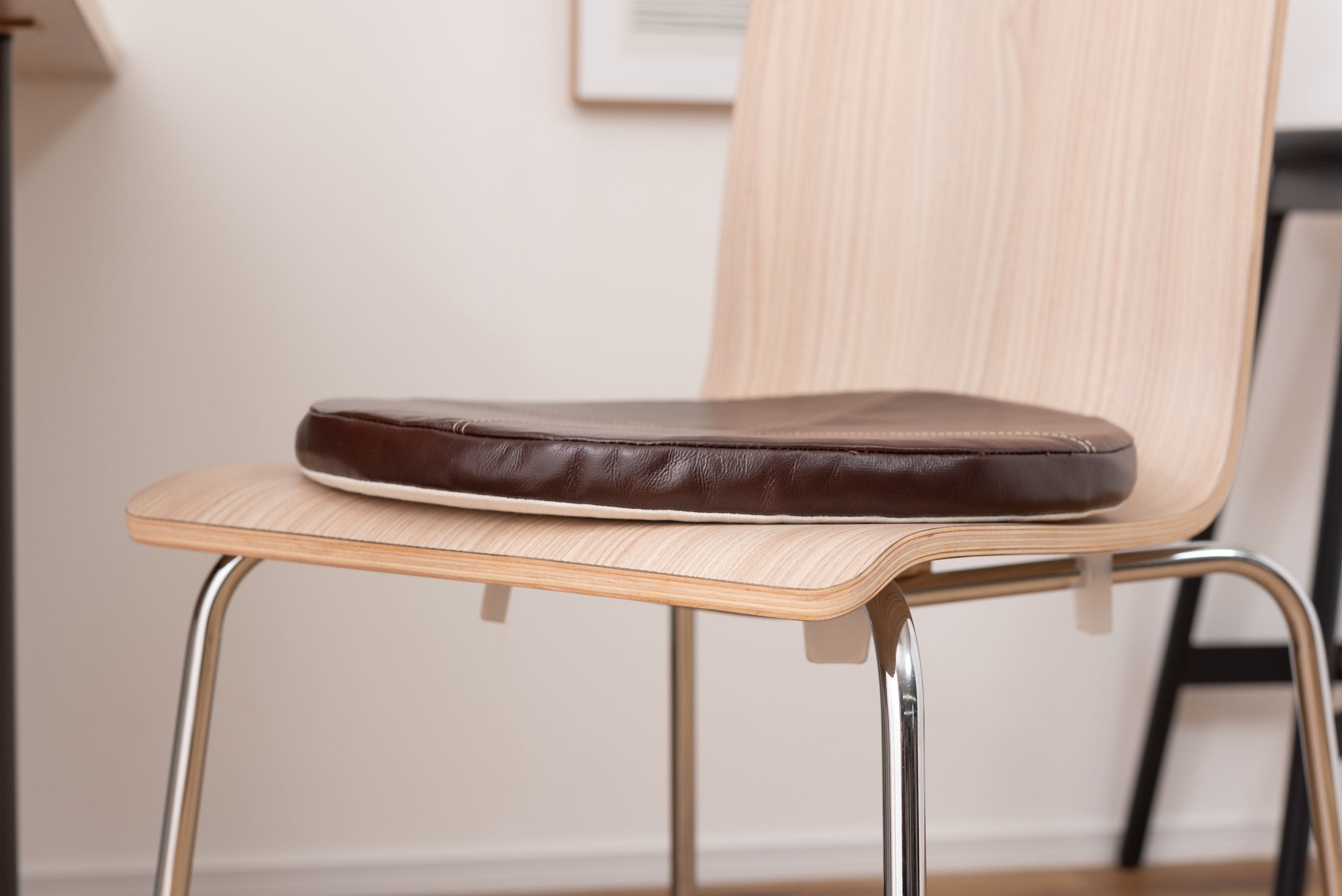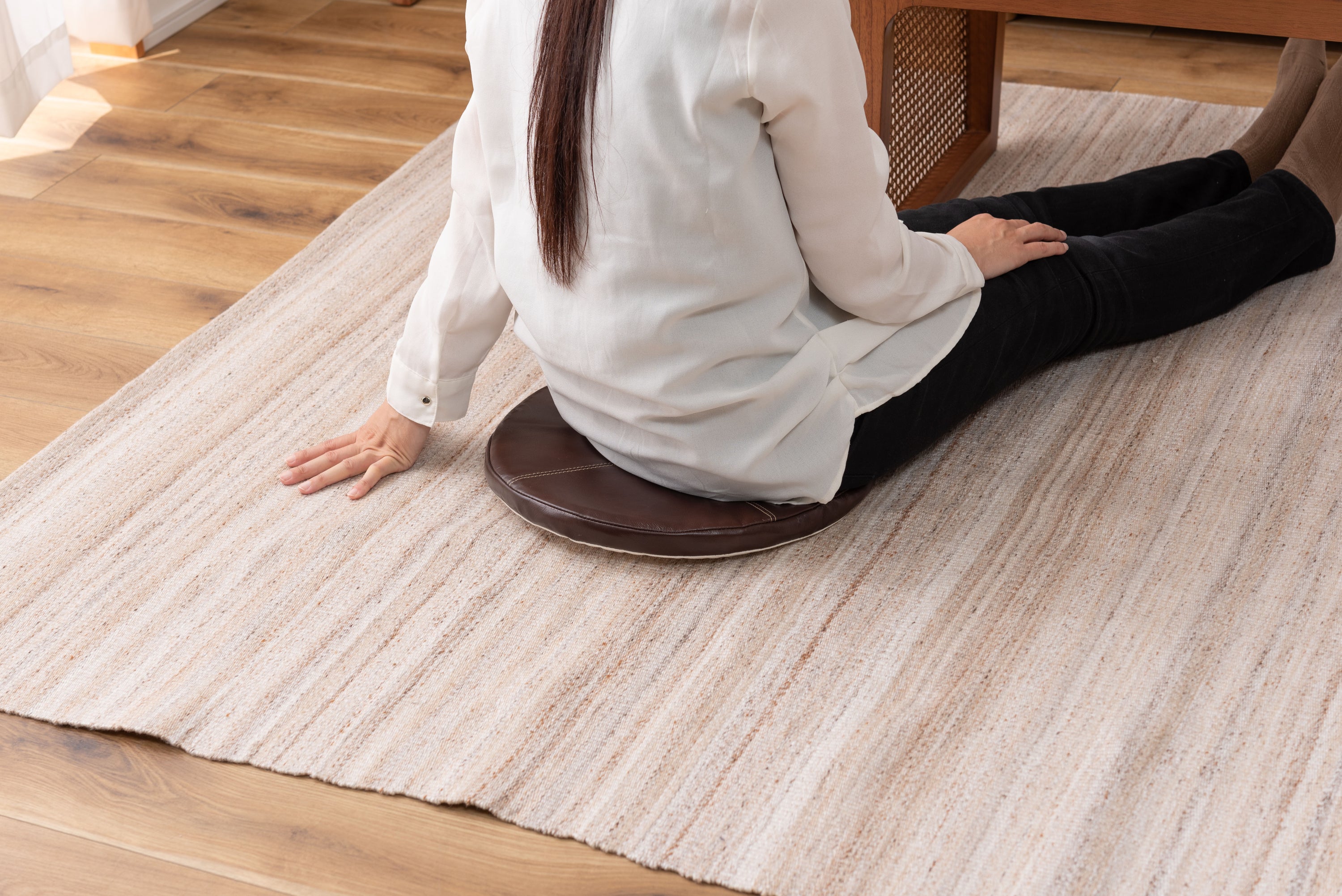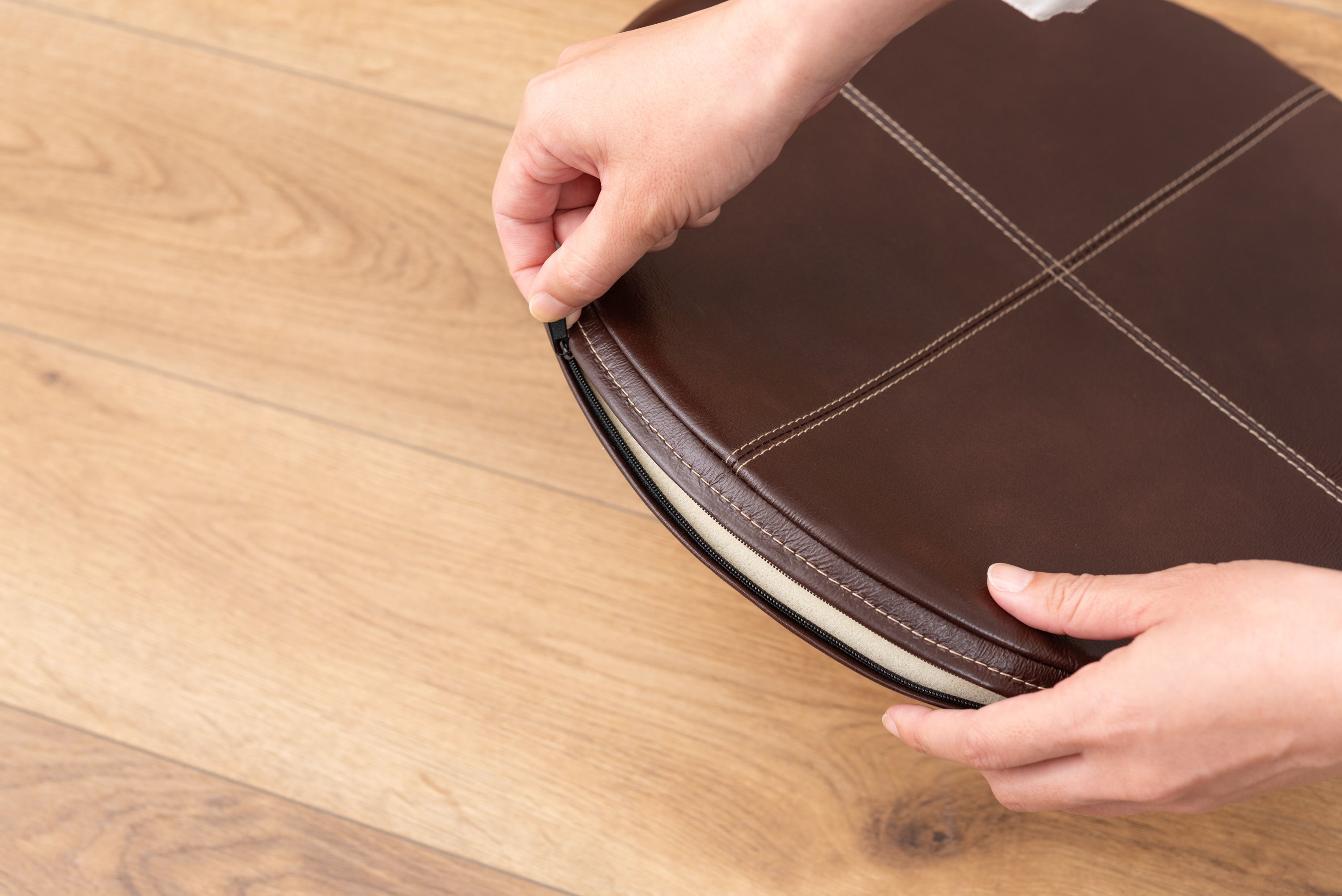 ヴィンテージな雰囲気のシートクッション。本革を断裁した時に残る部分を再生利用した環境に優しい素材「ボンデッドレザー」を使用。チェアやベンチの上で過ごす時間を快適にグレードアップしてくれるアイテムです。風合いのあるボンデッドレザー仕様です。表面に施されたステッチが、レザーの雰囲気を一層引き立てます。チェアでの使用はもちろん、床置きでの使用もオススメ。