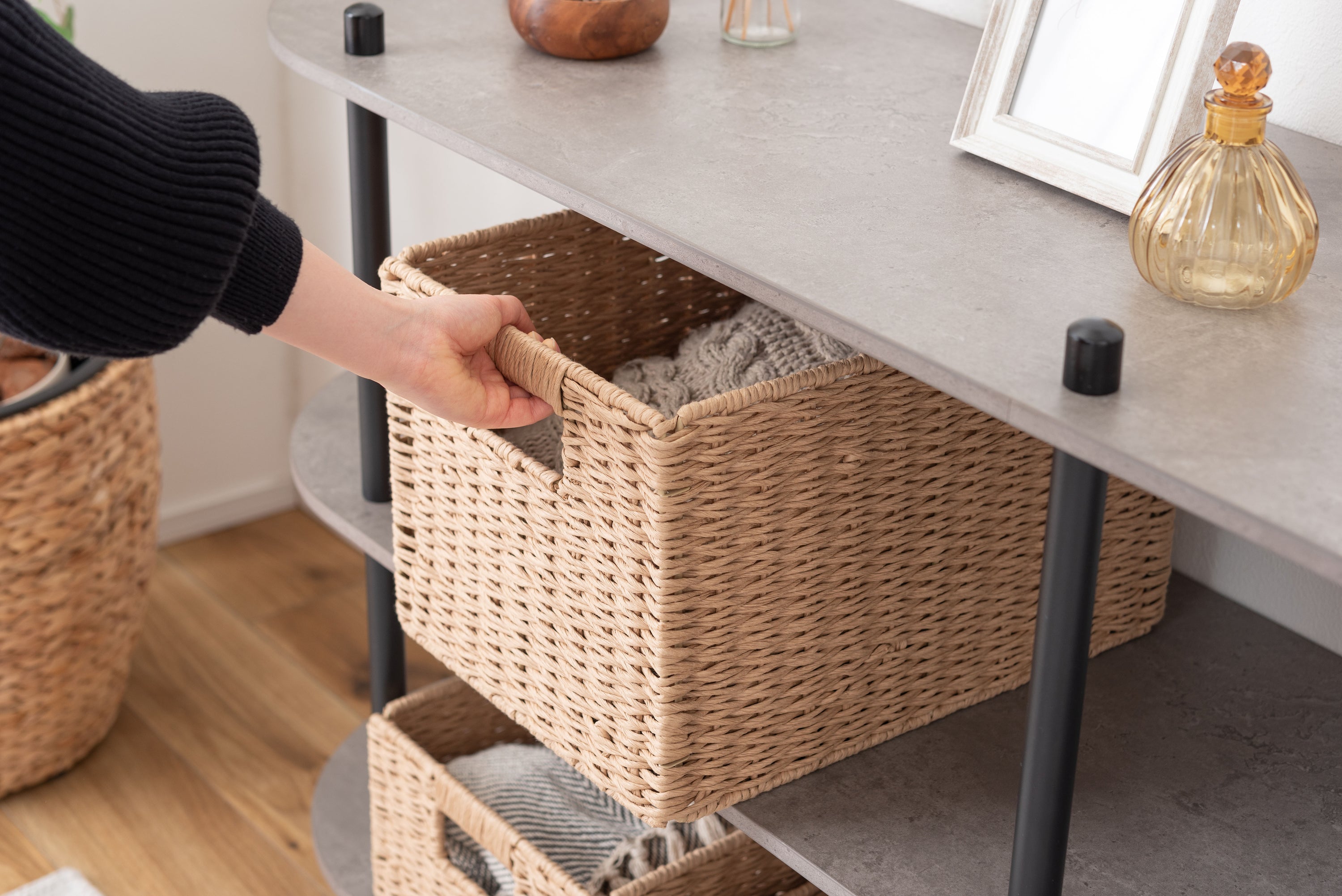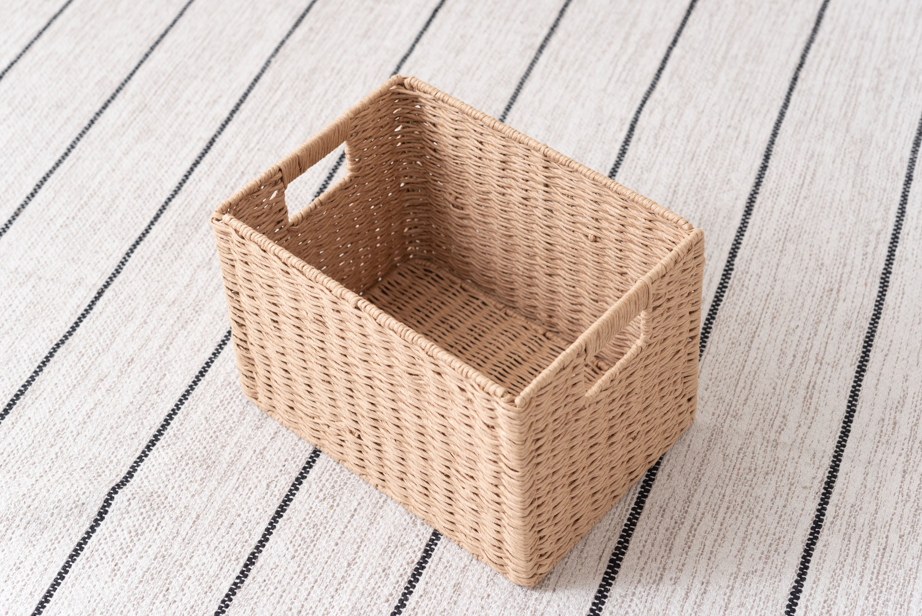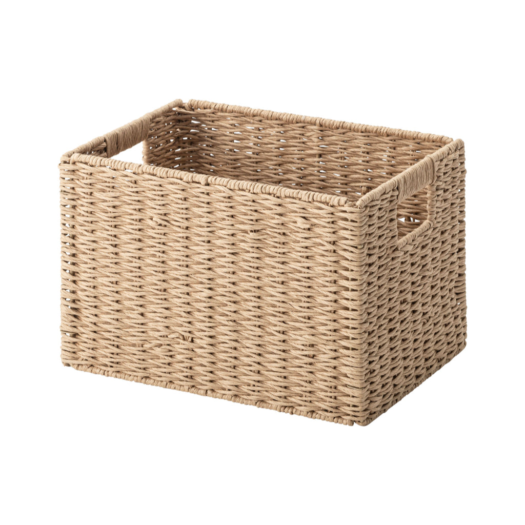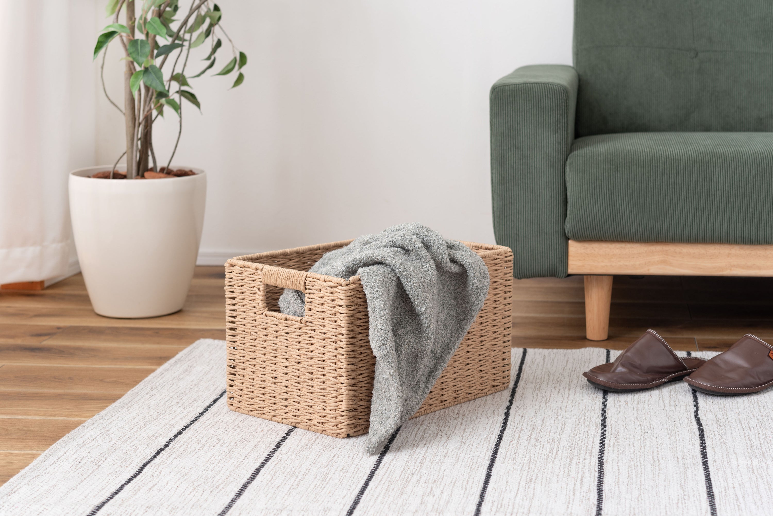 折りたたみ式。収納バスケット。Flex。Baskets。-フレックスバスケット-。使わないときには折りたためる手編みペーパーコードの収納バスケットです。ナチュラルなカラーリングがどんなテイストにもよく合います。深さの違う3サイズからお選びいただけます。