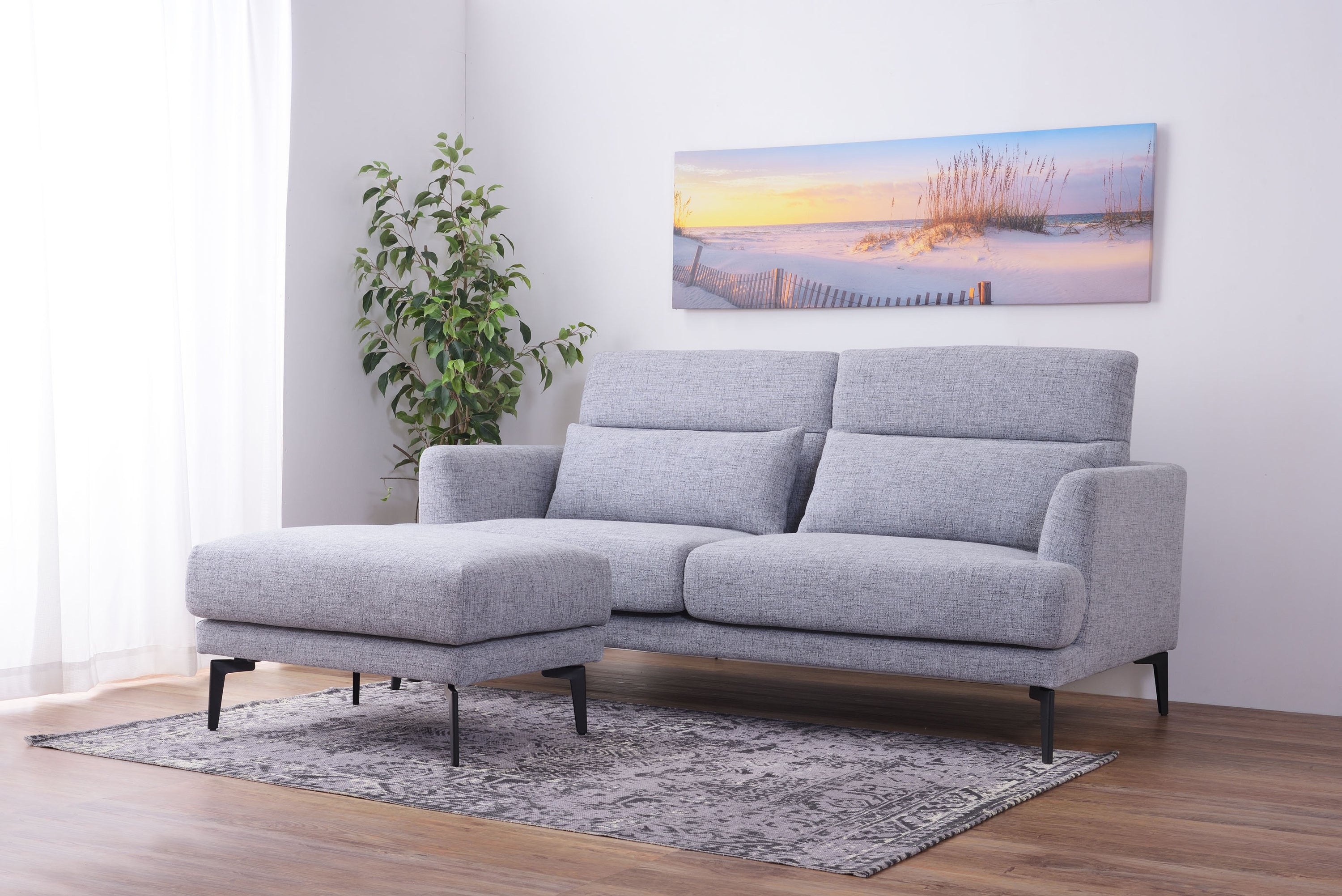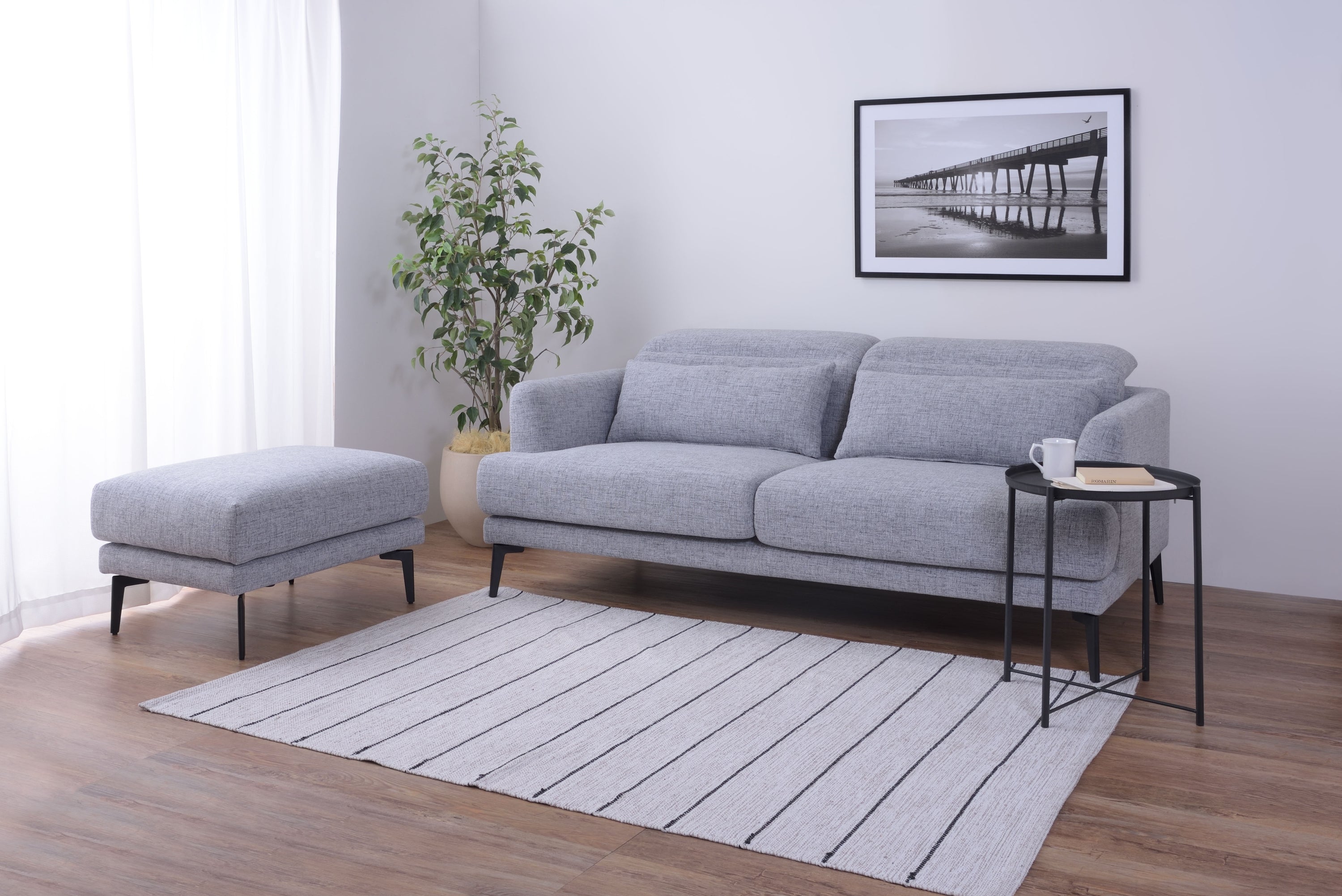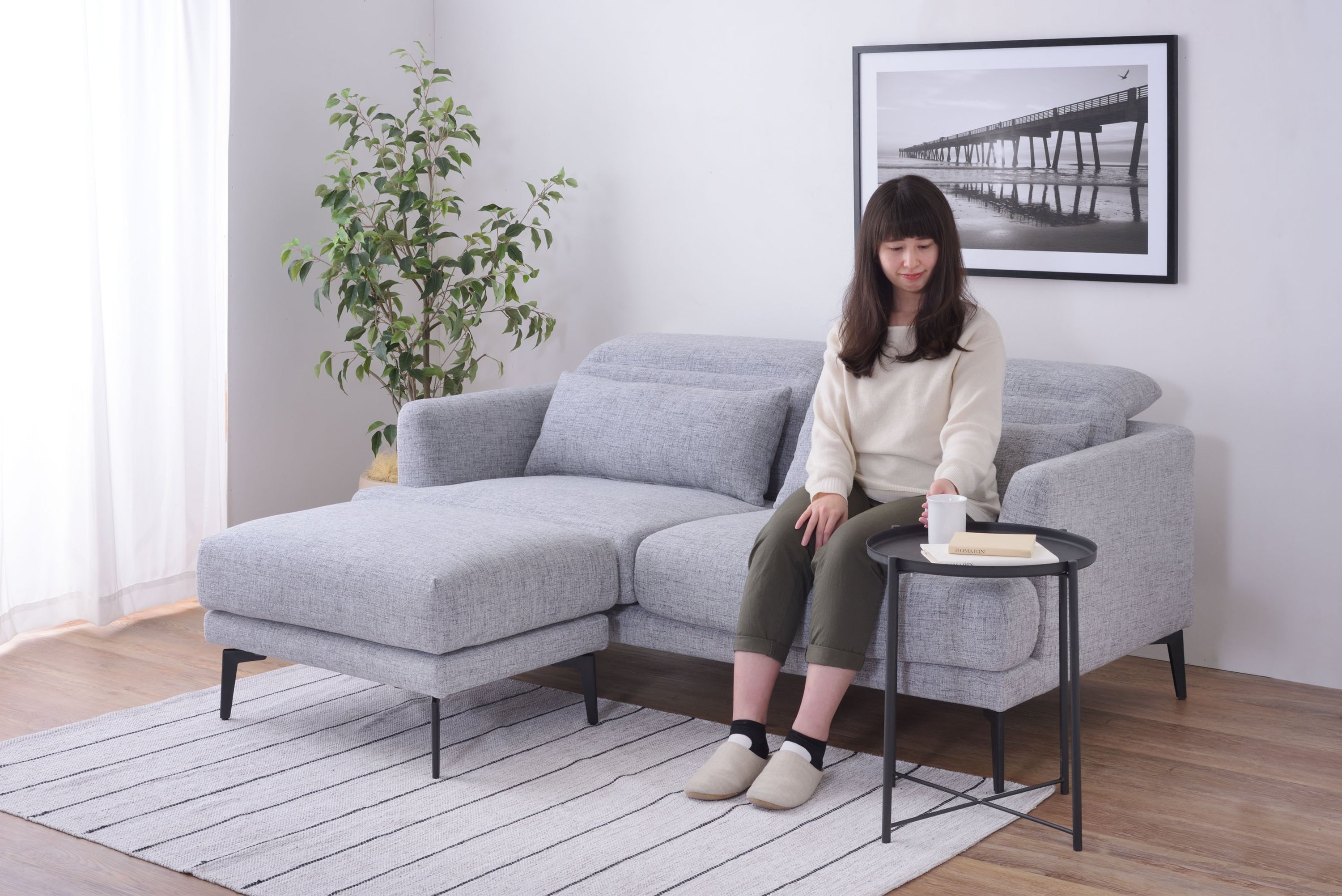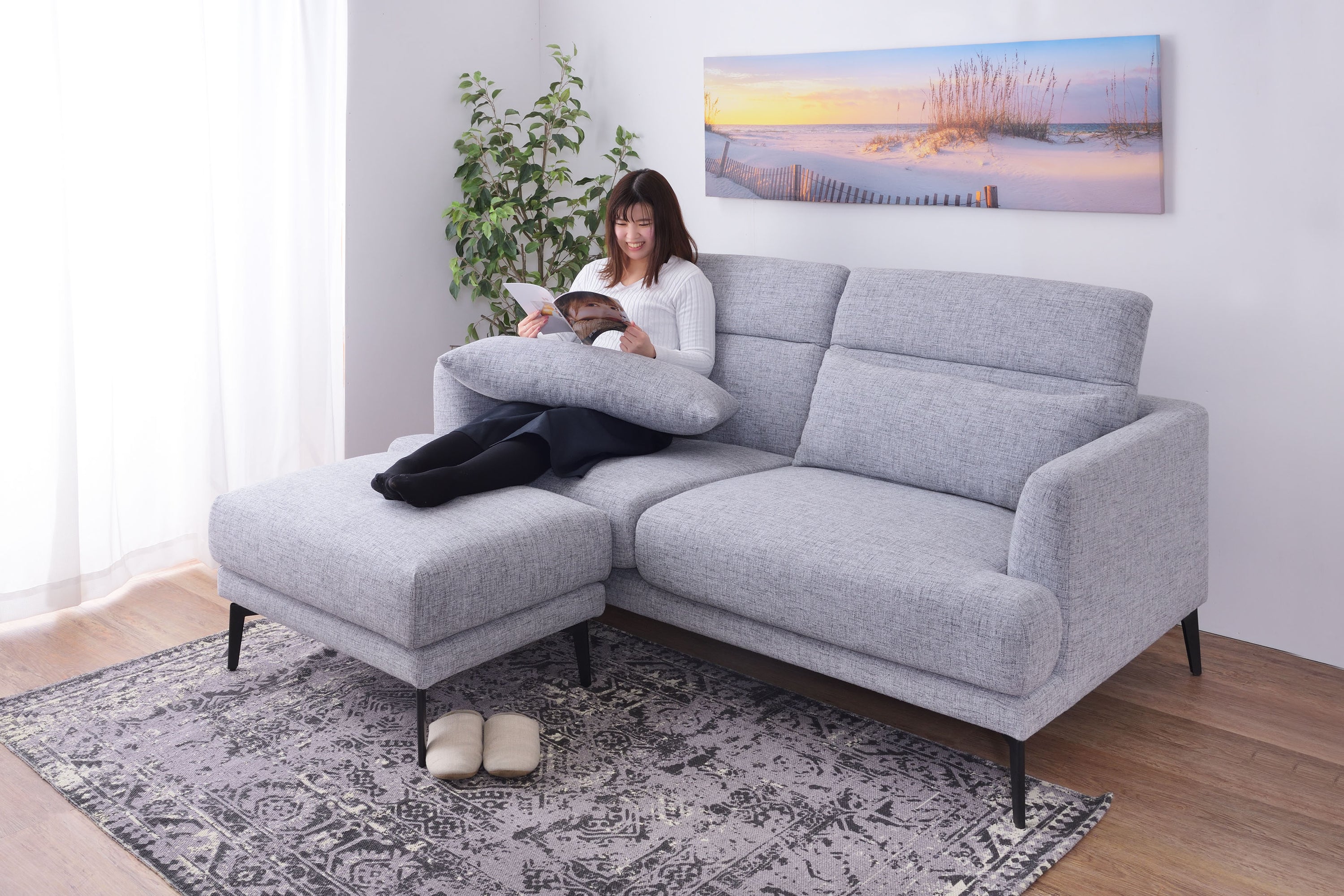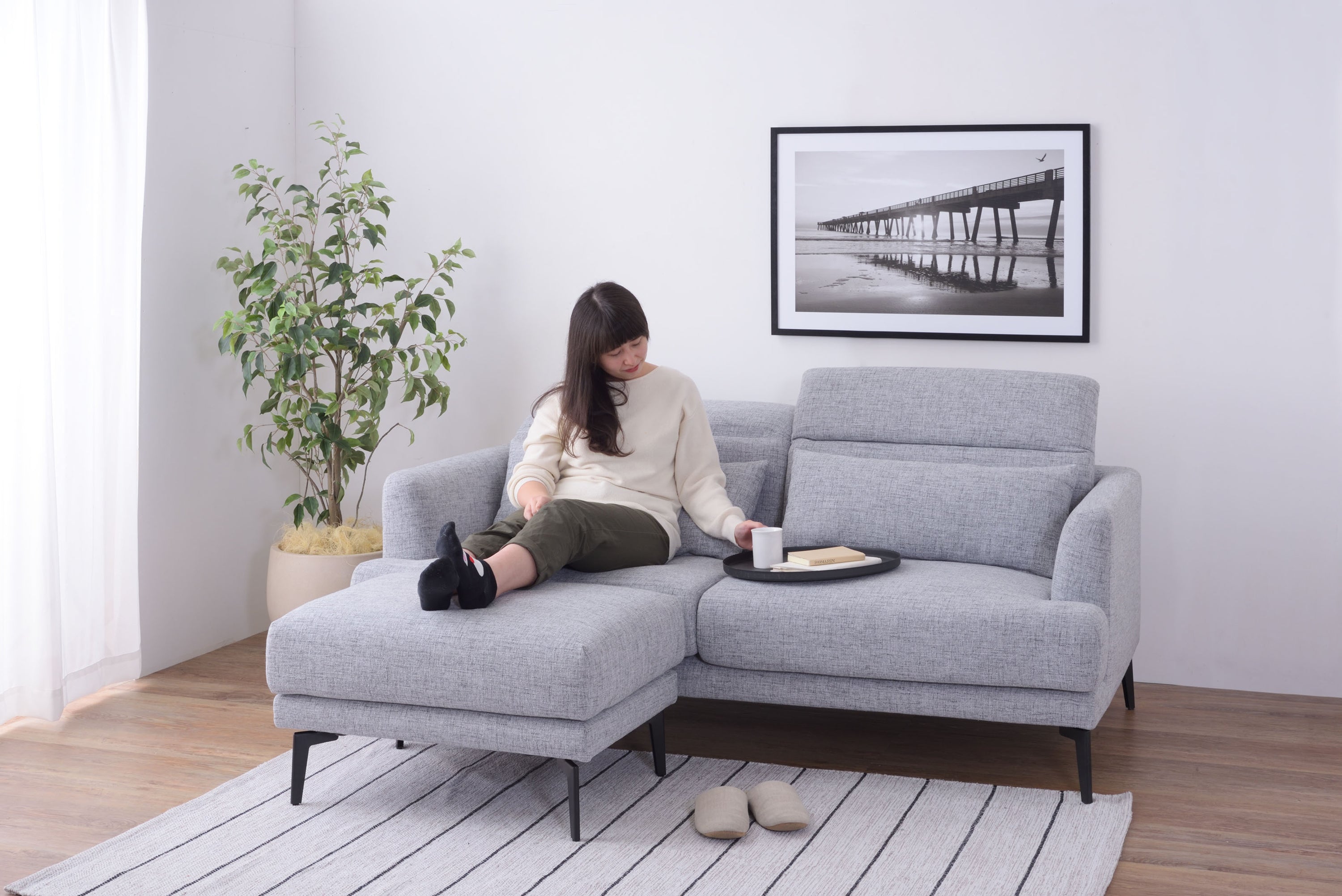 頭部のリクライニング機能で快適にくつろげるソファ「スレンド」 お部屋の中央に間切りとして置かれることが多いソファ。 スレンドは使用しないときに頭部を倒し、お部屋の圧迫感を軽減することができます。 ボリュームのあるソファを支えるのはスタイリッシュなスチール脚。 強度を保ちつつ、シャープな印象を与えます。 オットマンを合わせてコーディネートすれば、くつろぎの幅が広がります。