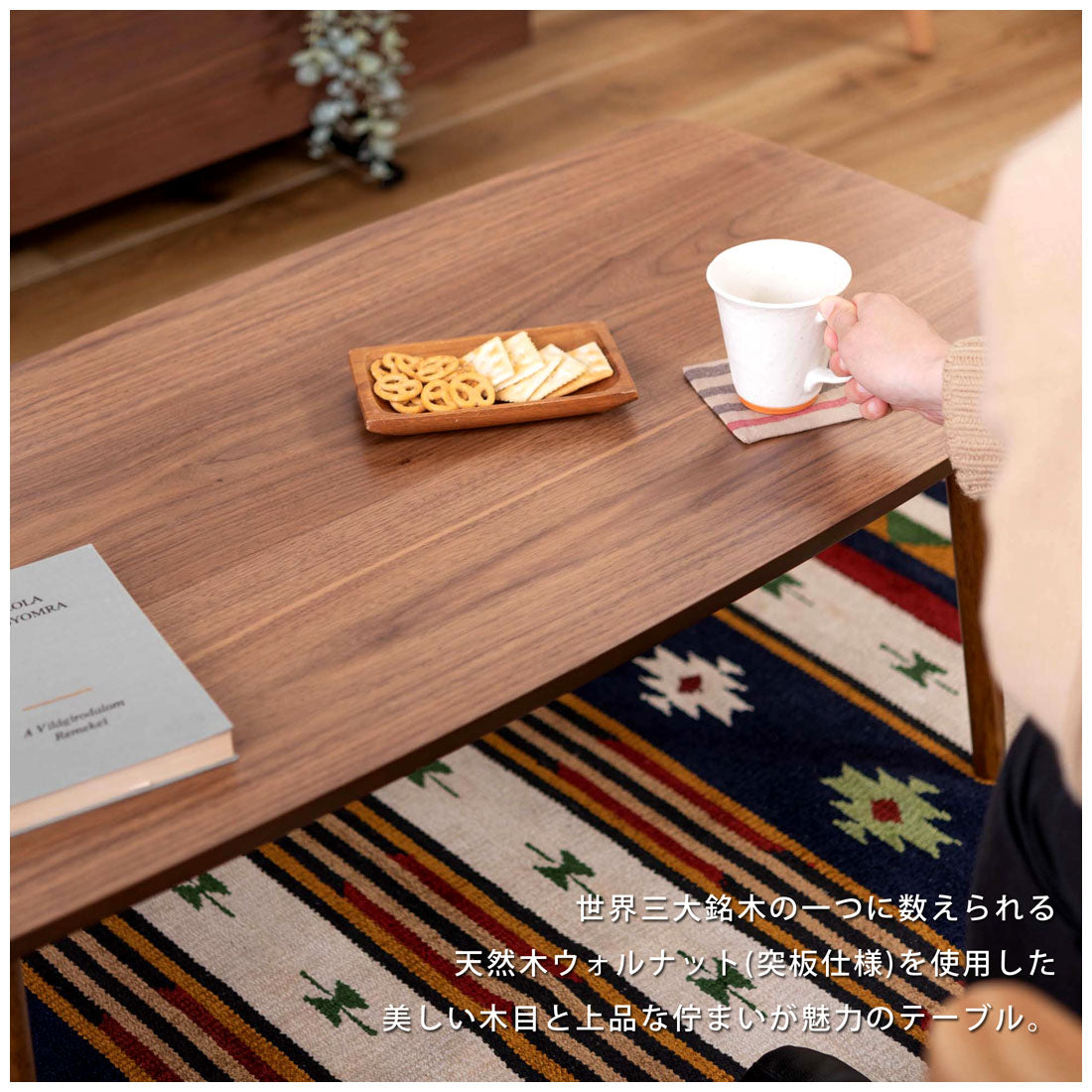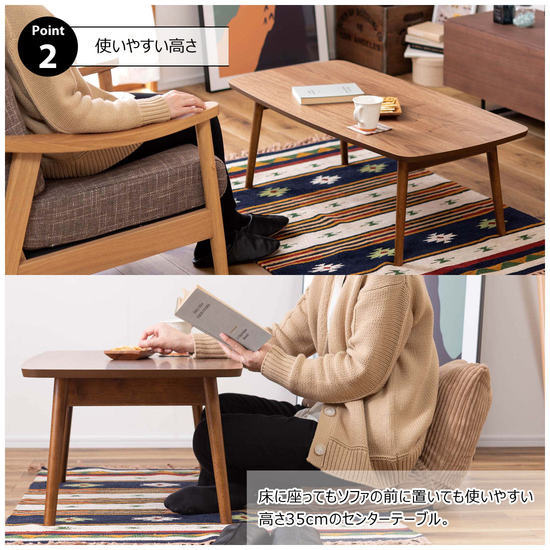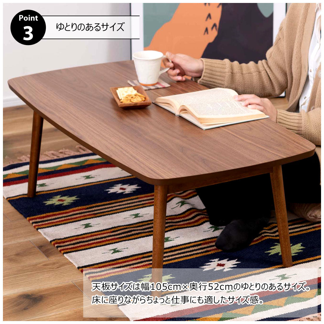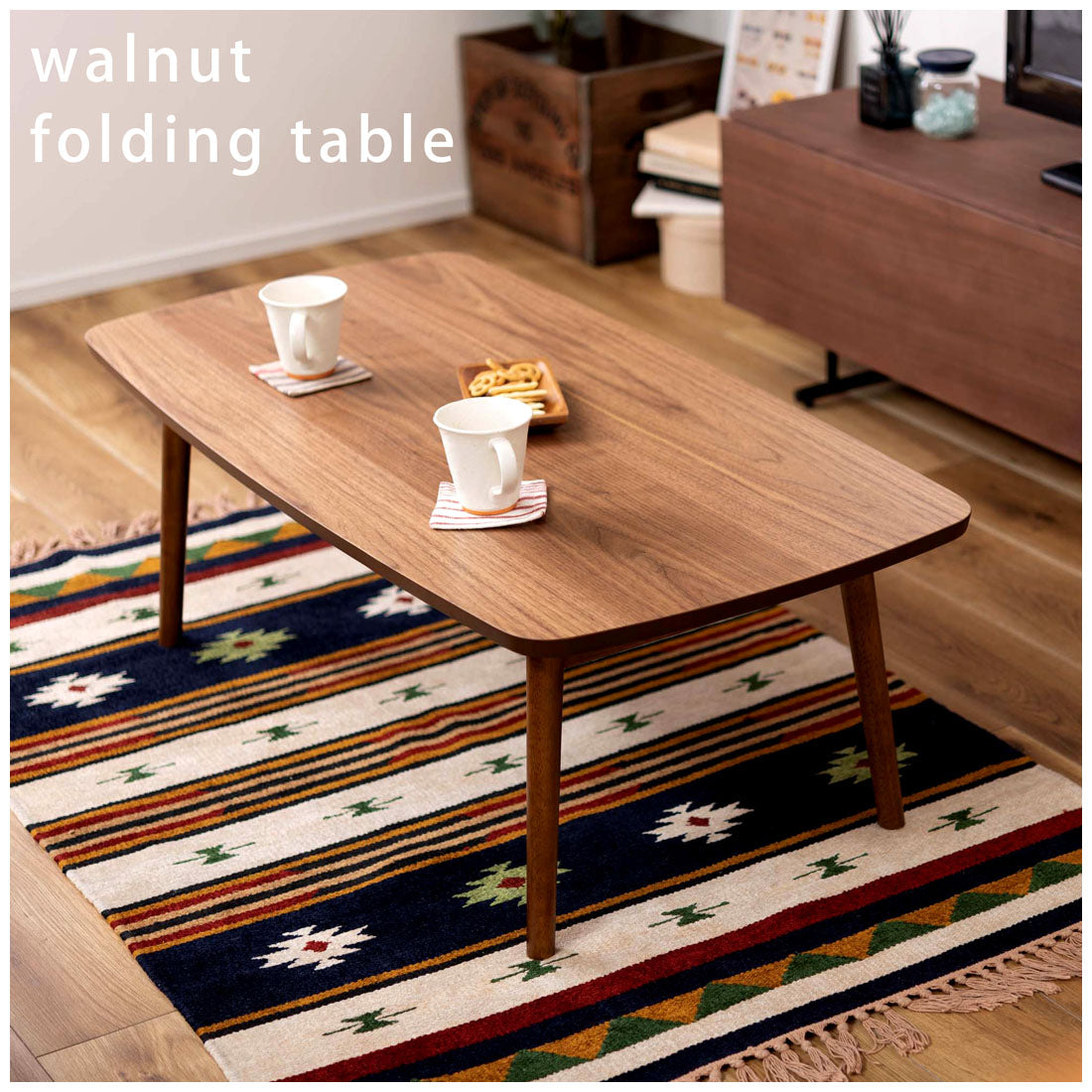 床に座っても、ソファの前に置いても使いやすい、高さ35cmのセンターテーブル。天板には世界三大銘木の一つに数えられる天然木ウォルナット(突板)を使用。美しい木目と上品な佇まいが魅力。天板サイズは幅105cm×奥行52cmのゆとりのあるサイズ。床に座りながらちょっと仕事にも適したサイズ感。簡単に脚を折りたたむ事ができるフォールディングタイプ。脚の内側に付いているレバーを操作するだけの簡単仕様。使わない時は脚を折りたためば厚さ約9cmと薄くなるので、ソファの下や隙間に収納する事もできるので便利。天板はウレタン塗装を施してあるのでお手入れ簡単。脚裏にはフェルト付き。