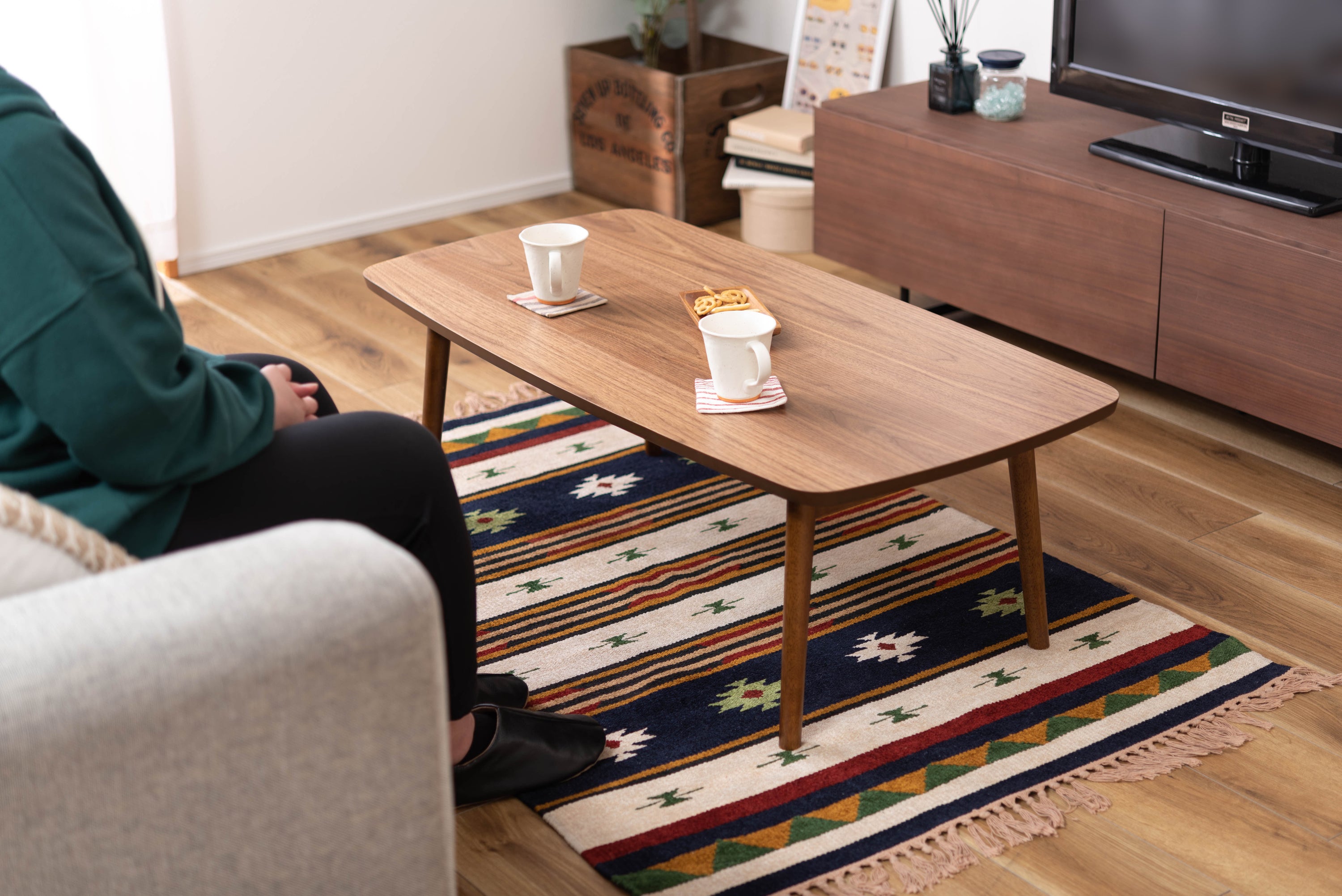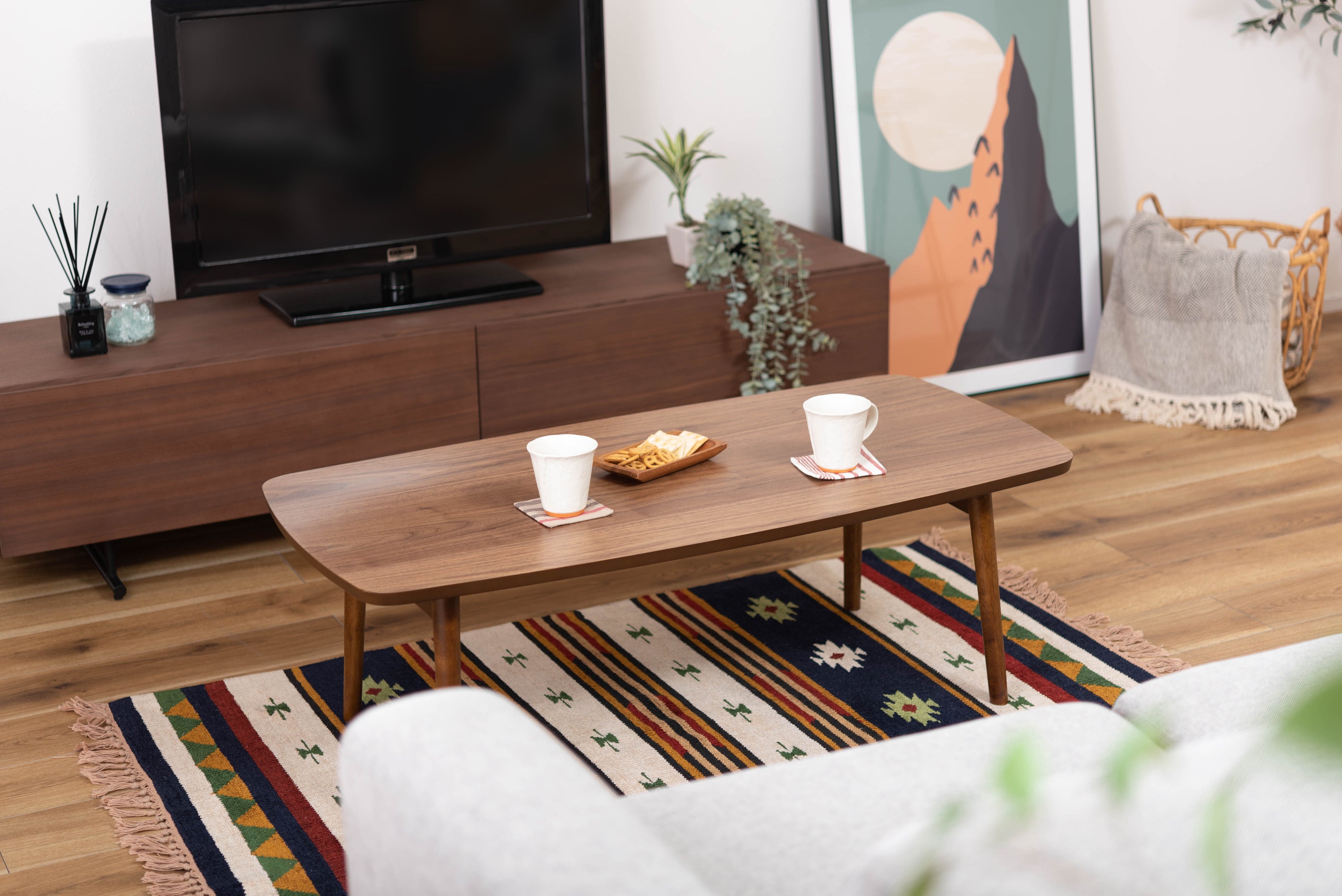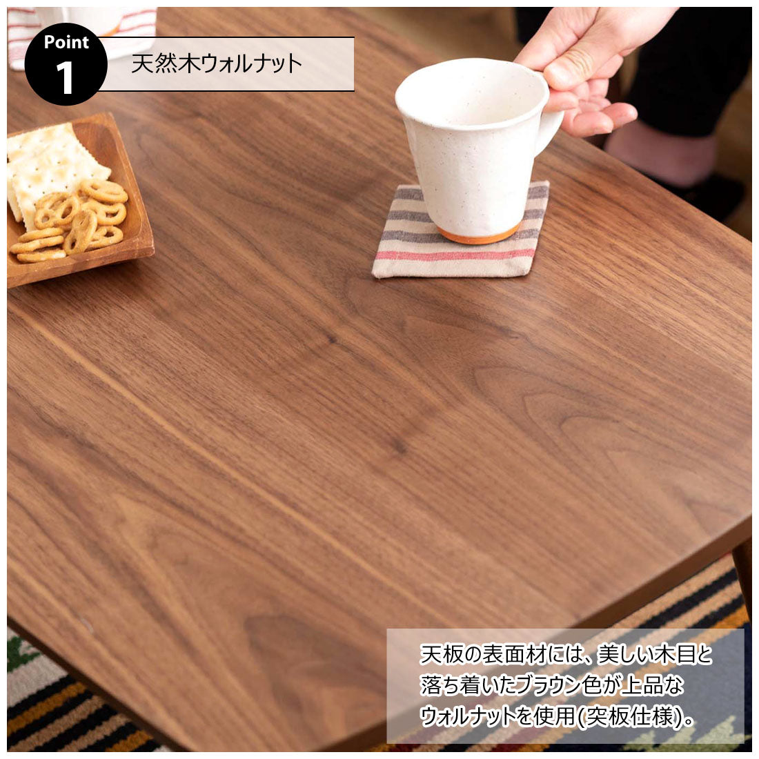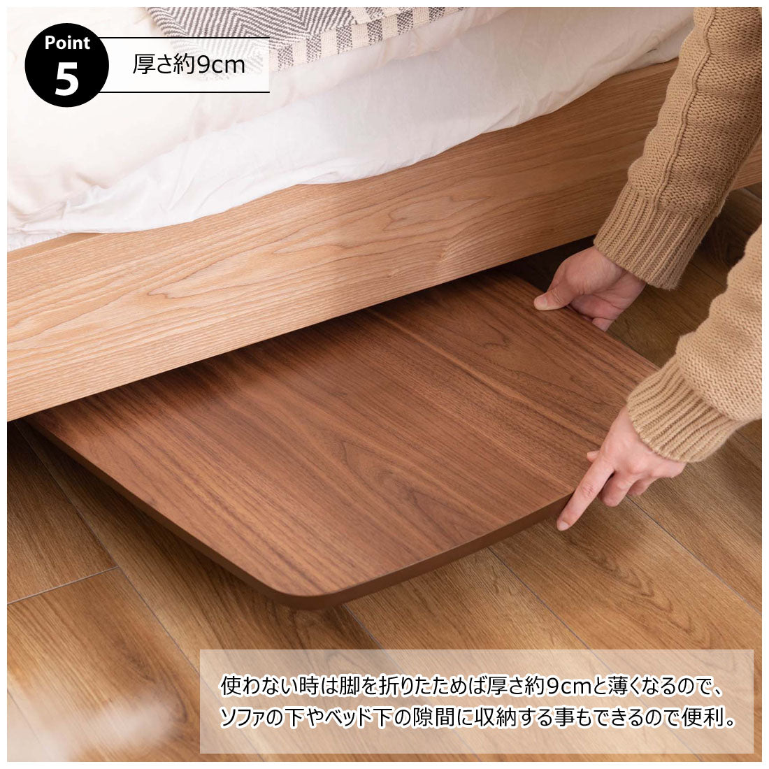 床に座っても、ソファの前に置いても使いやすい、高さ35cmのセンターテーブル。天板には世界三大銘木の一つに数えられる天然木ウォルナット(突板)を使用。美しい木目と上品な佇まいが魅力。天板サイズは幅105cm×奥行52cmのゆとりのあるサイズ。床に座りながらちょっと仕事にも適したサイズ感。簡単に脚を折りたたむ事ができるフォールディングタイプ。脚の内側に付いているレバーを操作するだけの簡単仕様。使わない時は脚を折りたためば厚さ約9cmと薄くなるので、ソファの下や隙間に収納する事もできるので便利。天板はウレタン塗装を施してあるのでお手入れ簡単。脚裏にはフェルト付き。