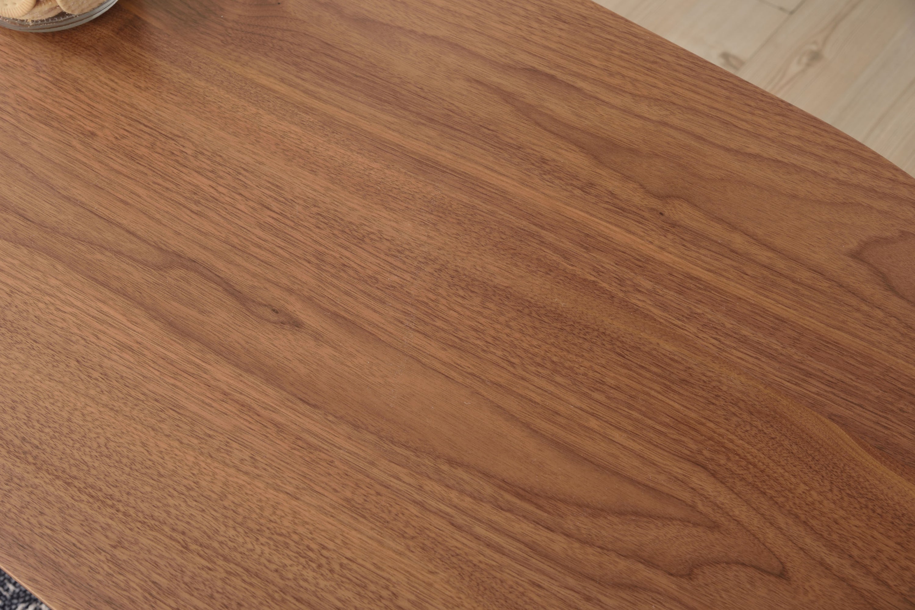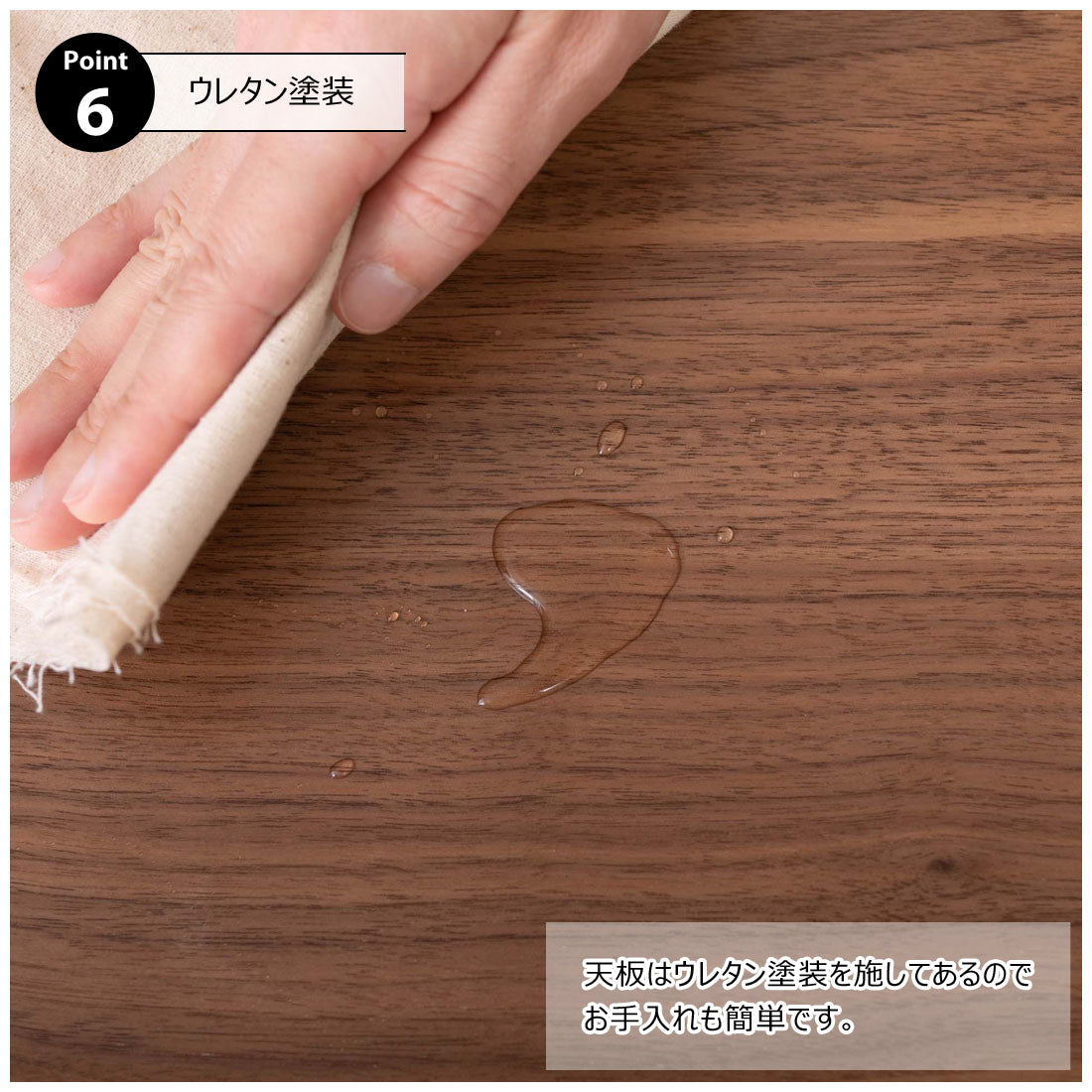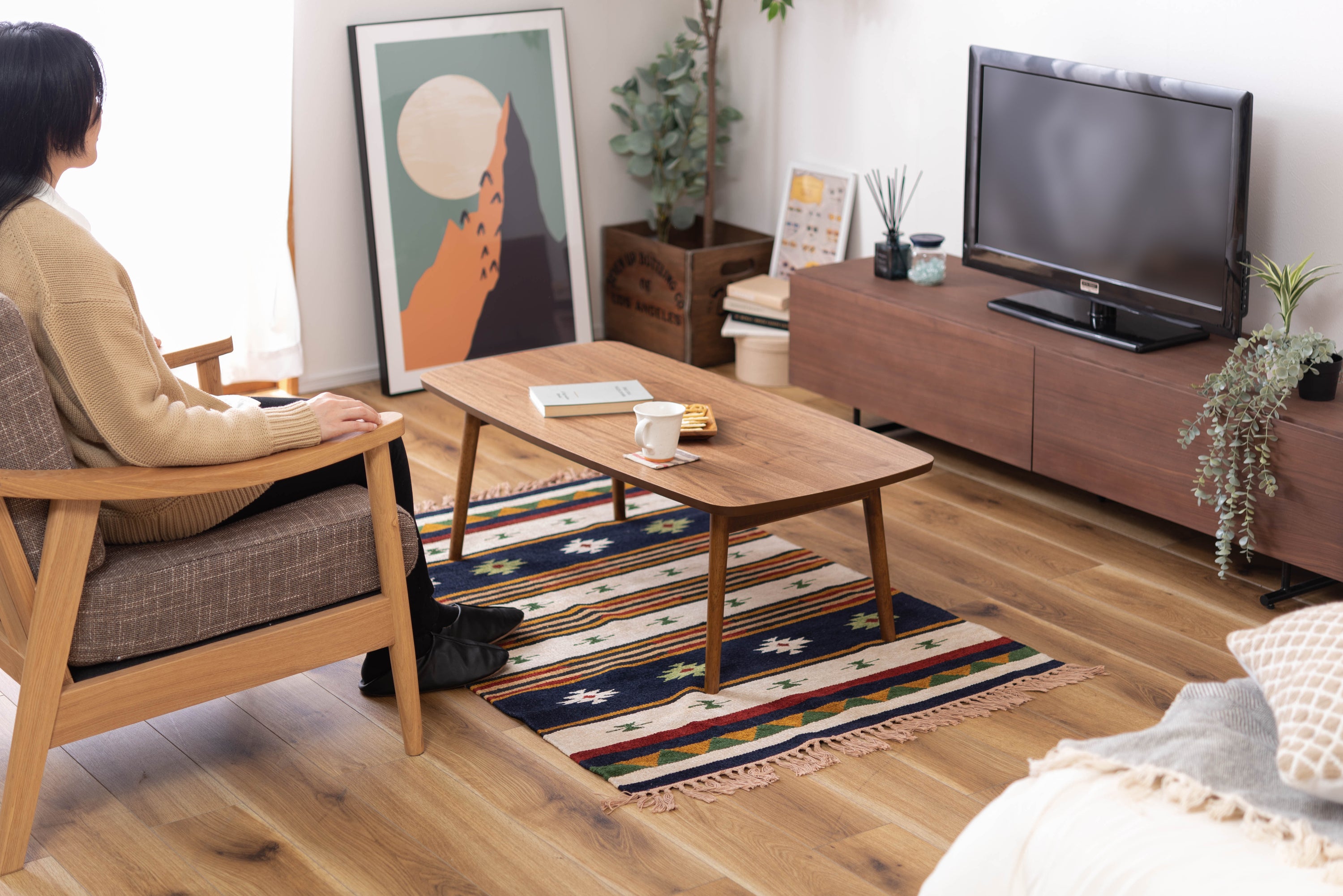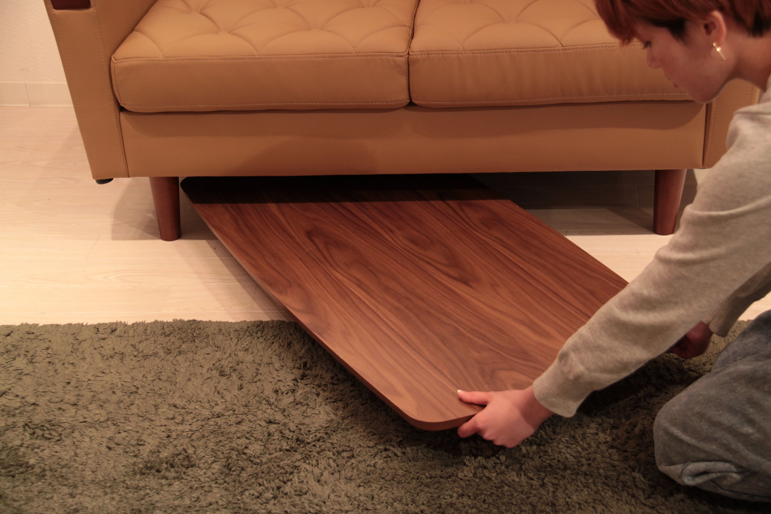 床に座っても、ソファの前に置いても使いやすい、高さ35cmのセンターテーブル。天板には世界三大銘木の一つに数えられる天然木ウォルナット(突板)を使用。美しい木目と上品な佇まいが魅力。天板サイズは幅105cm×奥行52cmのゆとりのあるサイズ。床に座りながらちょっと仕事にも適したサイズ感。簡単に脚を折りたたむ事ができるフォールディングタイプ。脚の内側に付いているレバーを操作するだけの簡単仕様。使わない時は脚を折りたためば厚さ約9cmと薄くなるので、ソファの下や隙間に収納する事もできるので便利。天板はウレタン塗装を施してあるのでお手入れ簡単。脚裏にはフェルト付き。