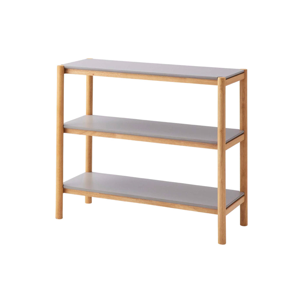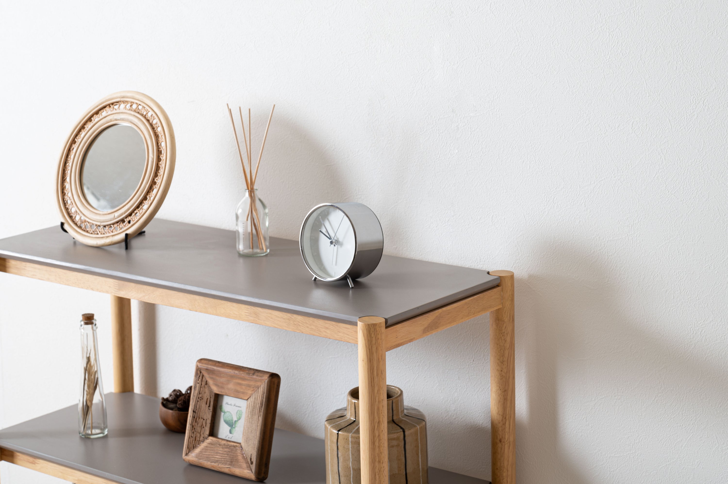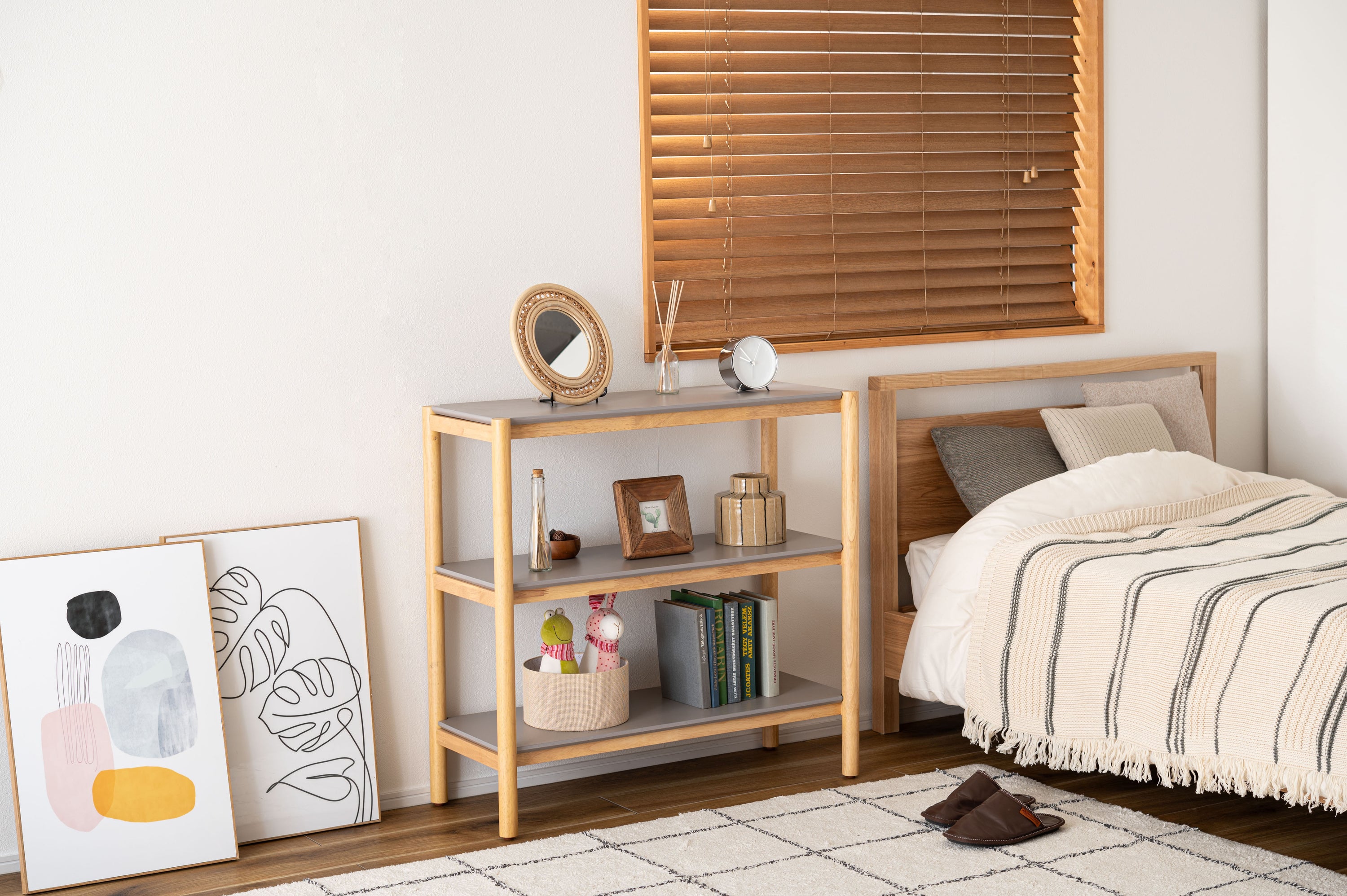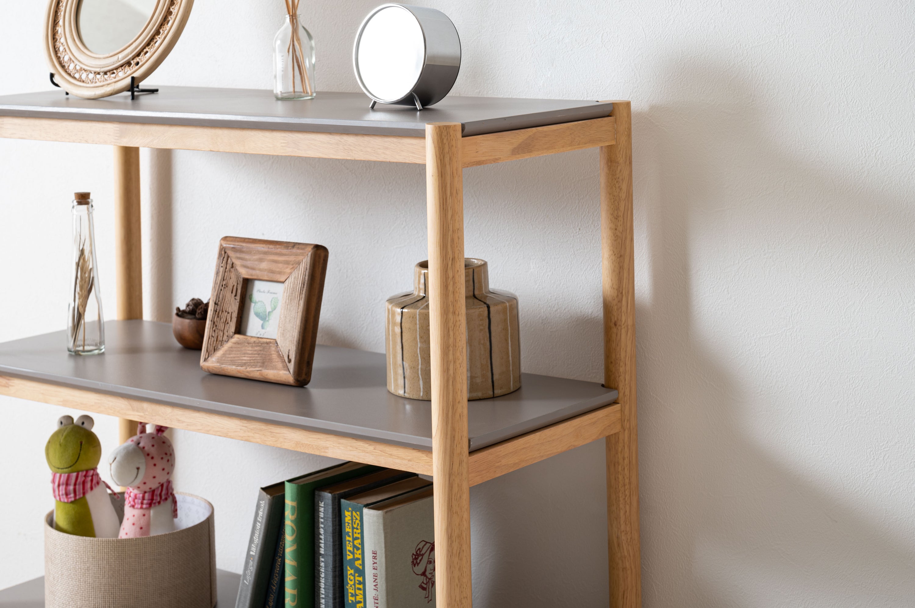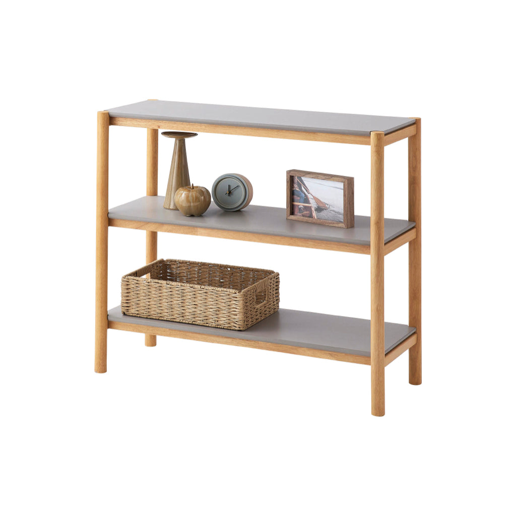 ナチュラル×グレーのやさしい配色が印象的なシェルフ。木目を活かしたナチュラルなフレーム部分と、絶妙なくすみグレーの棚板のコントラストがやさしい印象を与えてくれるシェルフです。オープンタイプでディスプレイの幅も広がります。印象的な配色デザイン。汚れもサッと拭き取れてお手入れ簡単。簡単組み立て。がたつきを抑えるアジャスター付き
