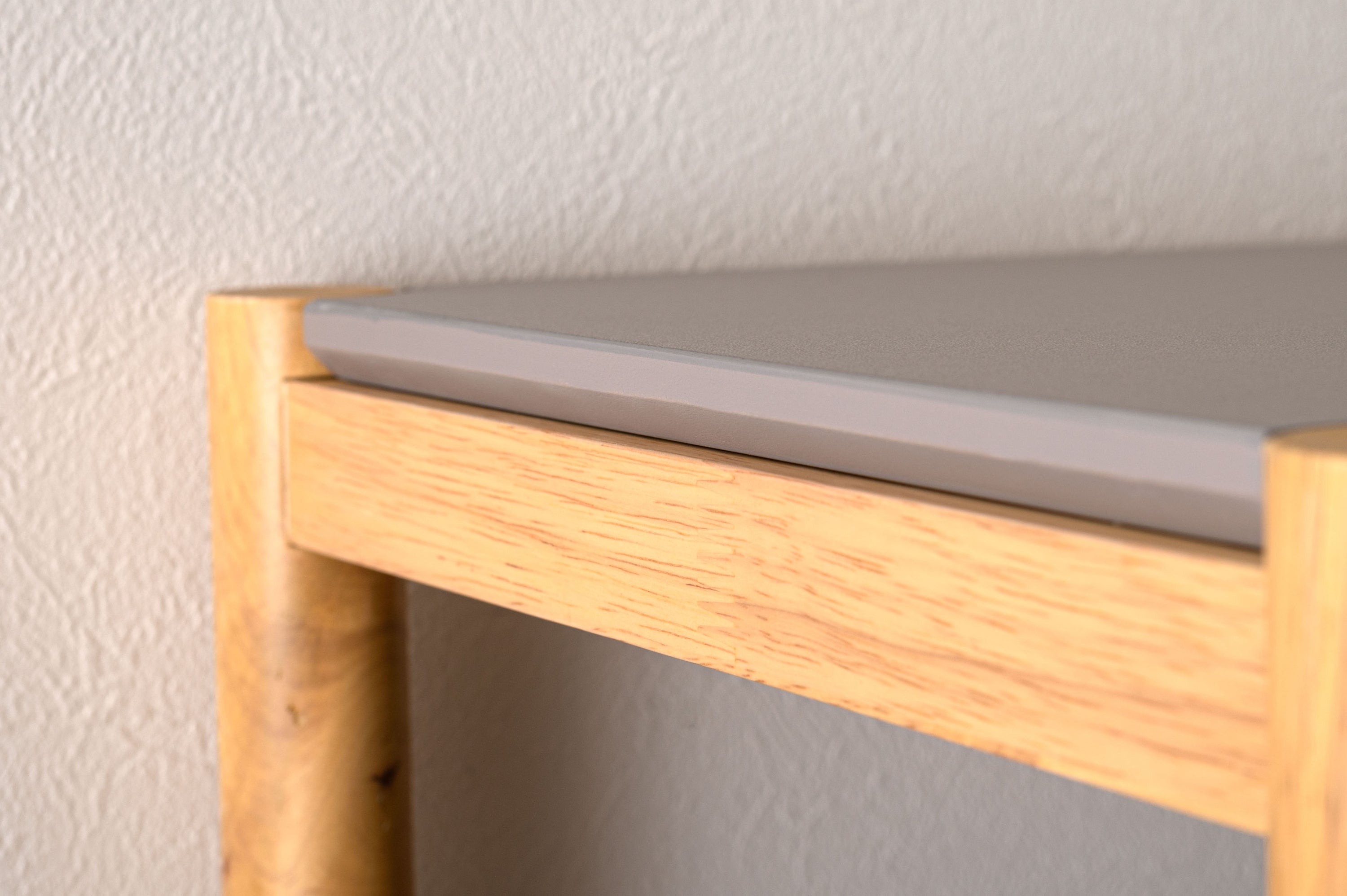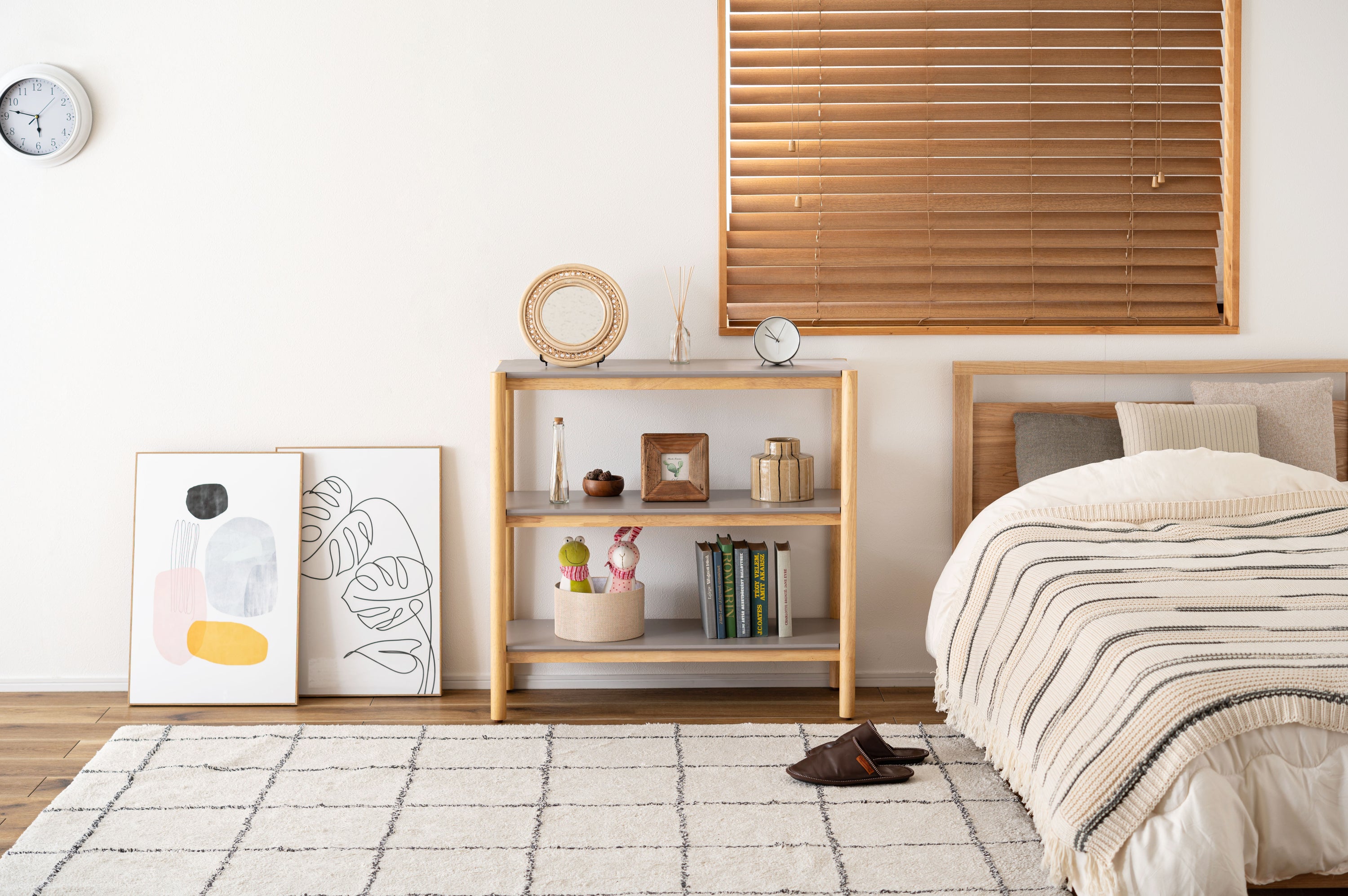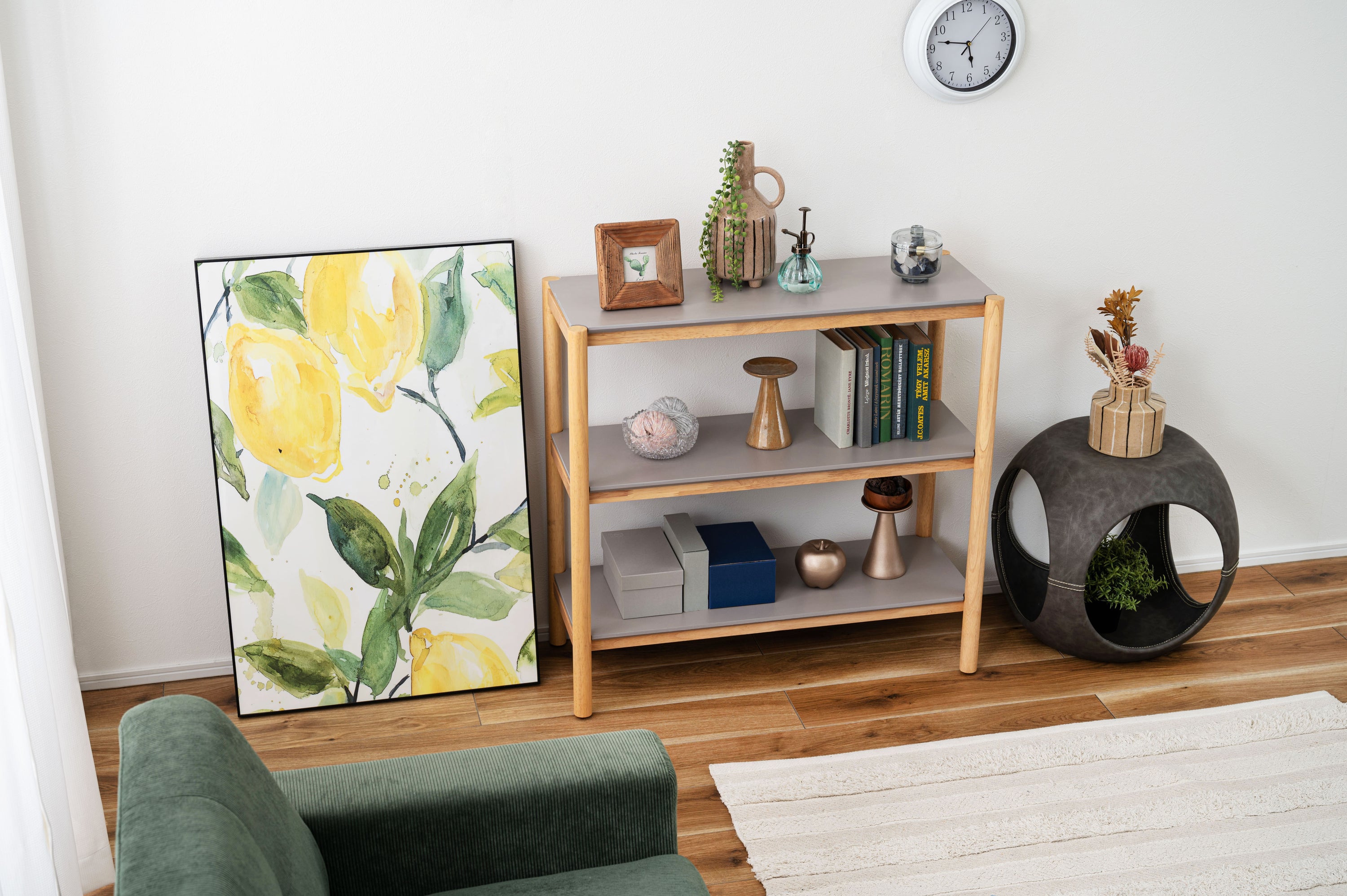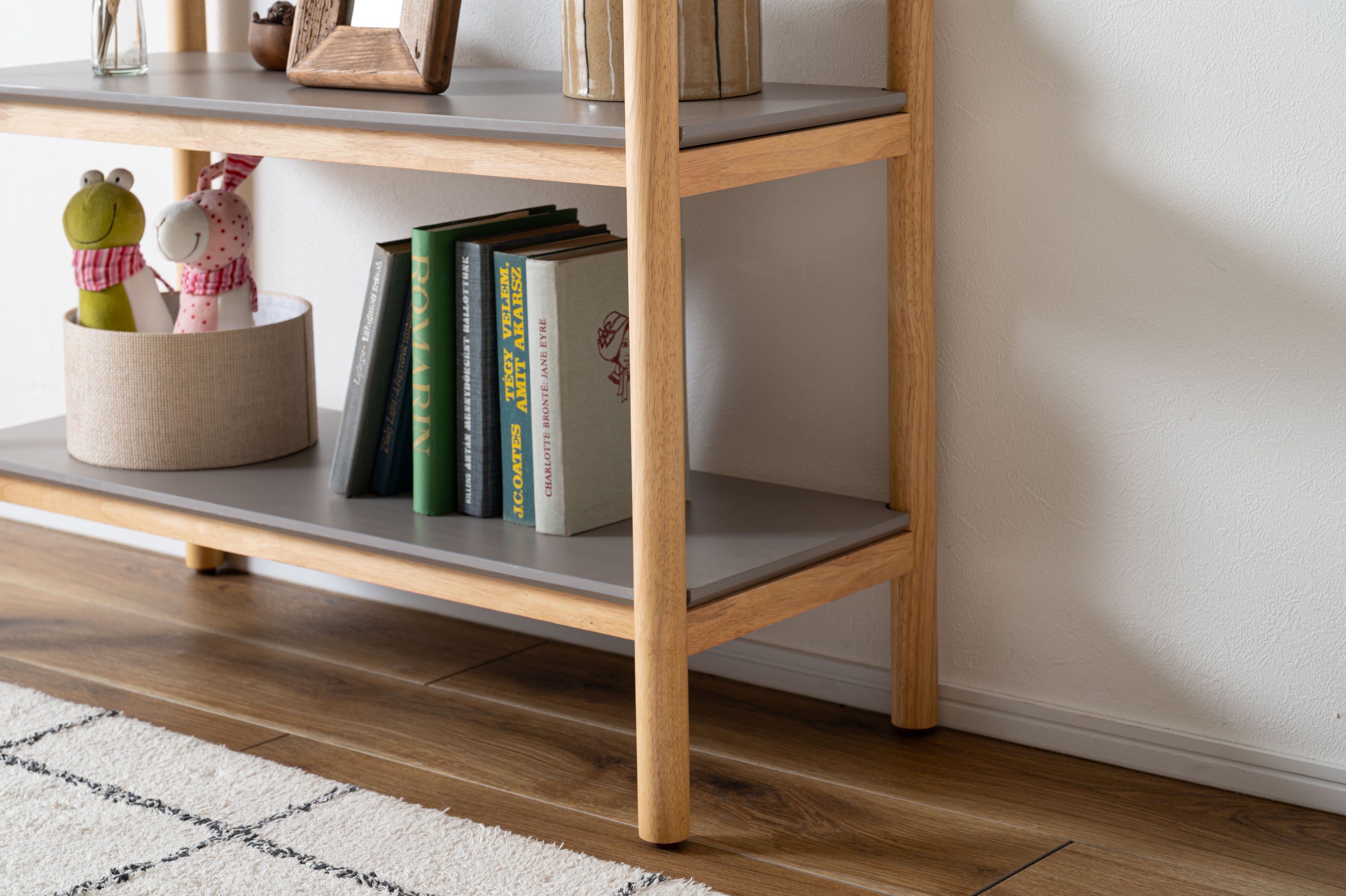 ナチュラル×グレーのやさしい配色が印象的なシェルフ。木目を活かしたナチュラルなフレーム部分と、絶妙なくすみグレーの棚板のコントラストがやさしい印象を与えてくれるシェルフです。オープンタイプでディスプレイの幅も広がります。印象的な配色デザイン。汚れもサッと拭き取れてお手入れ簡単。簡単組み立て。がたつきを抑えるアジャスター付き