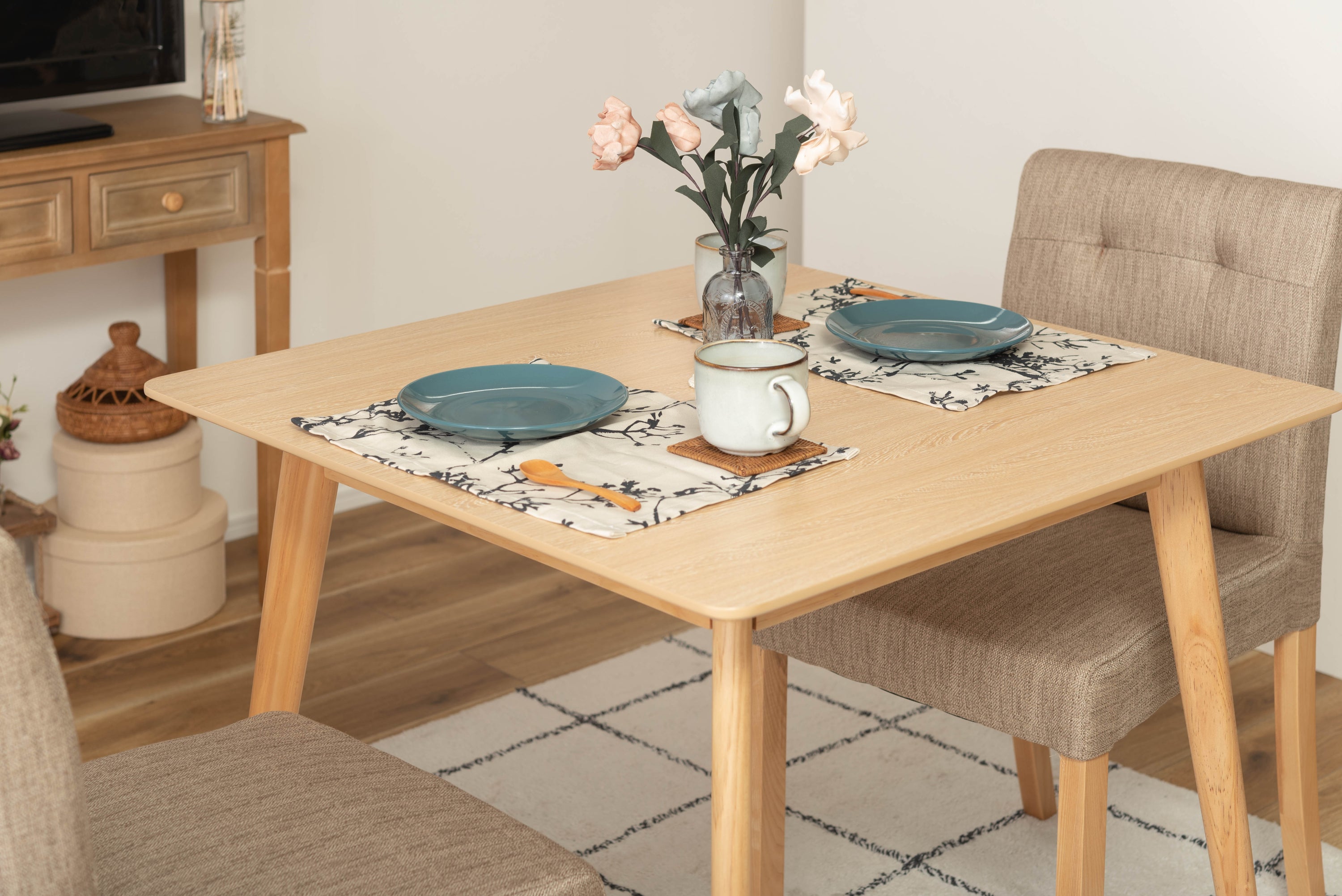 どんなインテリアにも合わせやすい、シンプルなスクエアテーブル。省スペース向けのサイズながら、2人使いでもゆったりと食事ができる80角サイズ。北欧風テイストの脚がハの字に広がるスッキリとしてデザインなので、どんな種類のチェアとも組み合わせやすいテーブル。天板下の幕板は天板の反り止めや脚のグラつきを最大限抑え、テーブル全体に安定感を持たせてくれます。ホワイト・ナチュラルどちらも、天板の表面は凹凸のない木目調仕上げ。小口部分はデザイン性の高い船底形状。シャープですっきりとした印象なので、木製チェアからスチール素材を使ったチェアまで幅広く合わせられます。脚裏にはフェルトが付いているので、床への傷防止にもなり安心です。