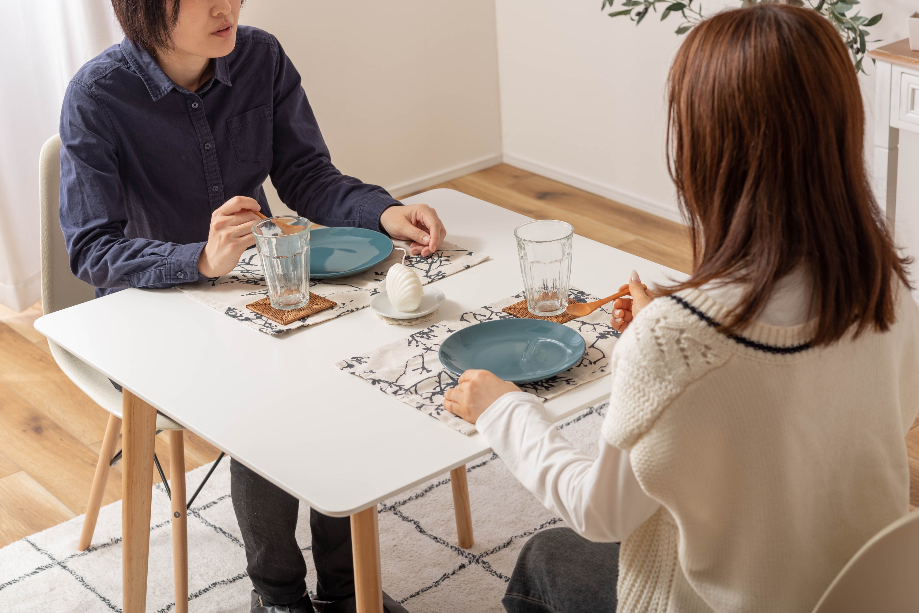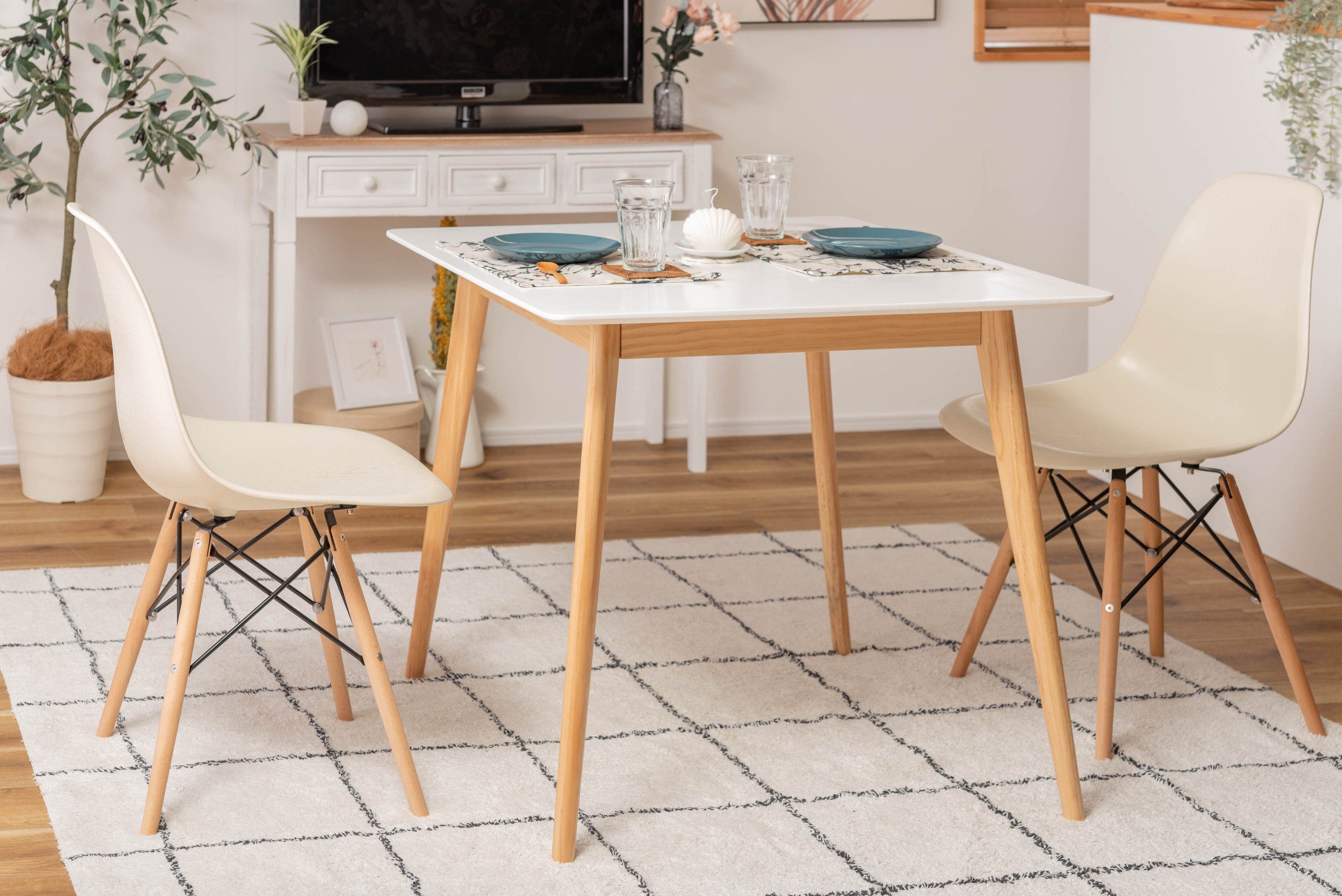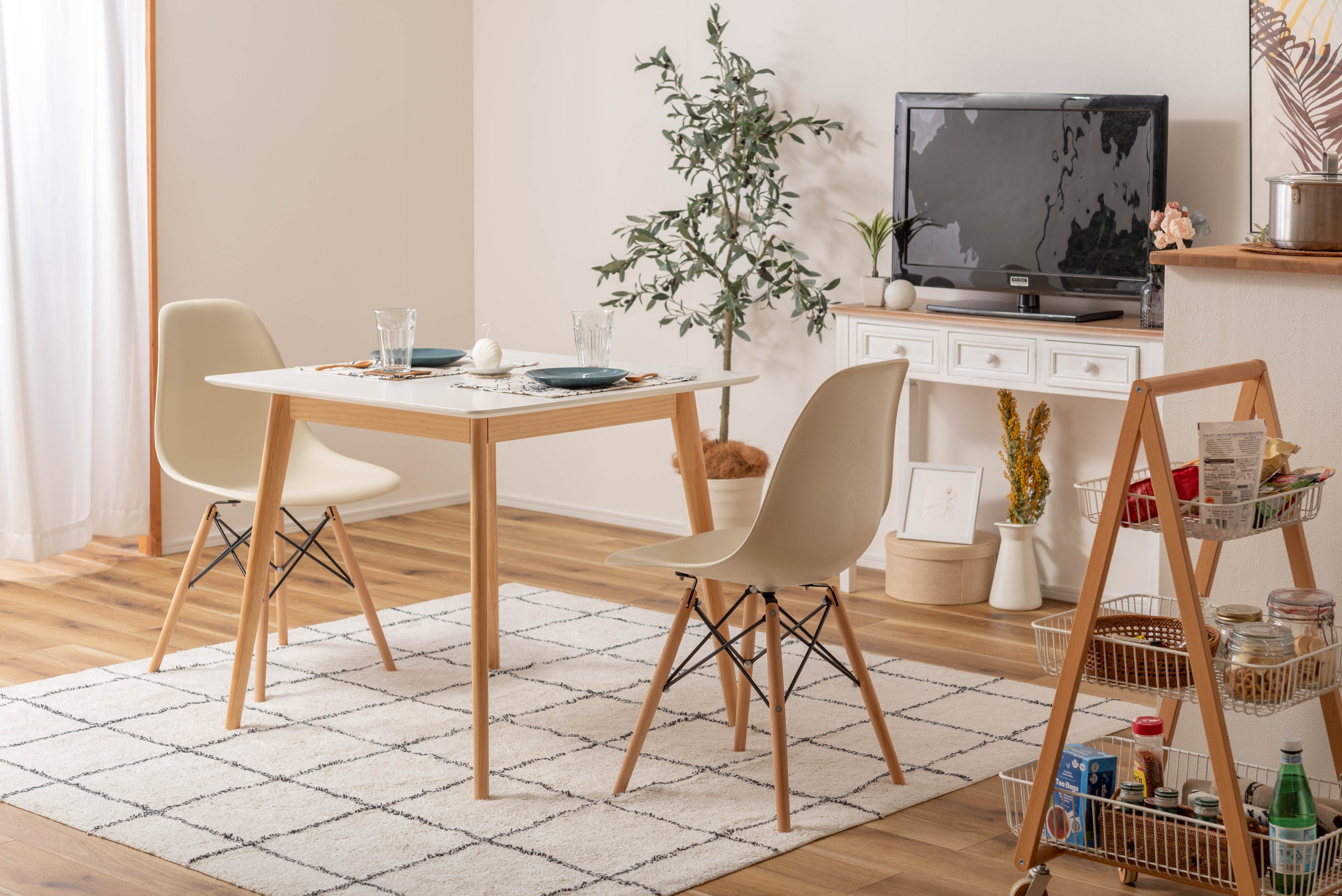 どんなインテリアにも合わせやすい、シンプルなスクエアテーブル。省スペース向けのサイズながら、2人使いでもゆったりと食事ができる80角サイズ。北欧風テイストの脚がハの字に広がるスッキリとしてデザインなので、どんな種類のチェアとも組み合わせやすいテーブル。天板下の幕板は天板の反り止めや脚のグラつきを最大限抑え、テーブル全体に安定感を持たせてくれます。ホワイト・ナチュラルどちらも、天板の表面は凹凸のない木目調仕上げ。小口部分はデザイン性の高い船底形状。シャープですっきりとした印象なので、木製チェアからスチール素材を使ったチェアまで幅広く合わせられます。脚裏にはフェルトが付いているので、床への傷防止にもなり安心です。