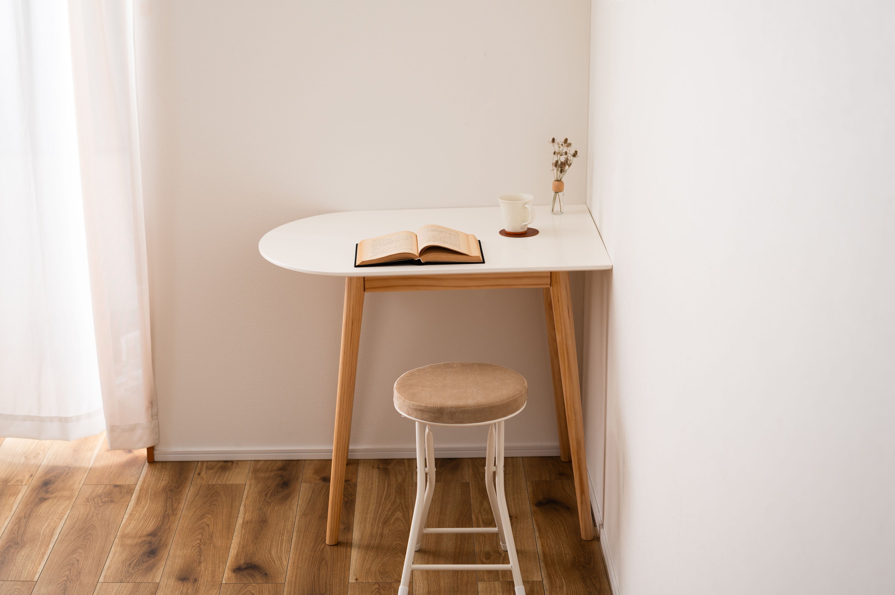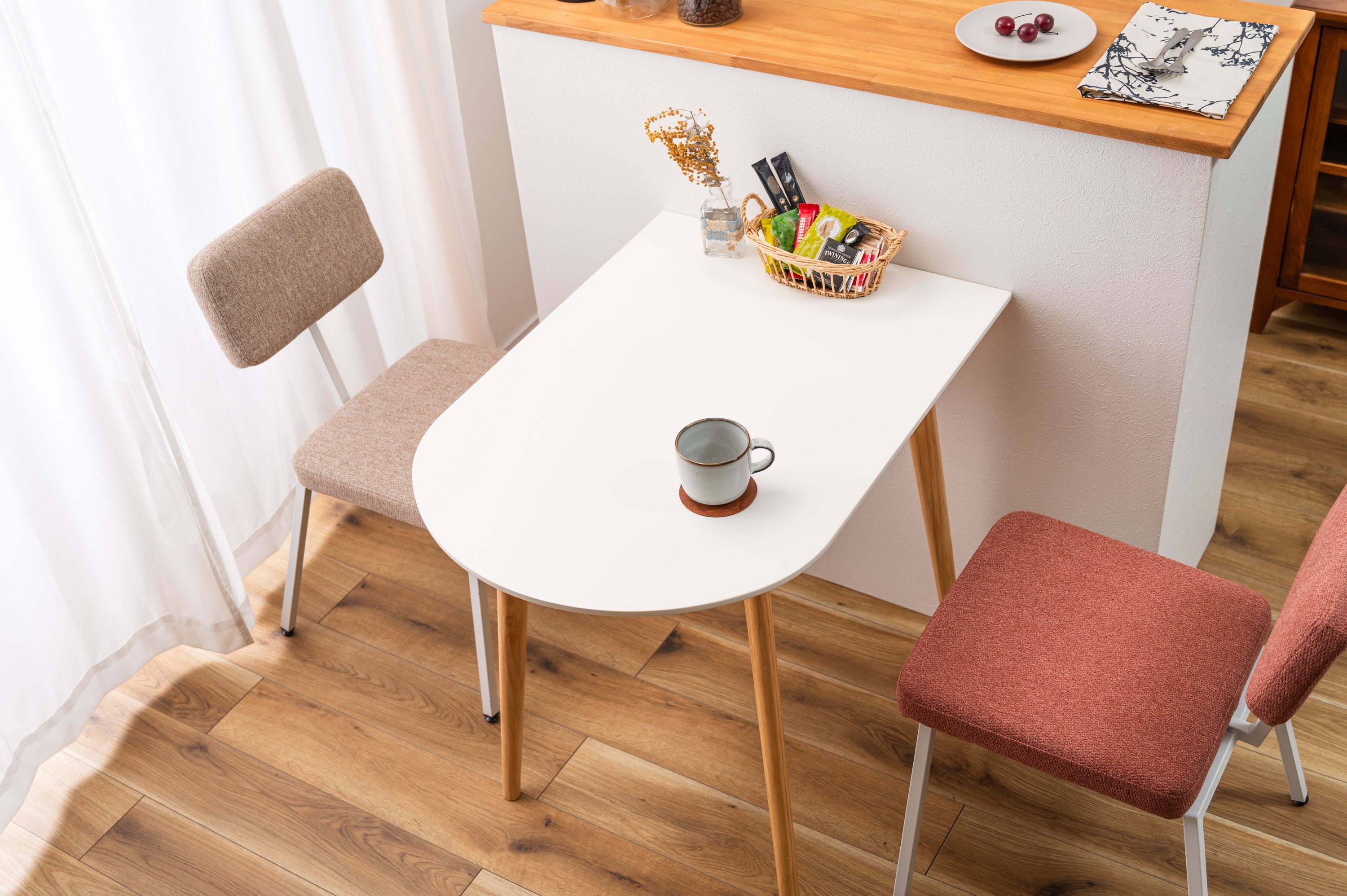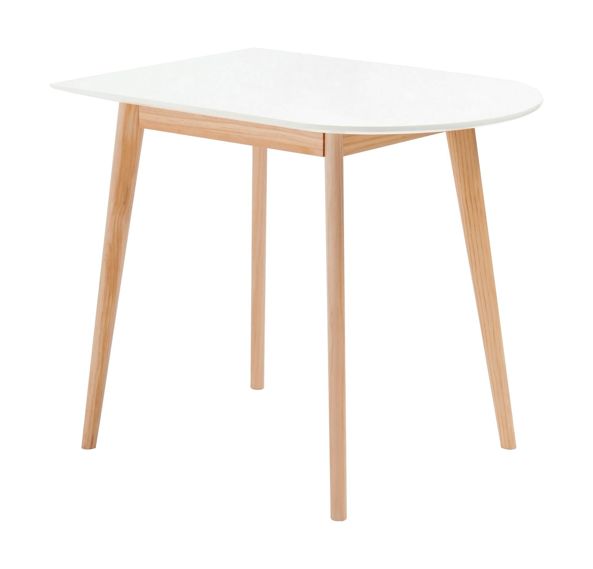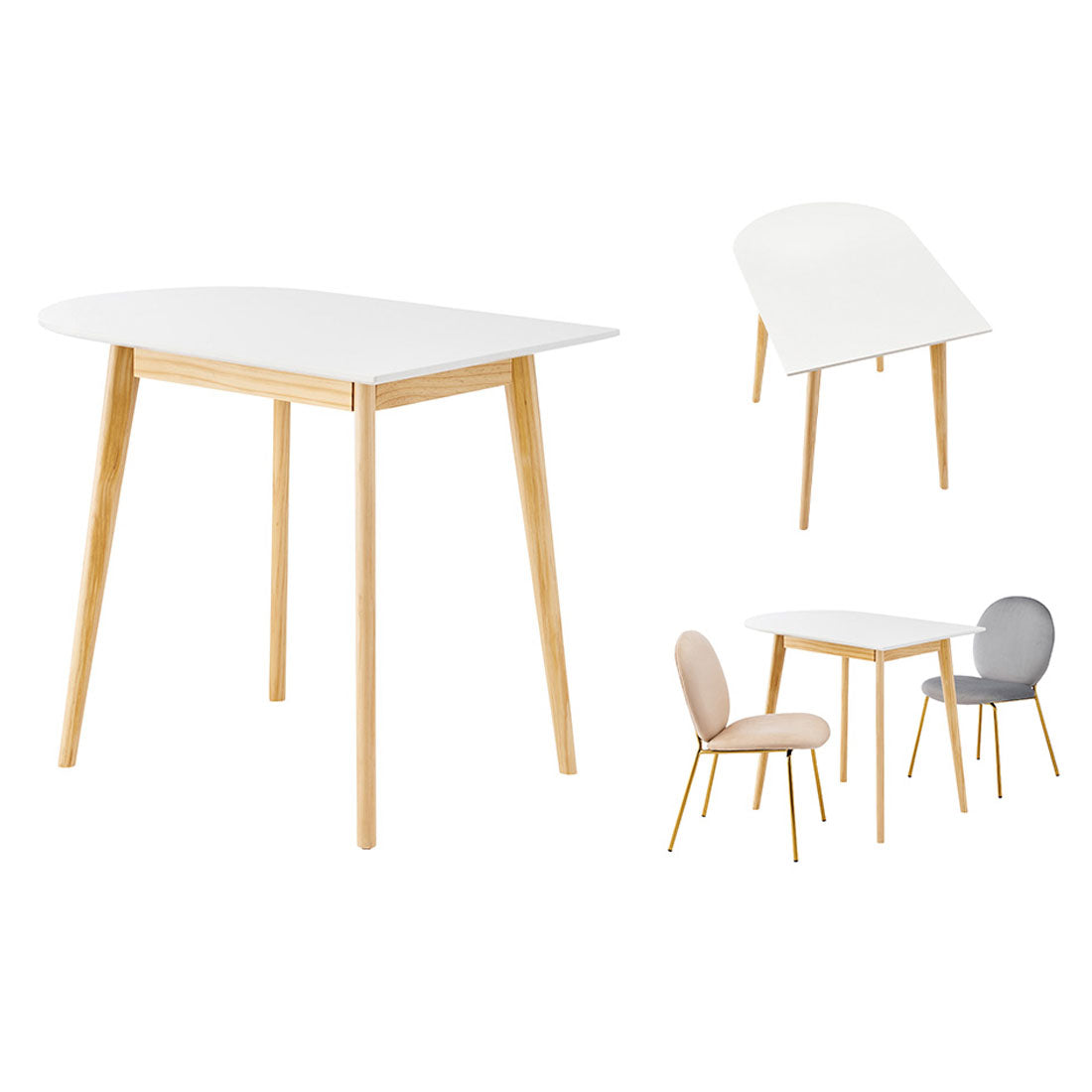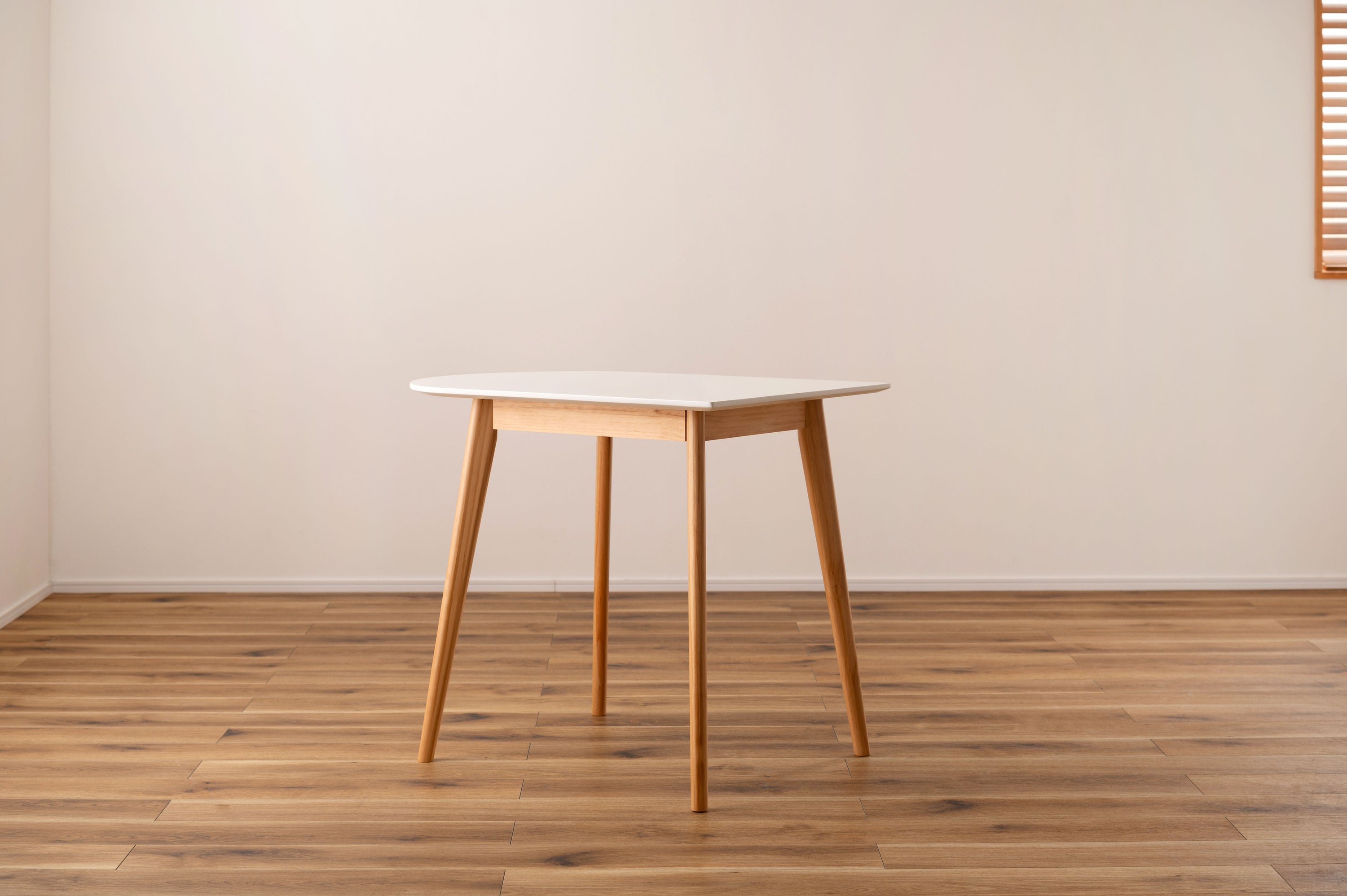 壁付けも出来る、ミニマルなデザインのダイニングテーブル。 壁面やお部屋の角にレイアウトする事が出来る為、限られたスペースを有効活用しながらお部屋を広く使えます。 一辺に曲線を取り入れたやさしいフォルムで、凹凸のない滑らかなホワイト天板と、天然木の脚の組み合わせが可愛らしさを演出してくれます。