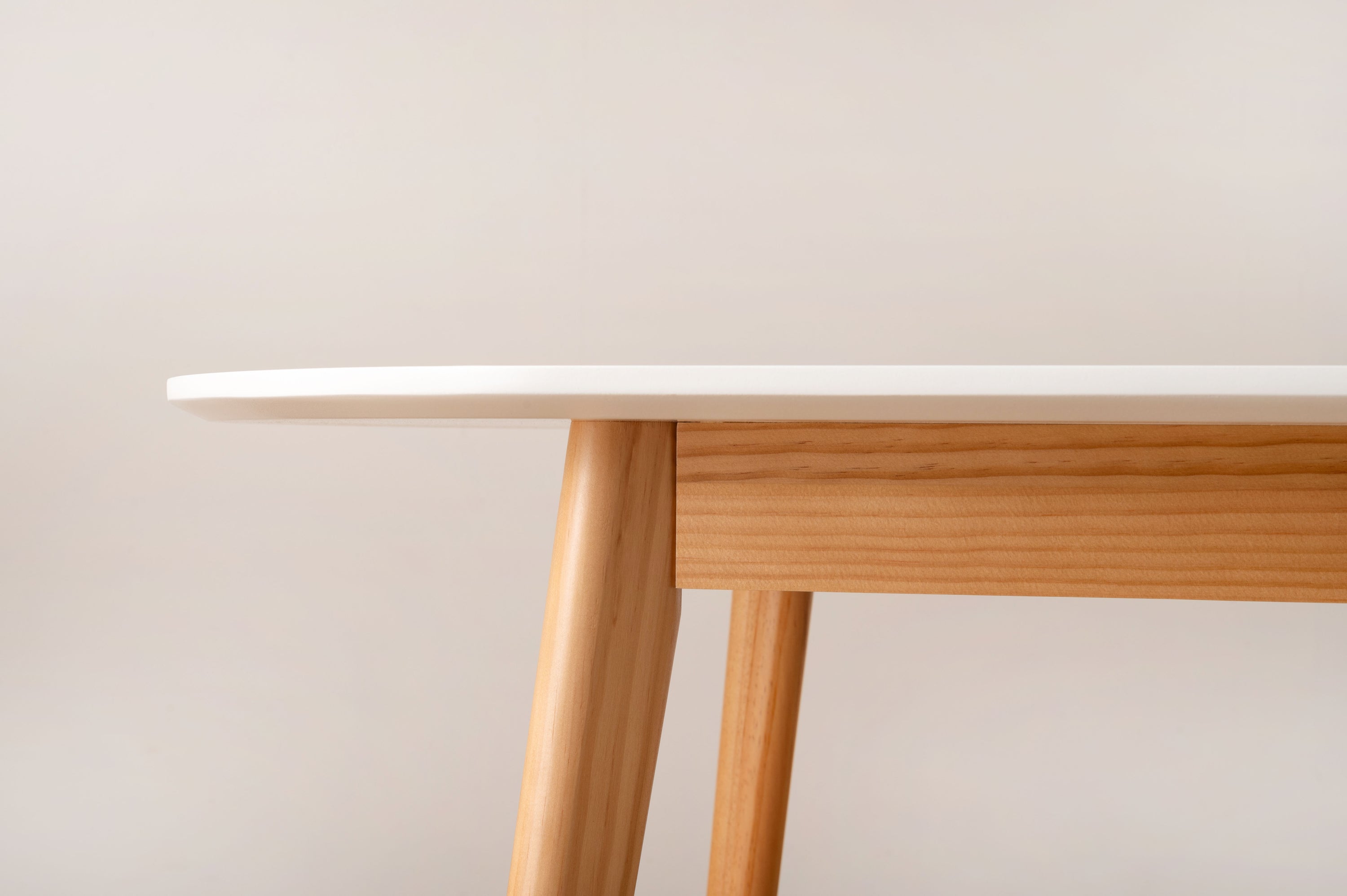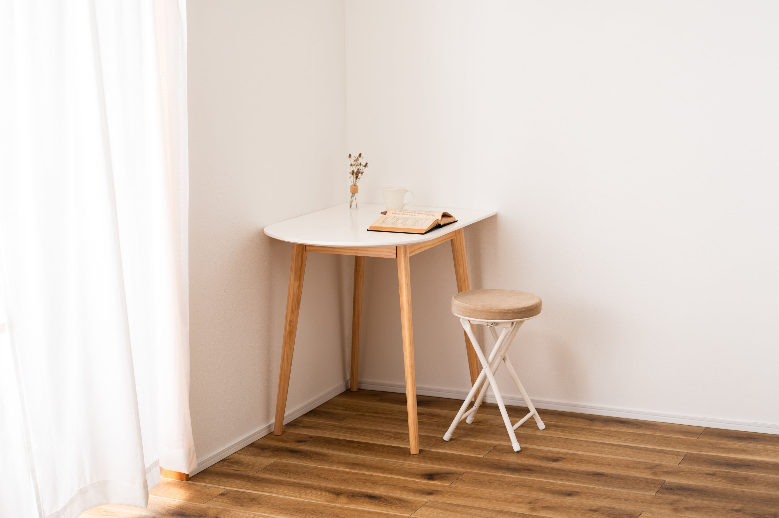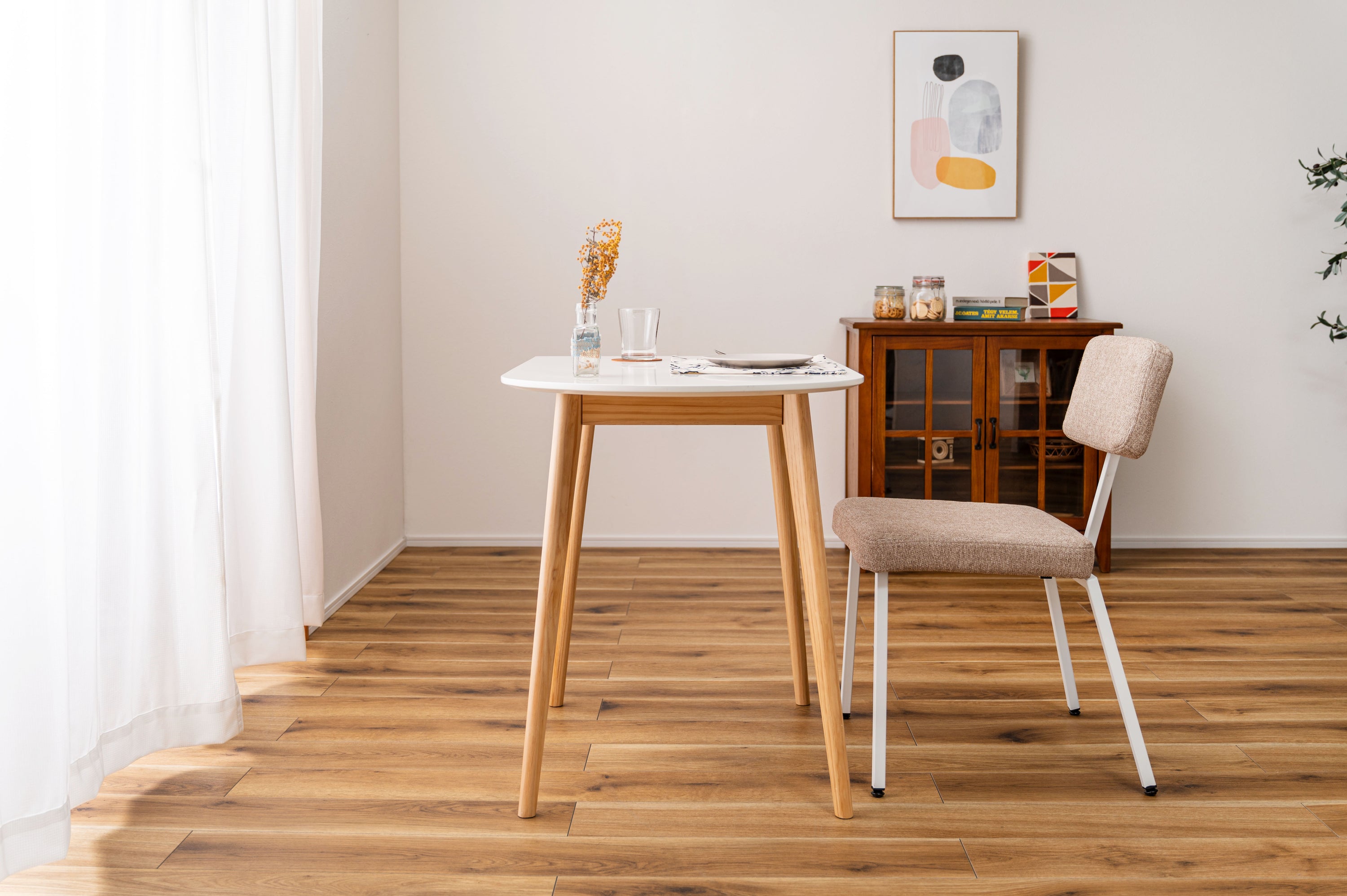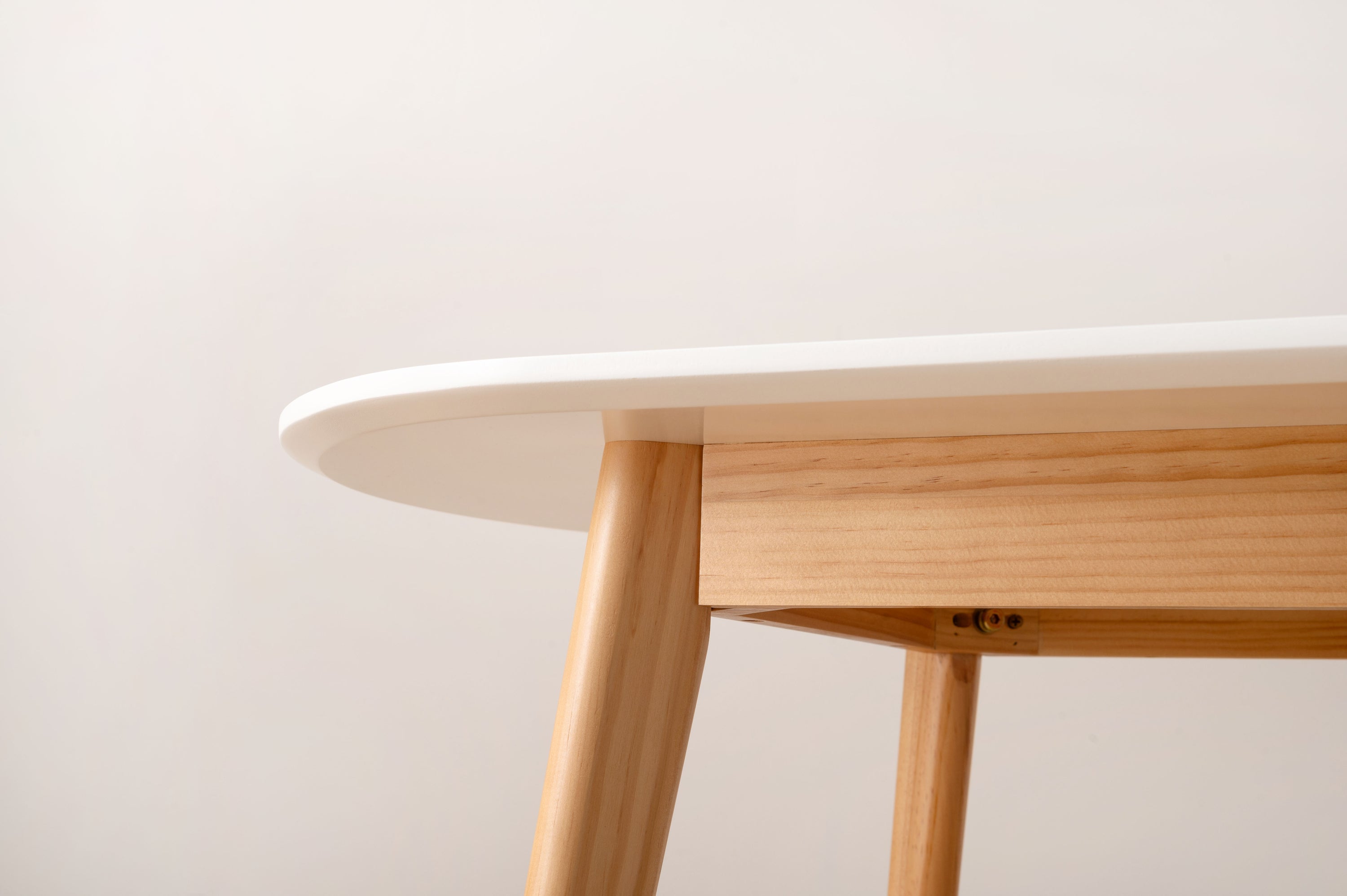 壁付けも出来る、ミニマルなデザインのダイニングテーブル。 壁面やお部屋の角にレイアウトする事が出来る為、限られたスペースを有効活用しながらお部屋を広く使えます。 一辺に曲線を取り入れたやさしいフォルムで、凹凸のない滑らかなホワイト天板と、天然木の脚の組み合わせが可愛らしさを演出してくれます。