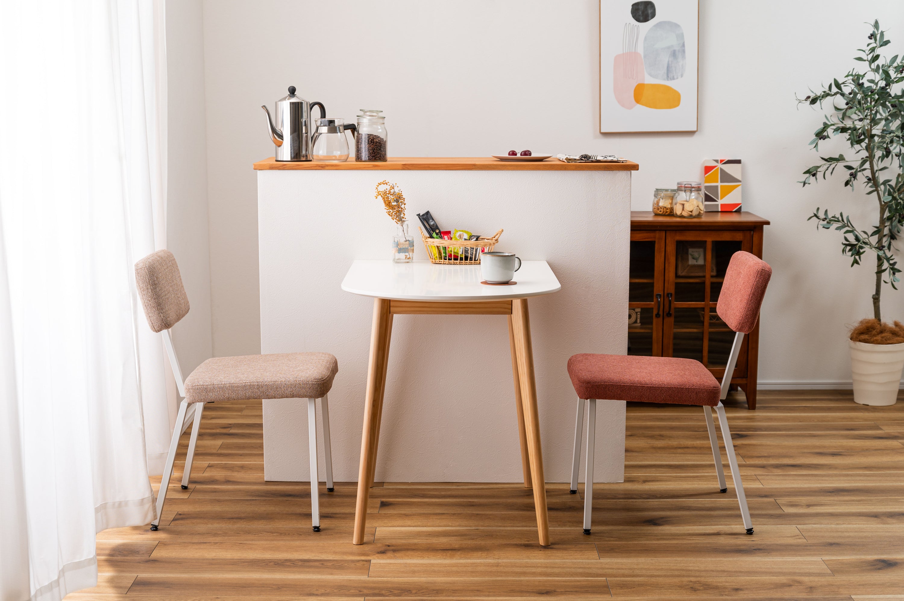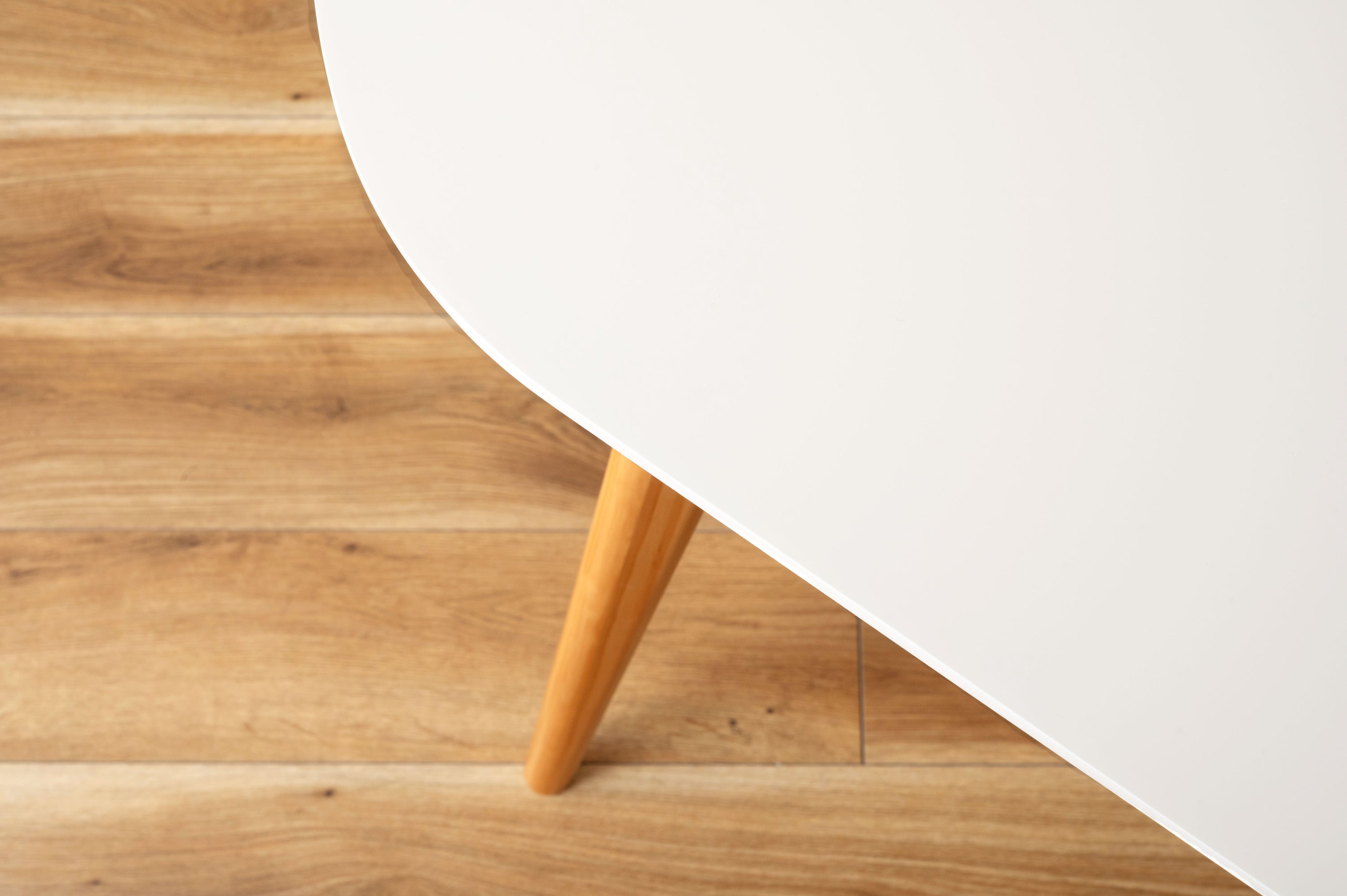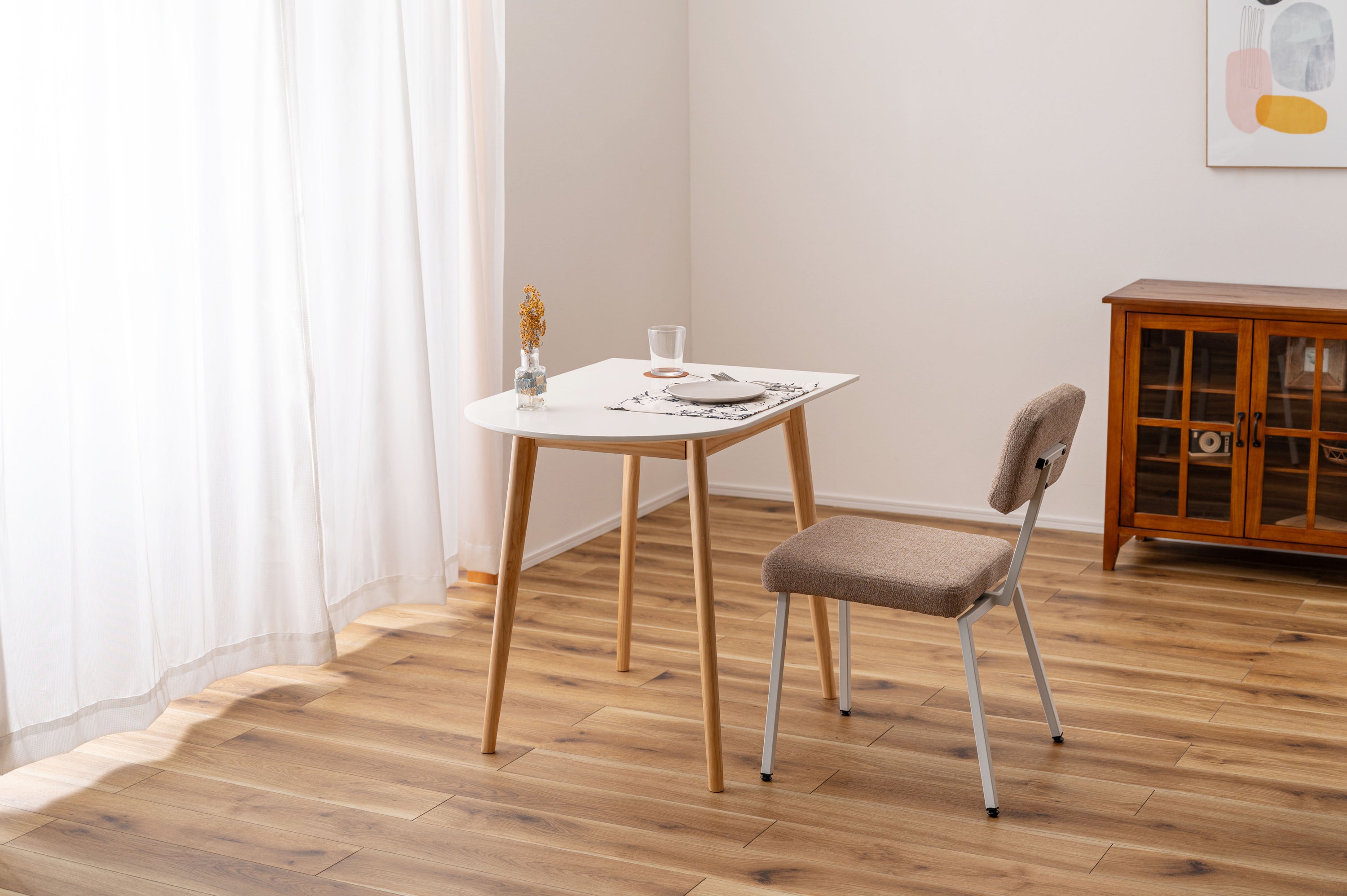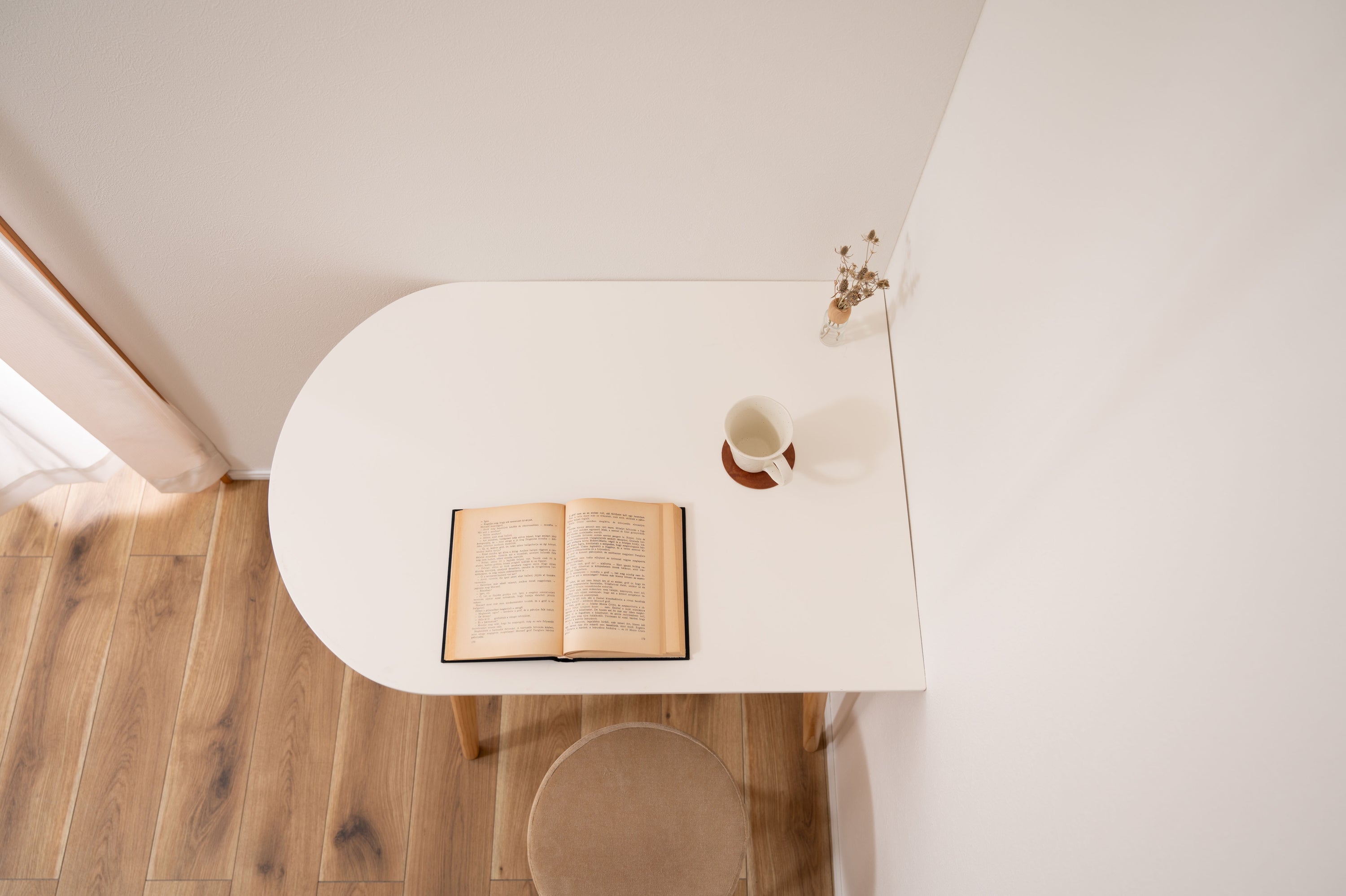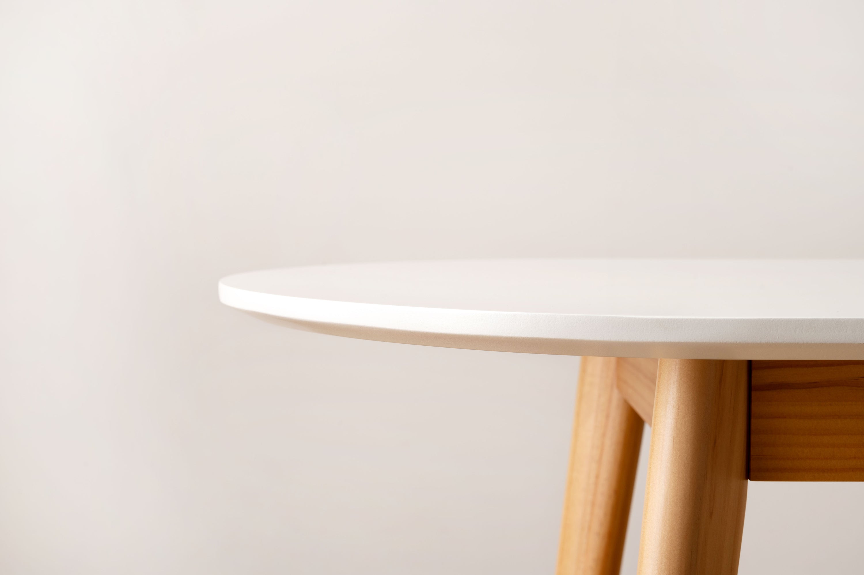 壁付けも出来る、ミニマルなデザインのダイニングテーブル。 壁面やお部屋の角にレイアウトする事が出来る為、限られたスペースを有効活用しながらお部屋を広く使えます。 一辺に曲線を取り入れたやさしいフォルムで、凹凸のない滑らかなホワイト天板と、天然木の脚の組み合わせが可愛らしさを演出してくれます。
