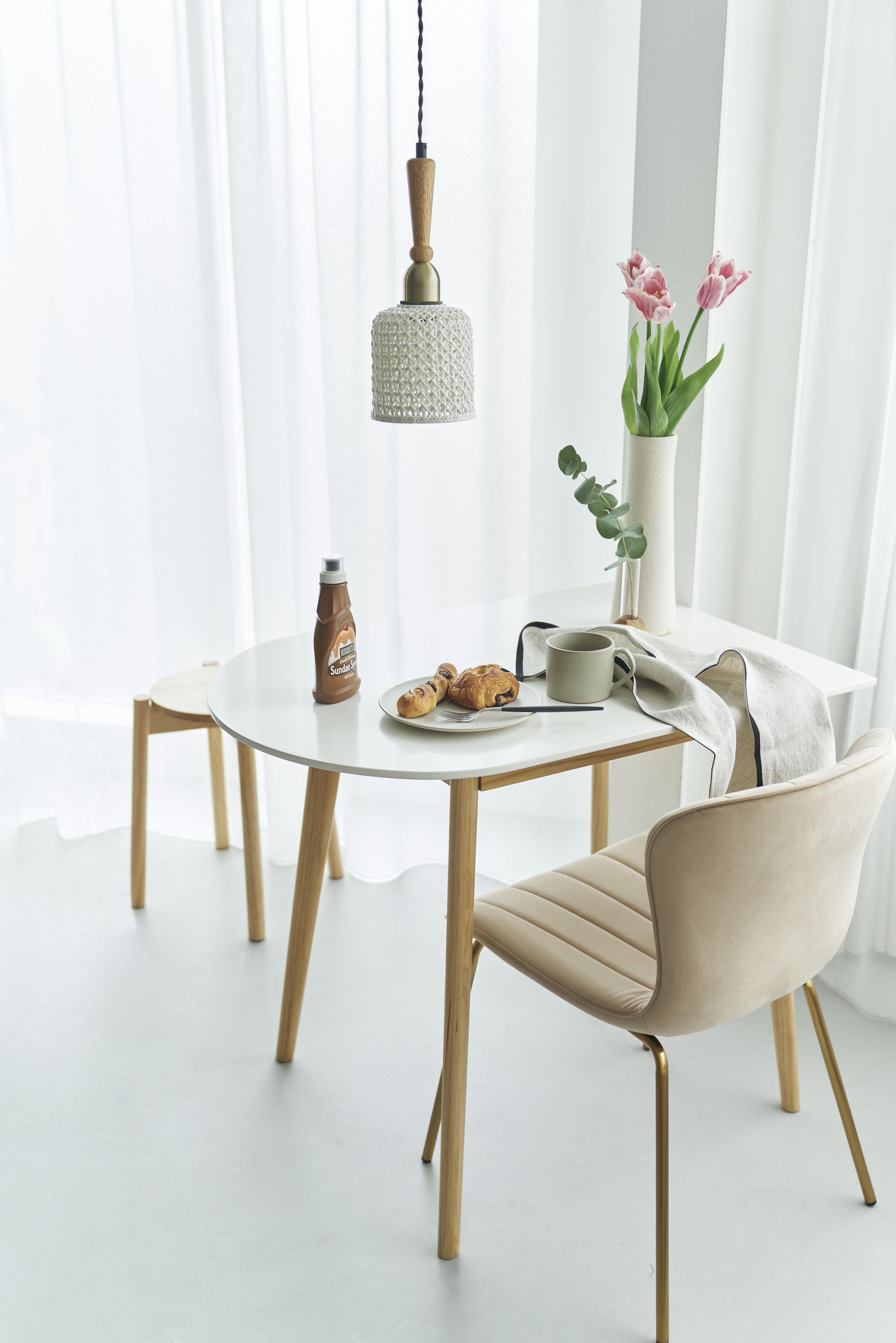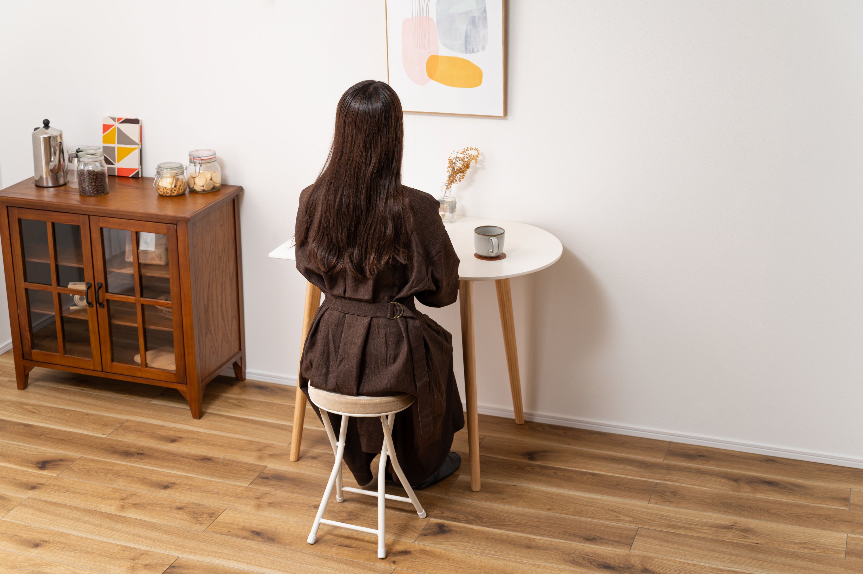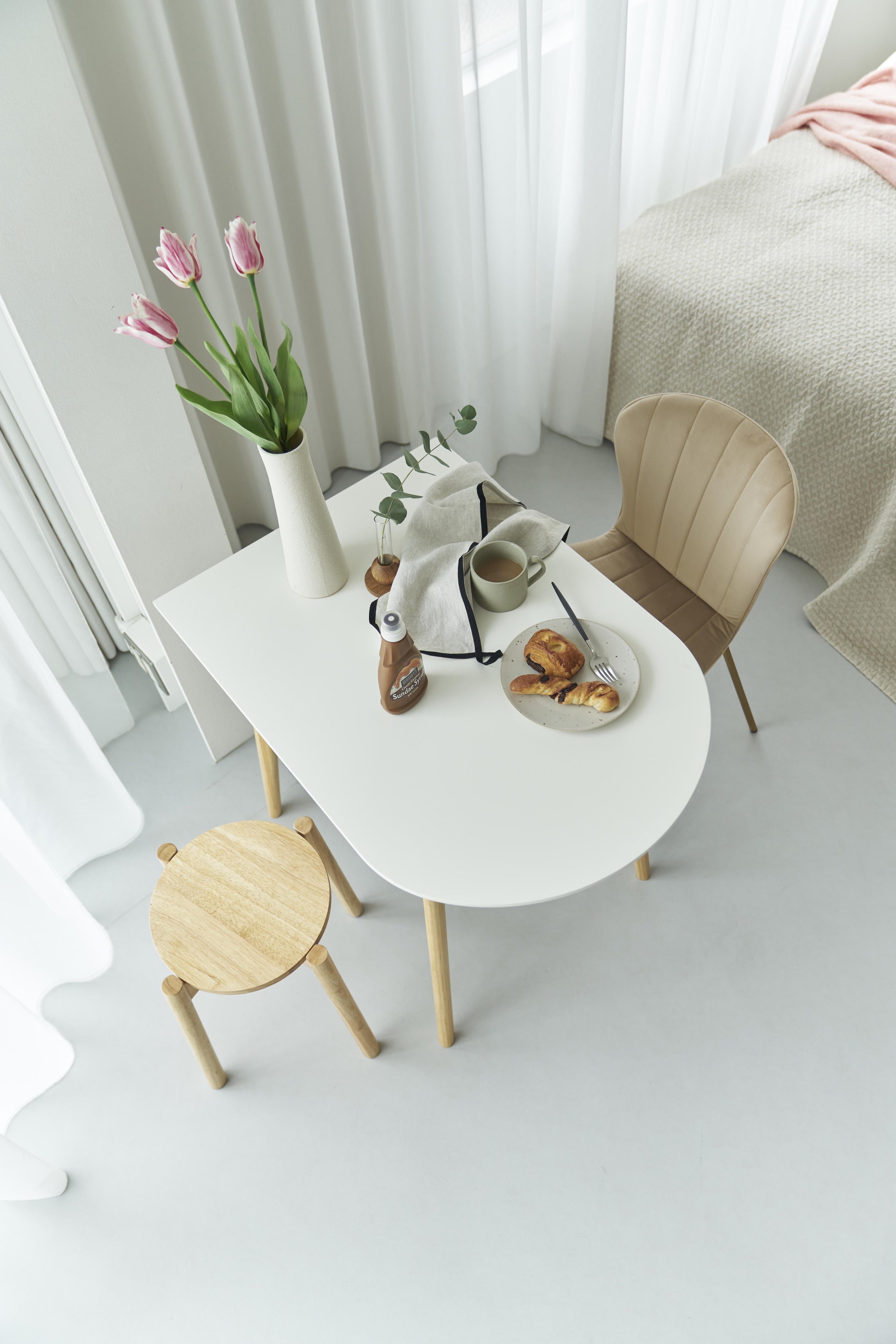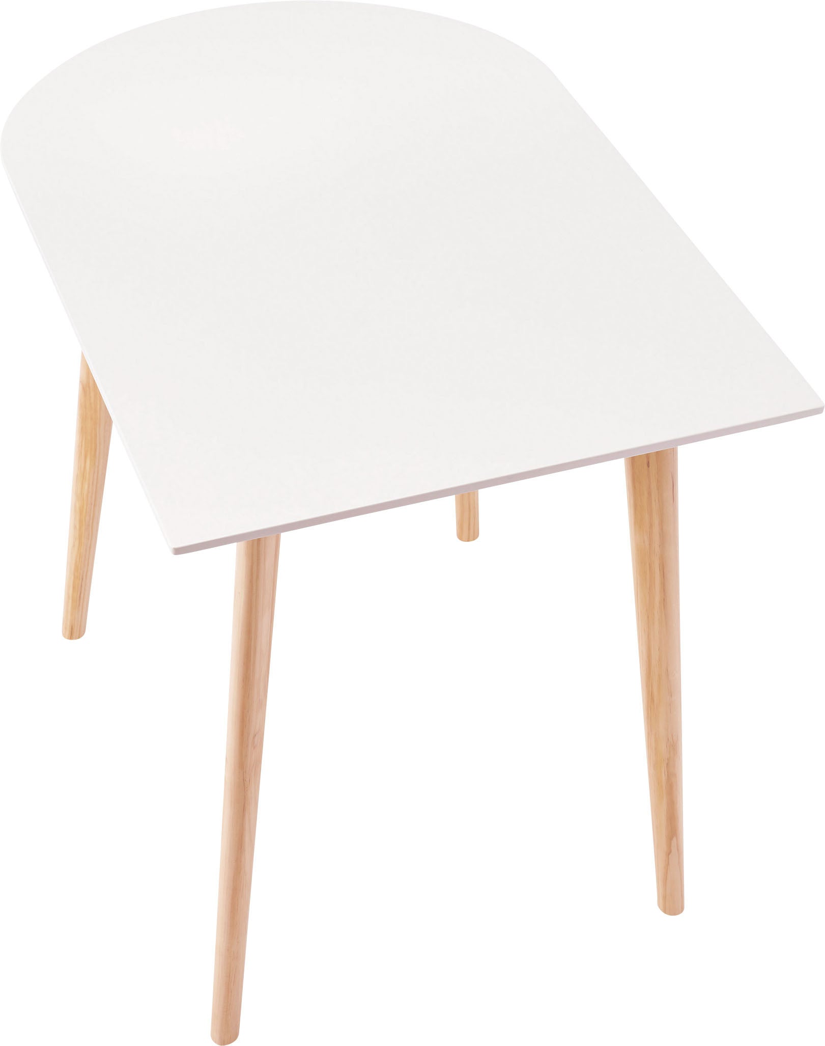 壁付けも出来る、ミニマルなデザインのダイニングテーブル。 壁面やお部屋の角にレイアウトする事が出来る為、限られたスペースを有効活用しながらお部屋を広く使えます。 一辺に曲線を取り入れたやさしいフォルムで、凹凸のない滑らかなホワイト天板と、天然木の脚の組み合わせが可愛らしさを演出してくれます。