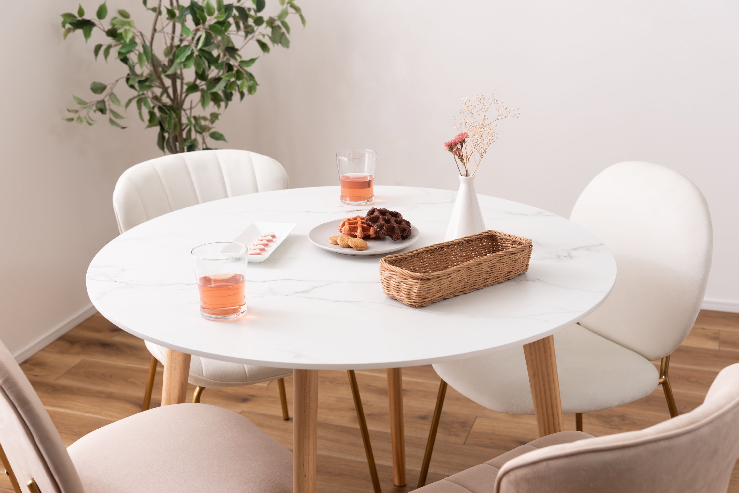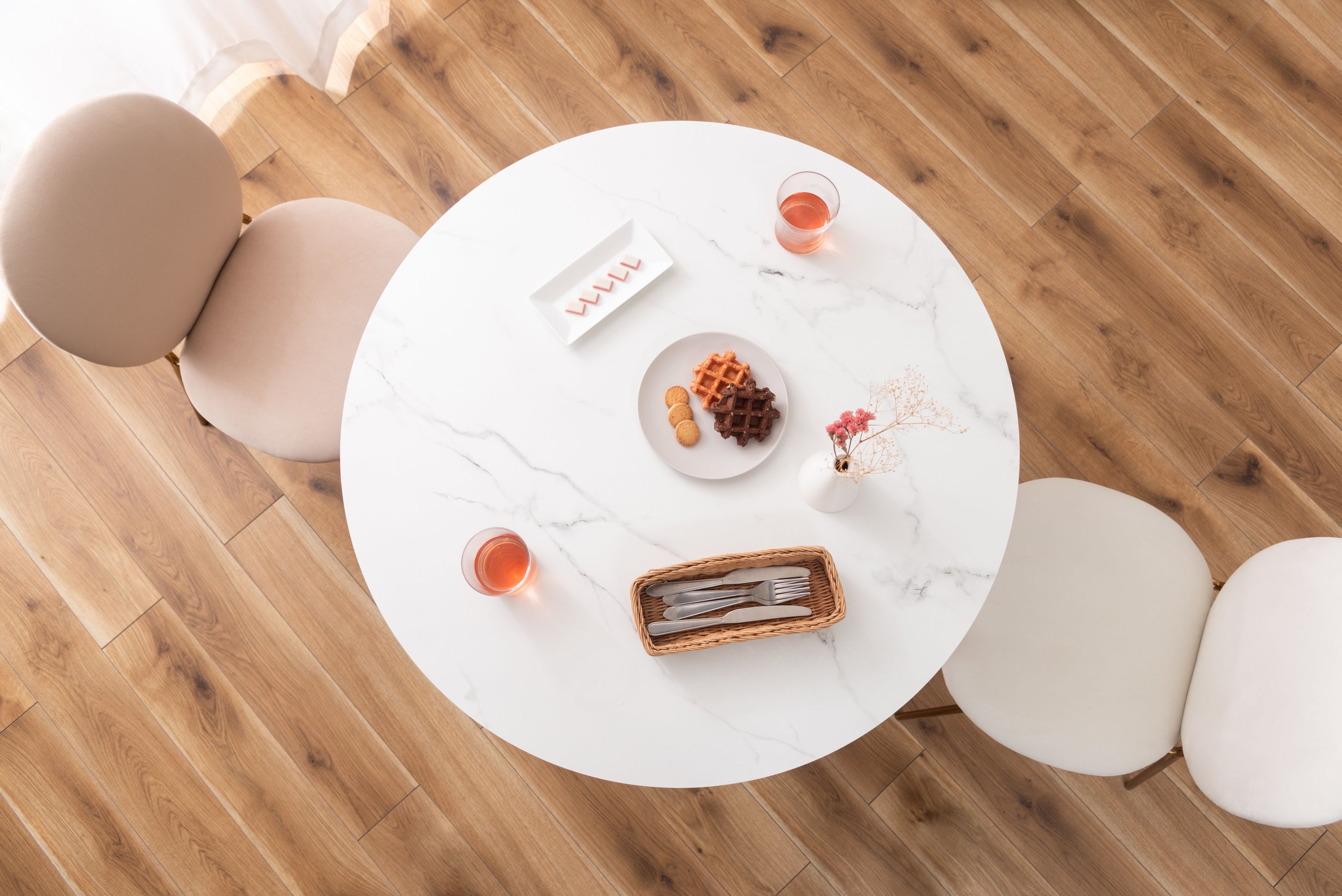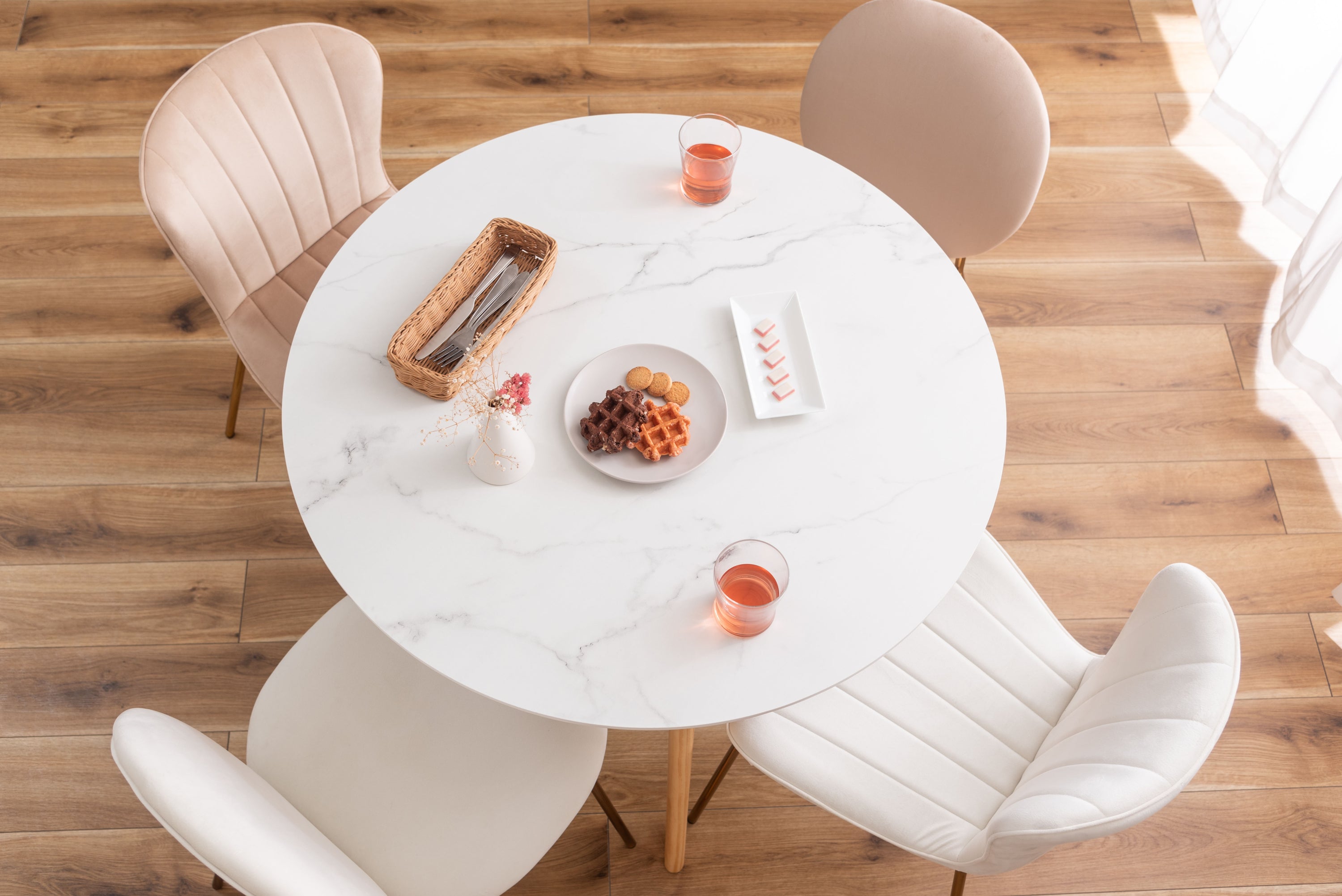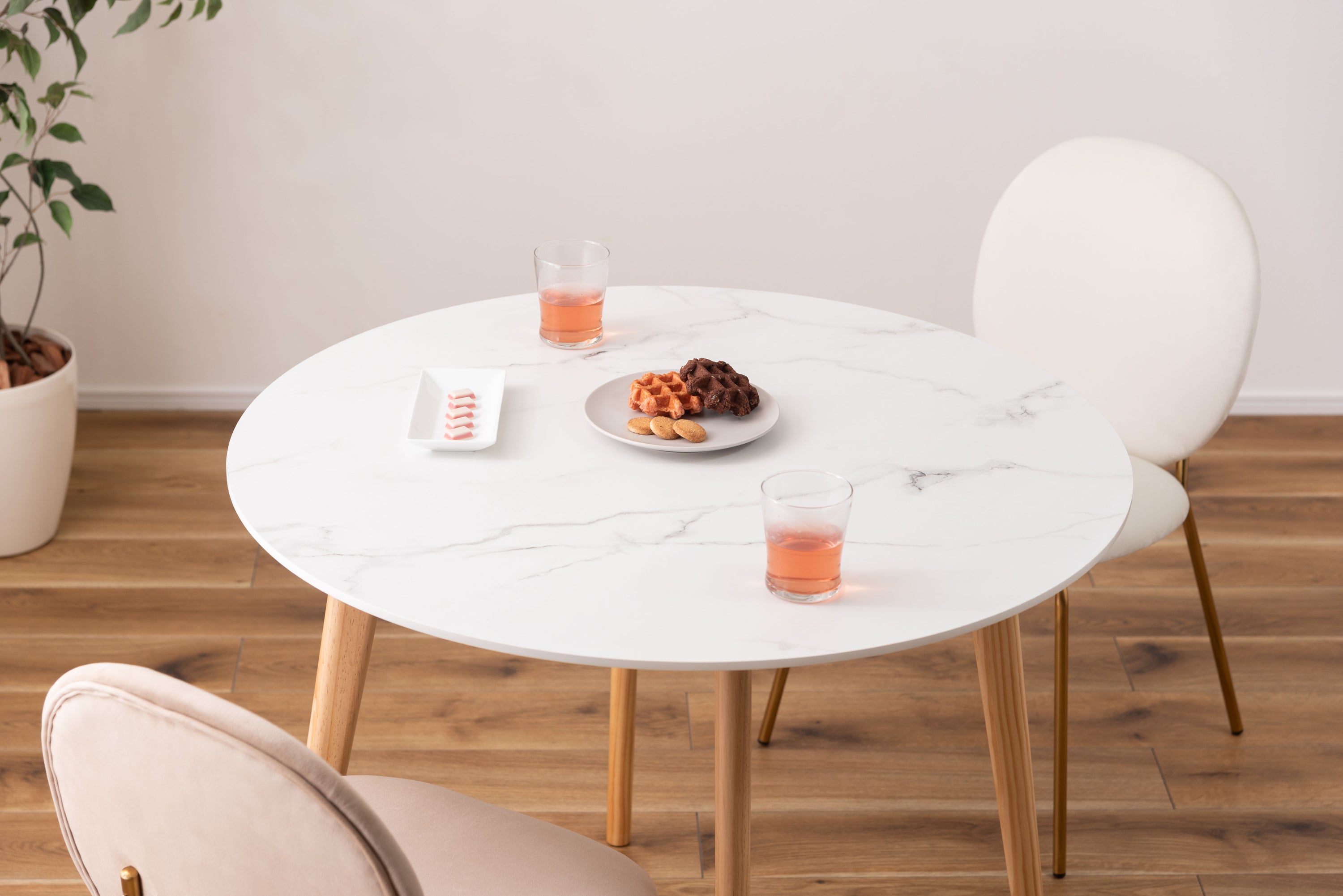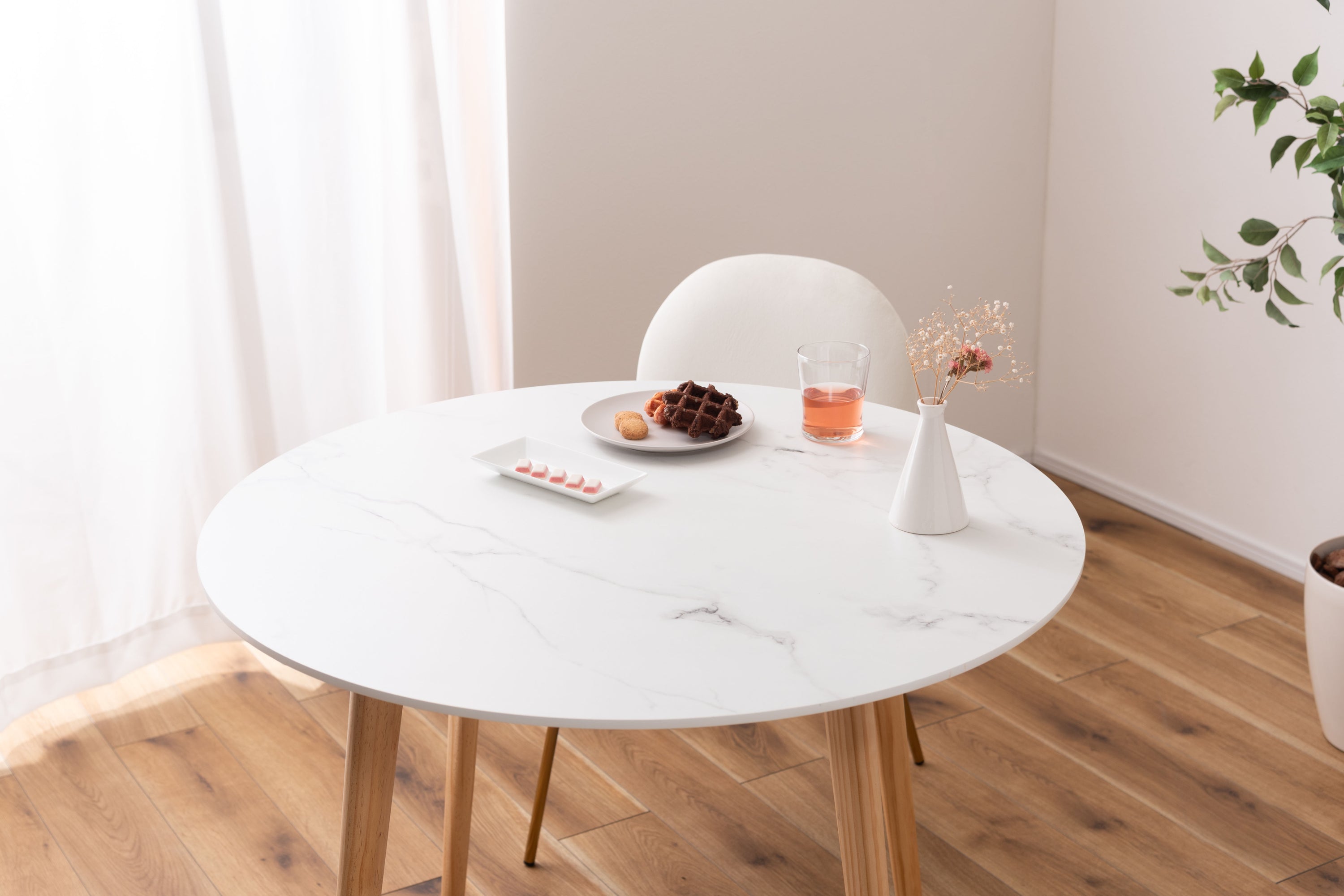 人気のコンパクトテーブルにトレンドの大理石調のデザインが登場。ストーン柄の天板は物を鮮やかに見せる効果があり、テーブルの上の料理や小物が引き立つデザインです。脚先に保護フェルト付き簡単に組立可能表面は凹凸をおさえた手触り小物などをフォトジェニックに撮影できます
