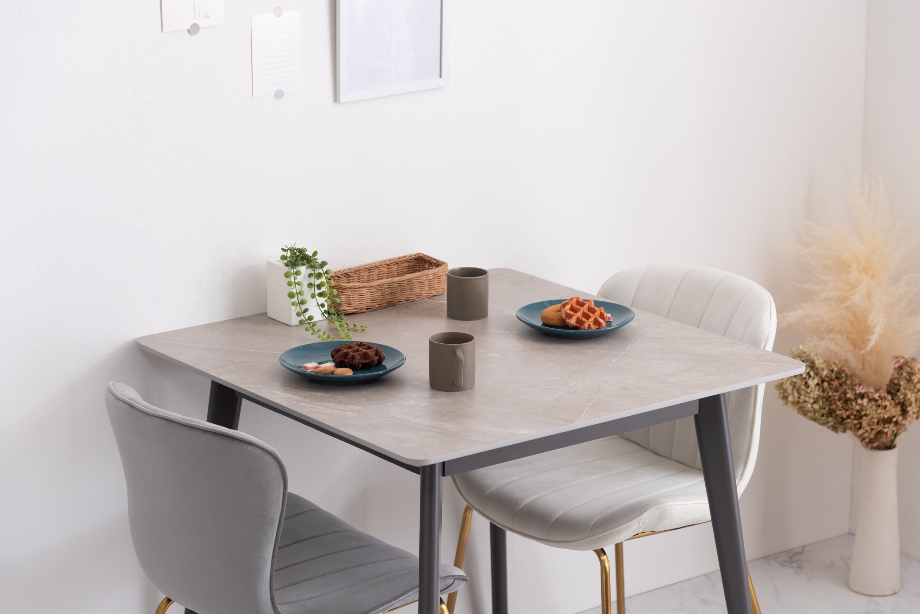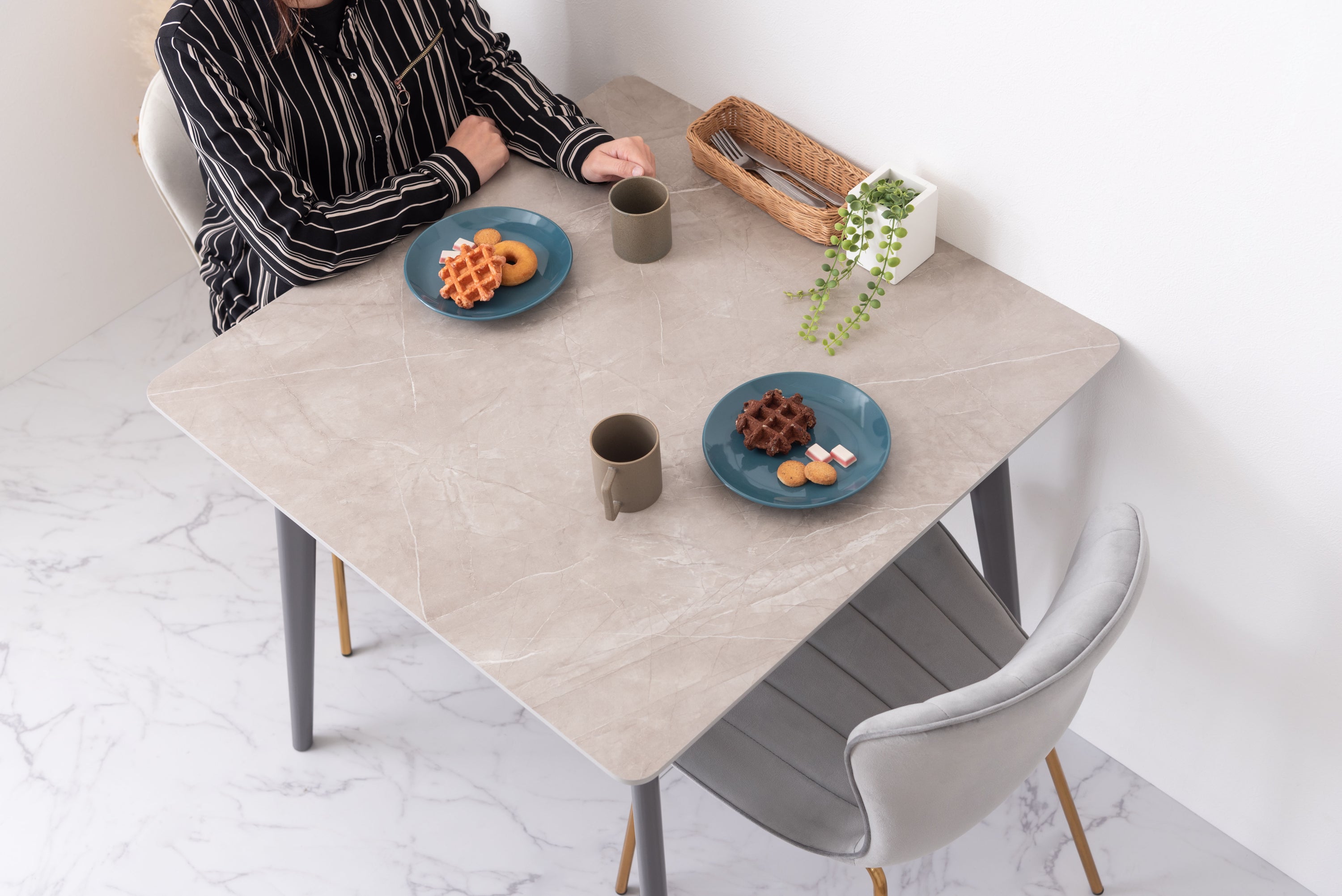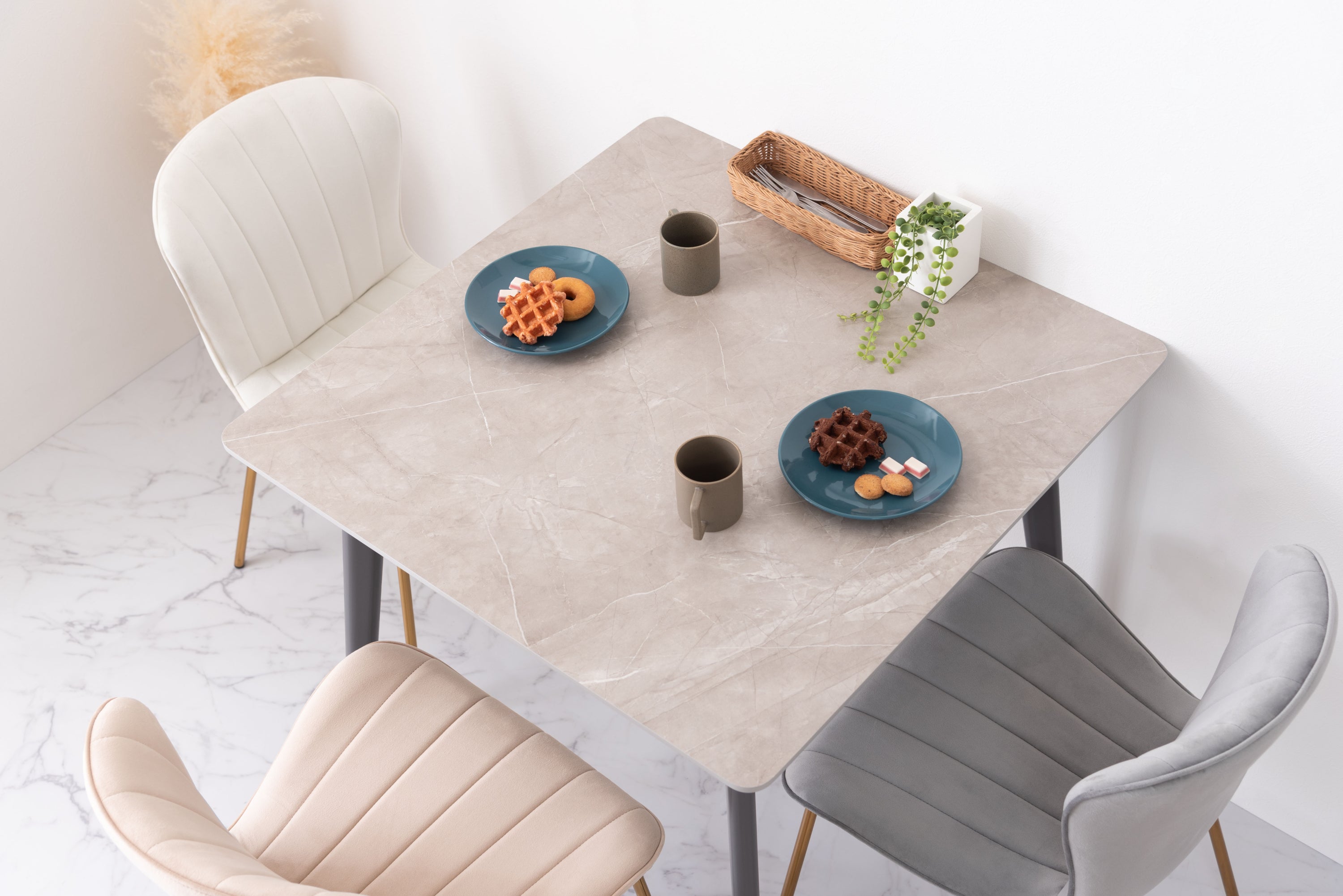 人気のコンパクトテーブルにトレンドの大理石調のデザインが登場。ストーン柄の天板は様々なテイストのアイテムと相性が良く、細身の脚が圧迫感のないすっきりとした印象を与えてくれます。脚先に保護フェルト付き簡単に組立可能表面は凹凸をおさえた手触りスタイリッシュな脚先料理などをフォトジェニックに撮影できますデザイン性の高い船底型の天板