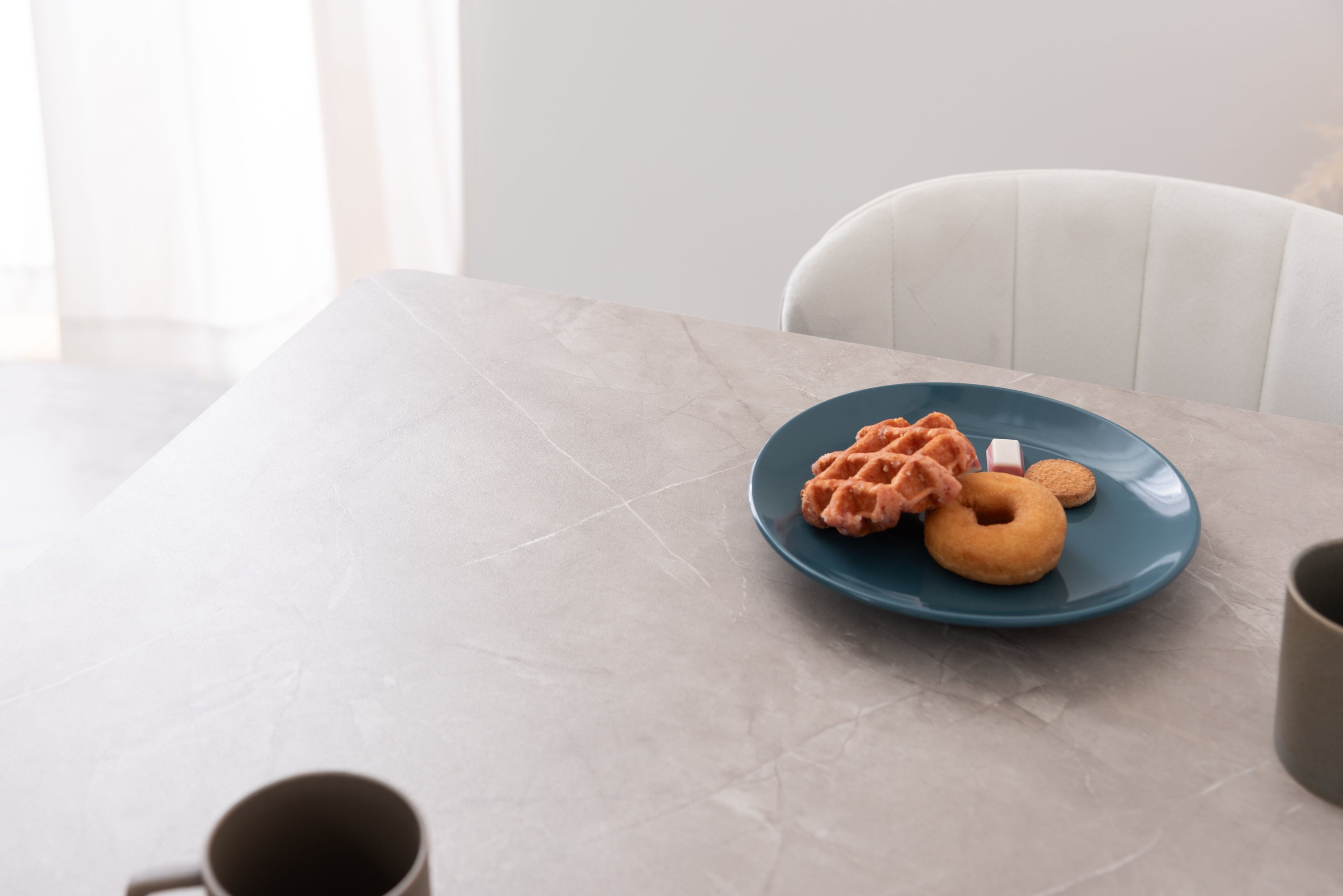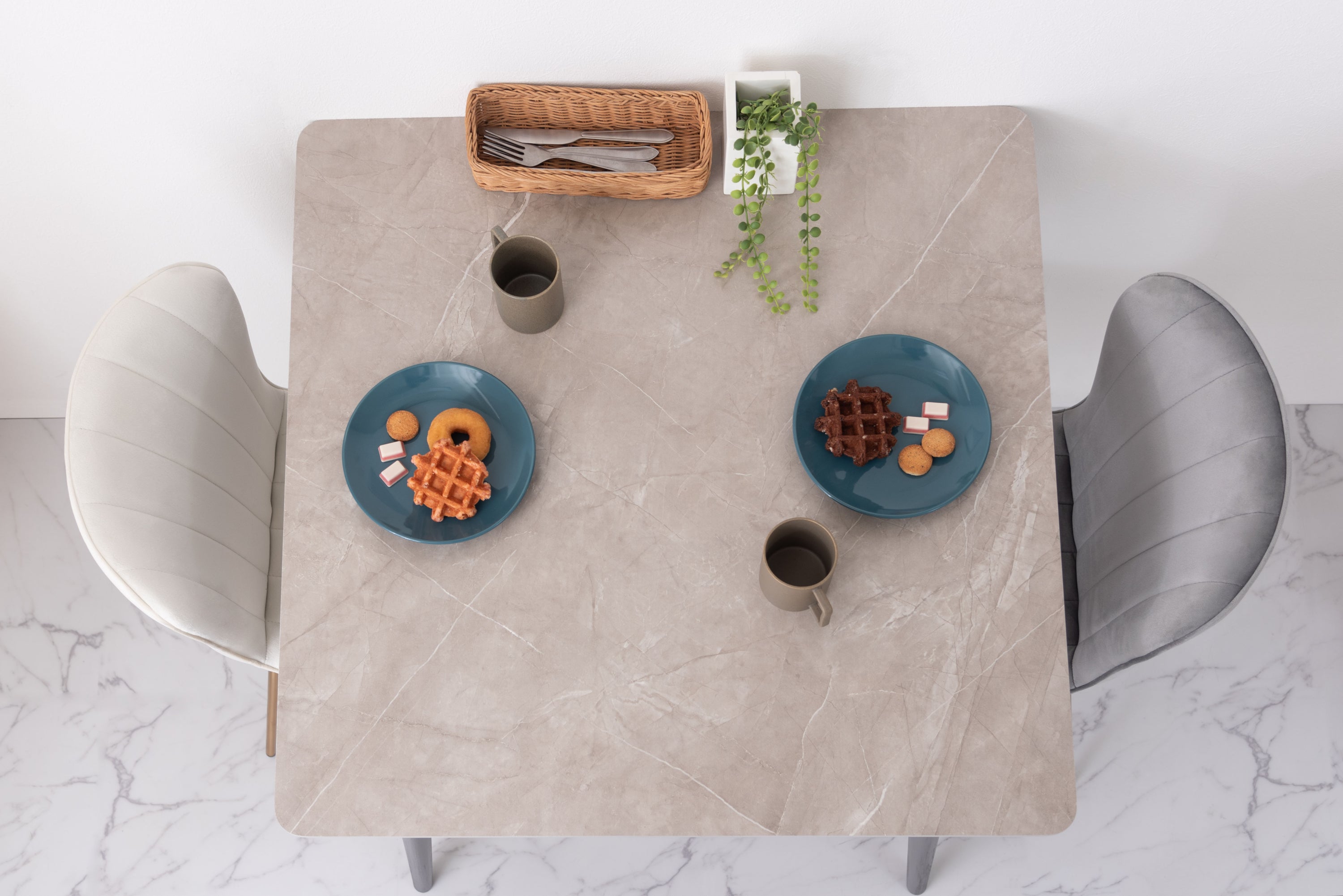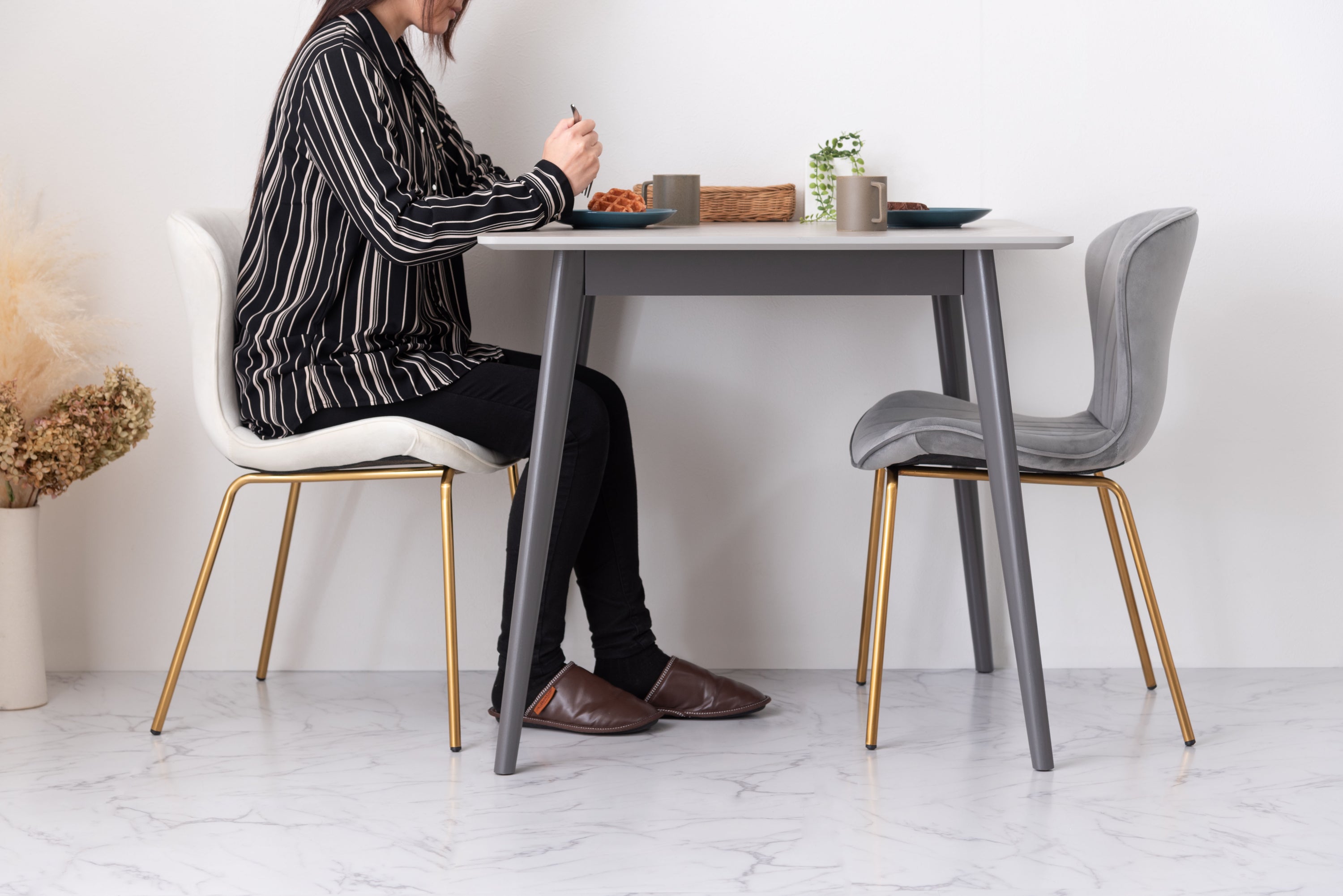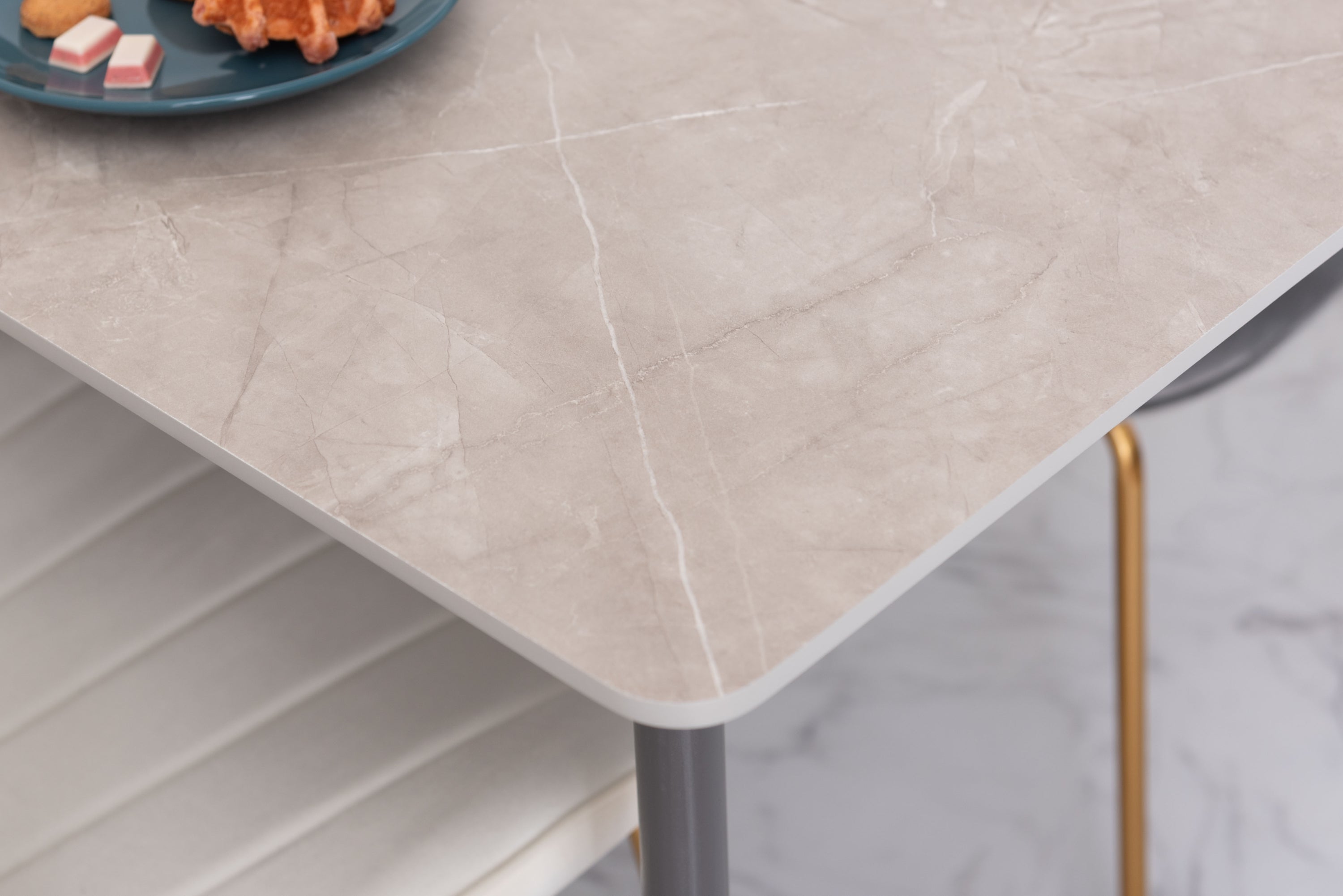 人気のコンパクトテーブルにトレンドの大理石調のデザインが登場。ストーン柄の天板は様々なテイストのアイテムと相性が良く、細身の脚が圧迫感のないすっきりとした印象を与えてくれます。脚先に保護フェルト付き簡単に組立可能表面は凹凸をおさえた手触りスタイリッシュな脚先料理などをフォトジェニックに撮影できますデザイン性の高い船底型の天板