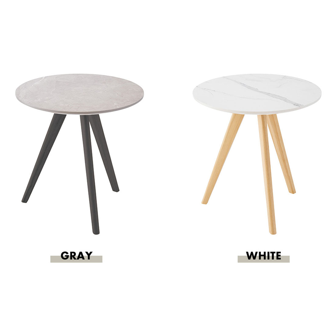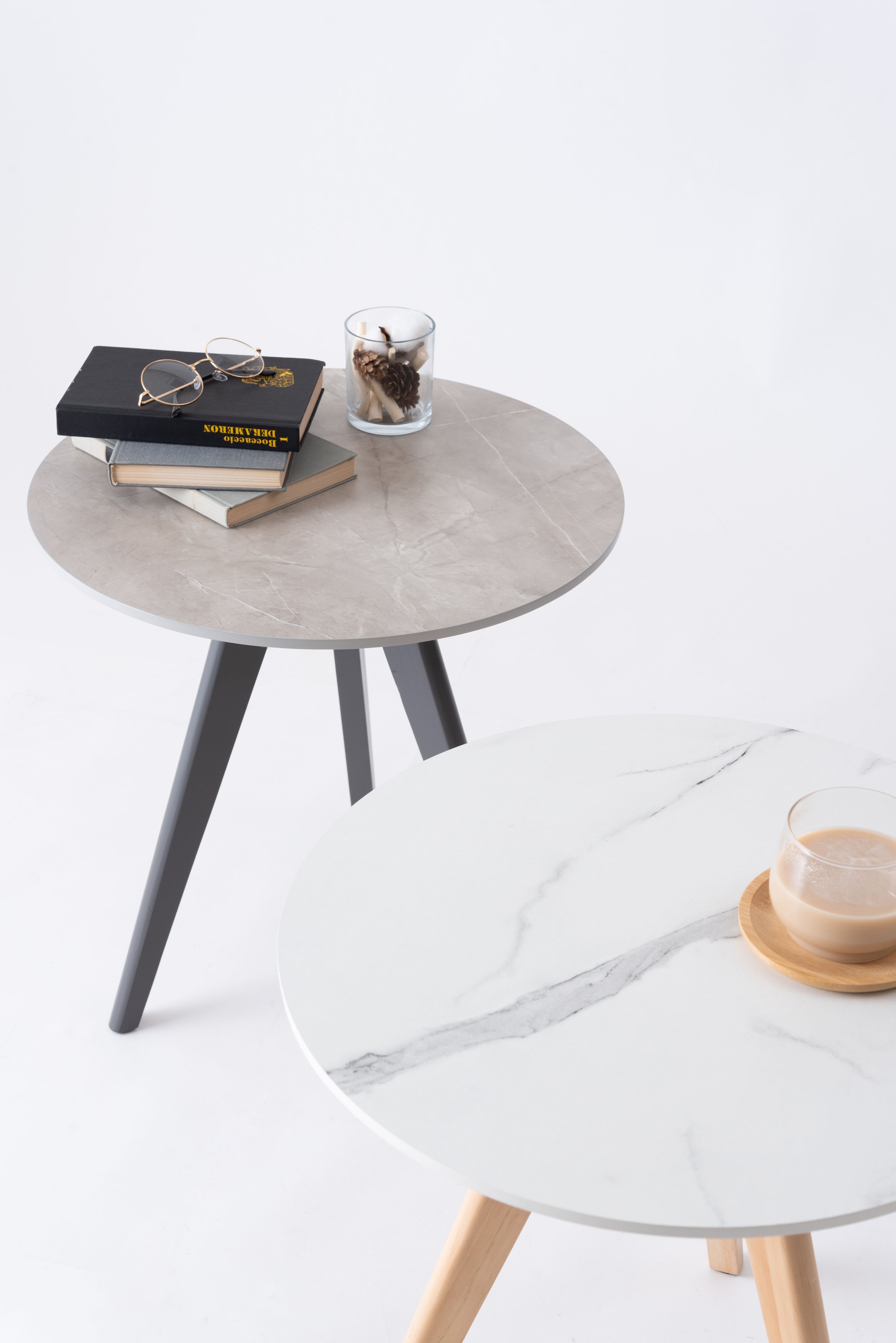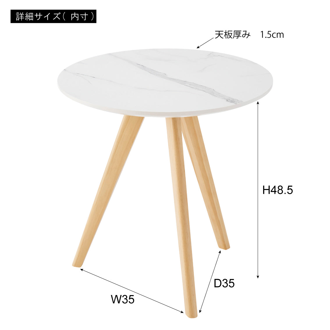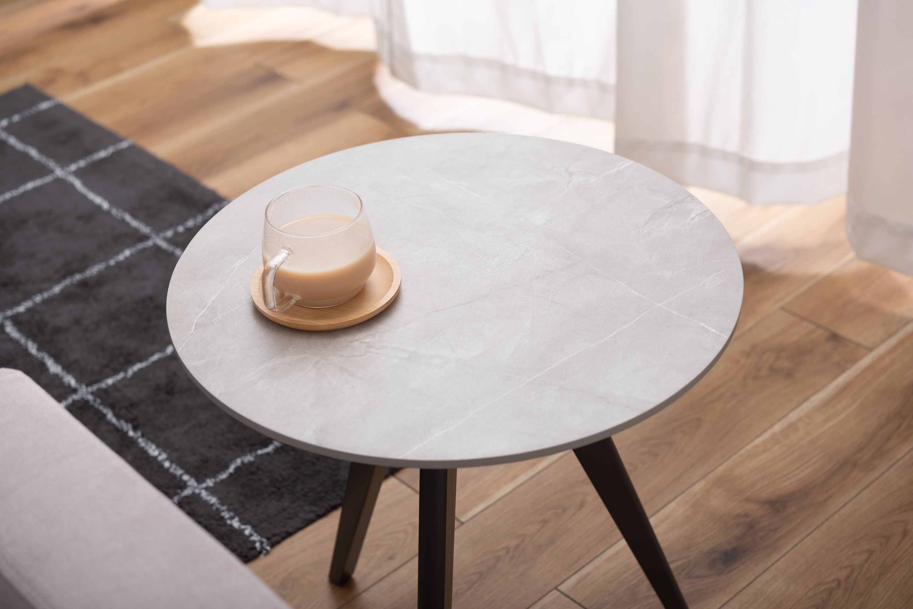 トレンドの大理石調デザインを施したサイドテーブル。ソファやベッド横のテーブルはもちろん、小物などのディスプレイ台としてもおすすめ。ソファ横に置けば、リラックスタイムのお供たちを手の届く範囲にセッティング出来ます。ベッド横に置けば、就寝前のちょっとしたのんびり時間が捗ります。天板は凹凸を抑えた大理石調のストーン柄。トレンド感満載で、人気の韓国インテリアにもぴったり。木目を活かした脚は、先が細いテーパードレッグ。グレー天板にはダークグレー色の脚、ホワイト天板にはナチュラル色の脚を採用。脚1本につきボルト2本を、付属六角レンチで留めるだけの簡単組立。脚先には保護フェルトが付いているので、床への傷の心配がありません。