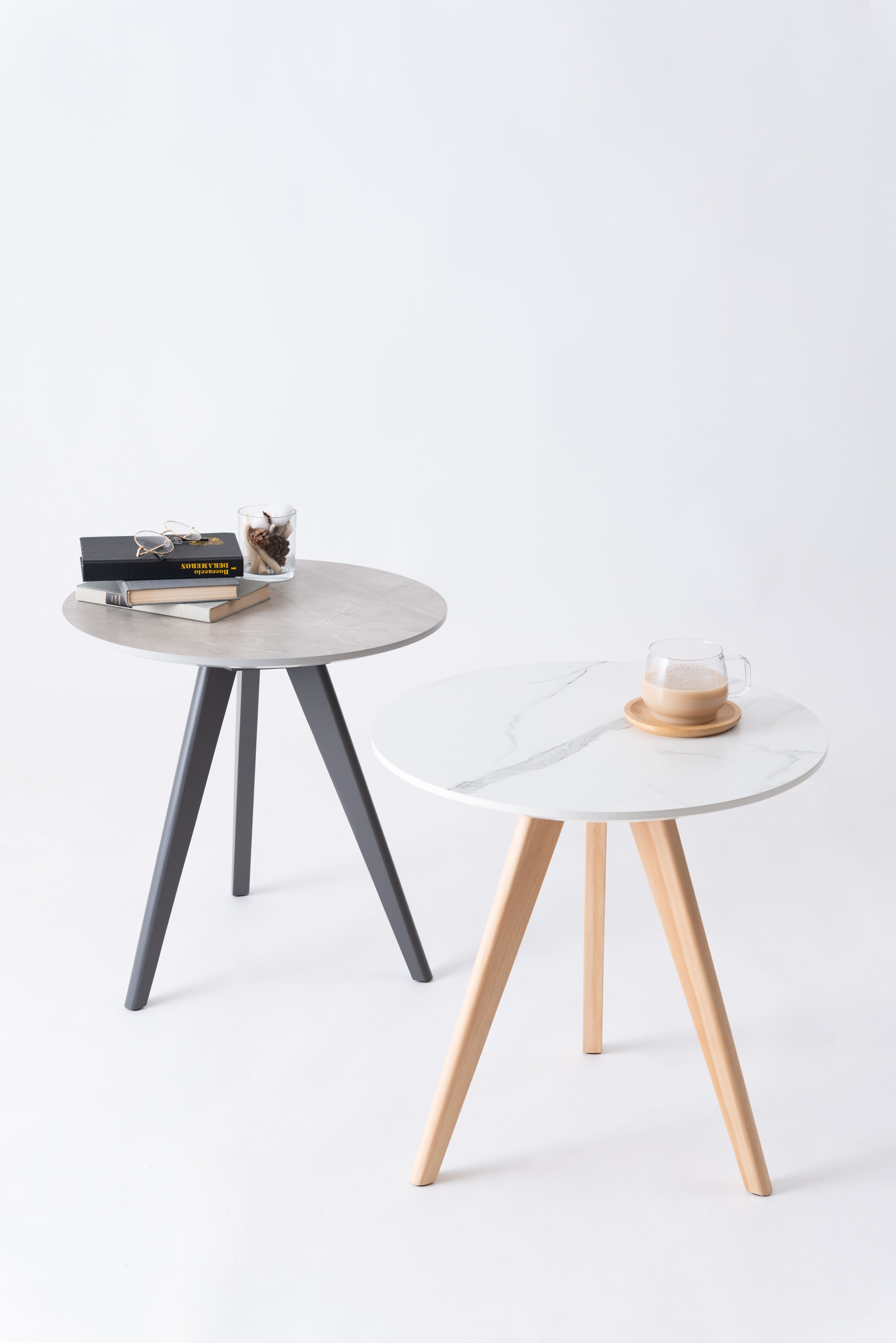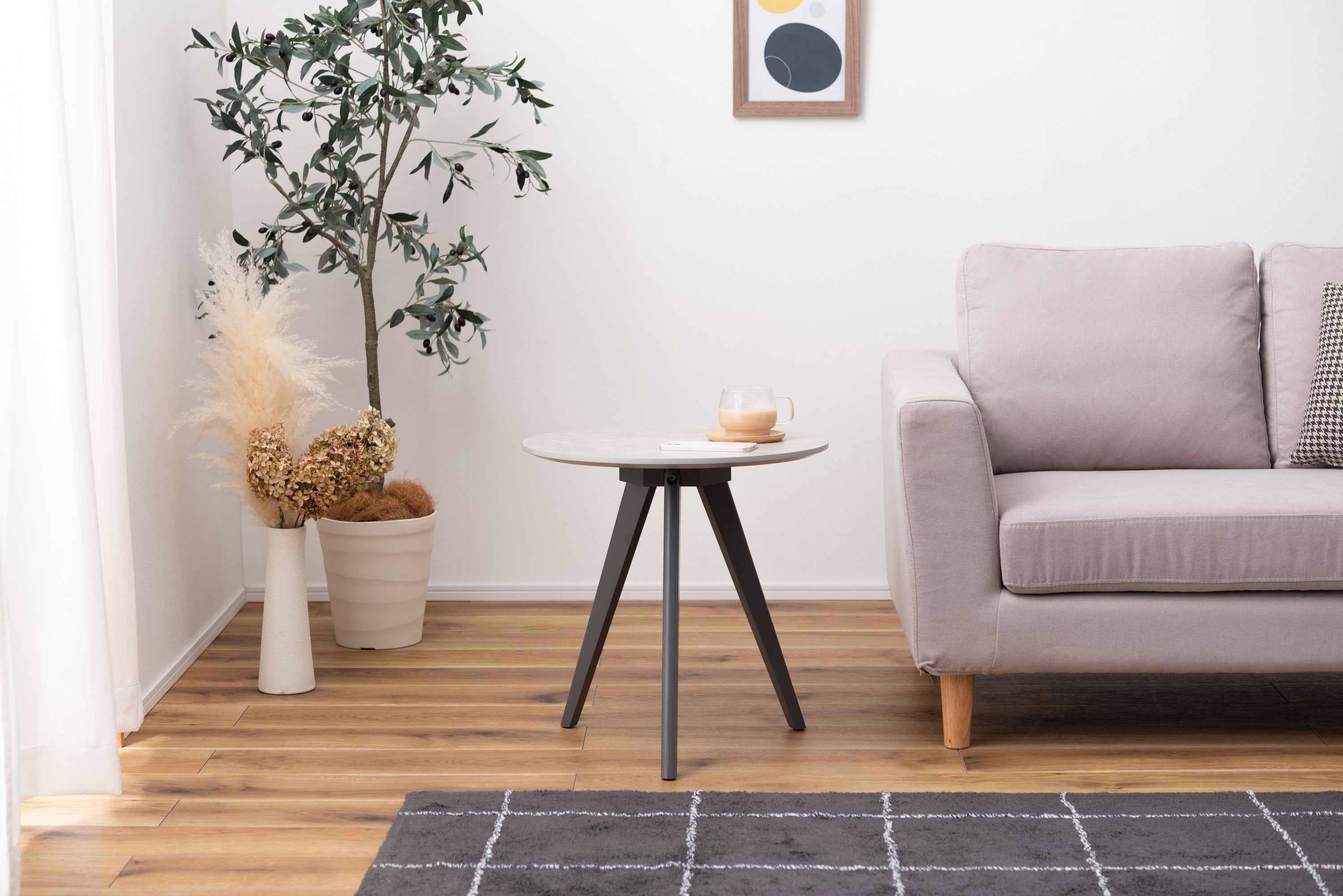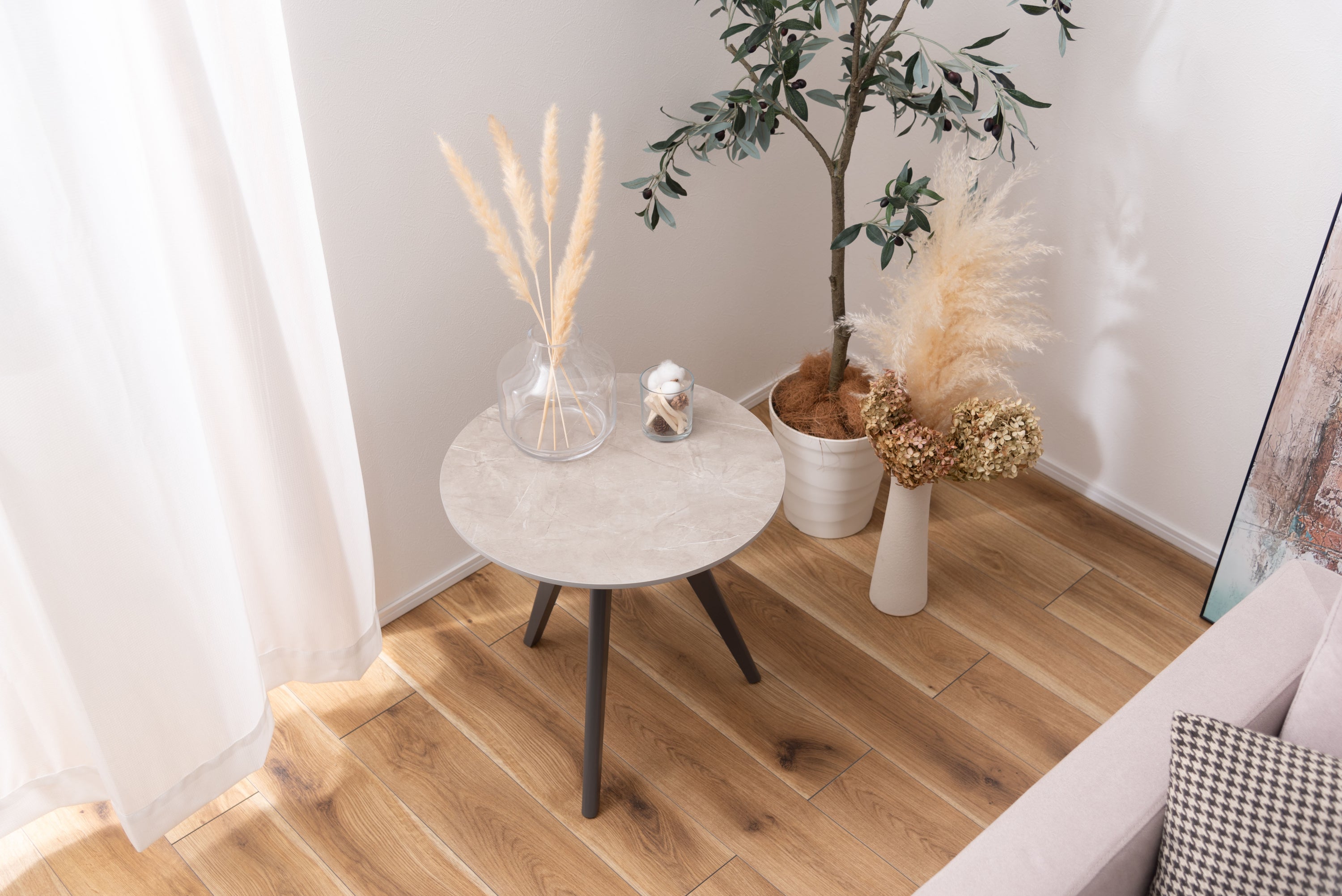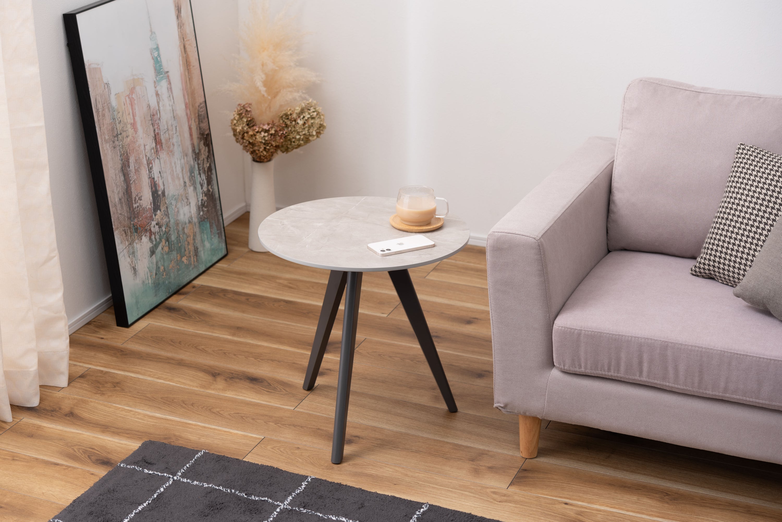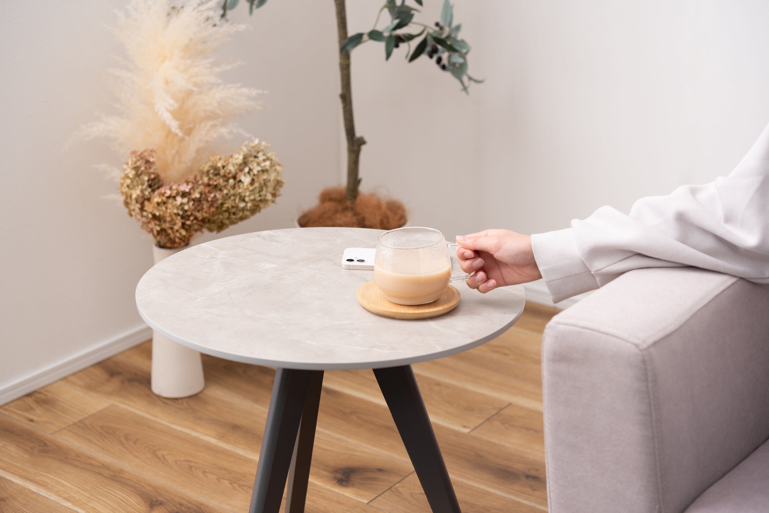 トレンドの大理石調デザインを施したサイドテーブル。ソファやベッド横のテーブルはもちろん、小物などのディスプレイ台としてもおすすめ。ソファ横に置けば、リラックスタイムのお供たちを手の届く範囲にセッティング出来ます。ベッド横に置けば、就寝前のちょっとしたのんびり時間が捗ります。天板は凹凸を抑えた大理石調のストーン柄。トレンド感満載で、人気の韓国インテリアにもぴったり。木目を活かした脚は、先が細いテーパードレッグ。グレー天板にはダークグレー色の脚、ホワイト天板にはナチュラル色の脚を採用。脚1本につきボルト2本を、付属六角レンチで留めるだけの簡単組立。脚先には保護フェルトが付いているので、床への傷の心配がありません。
